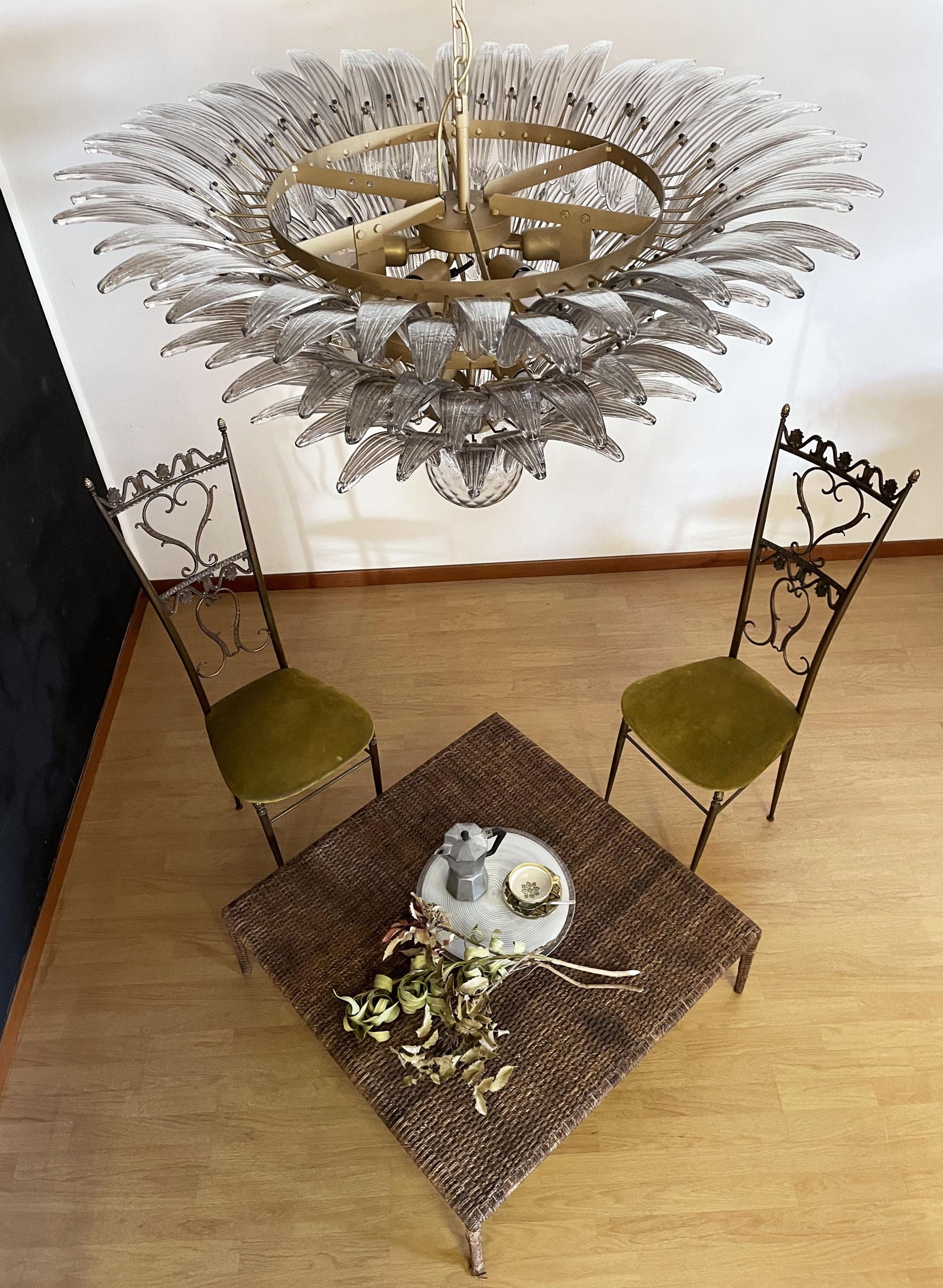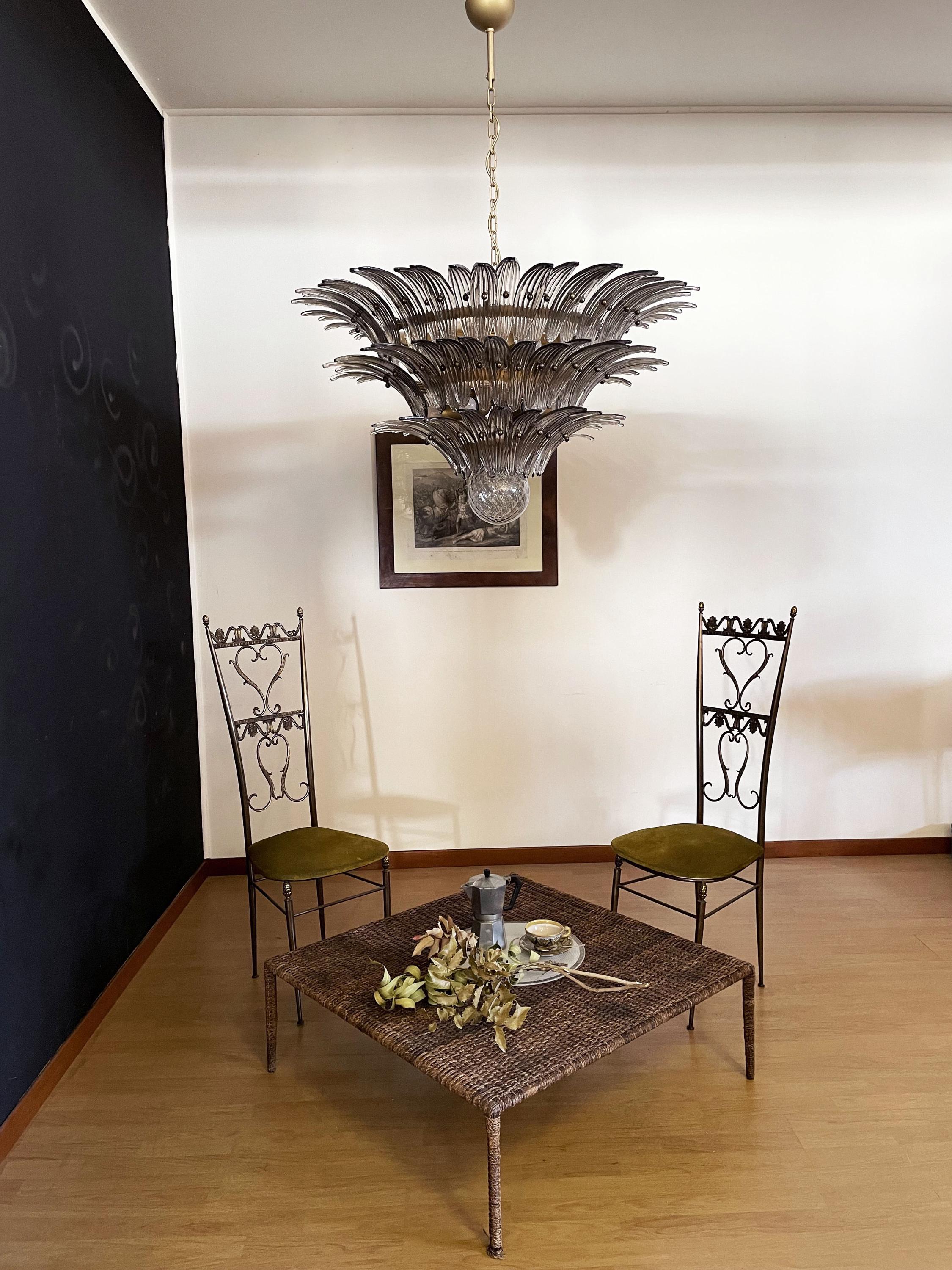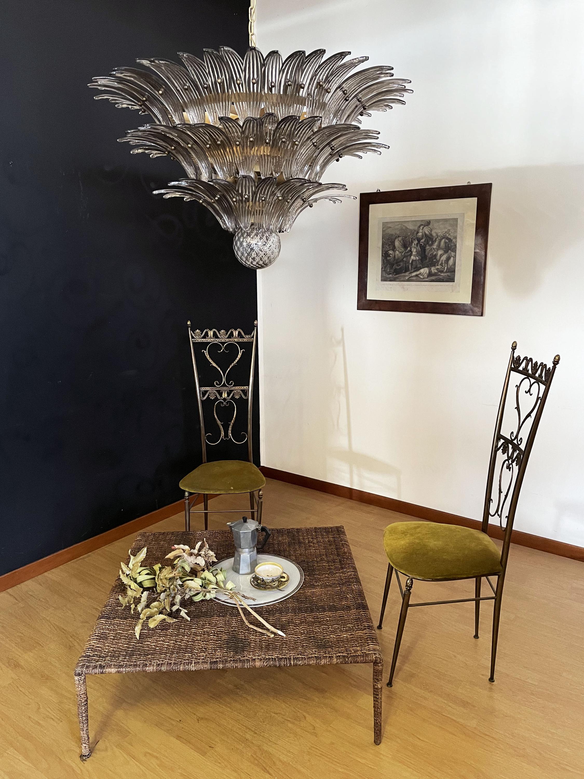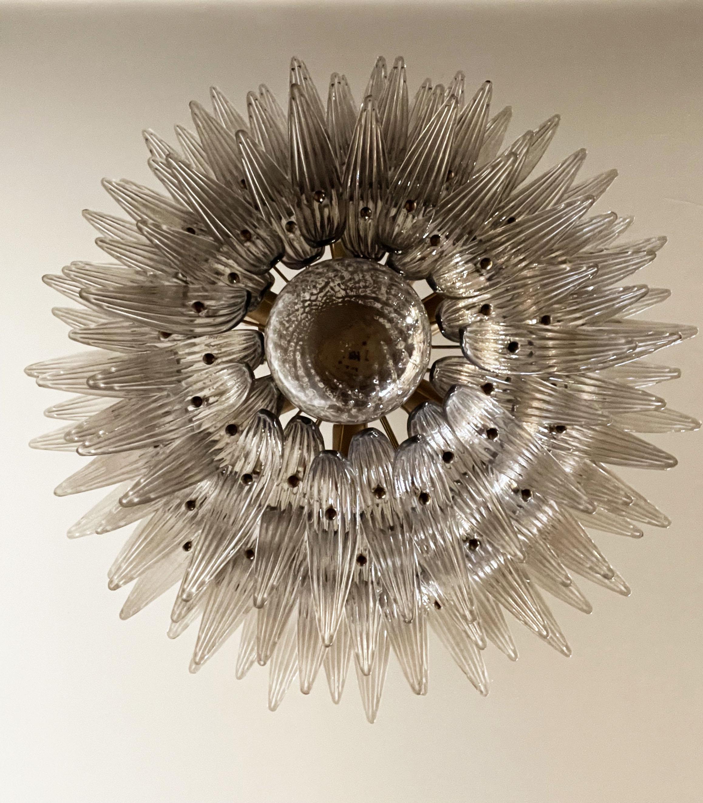Palmette ceiling light made by 104 Murano smoked glasses in a gold metal frame. Murano blown glass in a traditional way. Structure in gold colored metal.