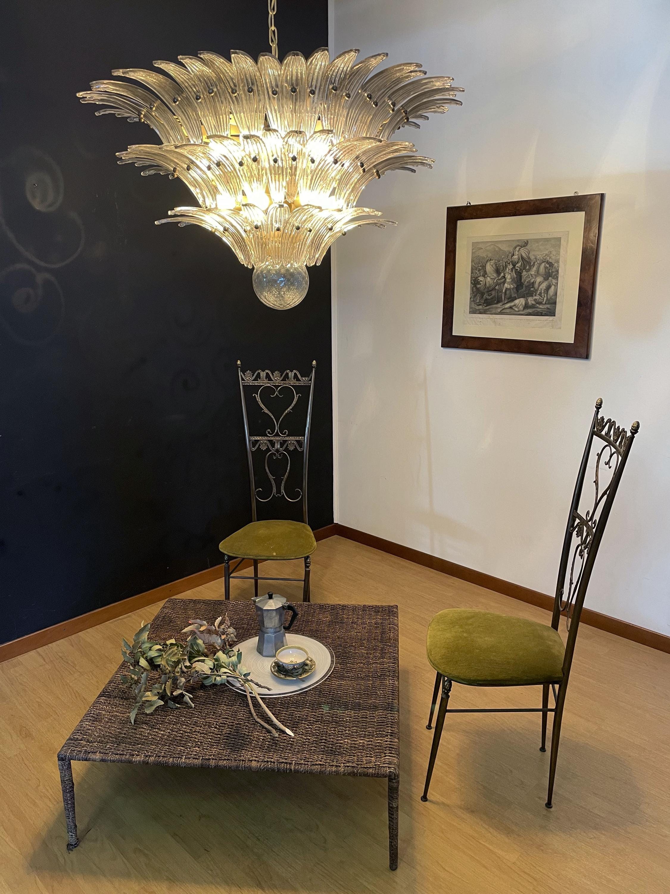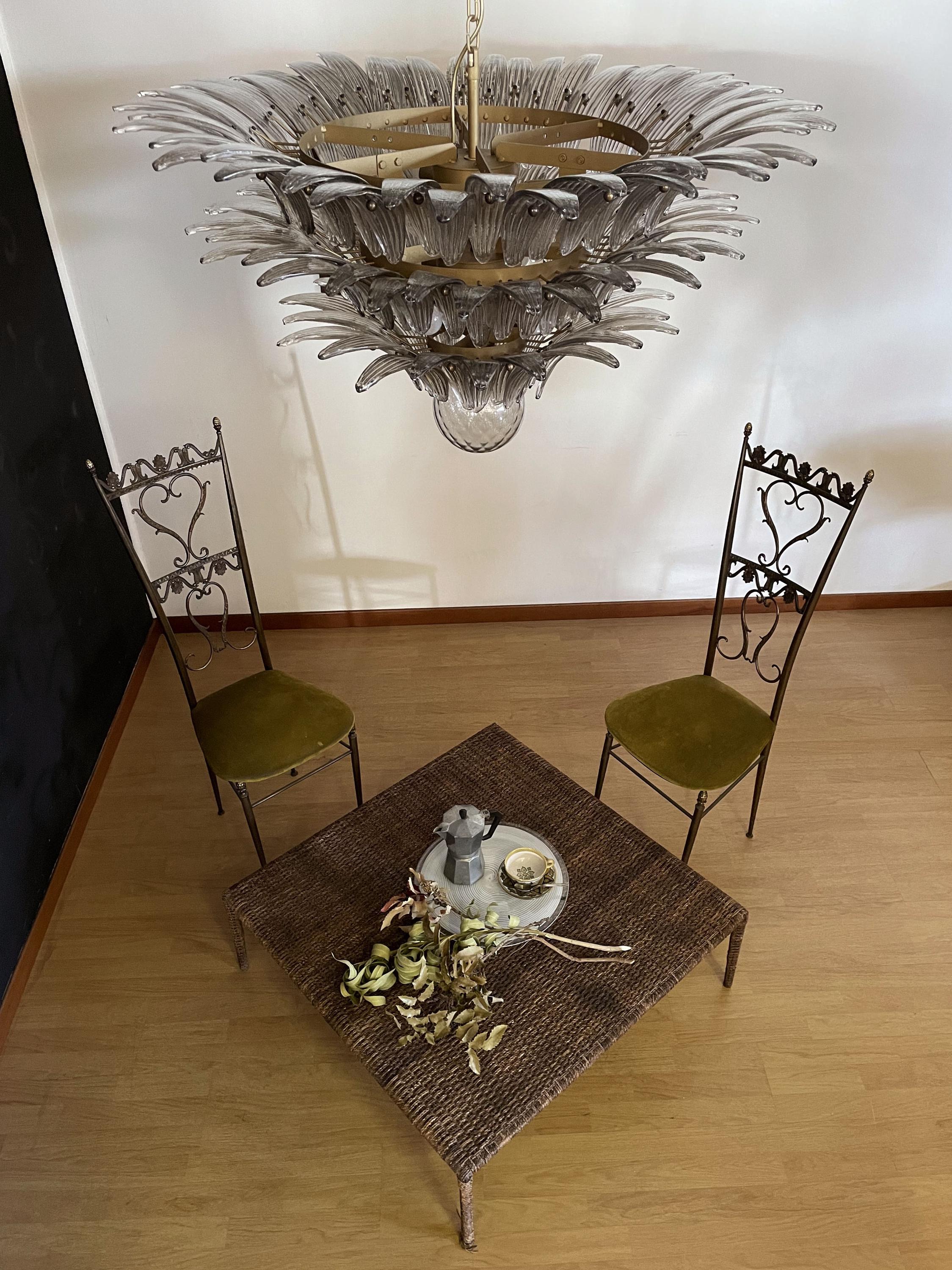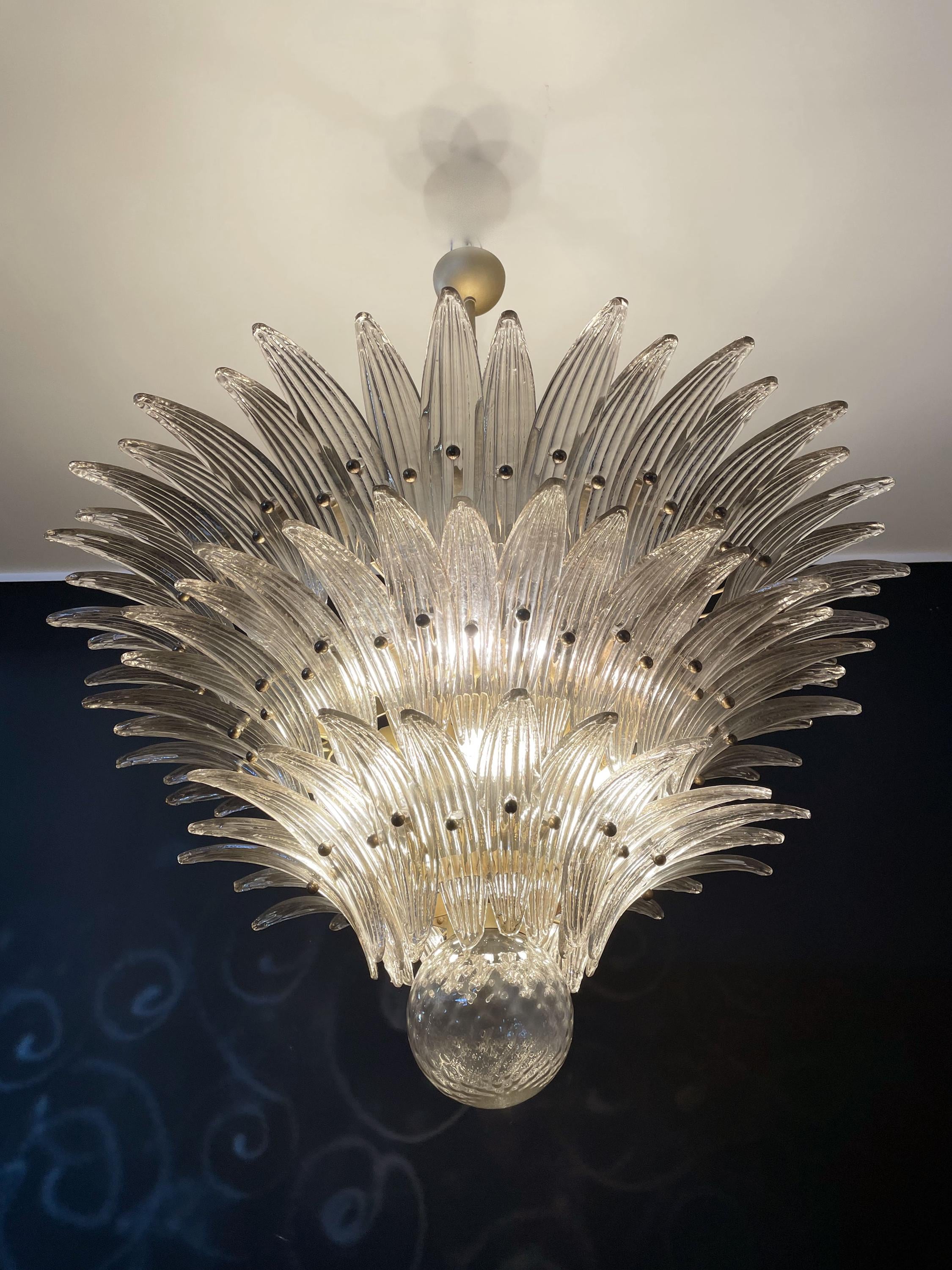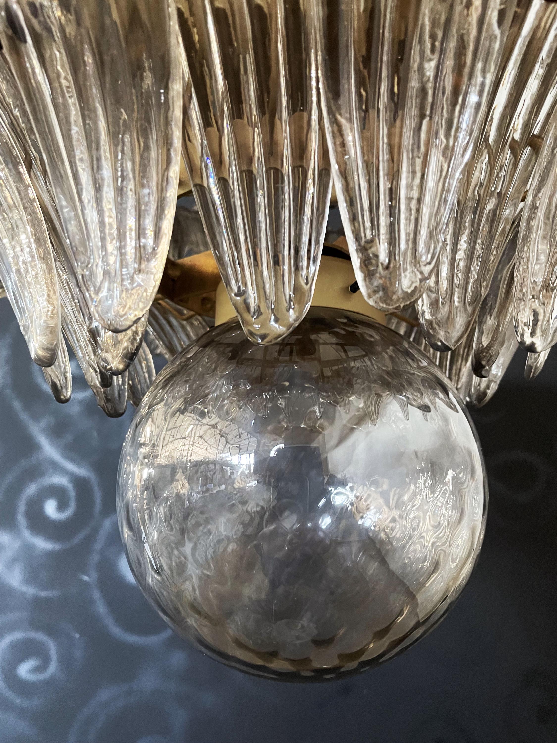 Palmette ceiling light made by 104 Murano smoked glasses in a gold metal frame. Murano blown glass in a traditional way. Structure in gold colored metal.