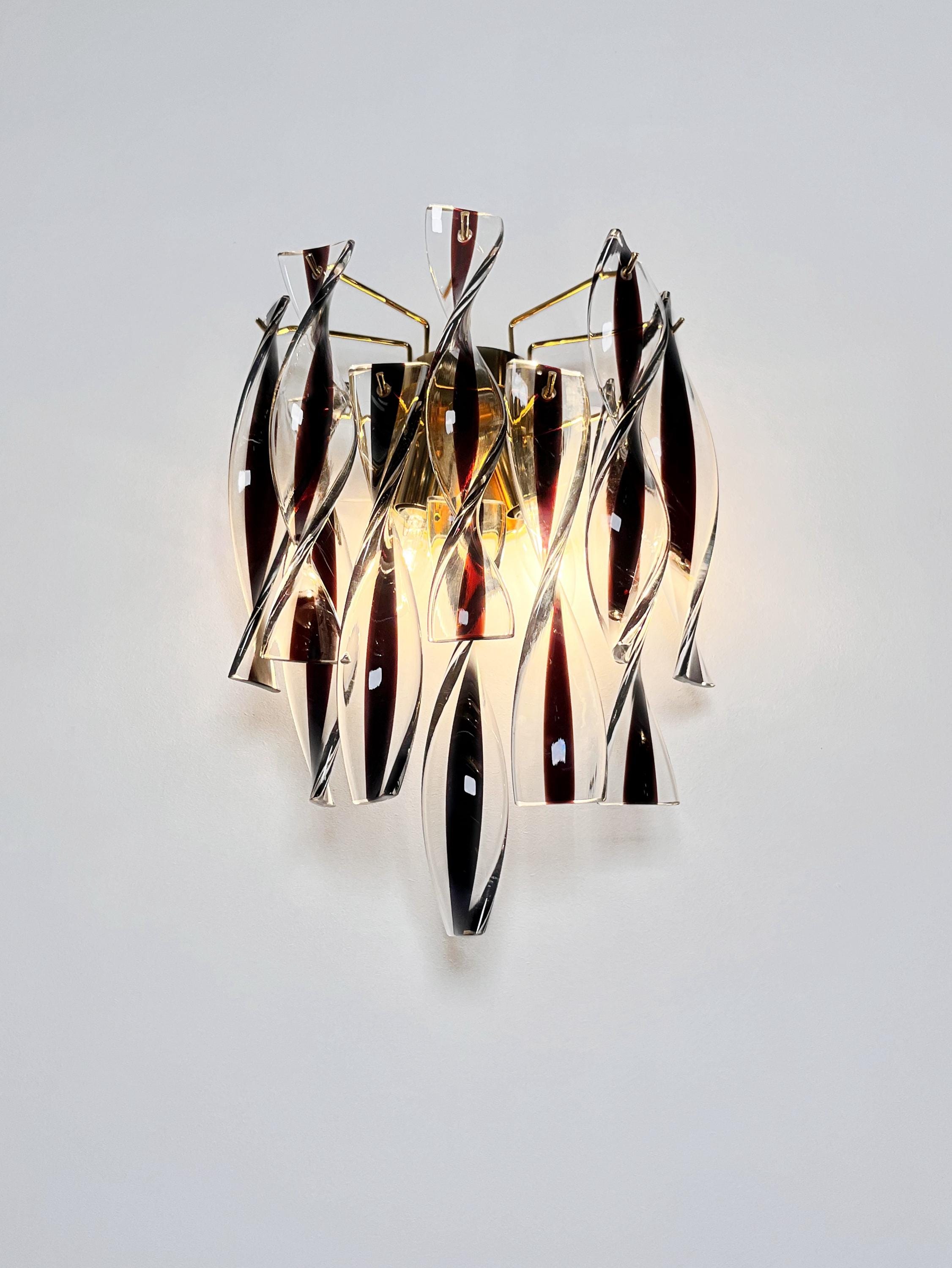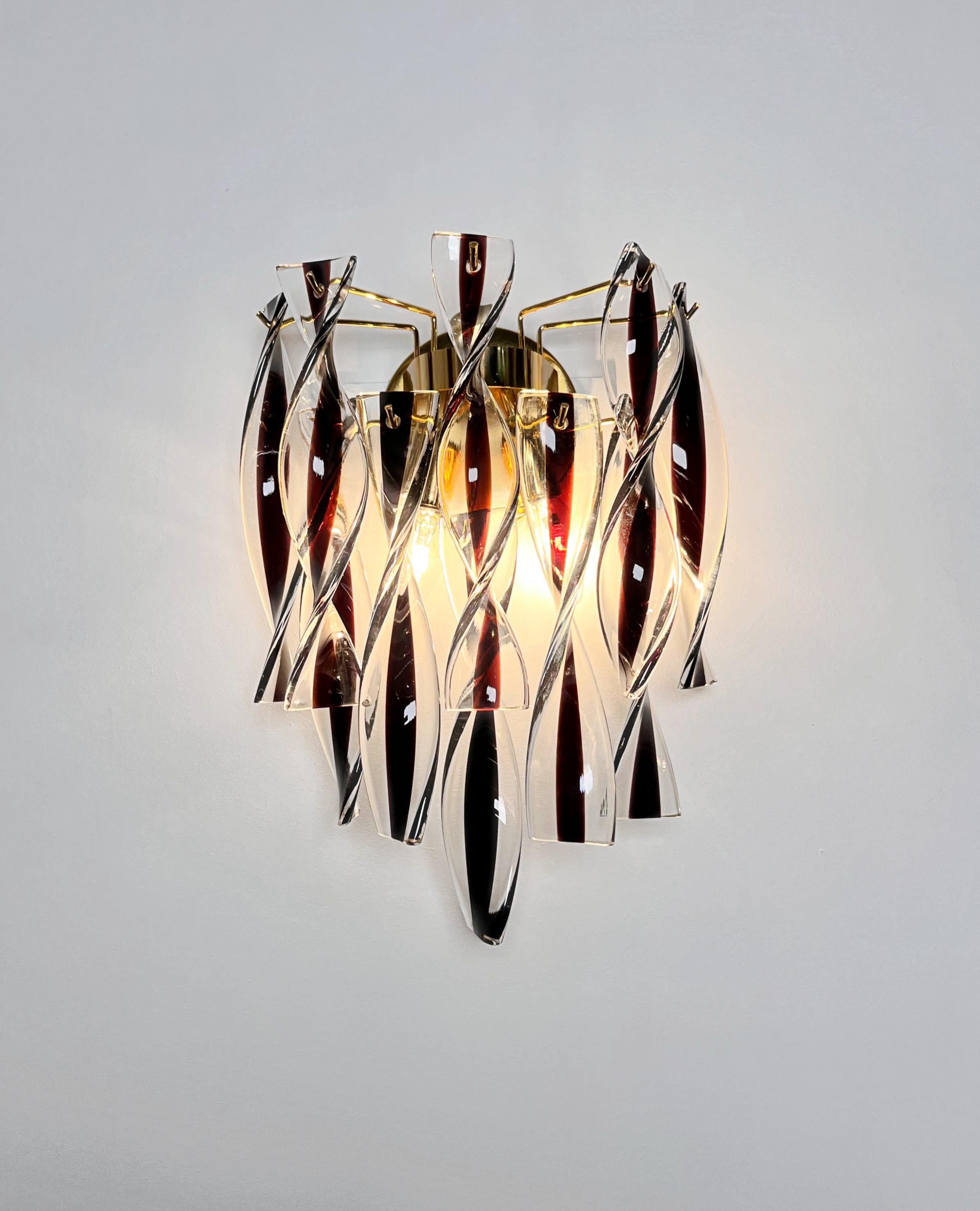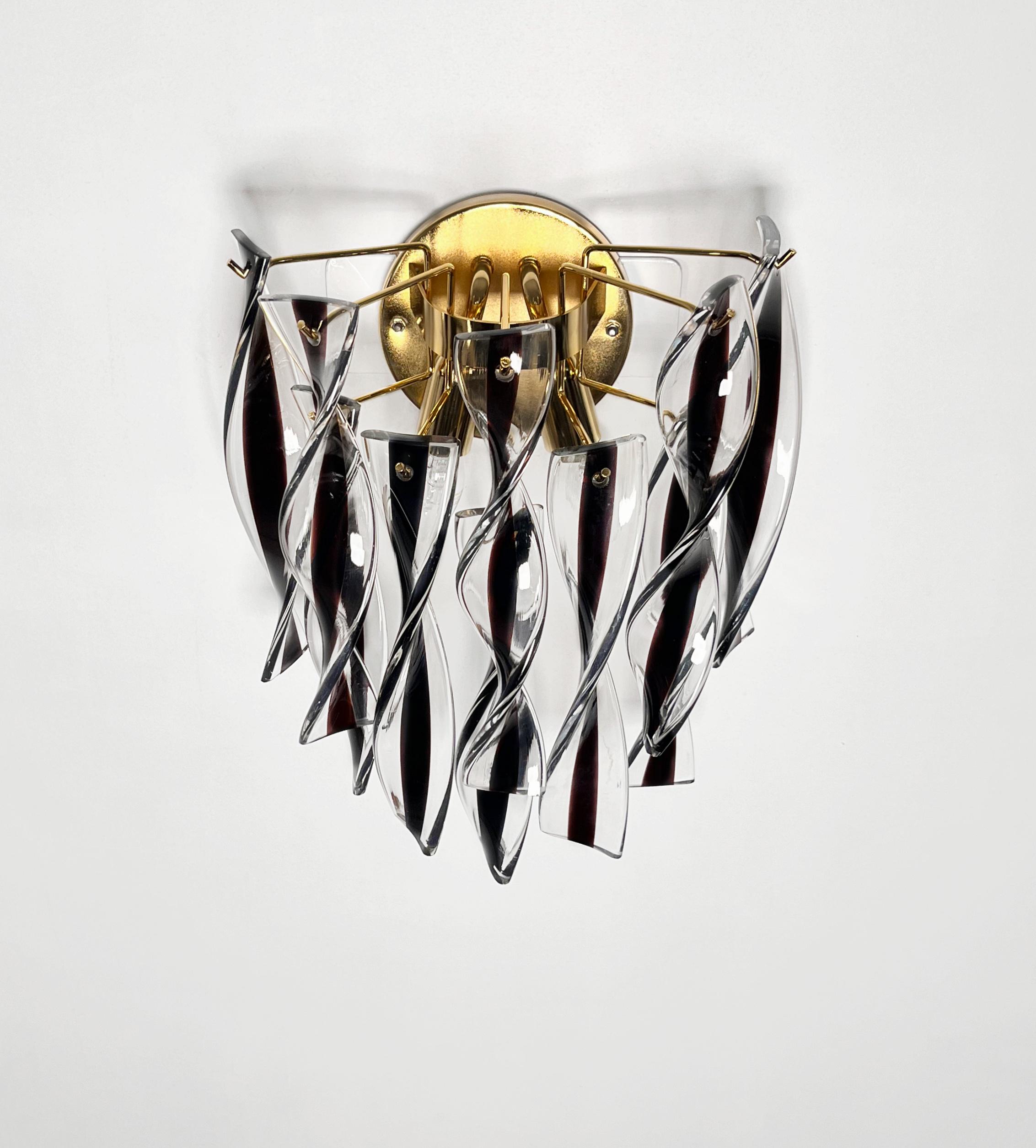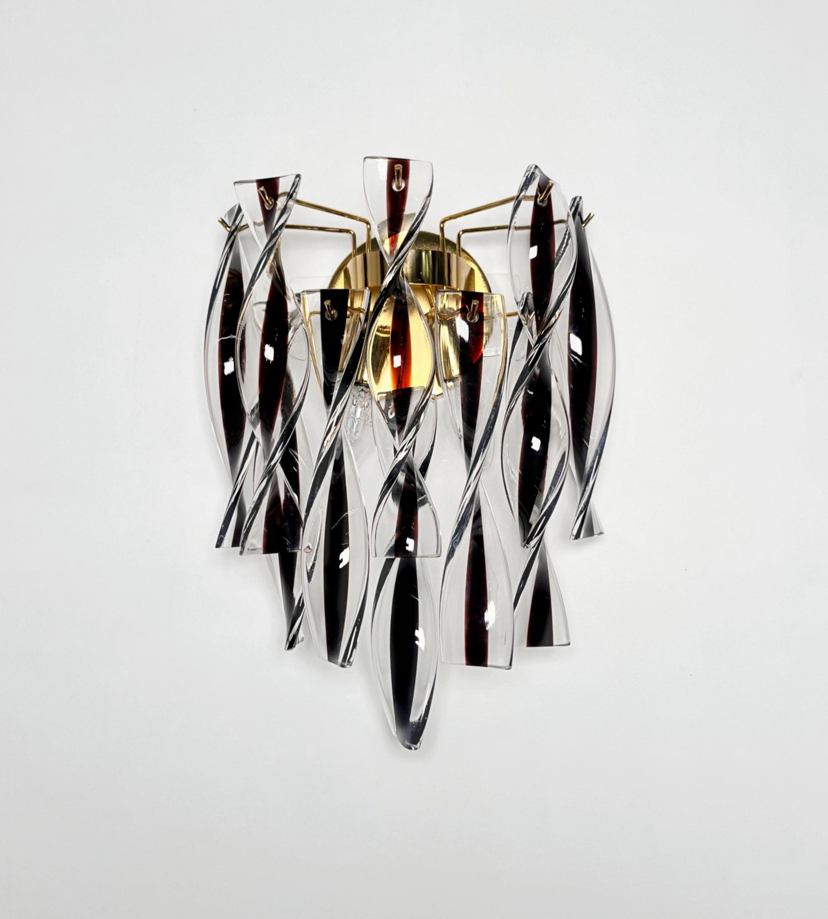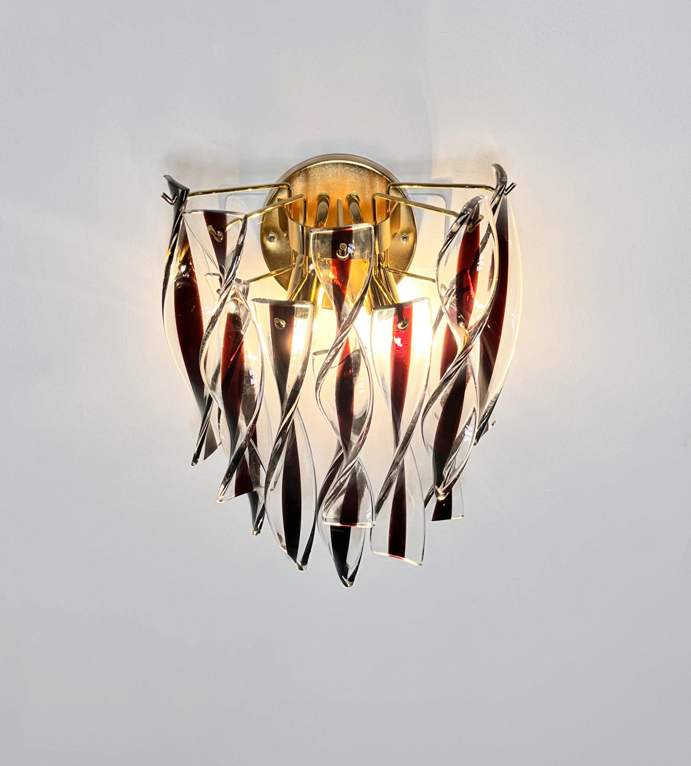 Pair of appliques with 10 pendants in colored Murano glass covered with crystal and hand-twisted in amethyst color. Gold-plated structure.