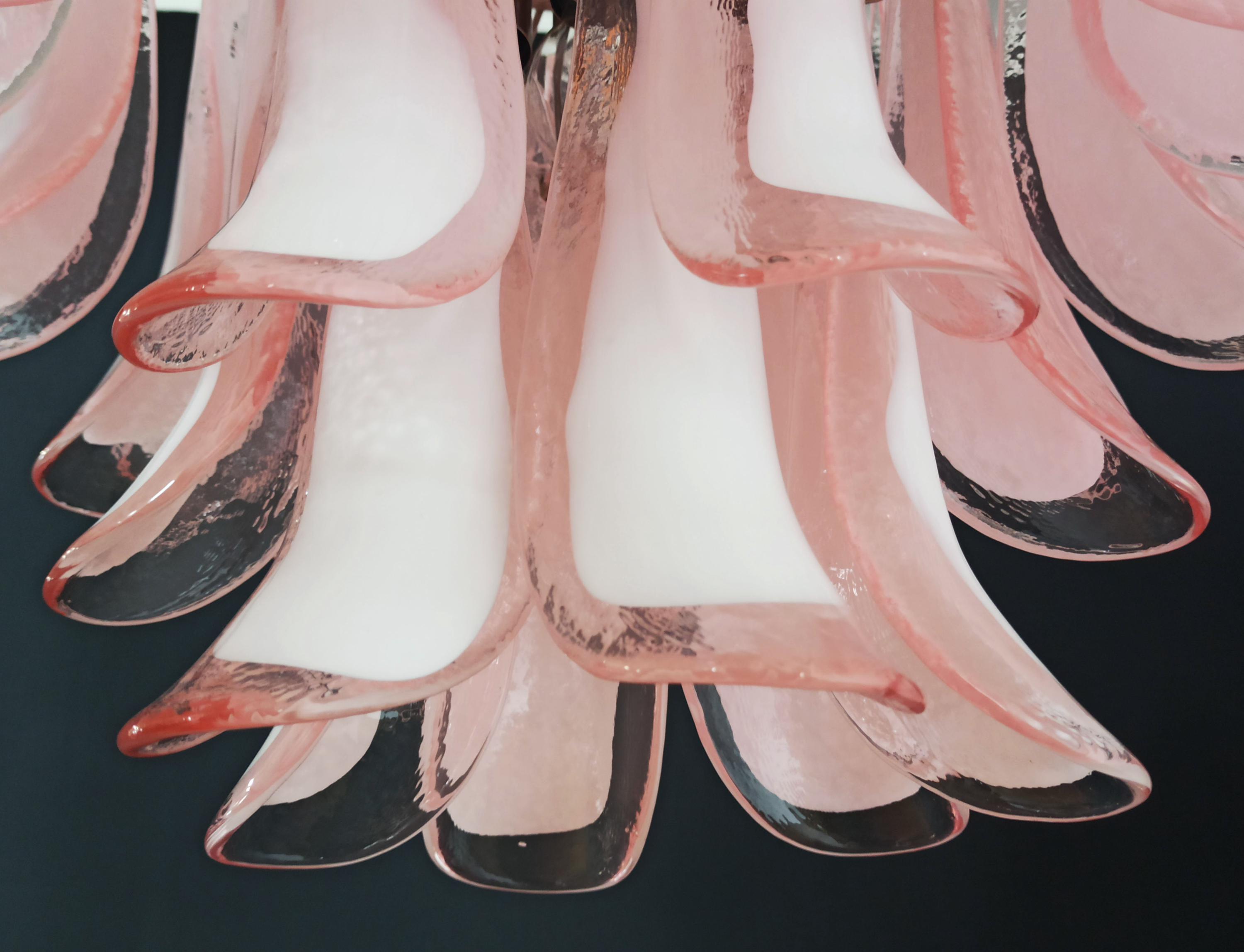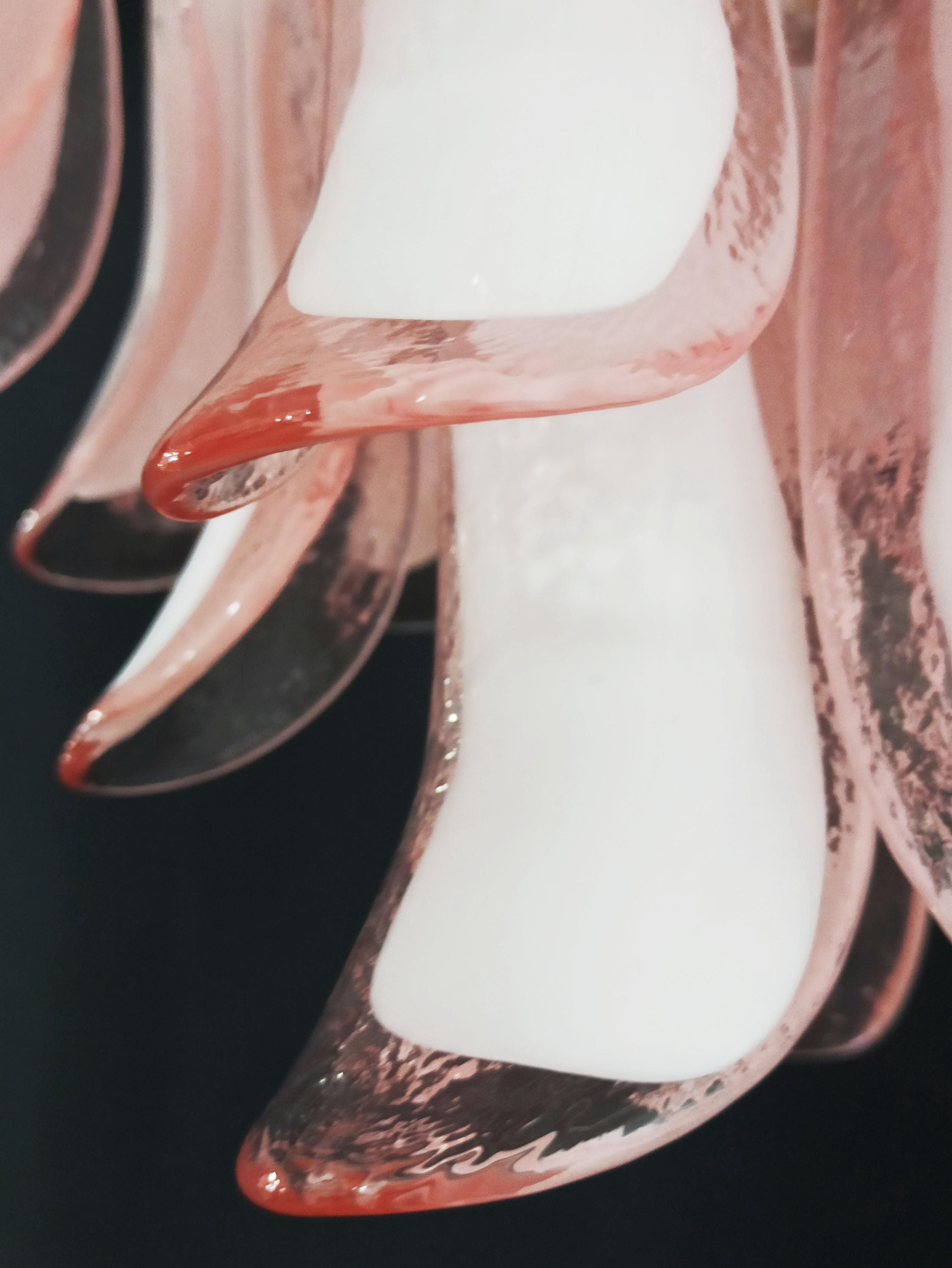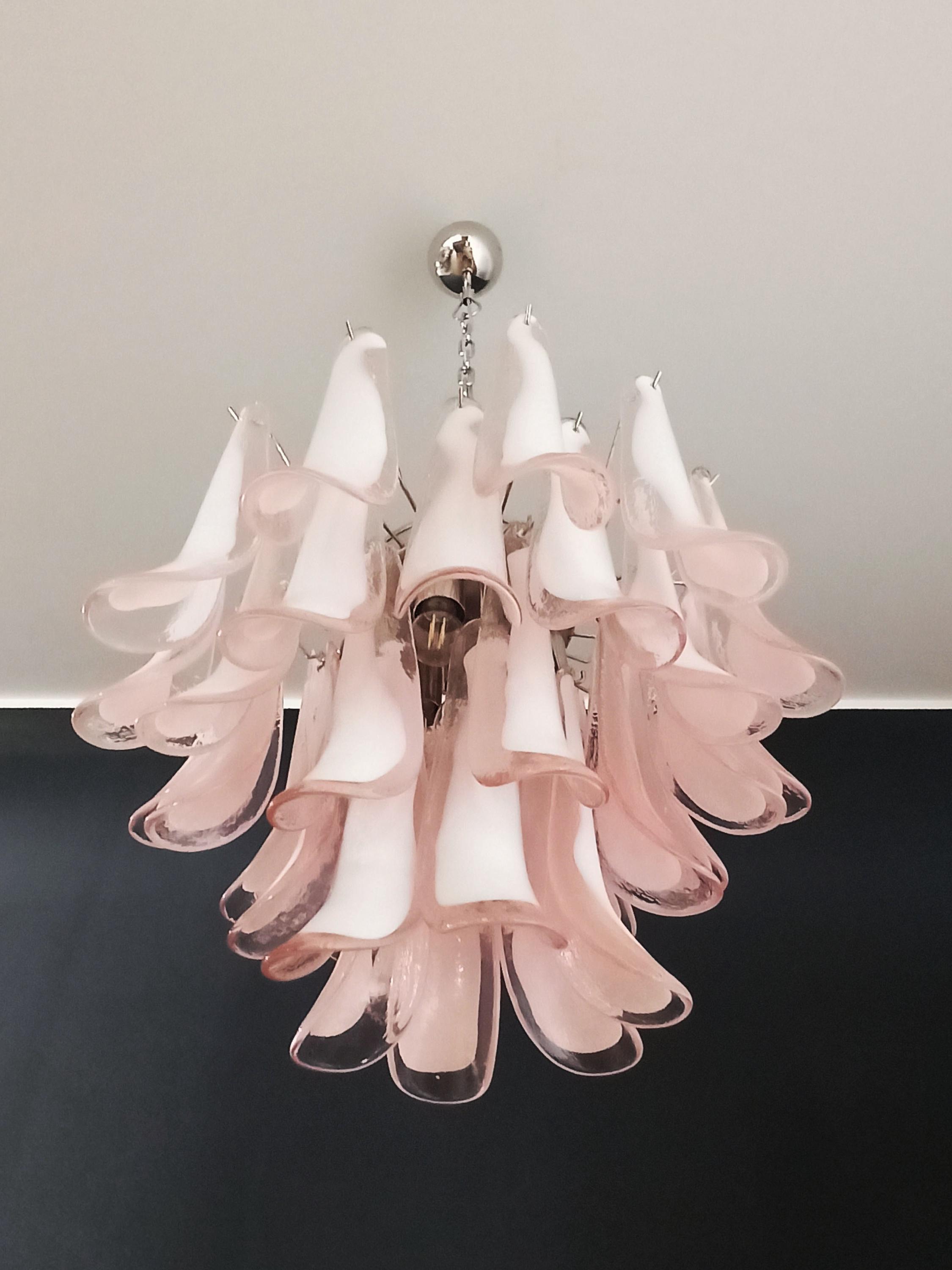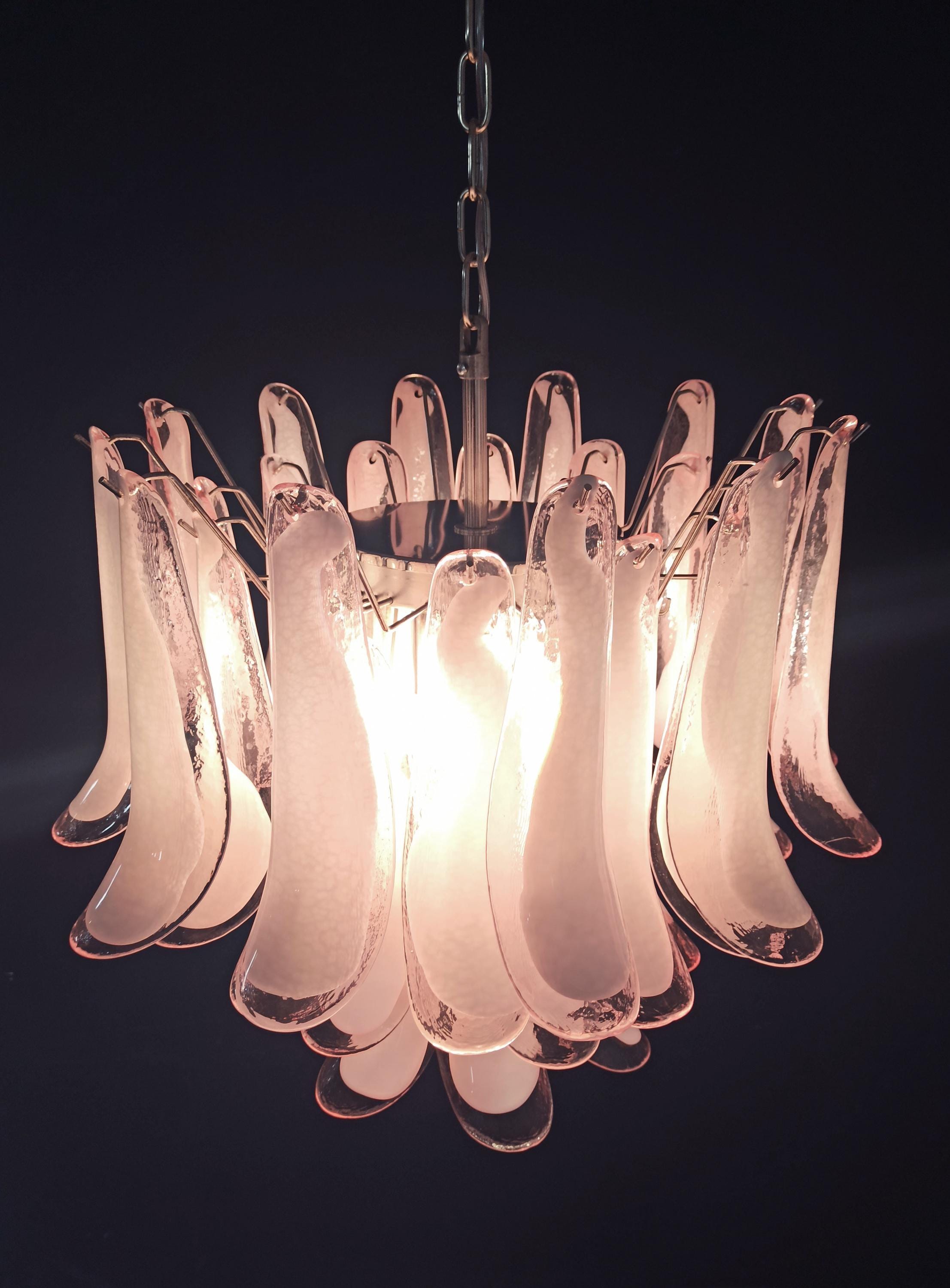 1970's Murano Italian glass chandelier. Fantastic chandelier with pink and white “lattimo” glasses, nickel-plated metal frame. It has 36 big monumental glass petals. The glasses are very high