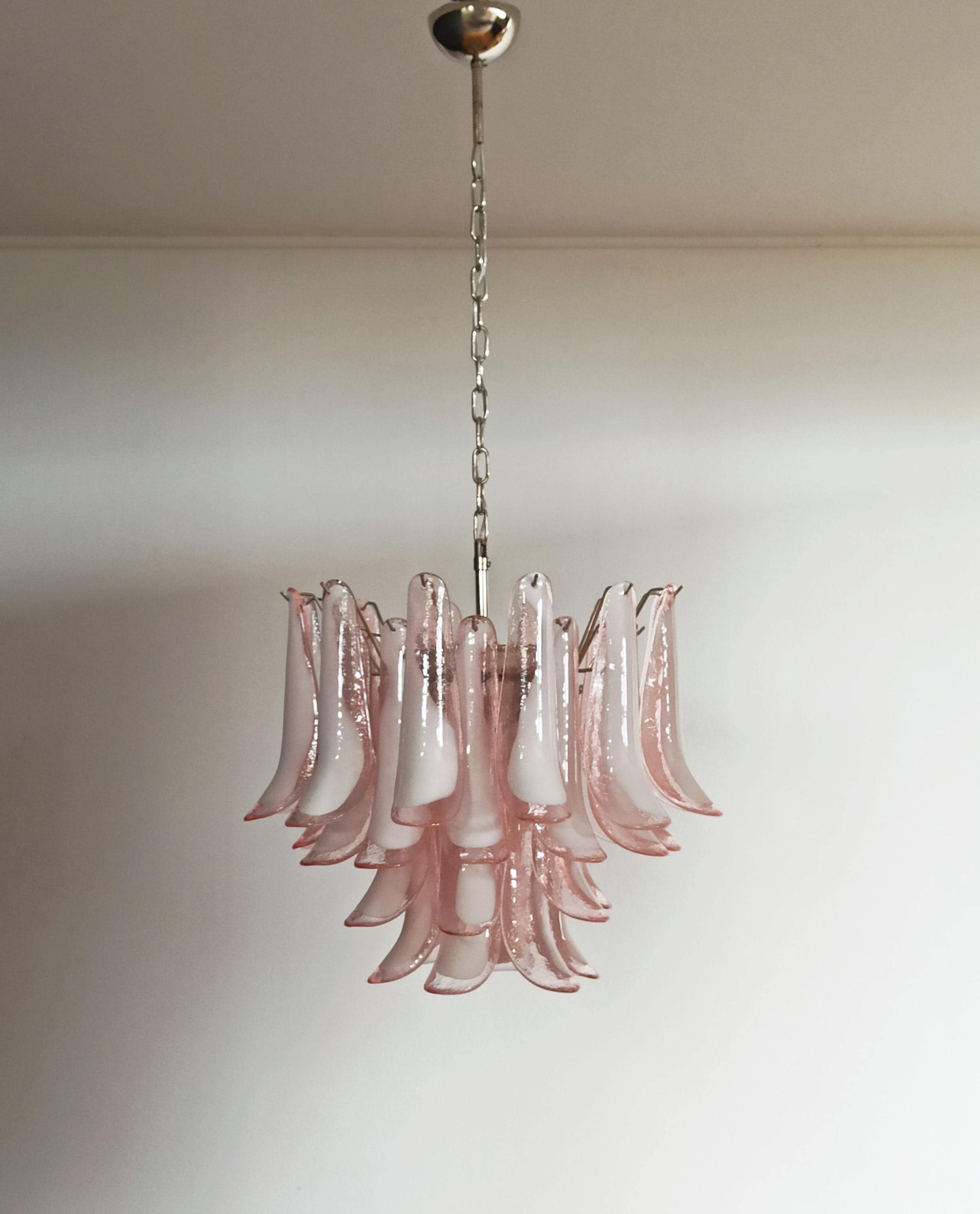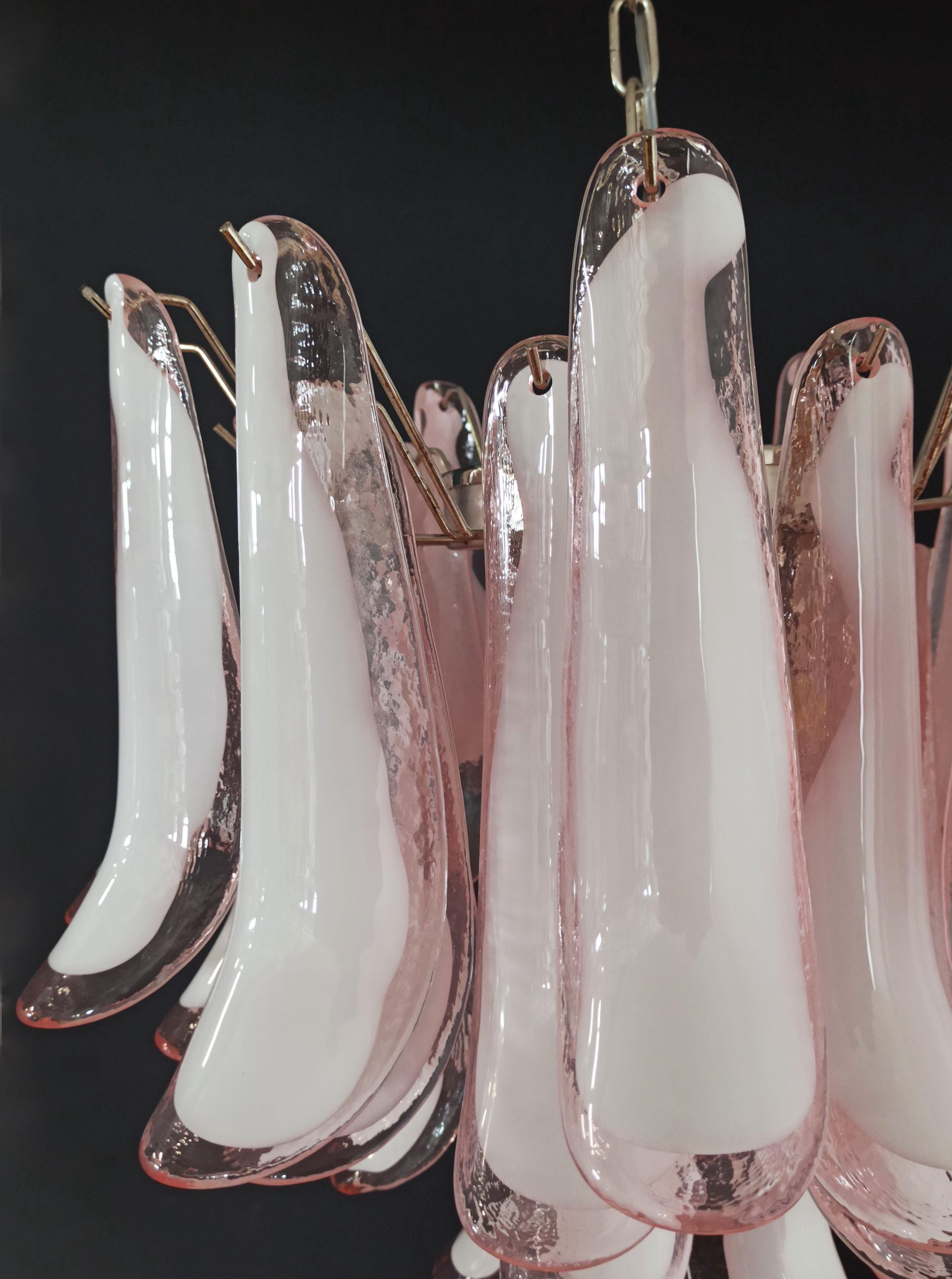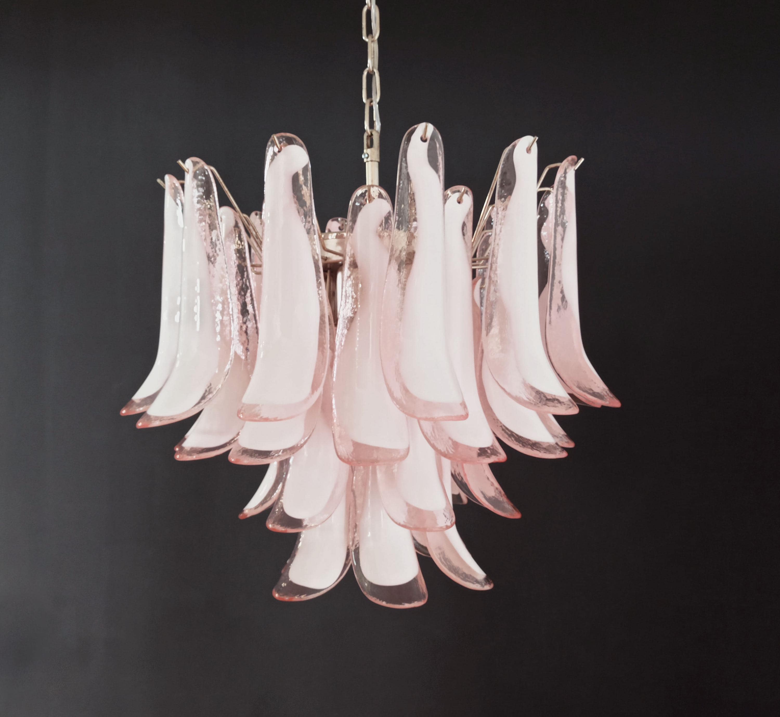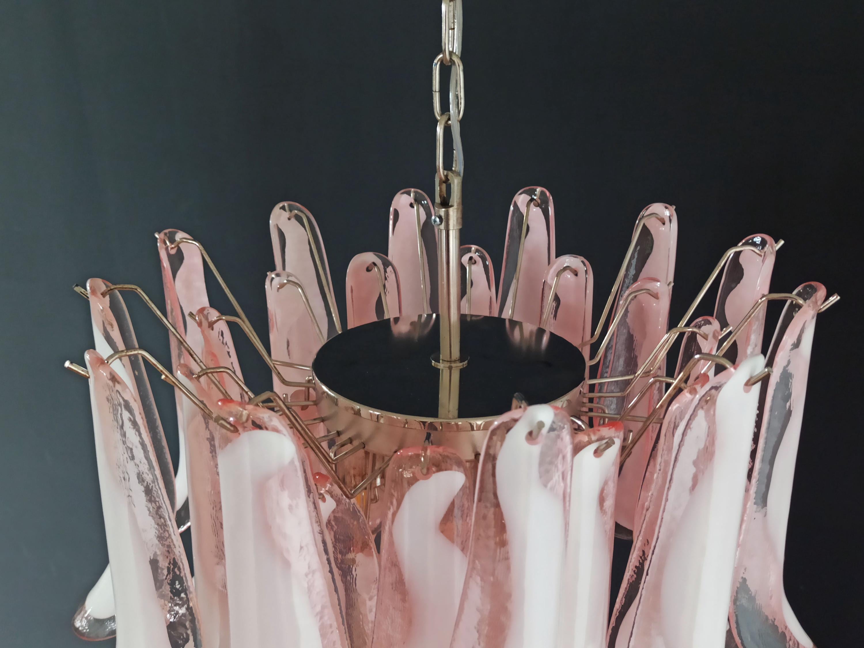 1970's Murano Italian glass chandelier. Fantastic chandelier with pink and white “lattimo” glasses, nickel-plated metal frame. It has 36 big monumental glass petals. The glasses are very high