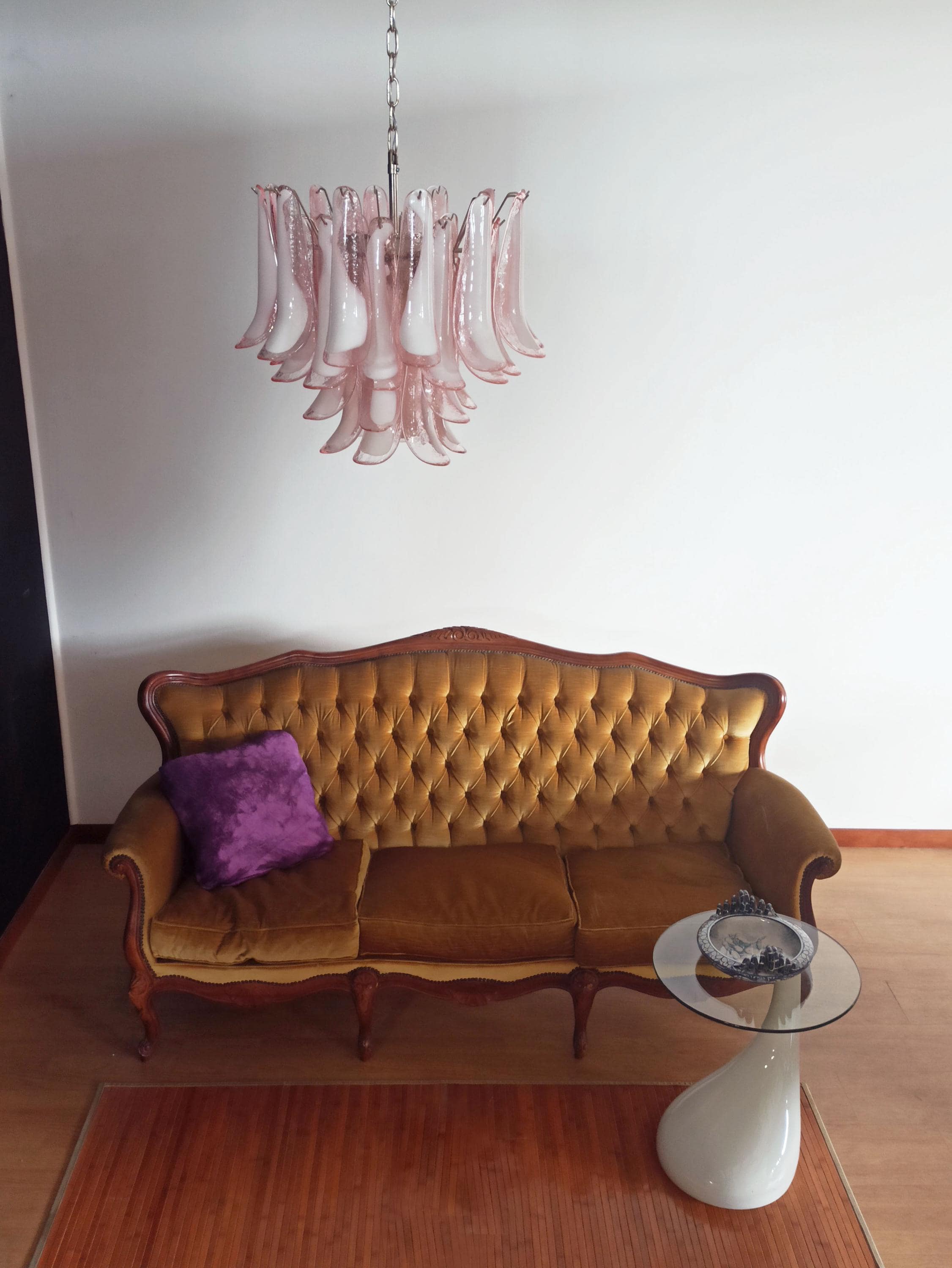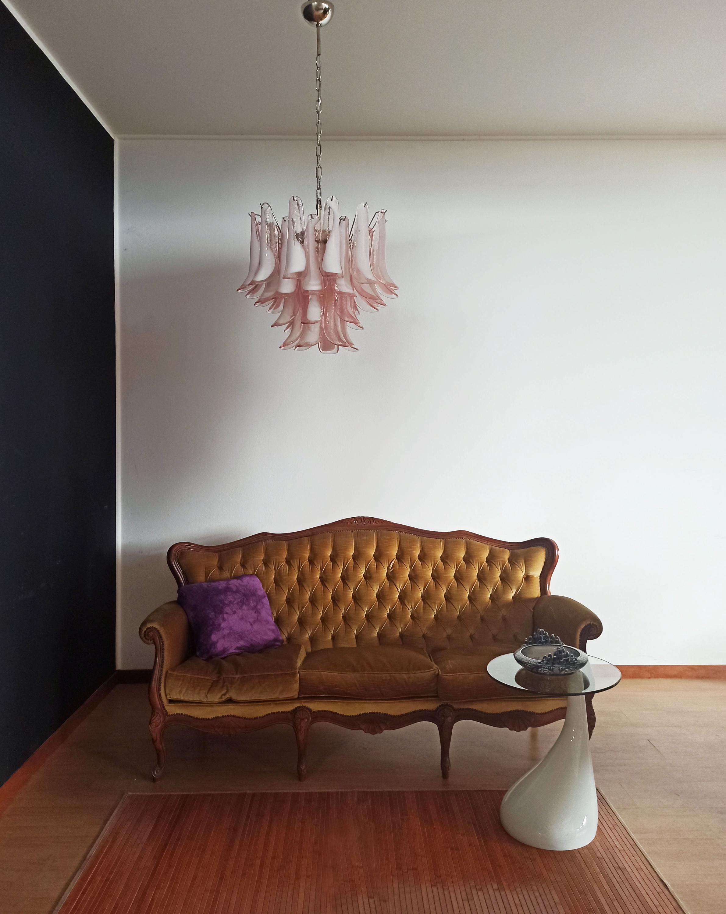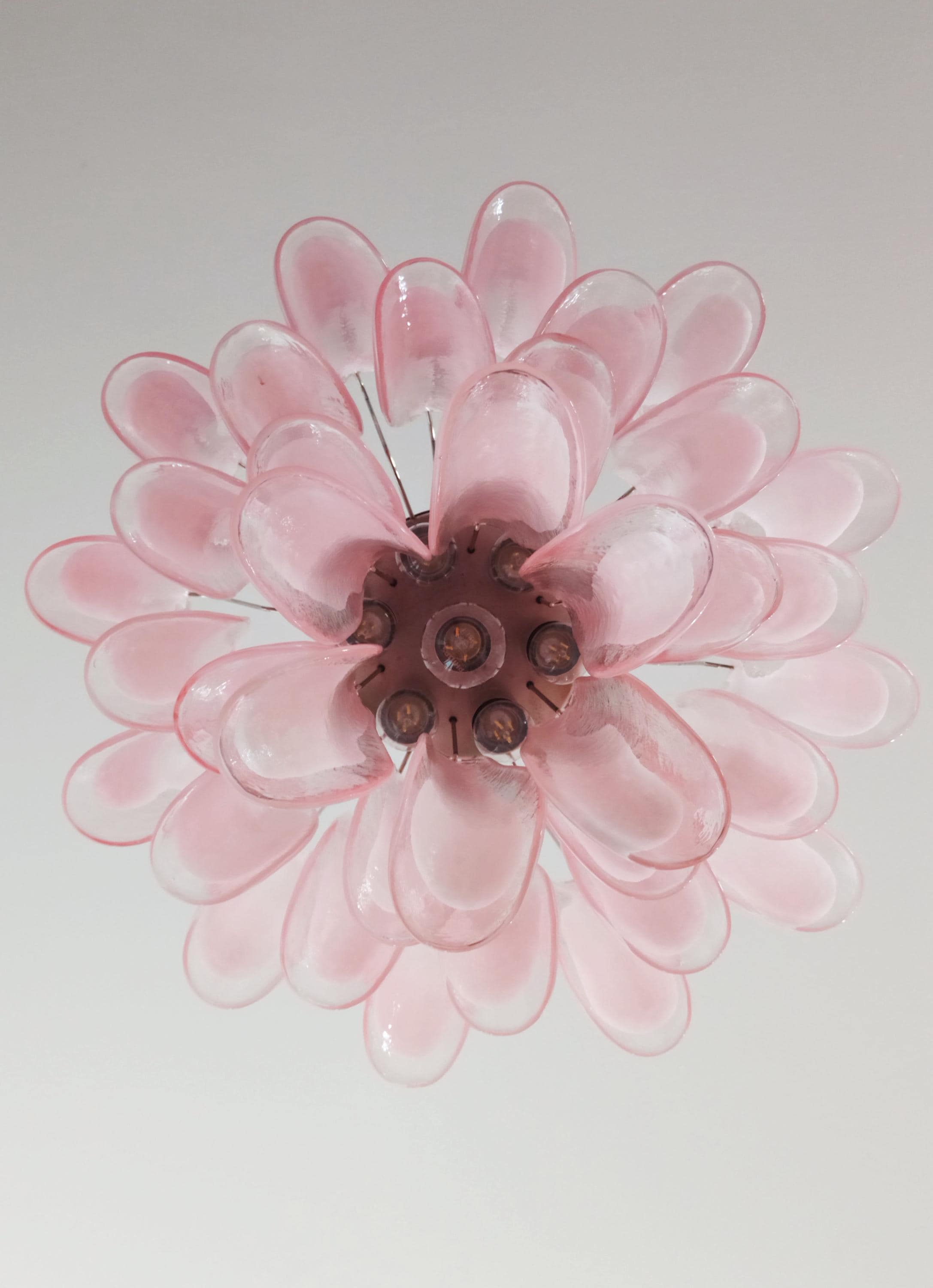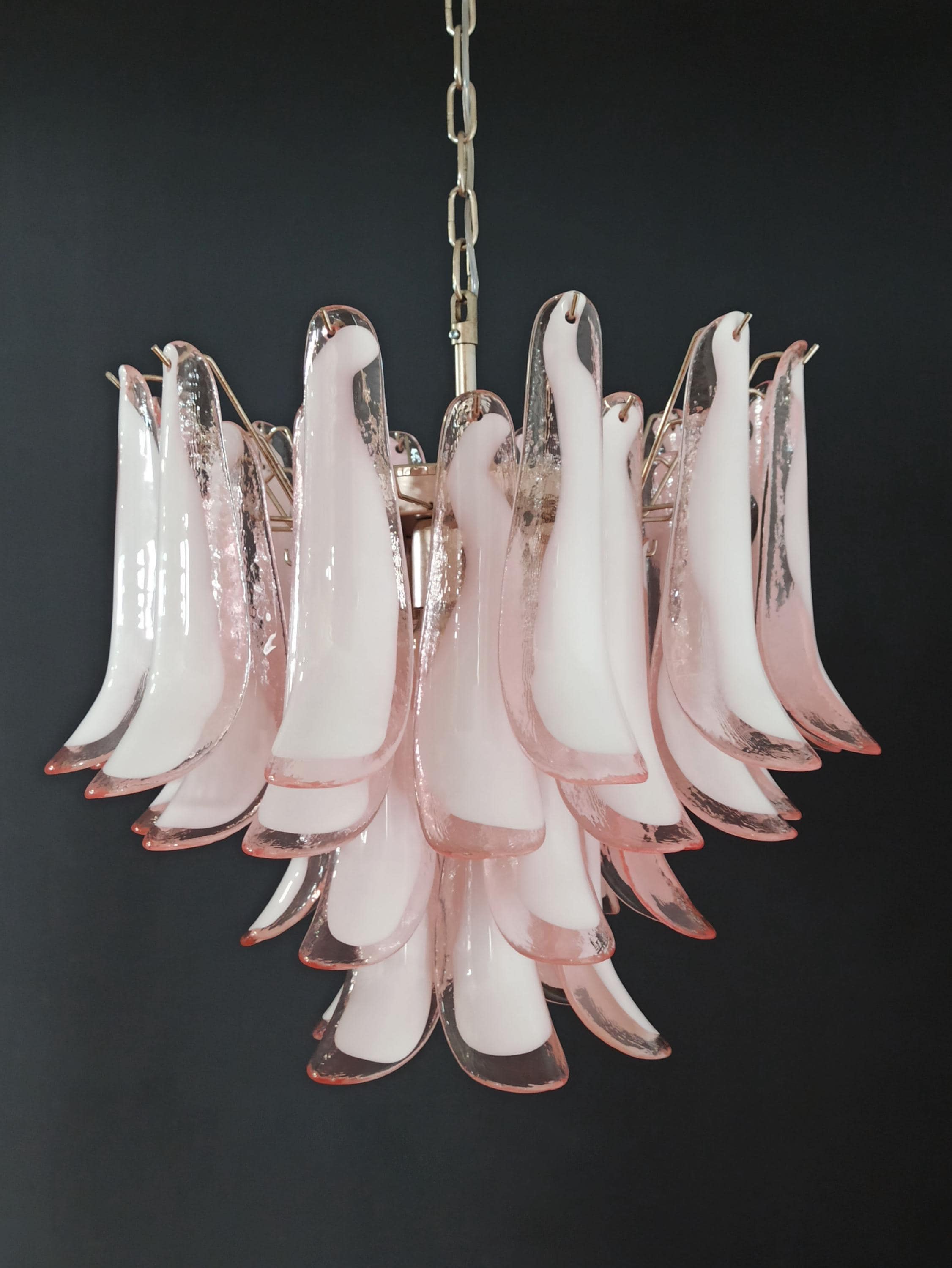1970's Murano Italian glass chandelier. Fantastic chandelier with pink and white “lattimo” glasses, nickel-plated metal frame. It has 36 big monumental glass petals. The glasses are very high