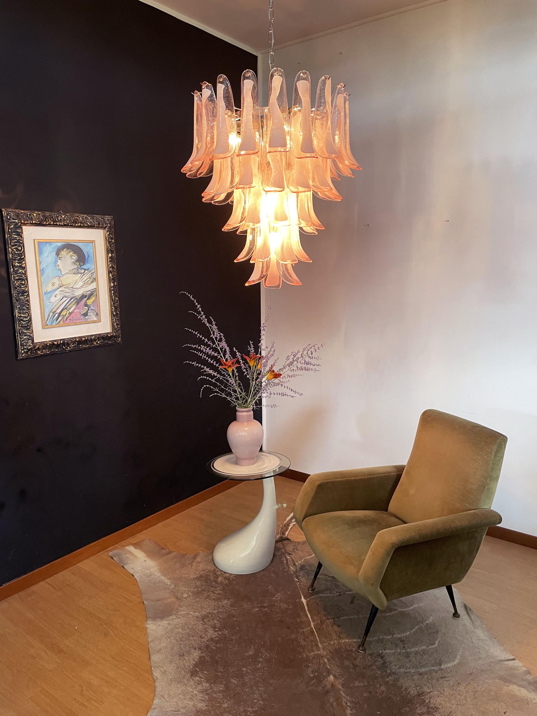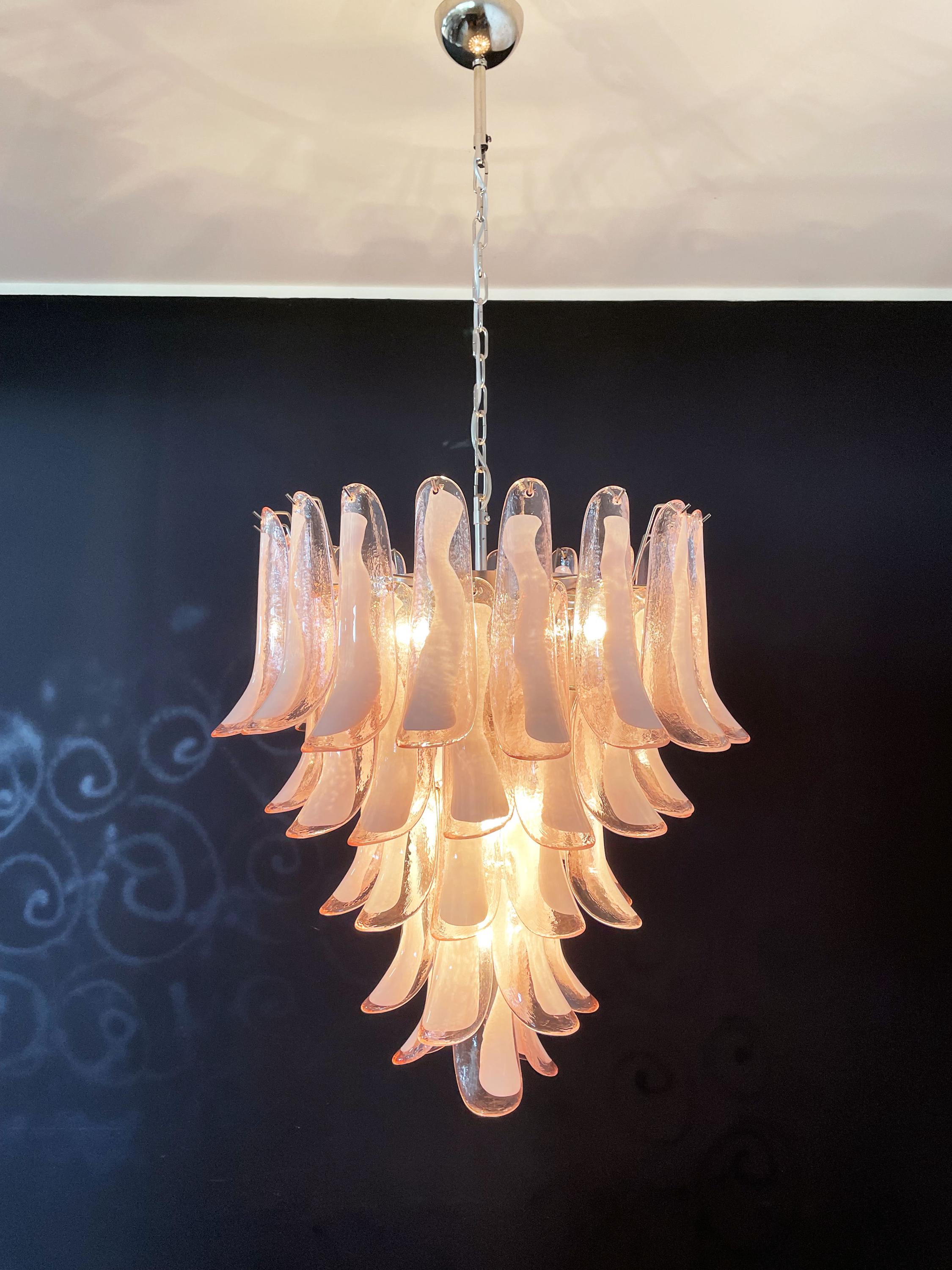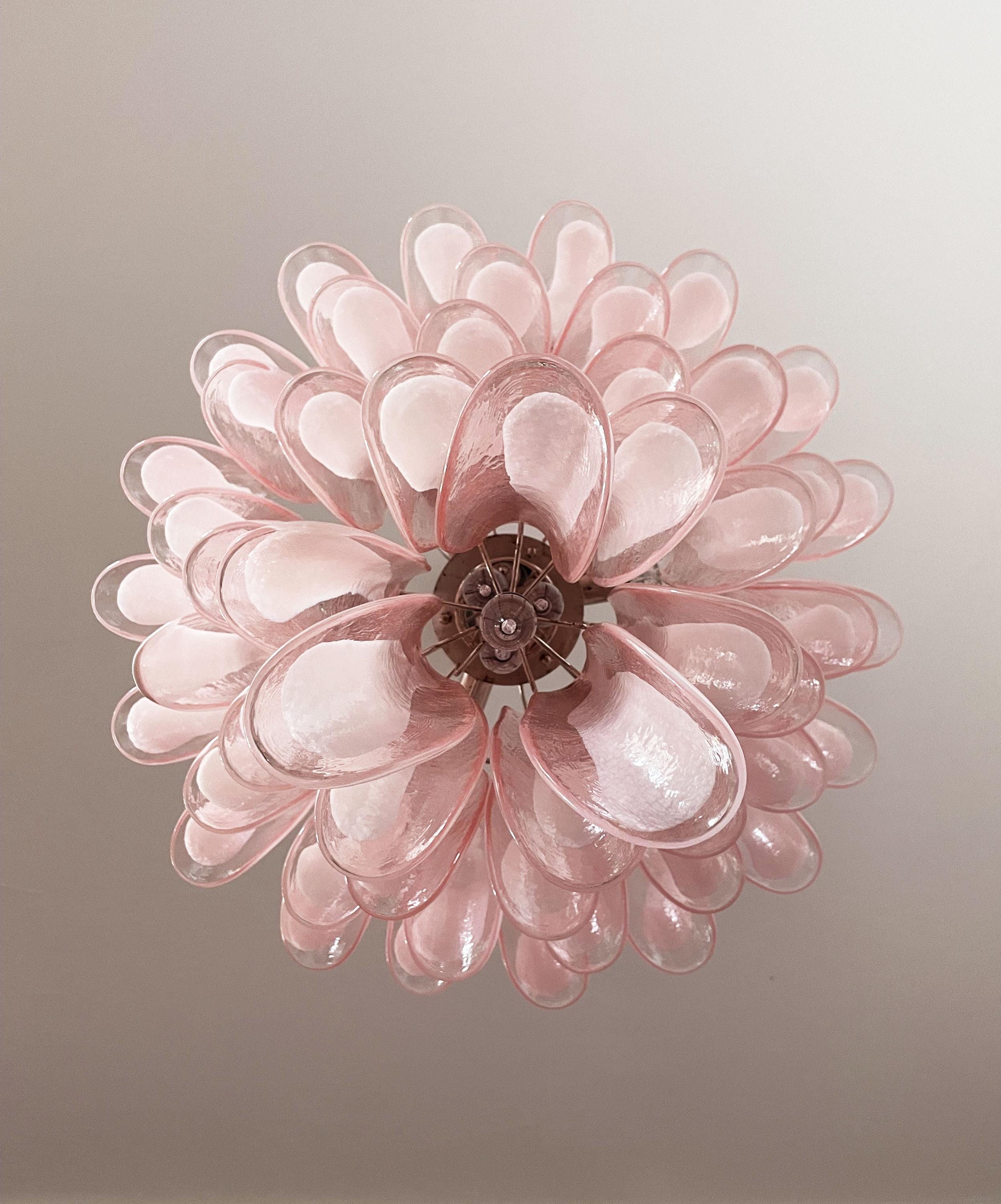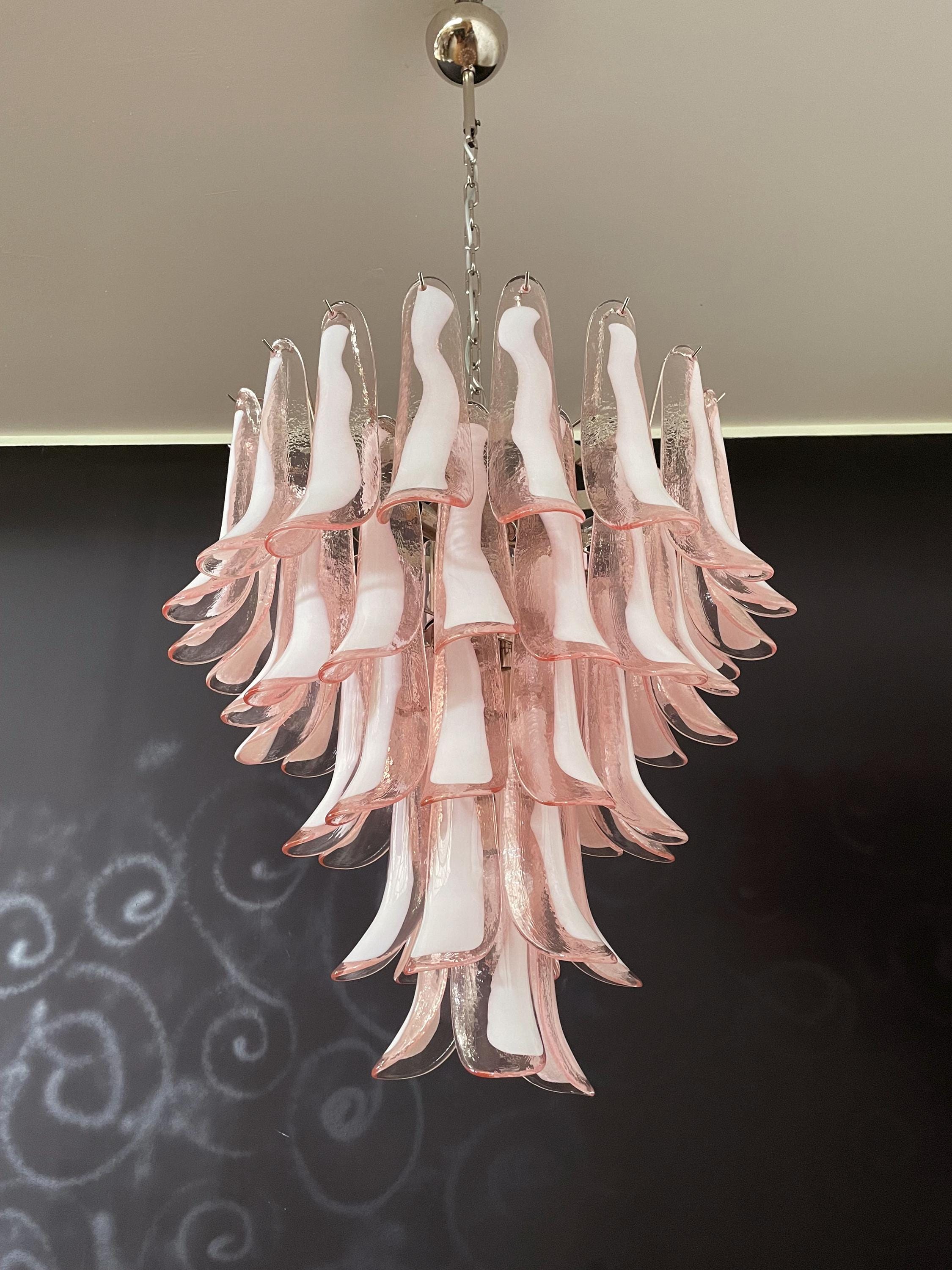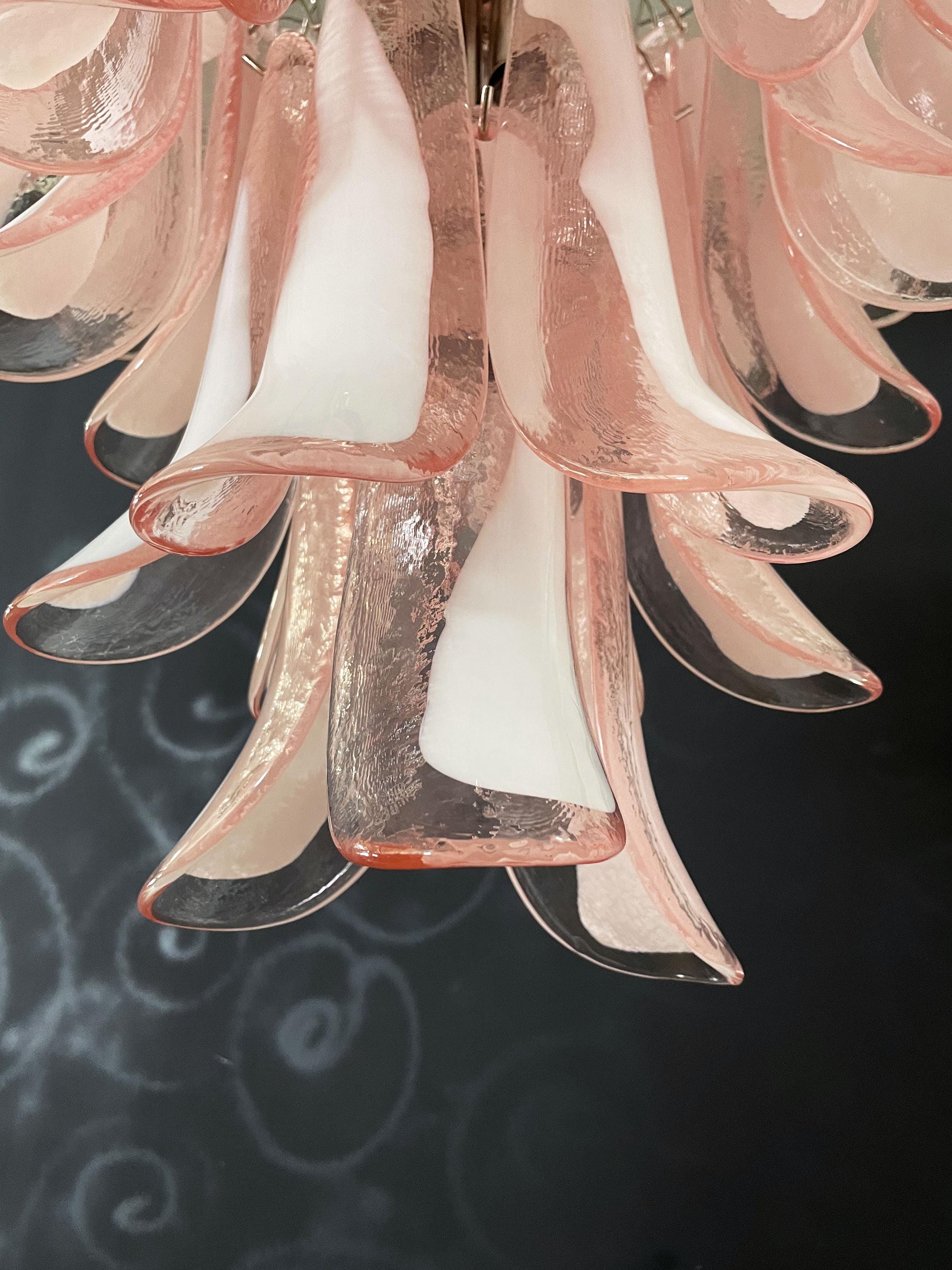 Huge Italian vintage Murano chandelier made by 52 glass petals (PINK and white “lattimo”) in a chrome frame.