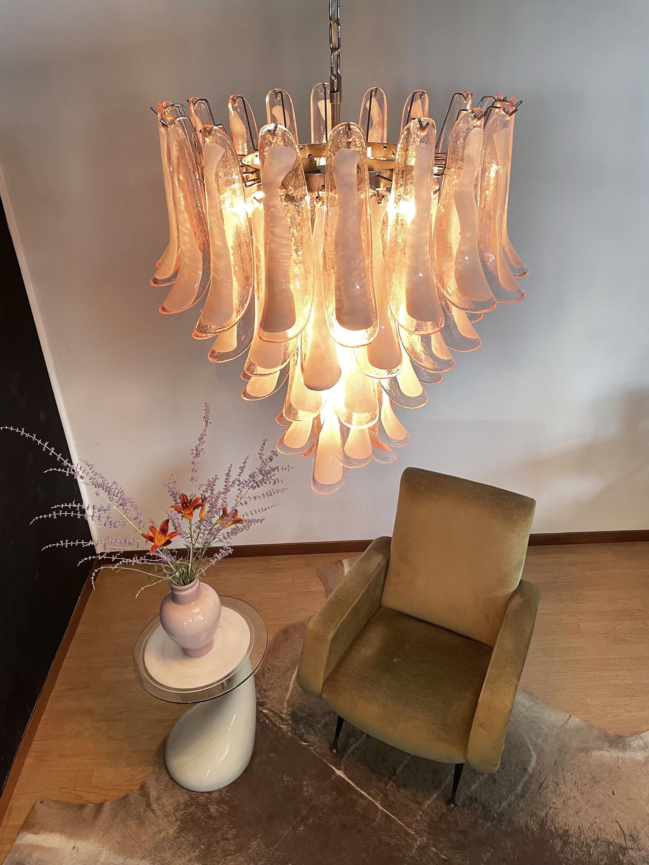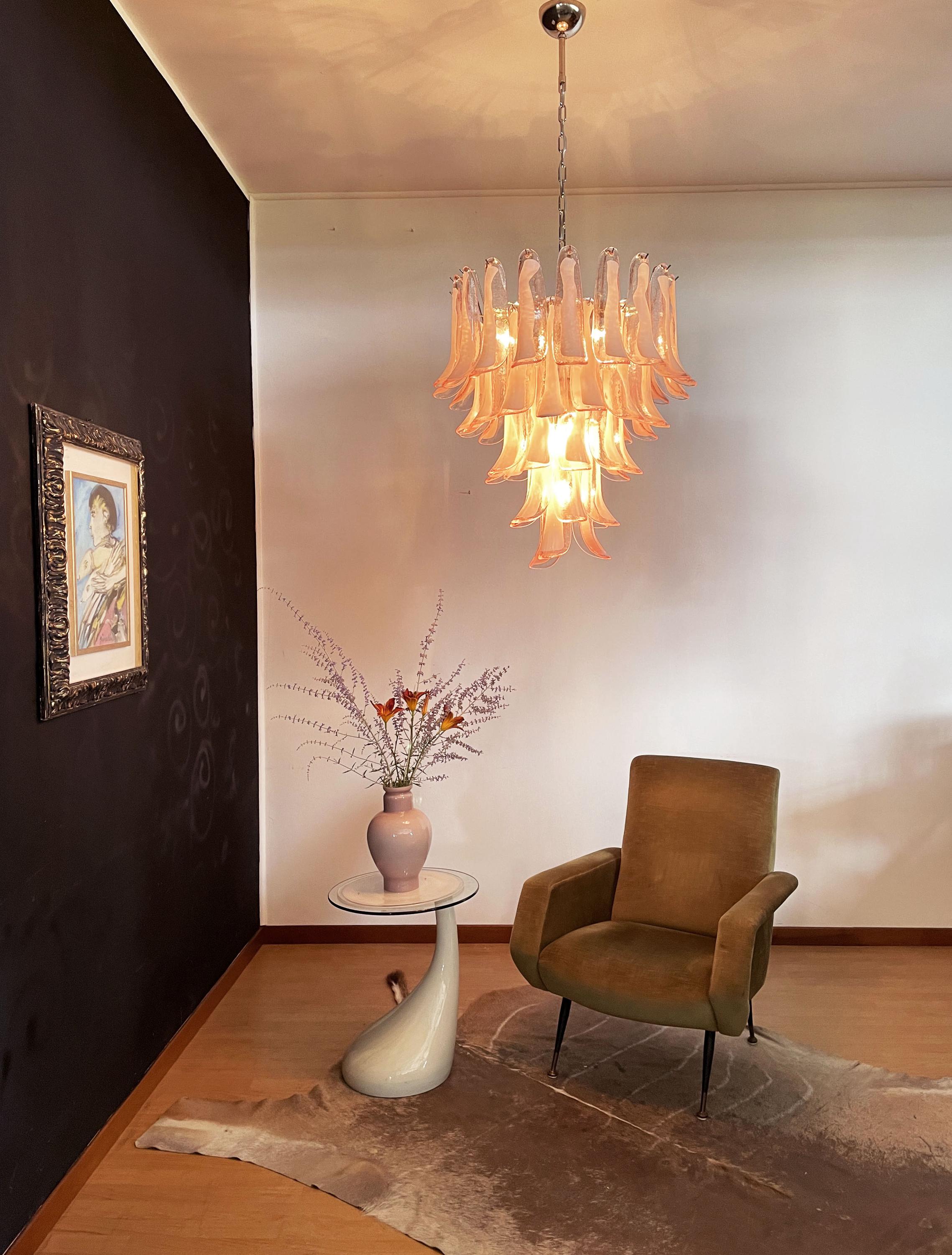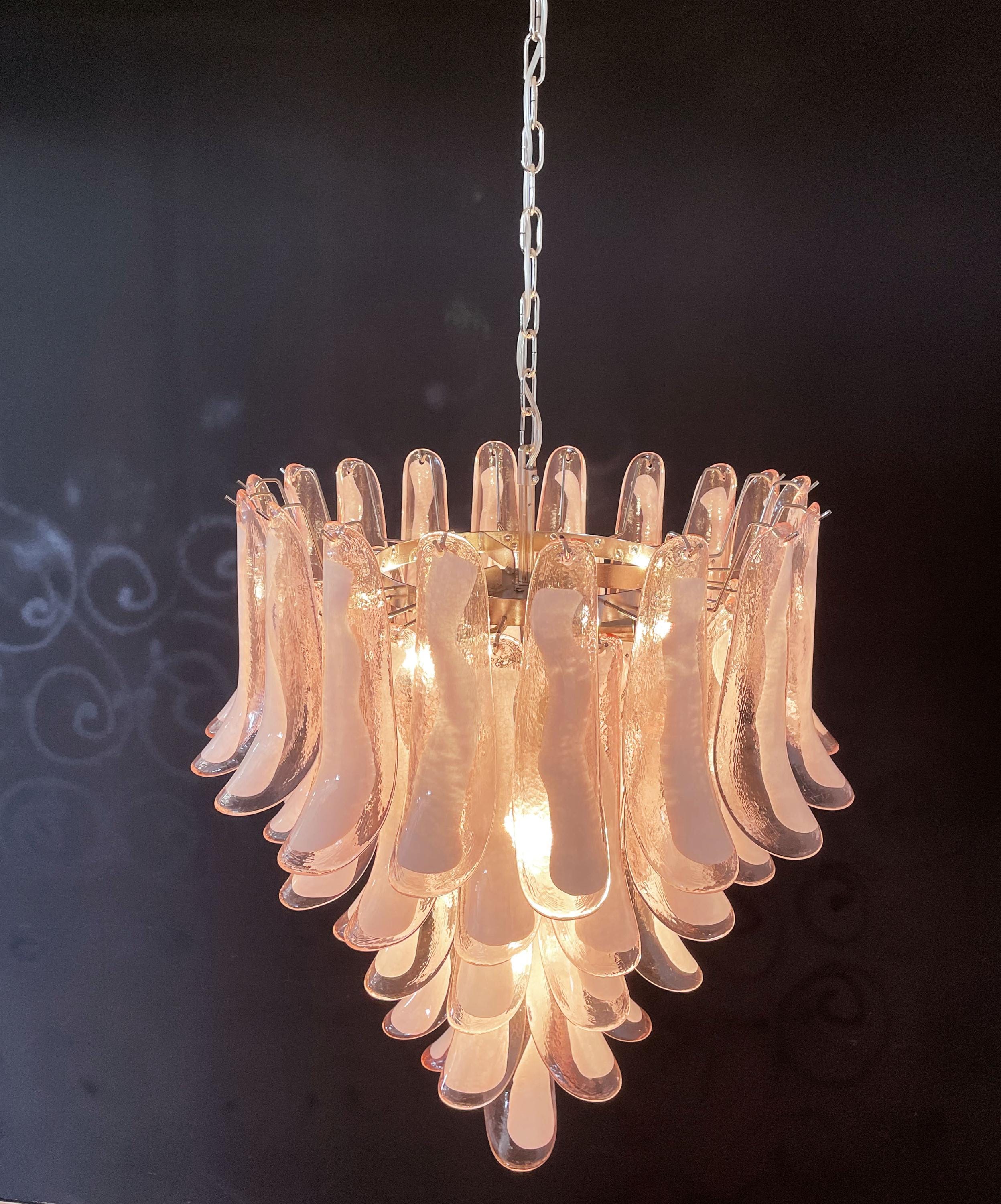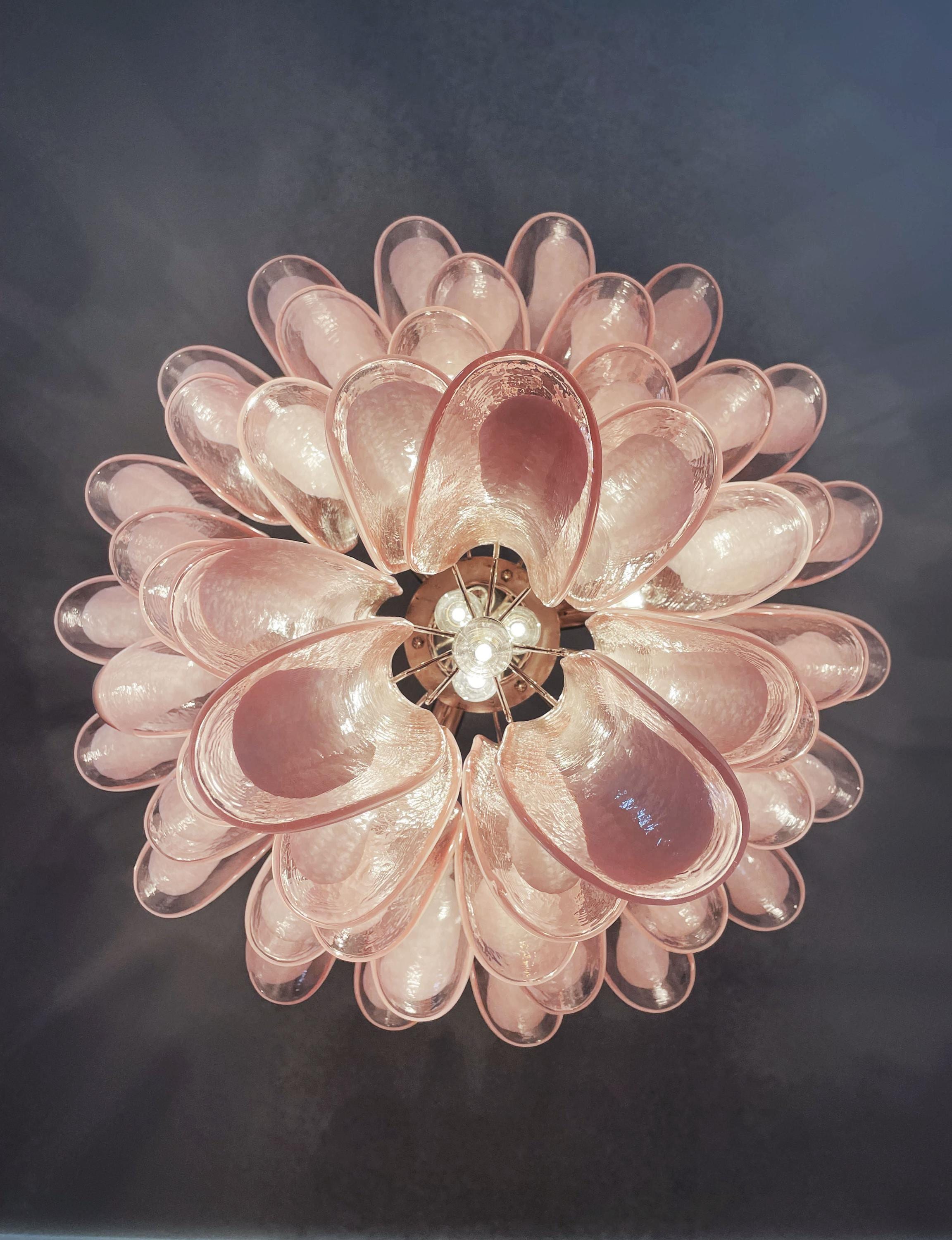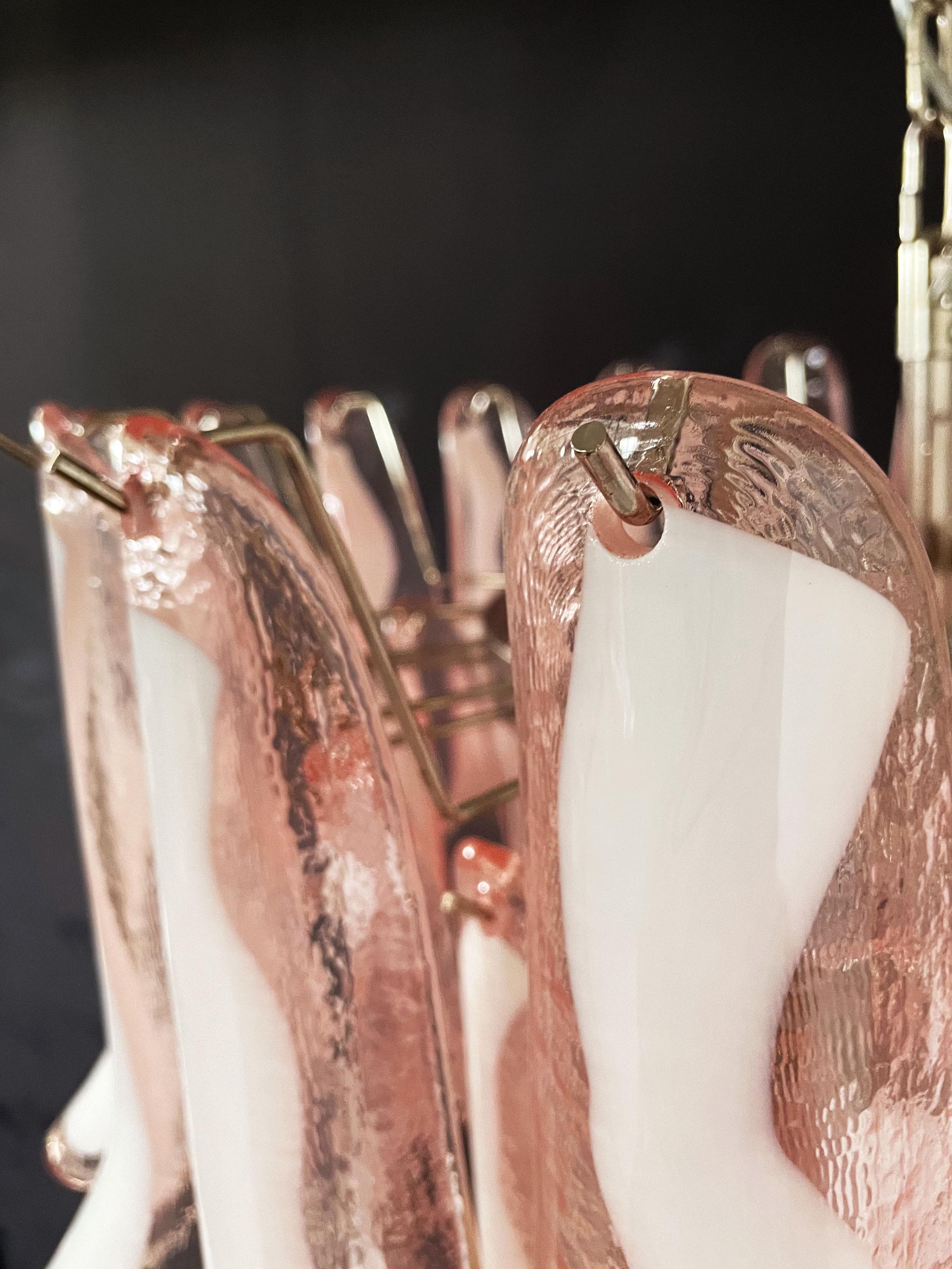 Huge Italian vintage Murano chandelier made by 52 glass petals (PINK and white “lattimo”) in a chrome frame.