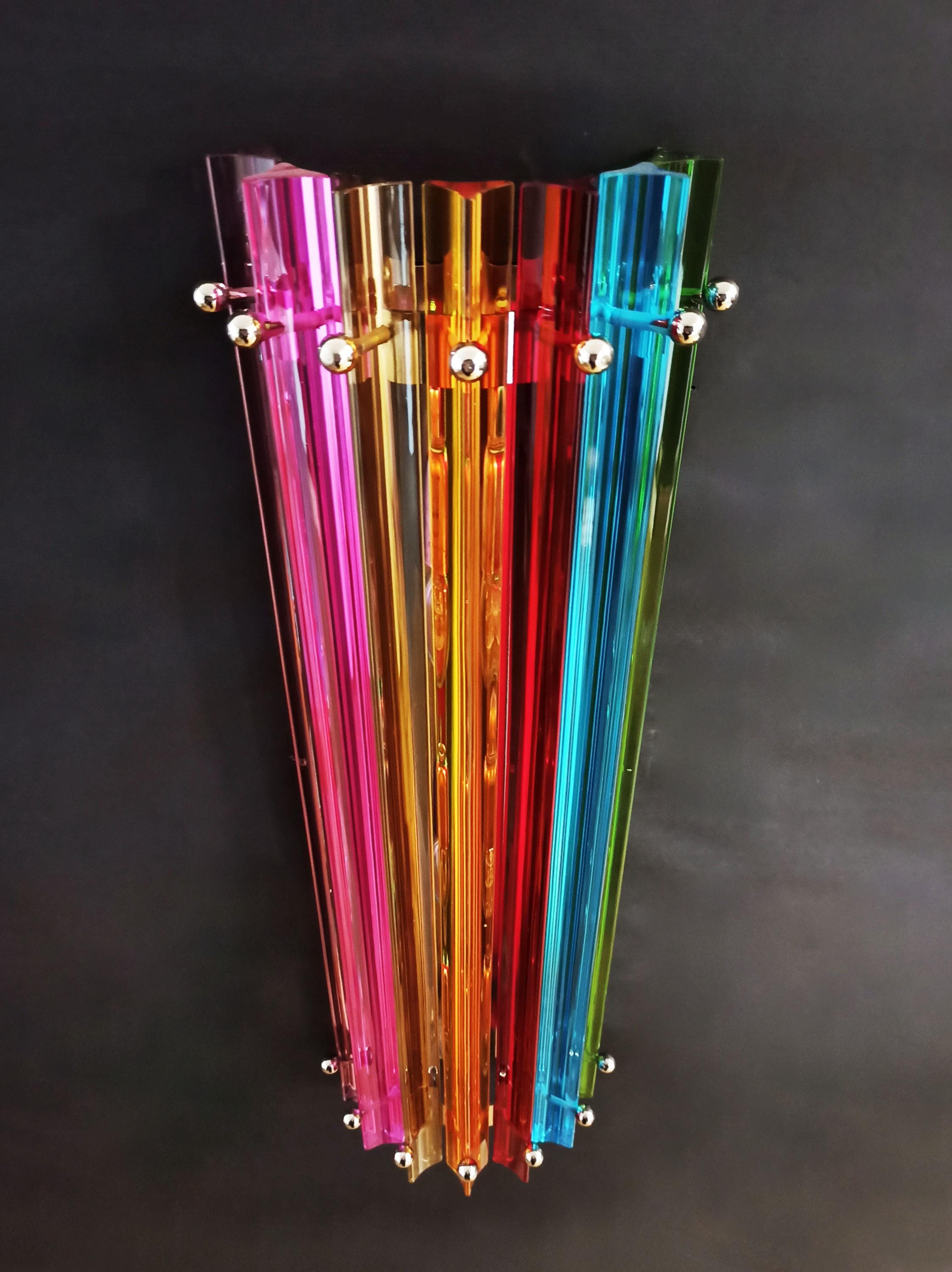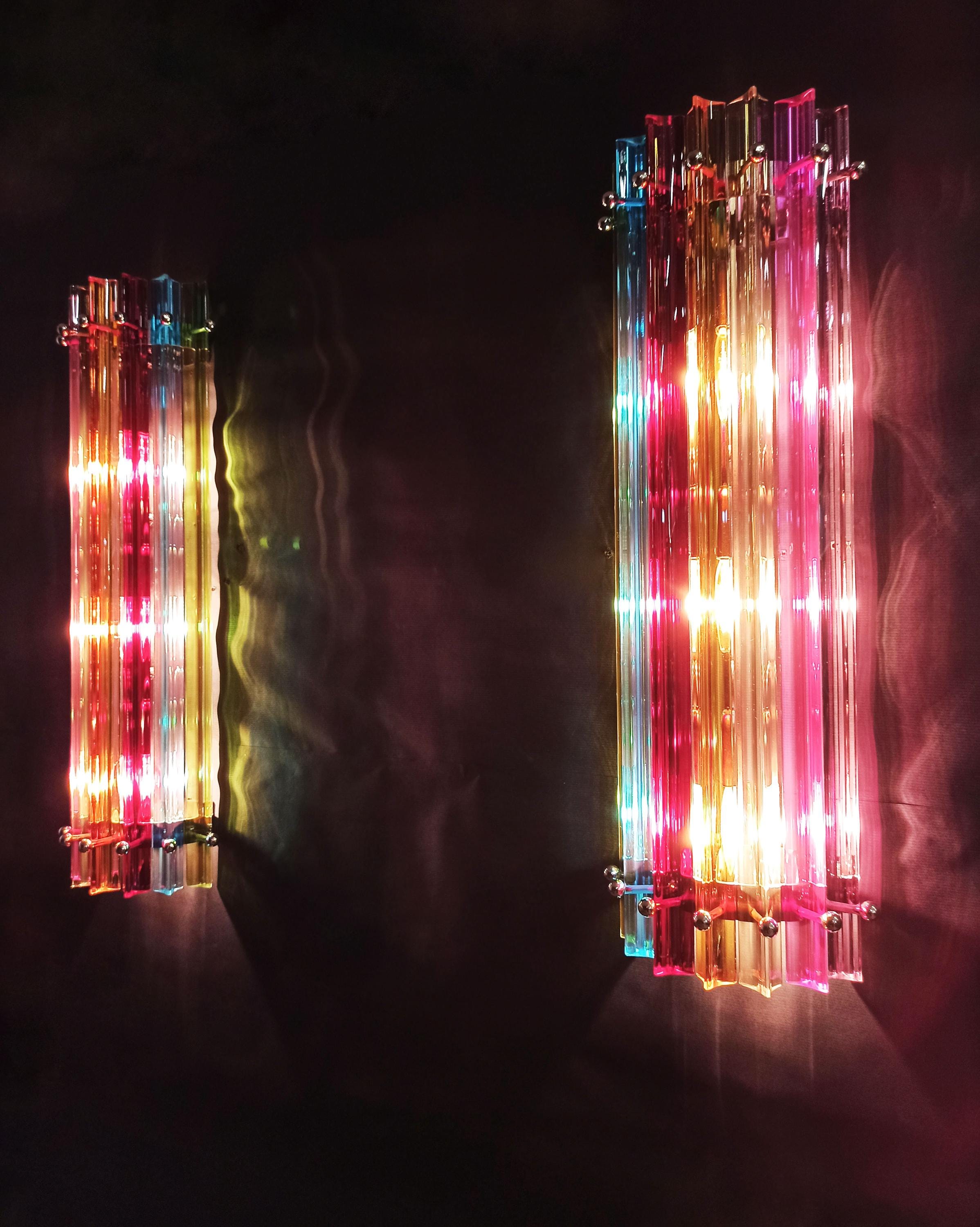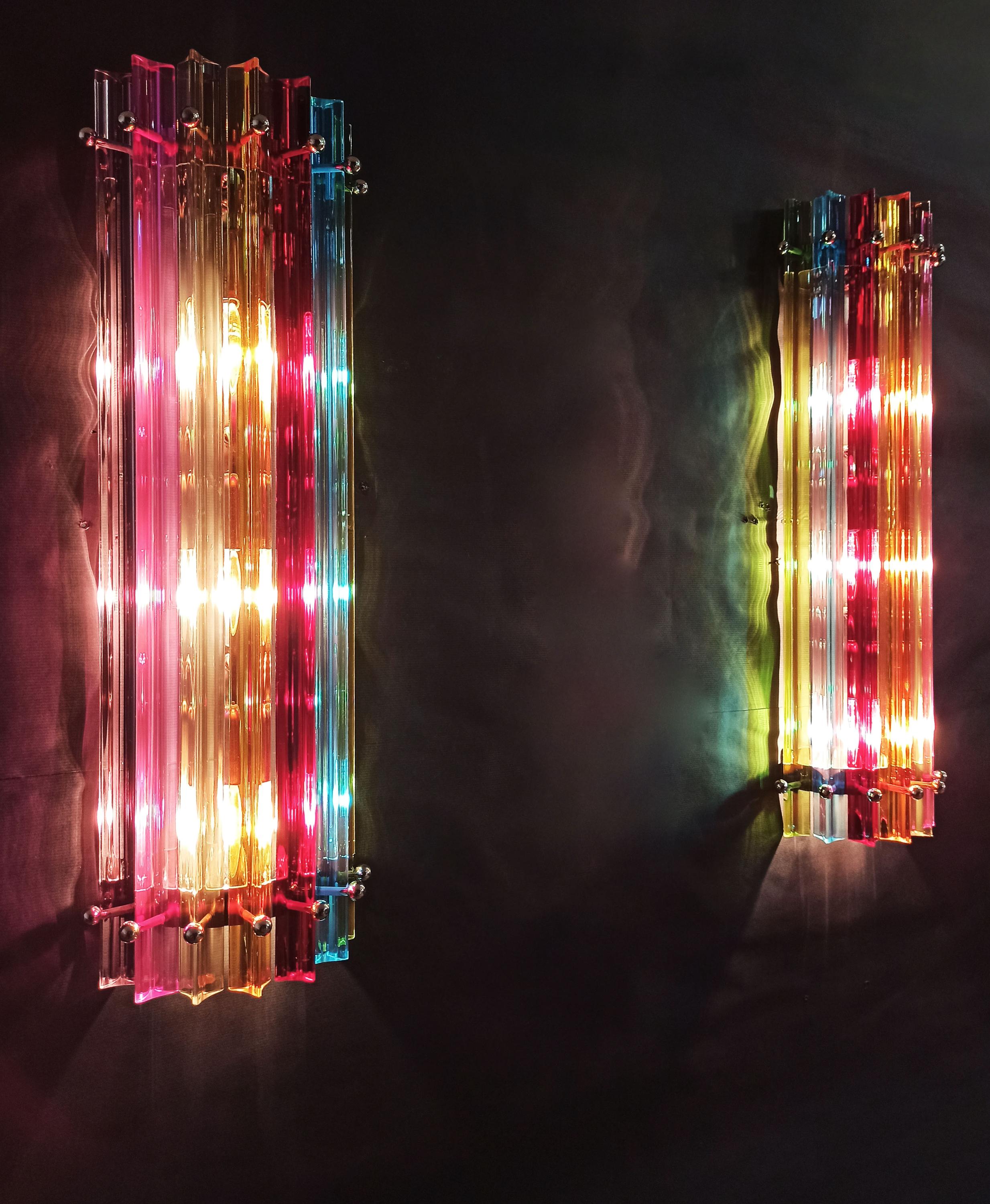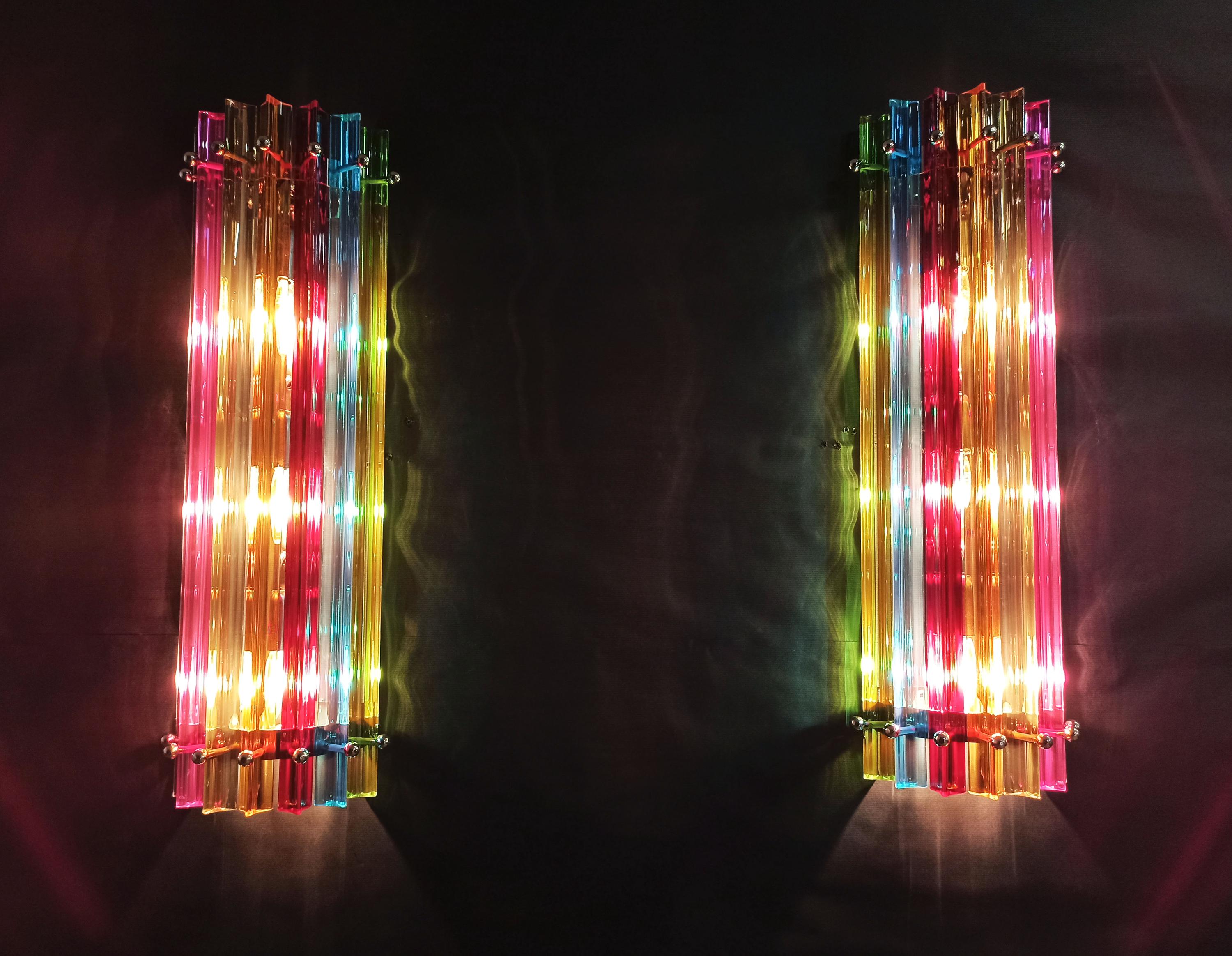 Fantastic pair of vintage Murano wall sconce made by 7 Murano crystal prism (trihedrons) for each applique in a chrome metal frame. The shape of this sconce is column. The glasses are transparent, blue, amber, green, and pink. The wall lamps can be