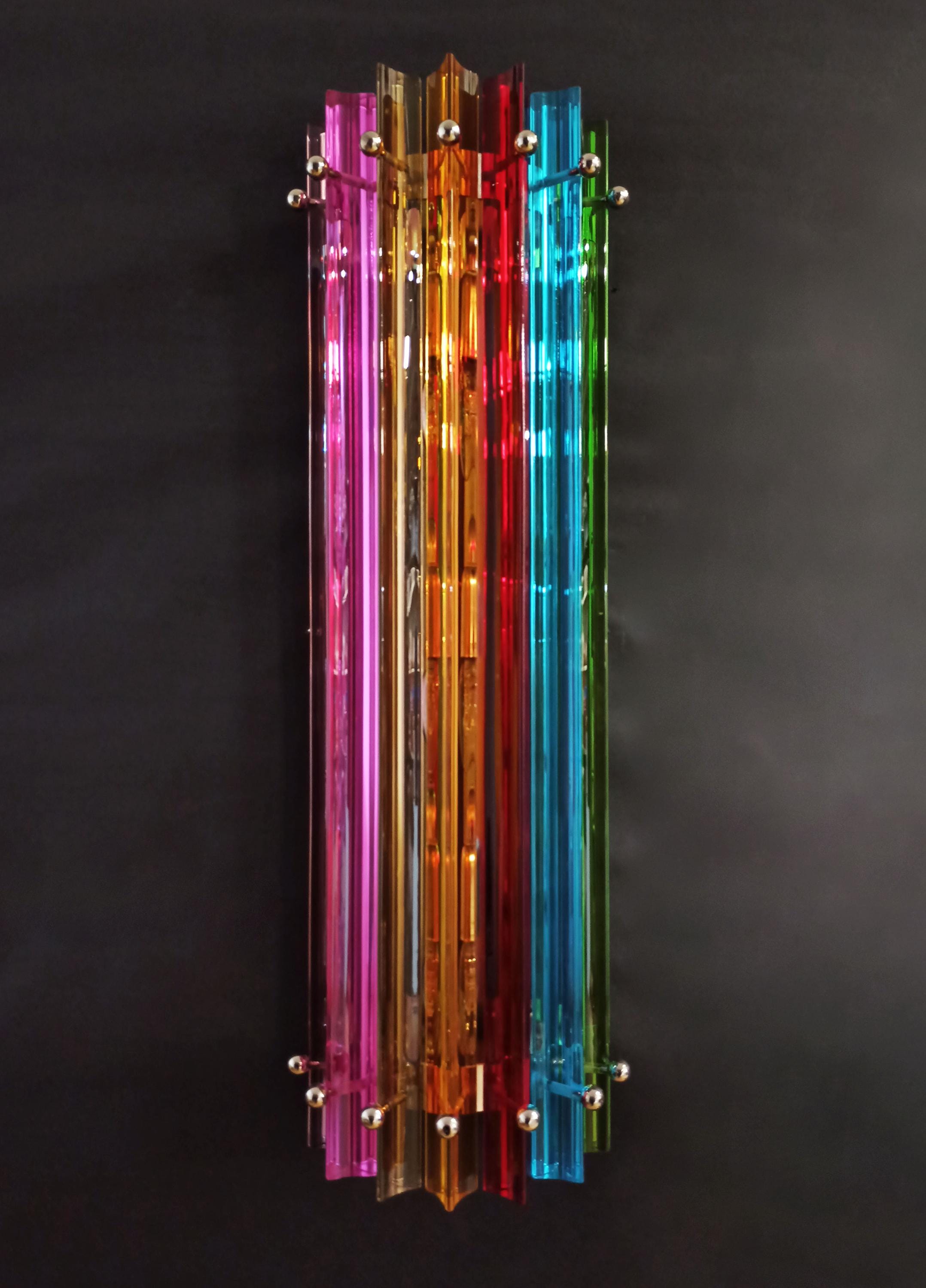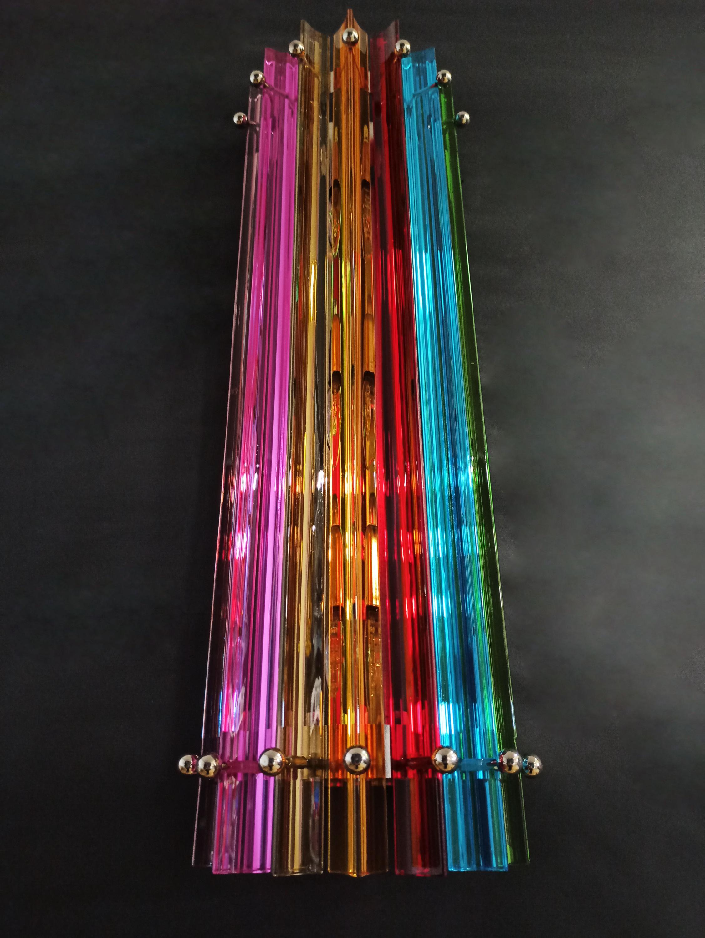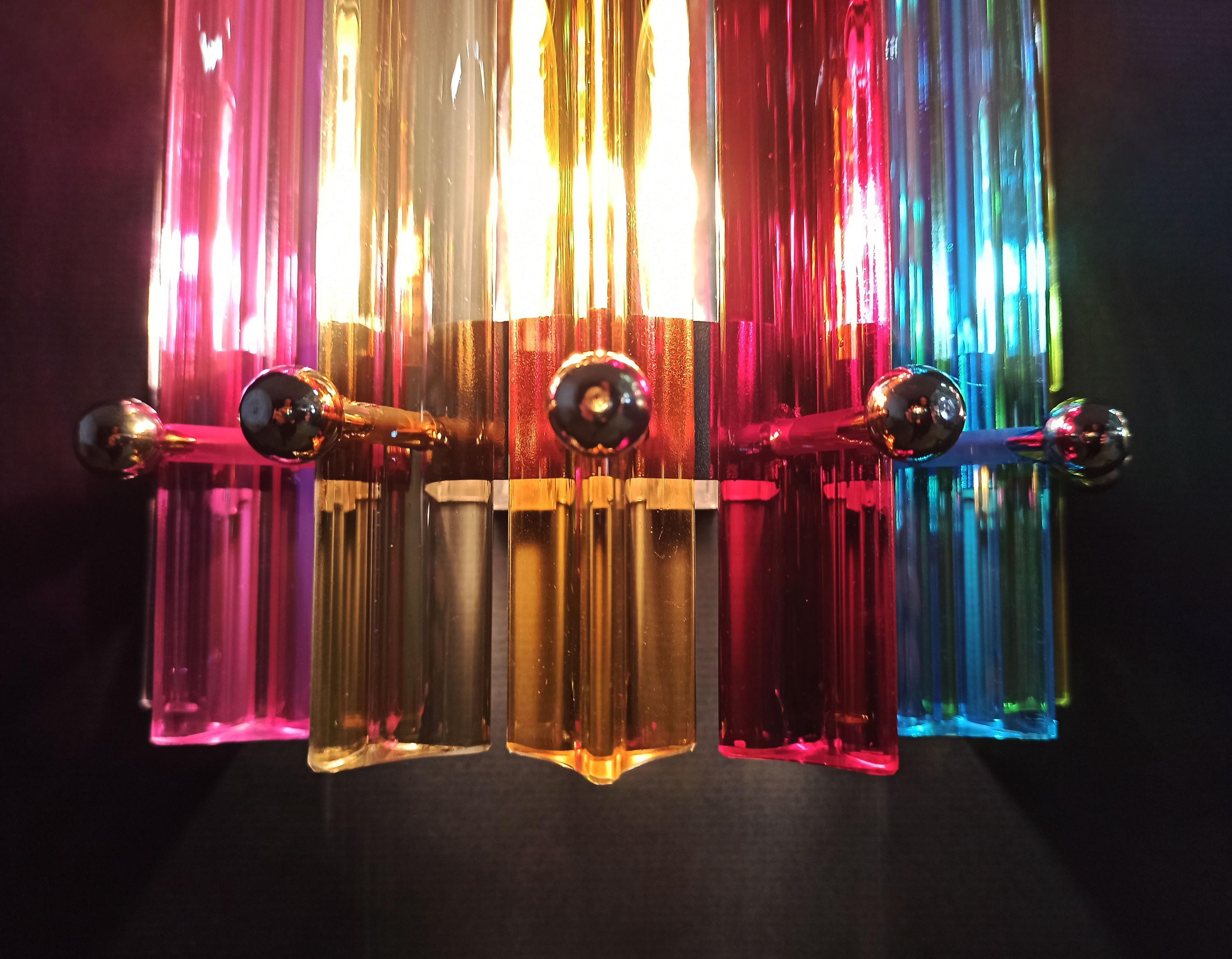 Fantastic pair of vintage Murano wall sconce made by 7 Murano crystal prism (trihedrons) for each applique in a chrome metal frame. The shape of this sconce is column. The glasses are transparent, blue, amber, green, and pink. The wall lamps can be