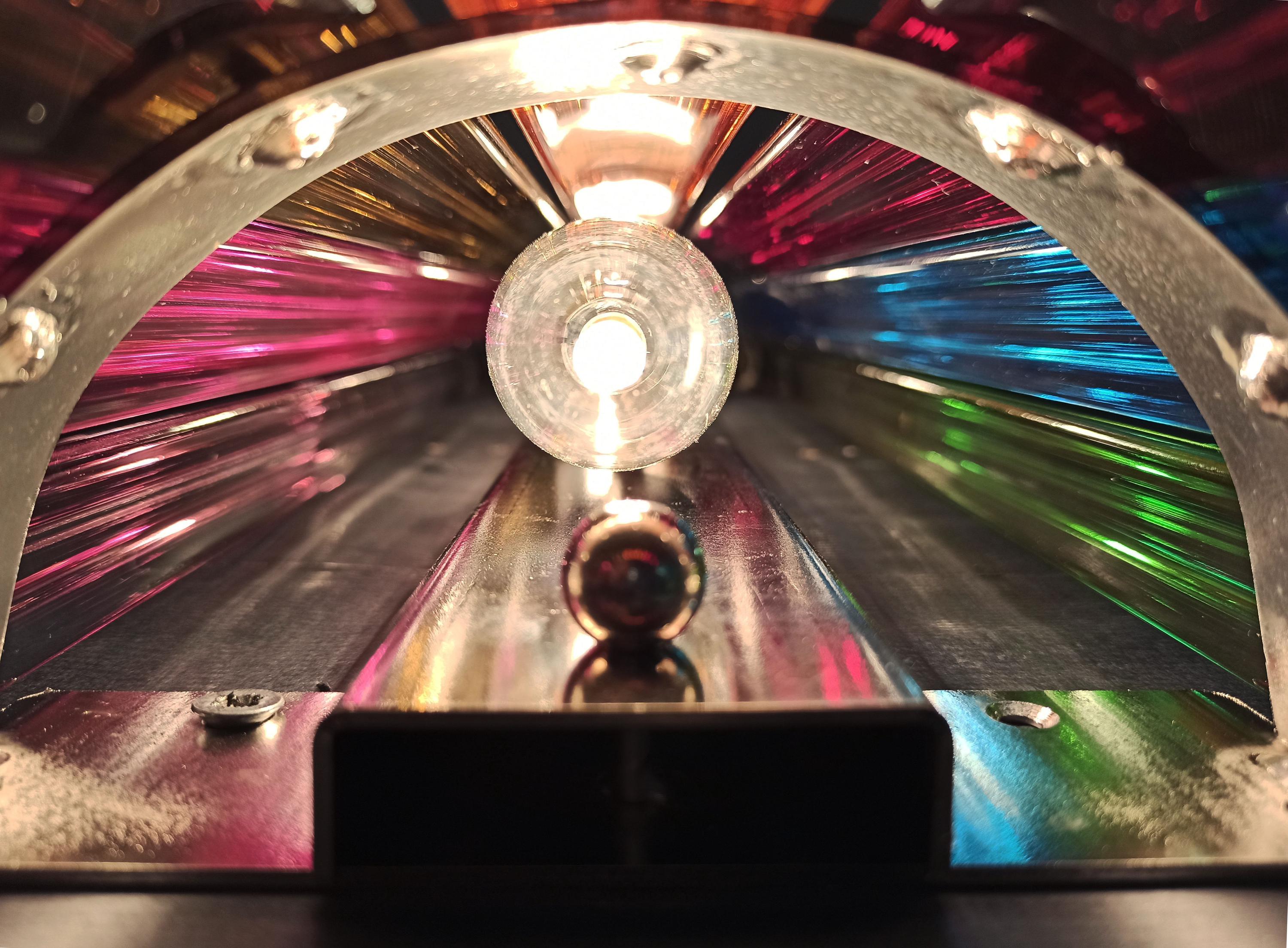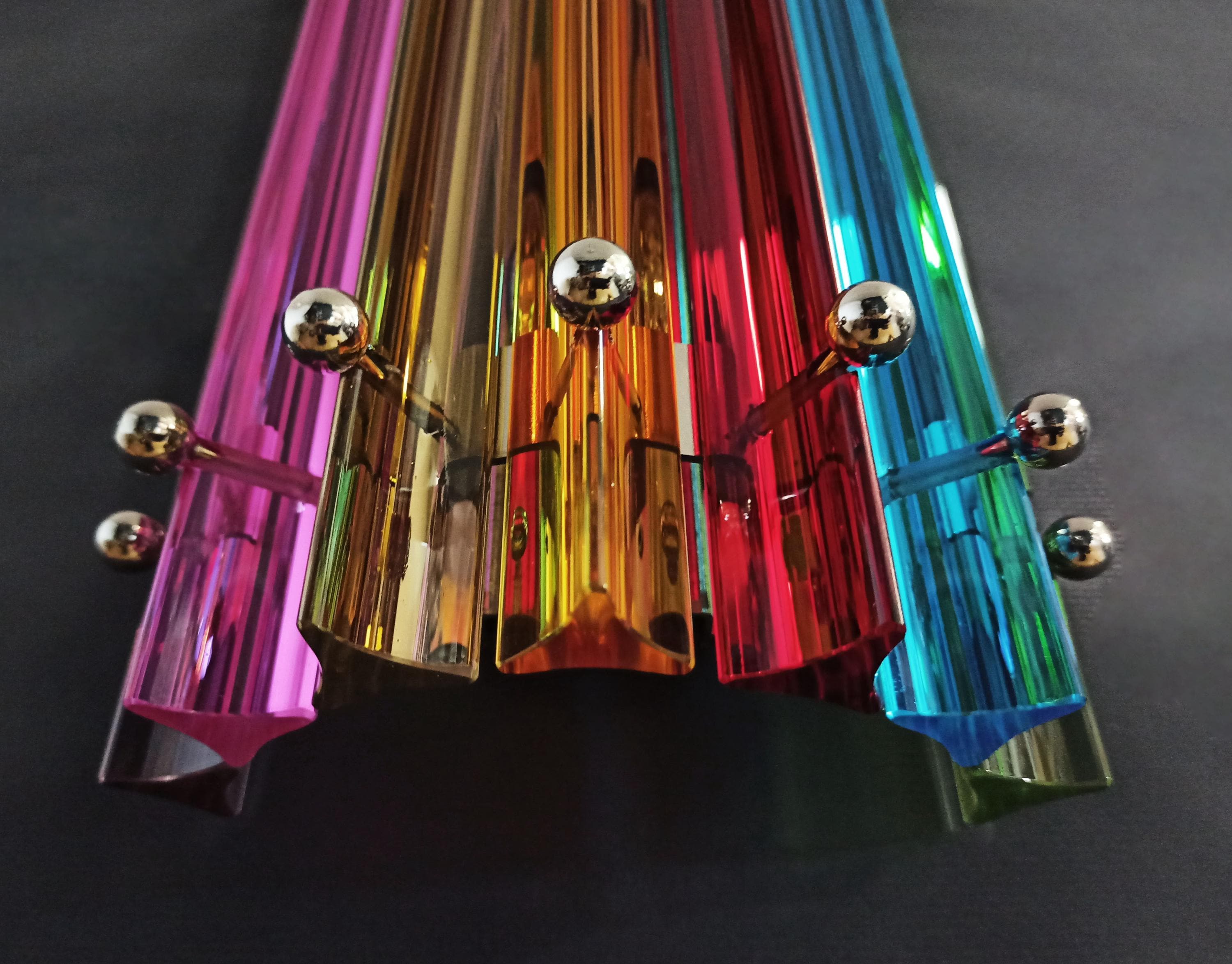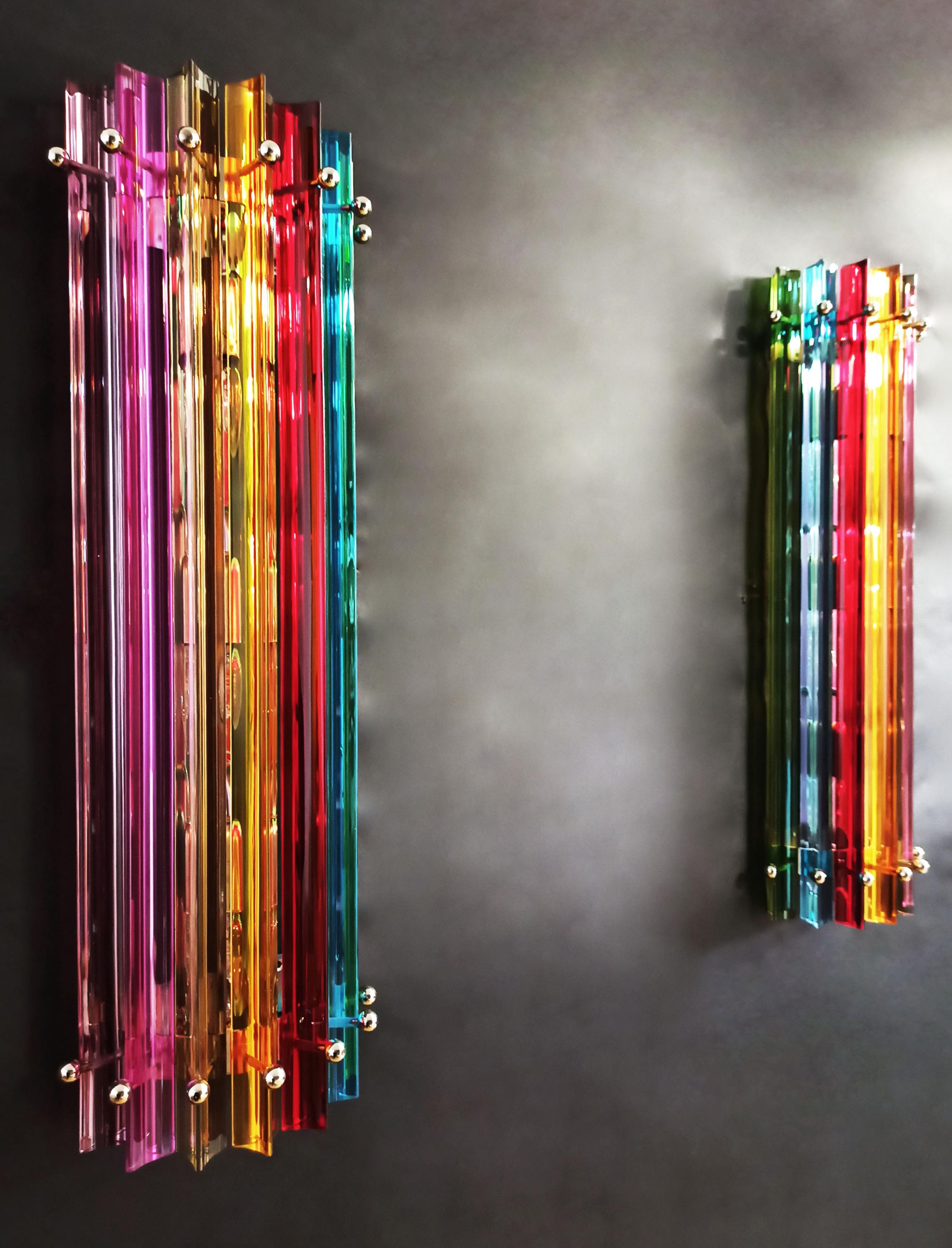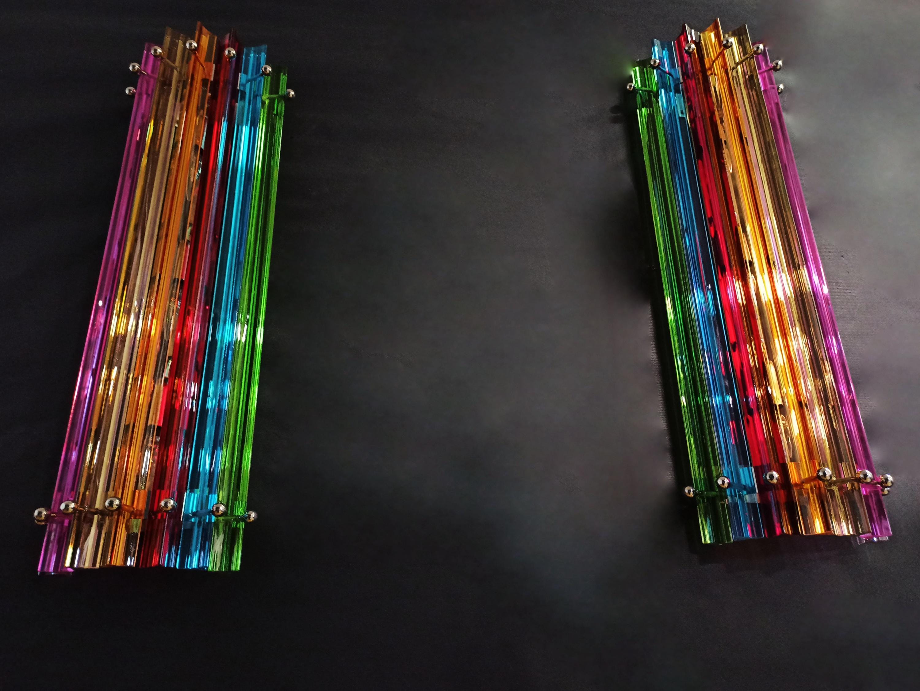 Fantastic pair of vintage Murano wall sconce made by 7 Murano crystal prism (trihedrons) for each applique in a chrome metal frame. The shape of this sconce is column. The glasses are transparent, blue, amber, green, and pink. The wall lamps can be