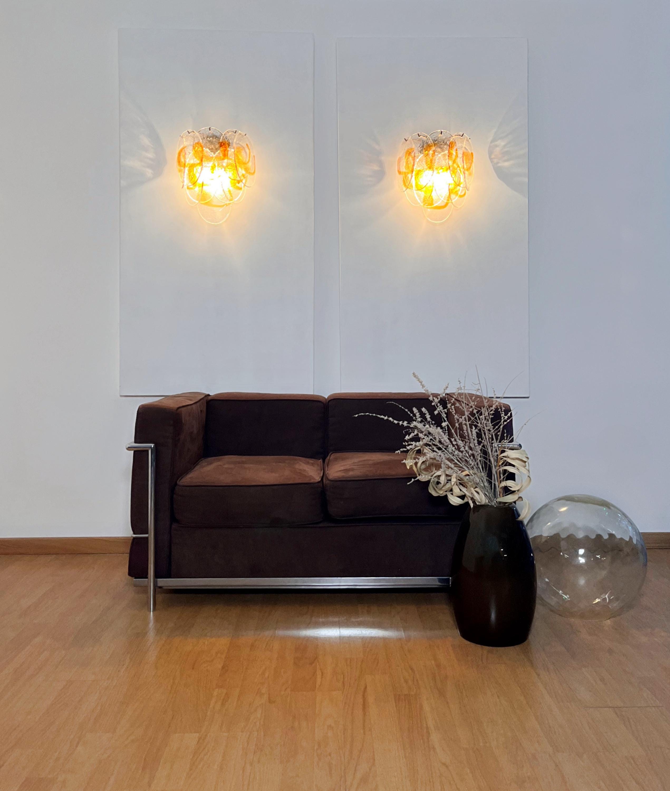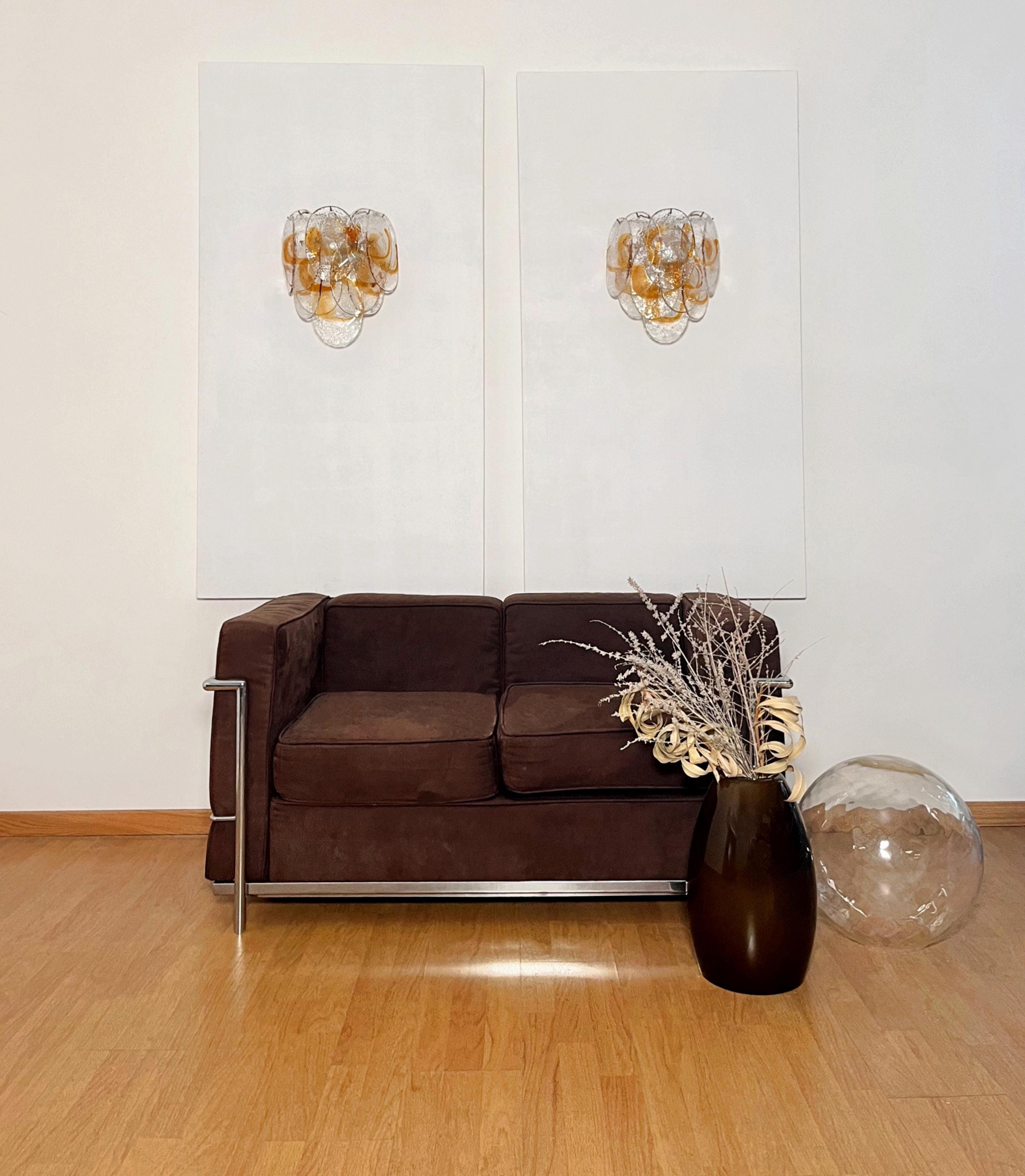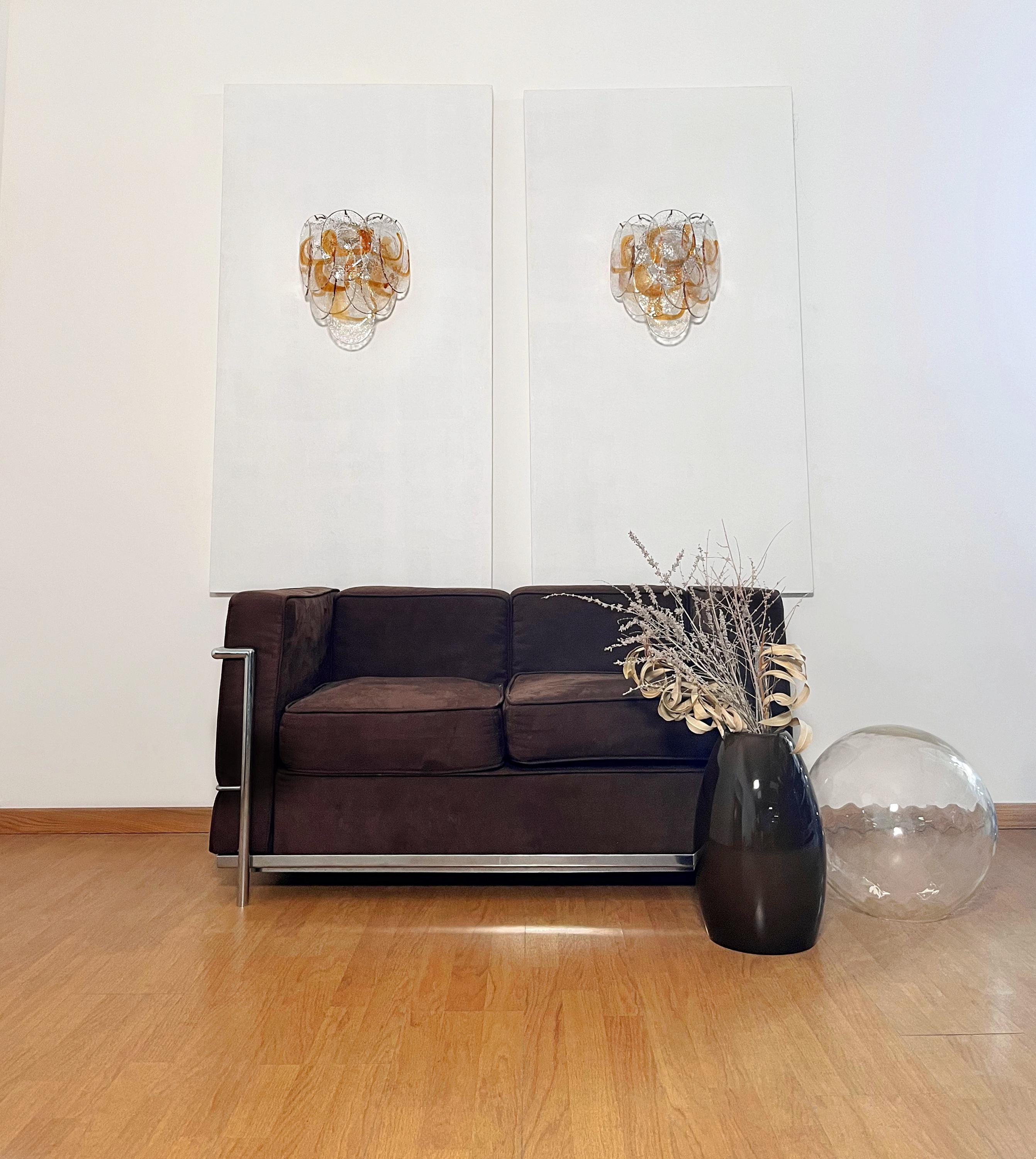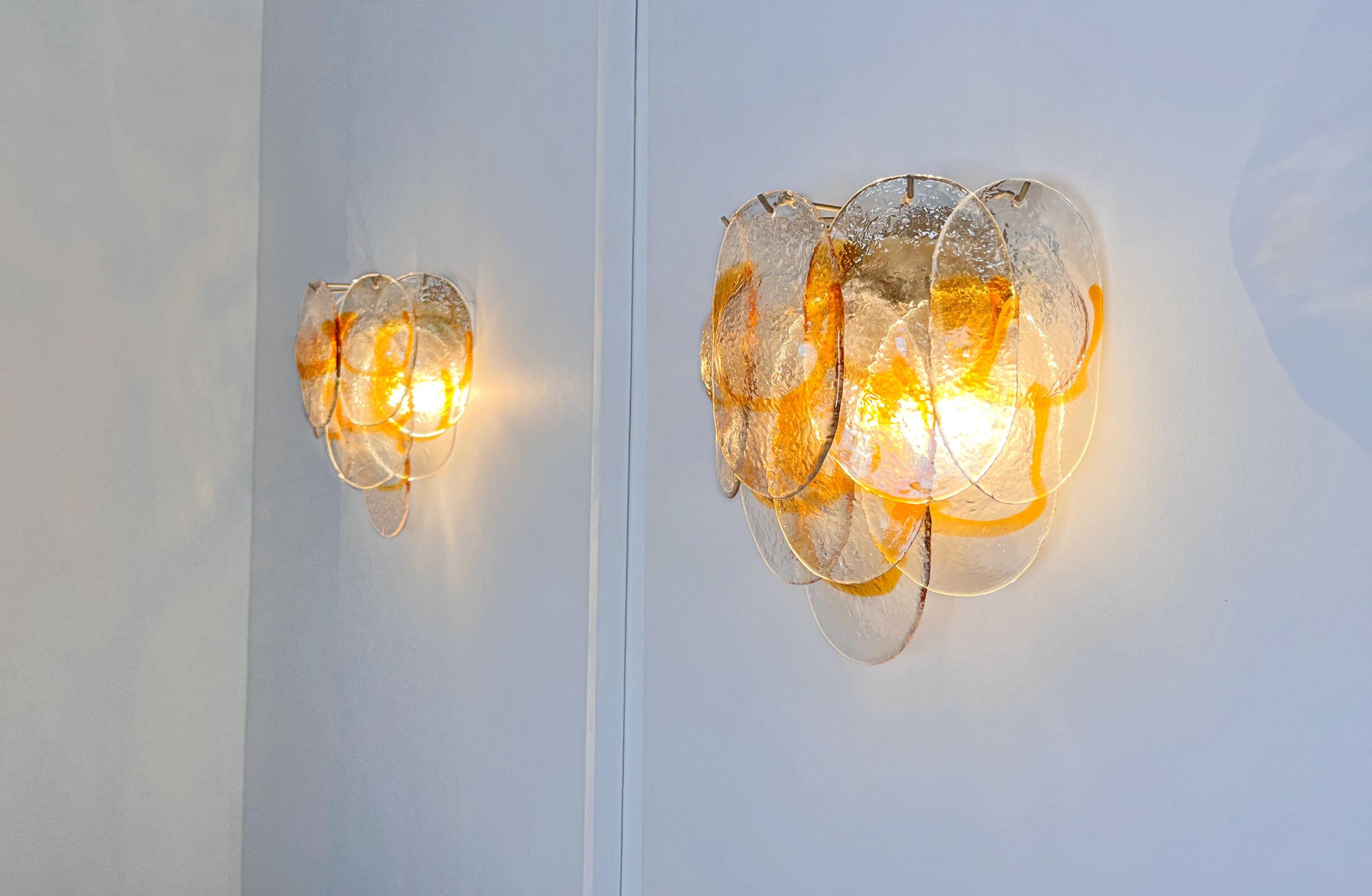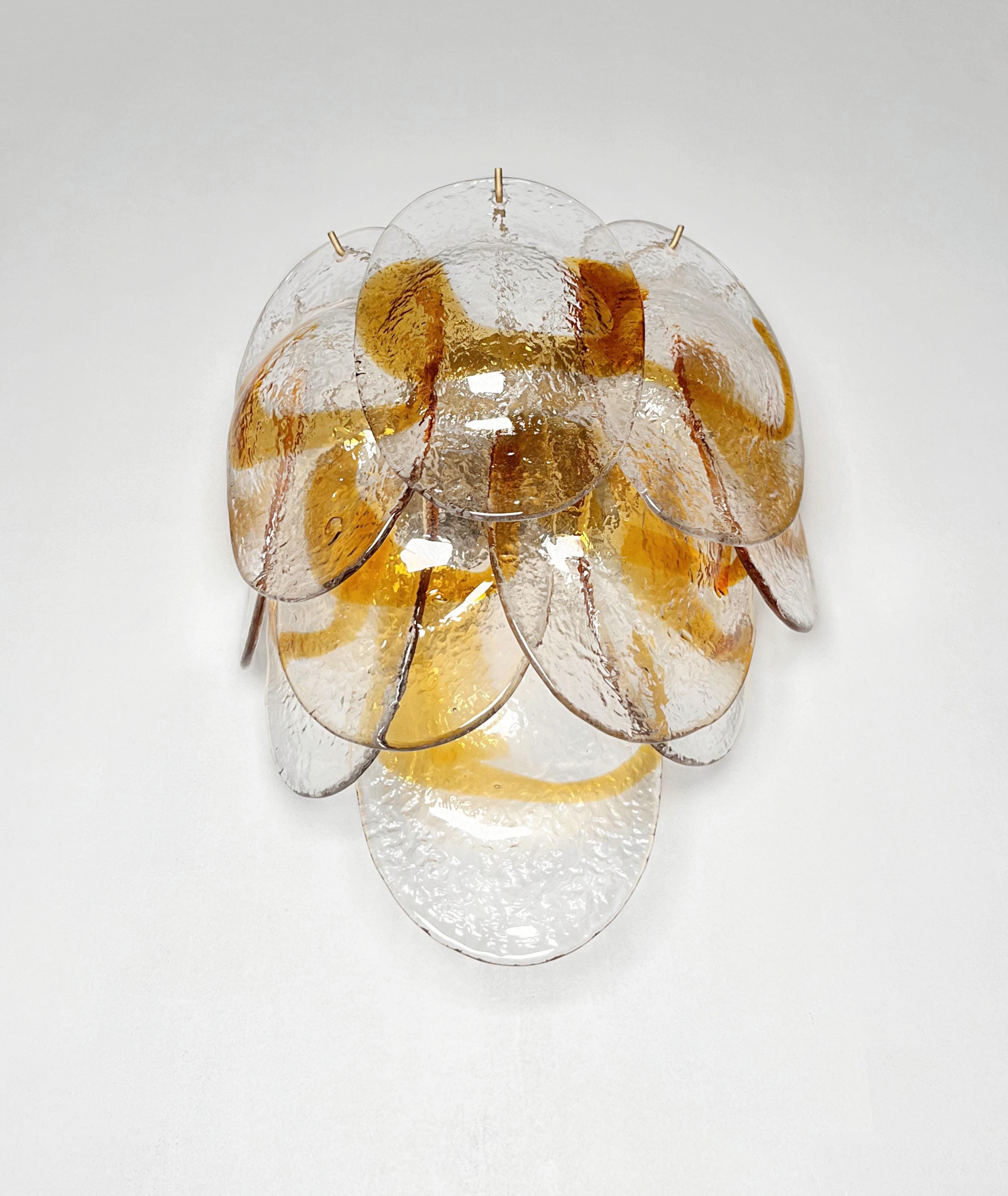 Pair of Italian vintage Murano wall lights made by 10 glass leaves for each applique in golden painted metal frame. The originality of this item is given by the glass, wonderful works of art transparent and amber, called shells. Murano blown glass in a traditional way.