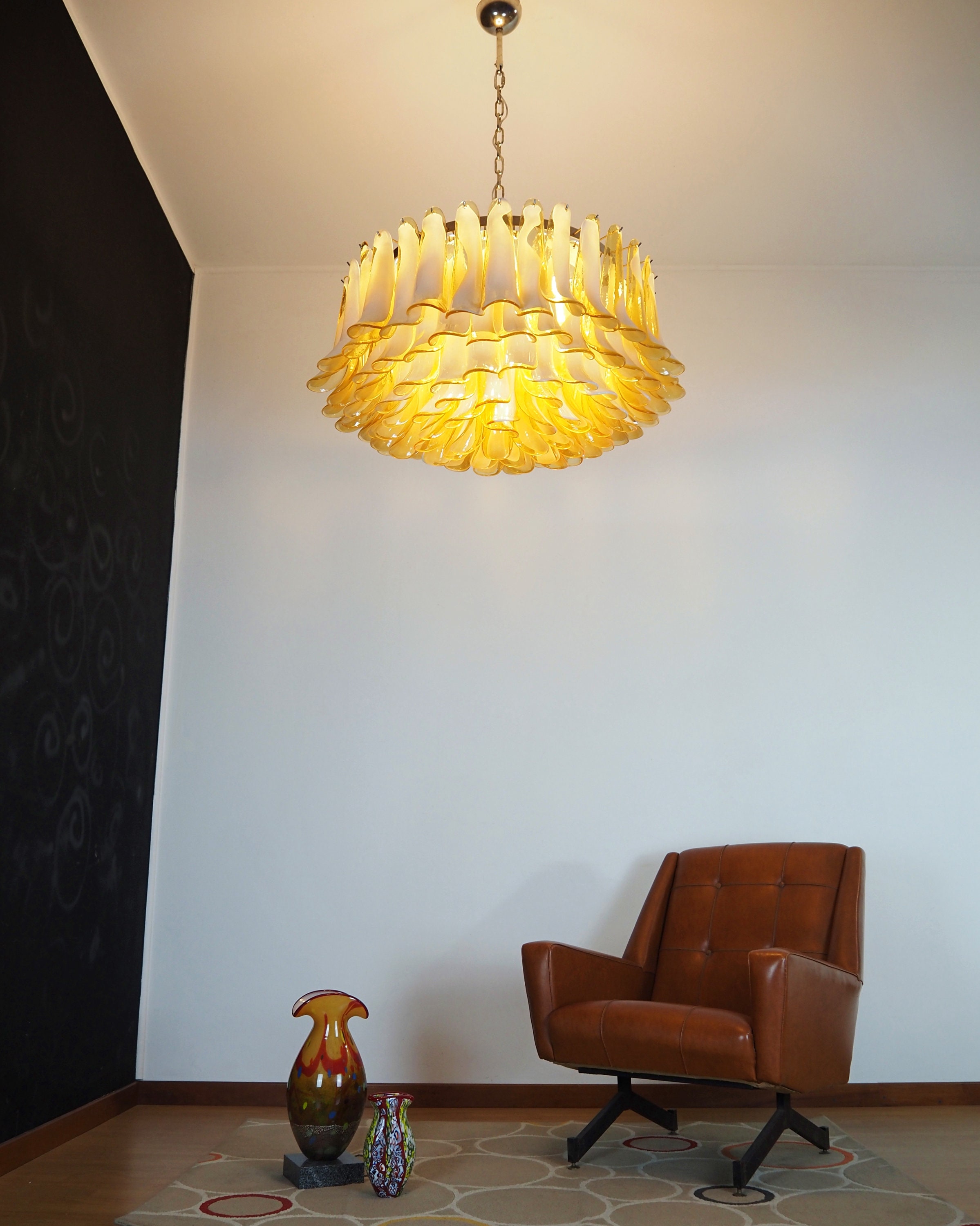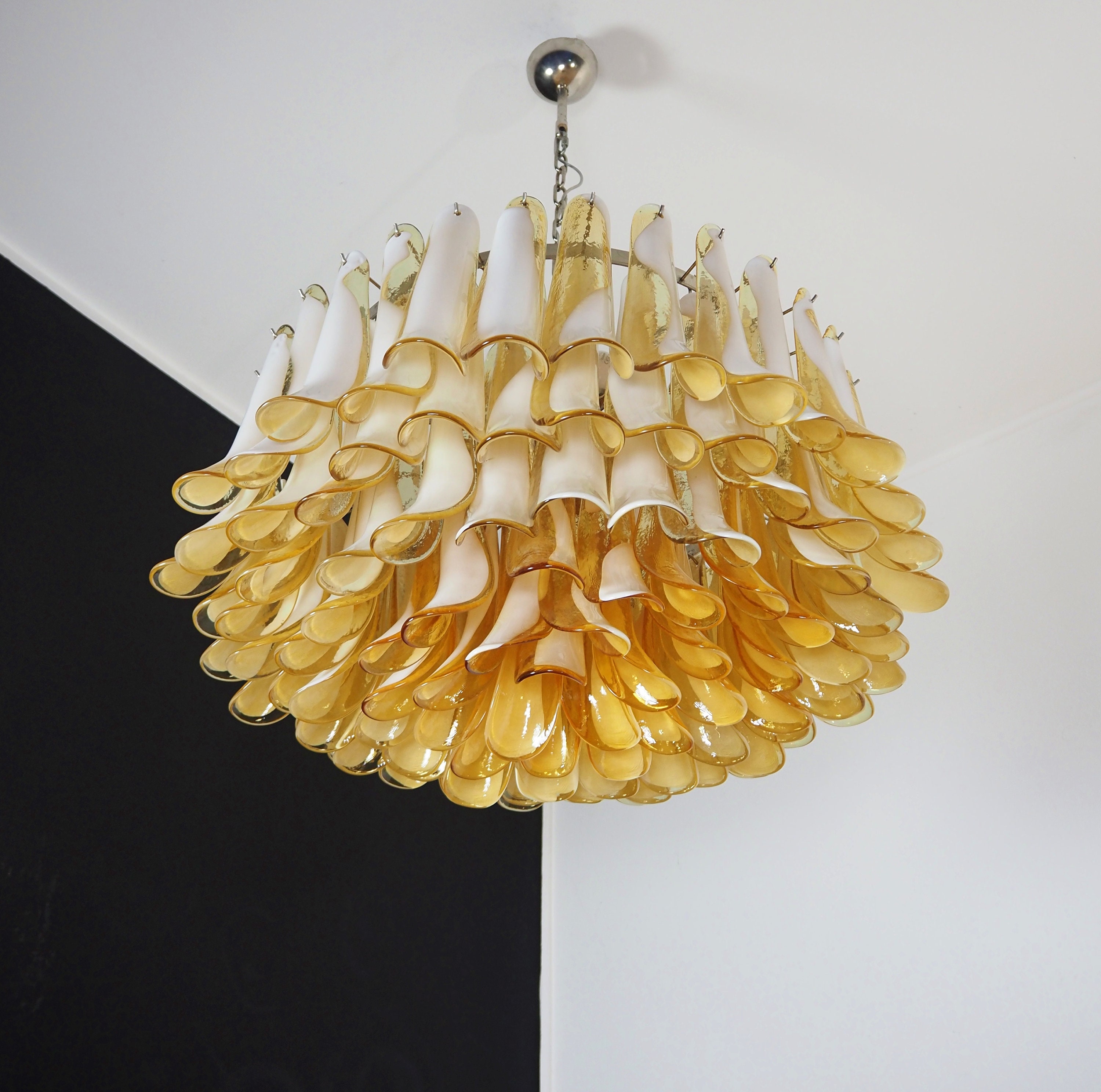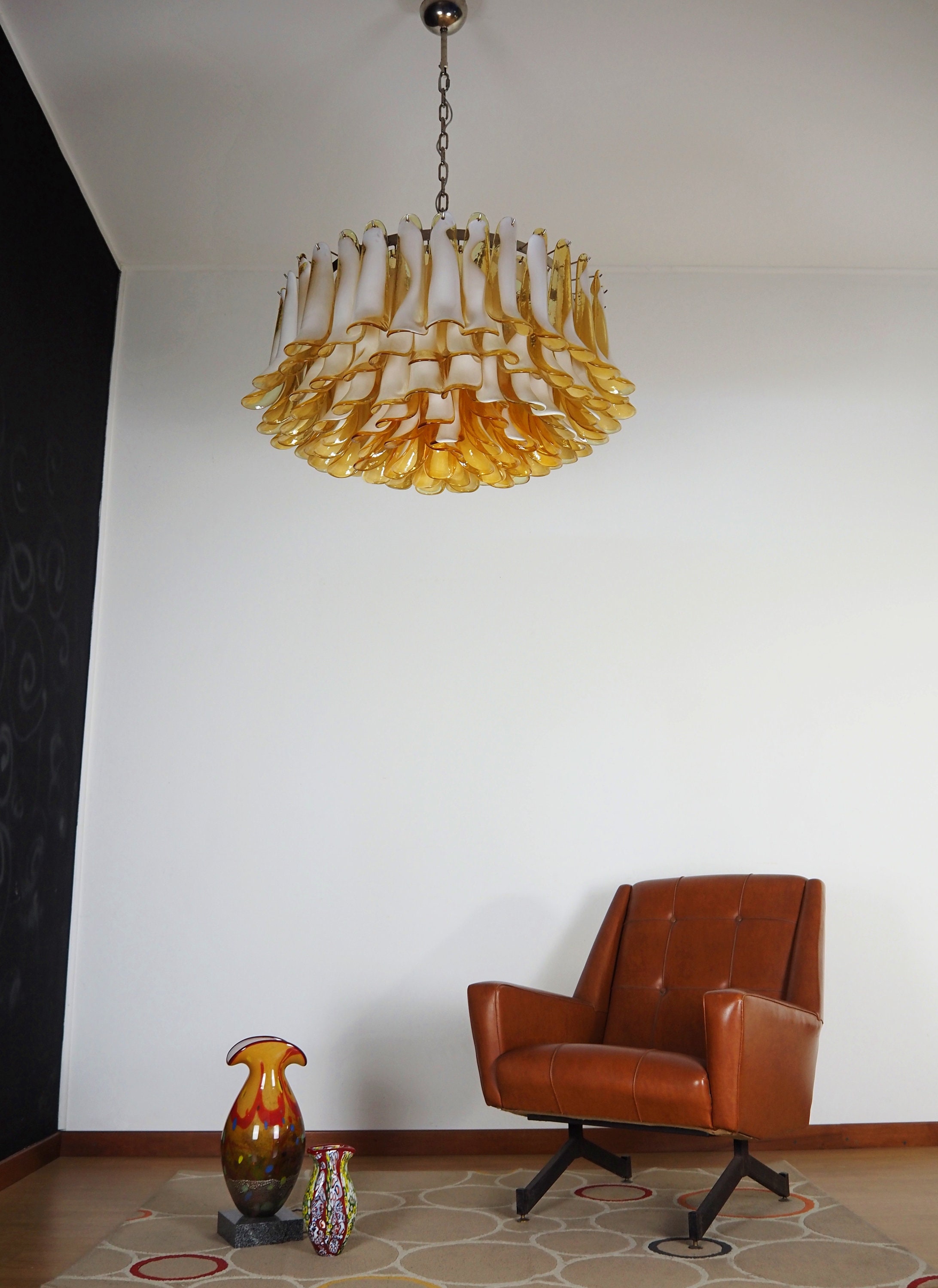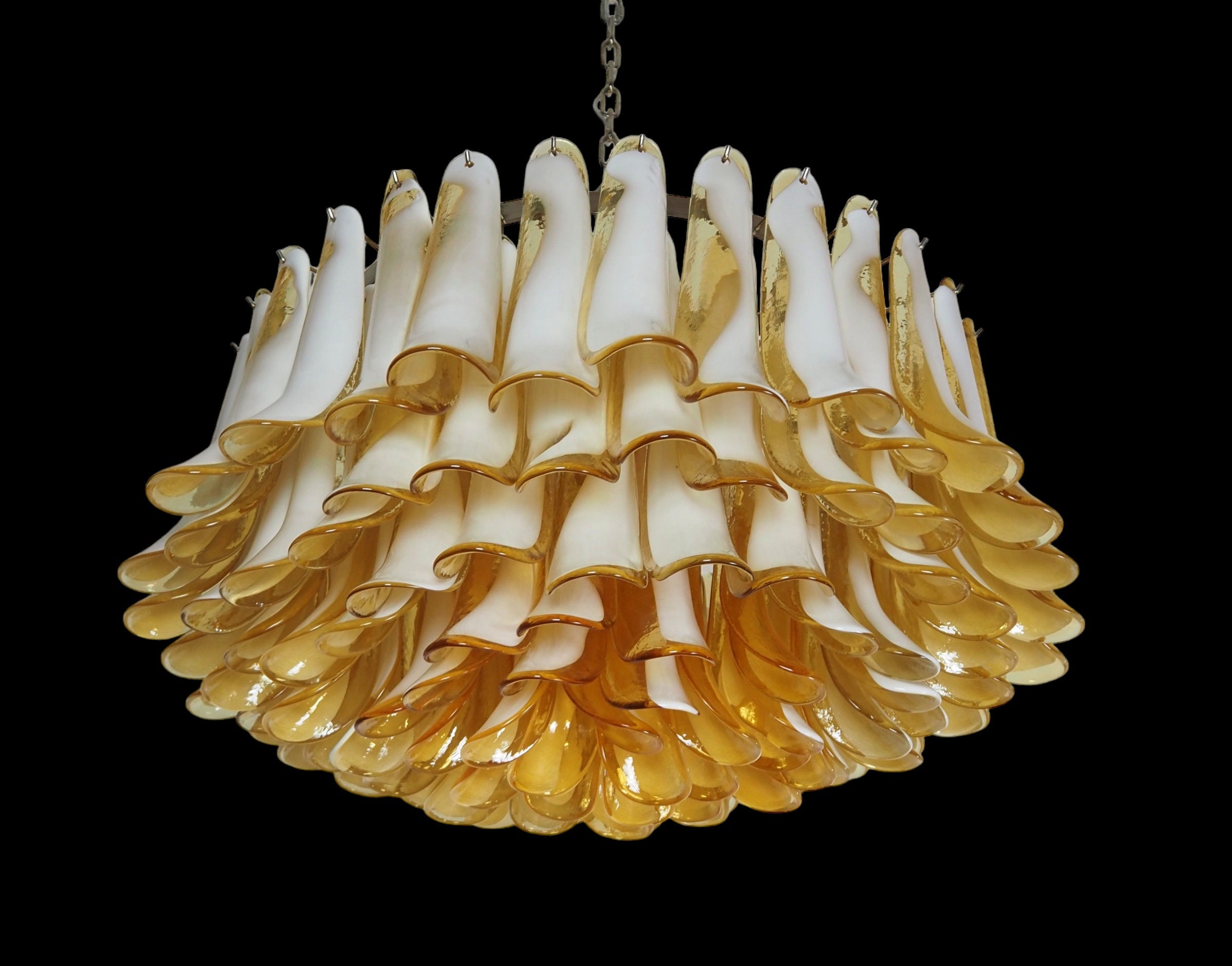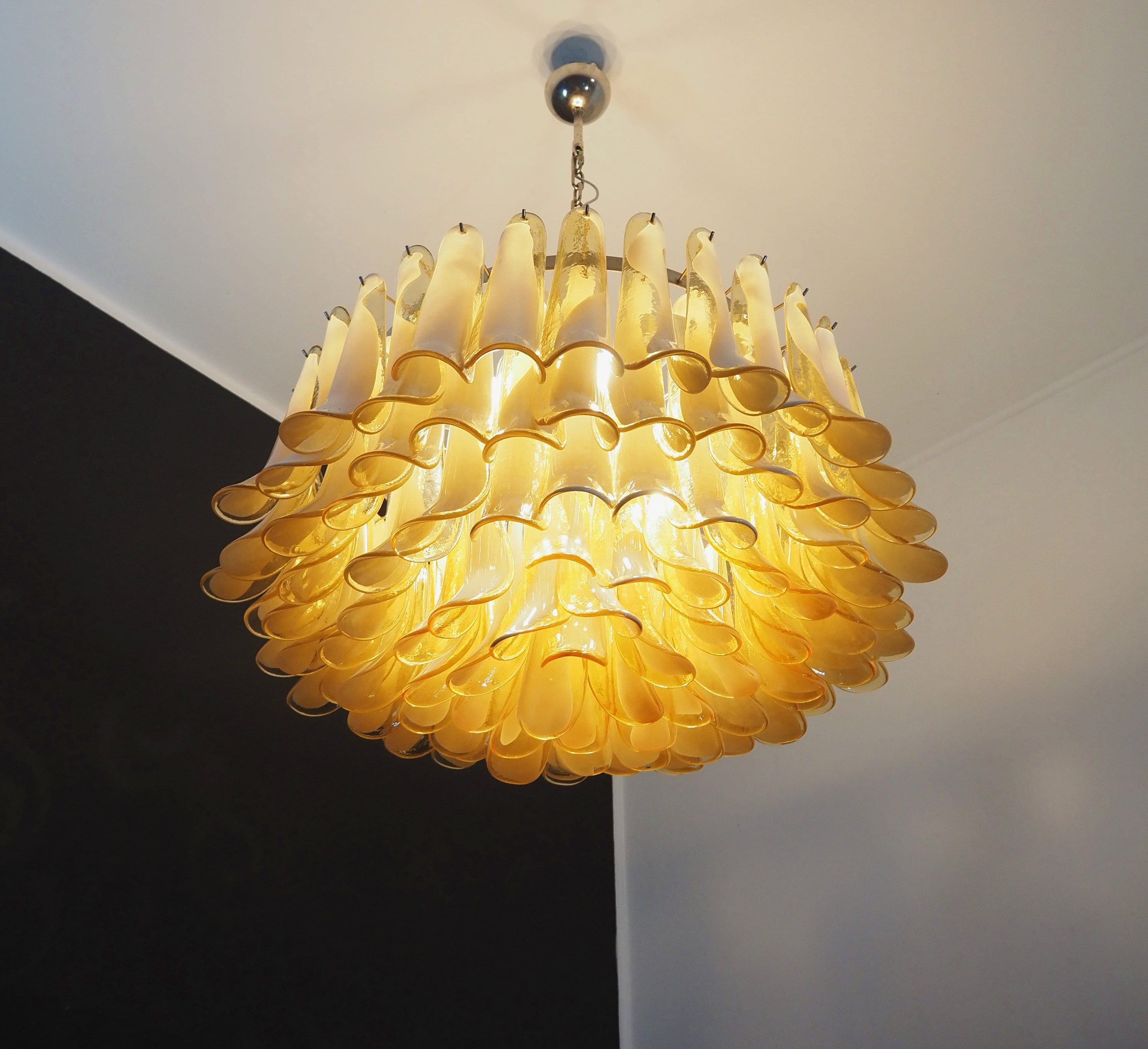 Italian vintage chandelier in Murano glass and nickel plated metal structure. The armor polished nickel supports 101 glass petals (caramel and white “lattimo”) that give a very elegant look. Can be used as a chandelier with chain, or as a ceiling light, the structure will be hung directly from the ceiling without using a chain.