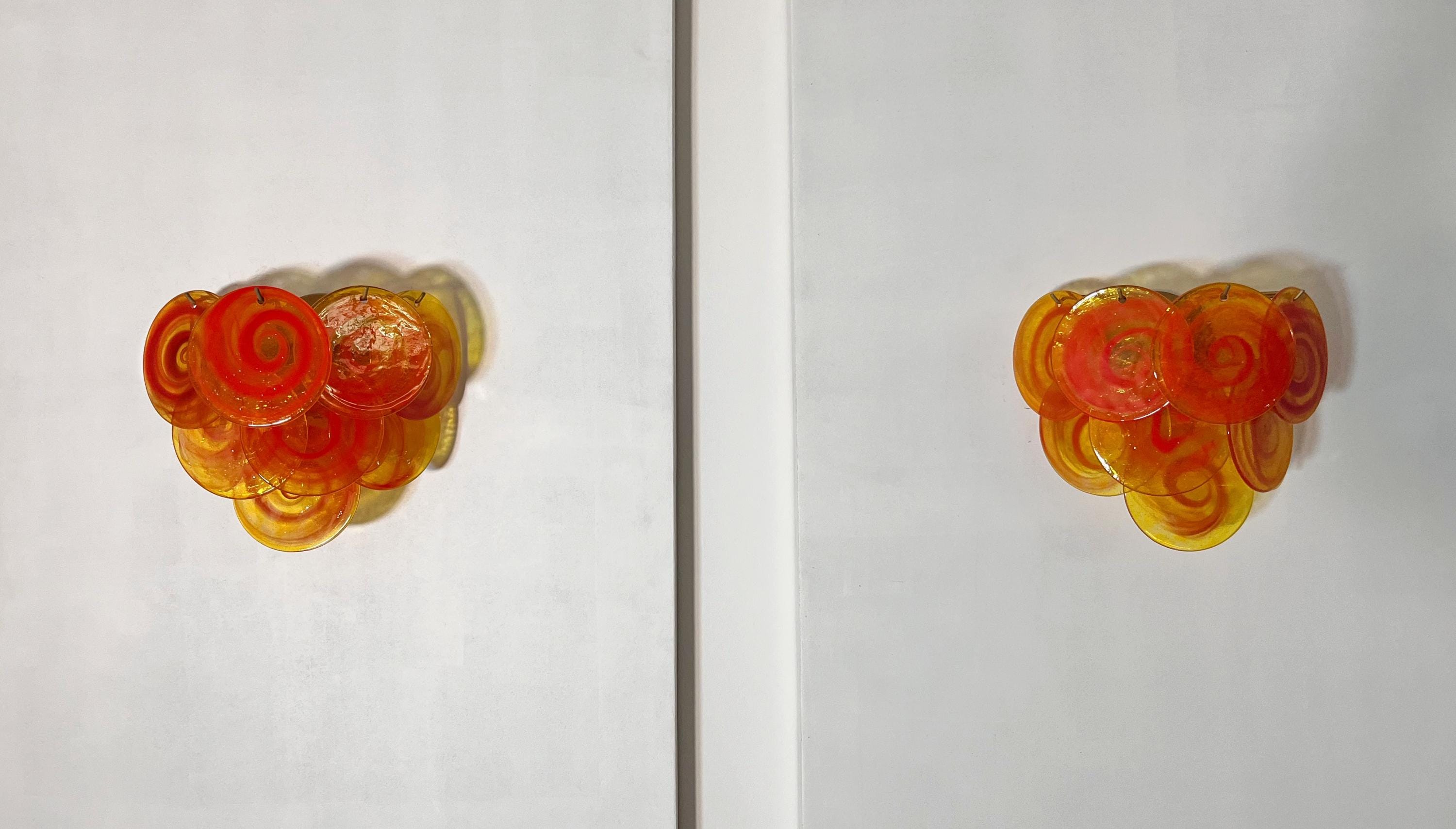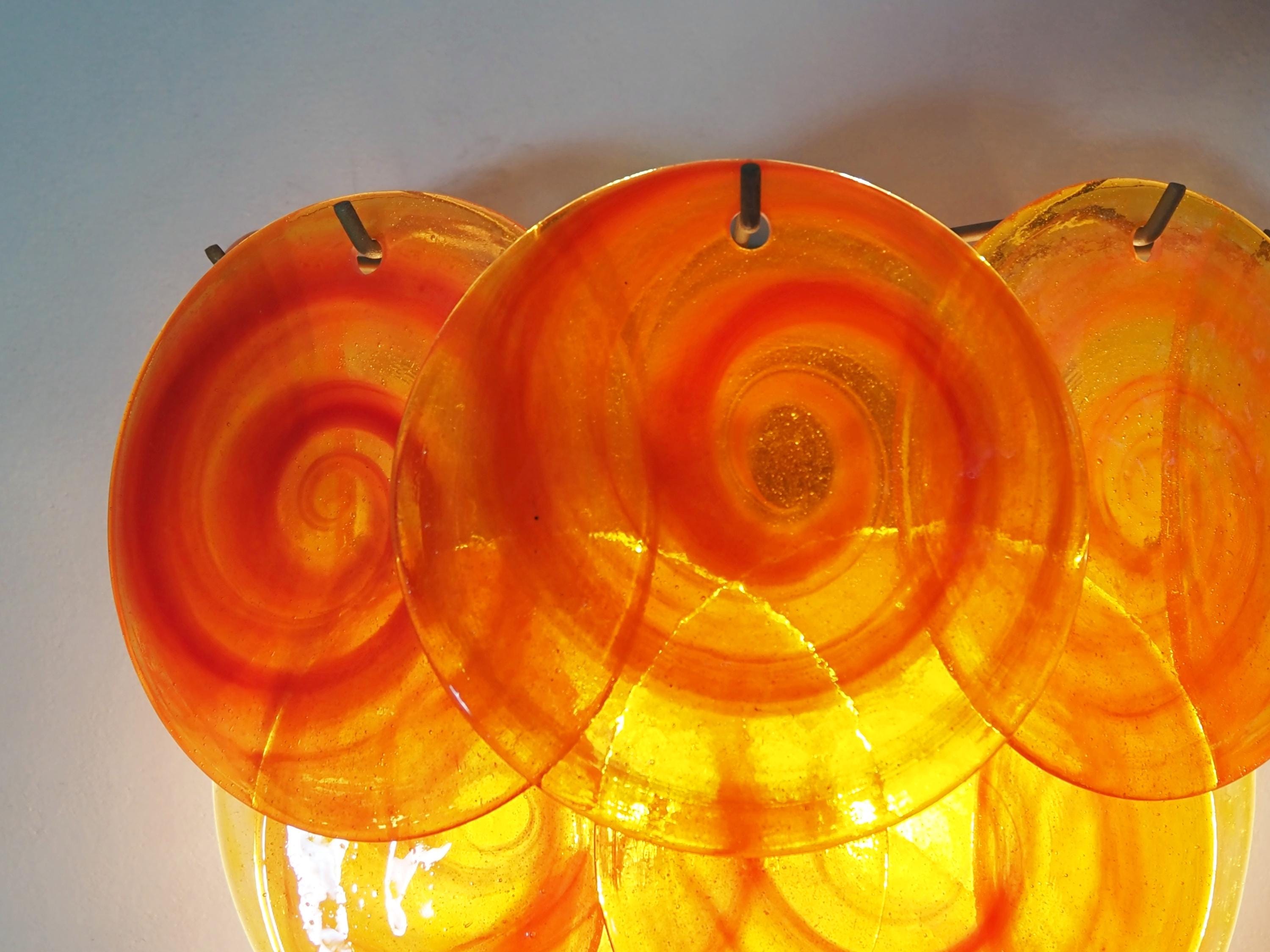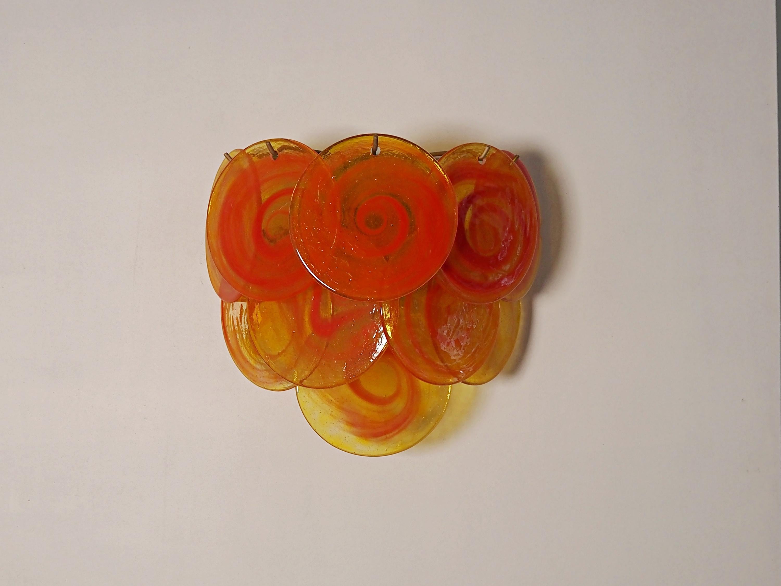 Pair of Vintage Italian Murano wall lights in Vistosi style. Wall lights have 10 yellow glass discs with orange spiral. Typical 70s coloring. Nickel metal frames.