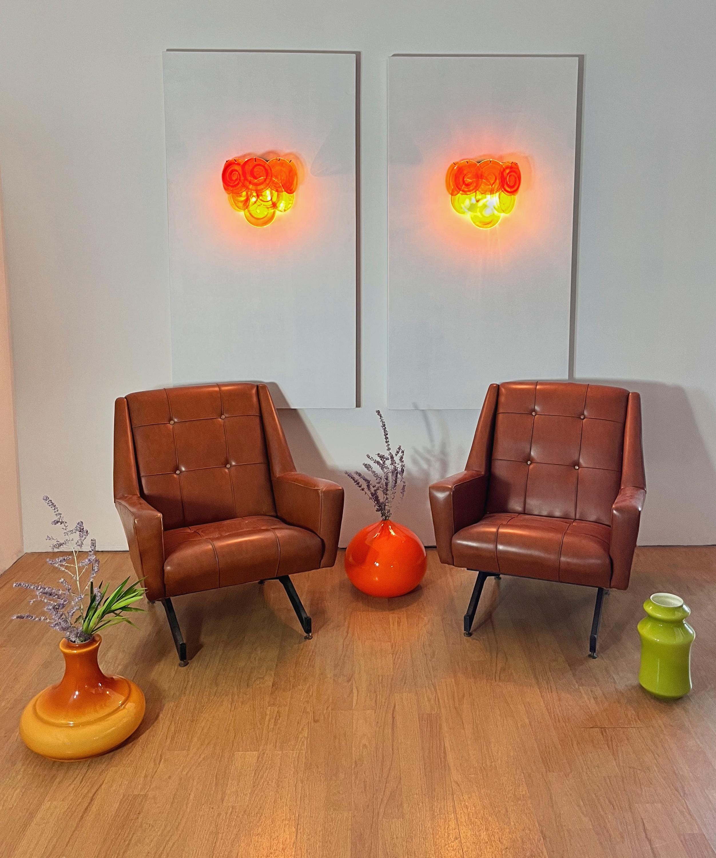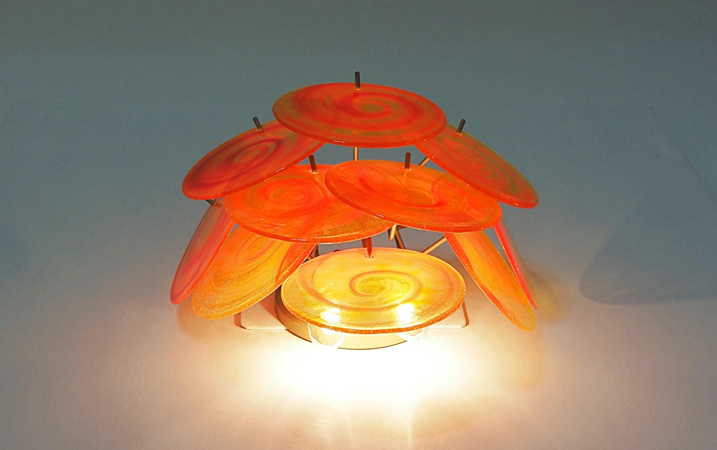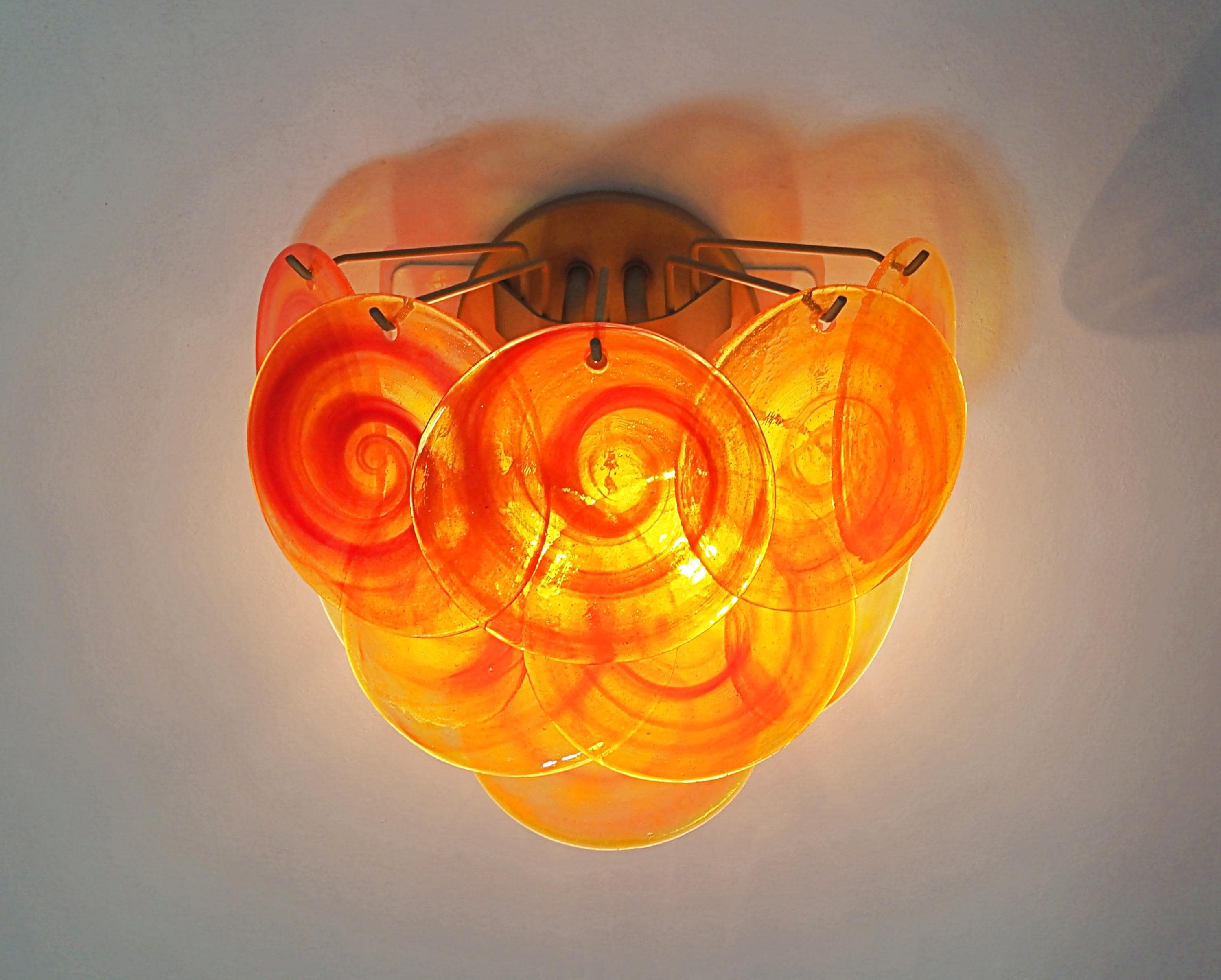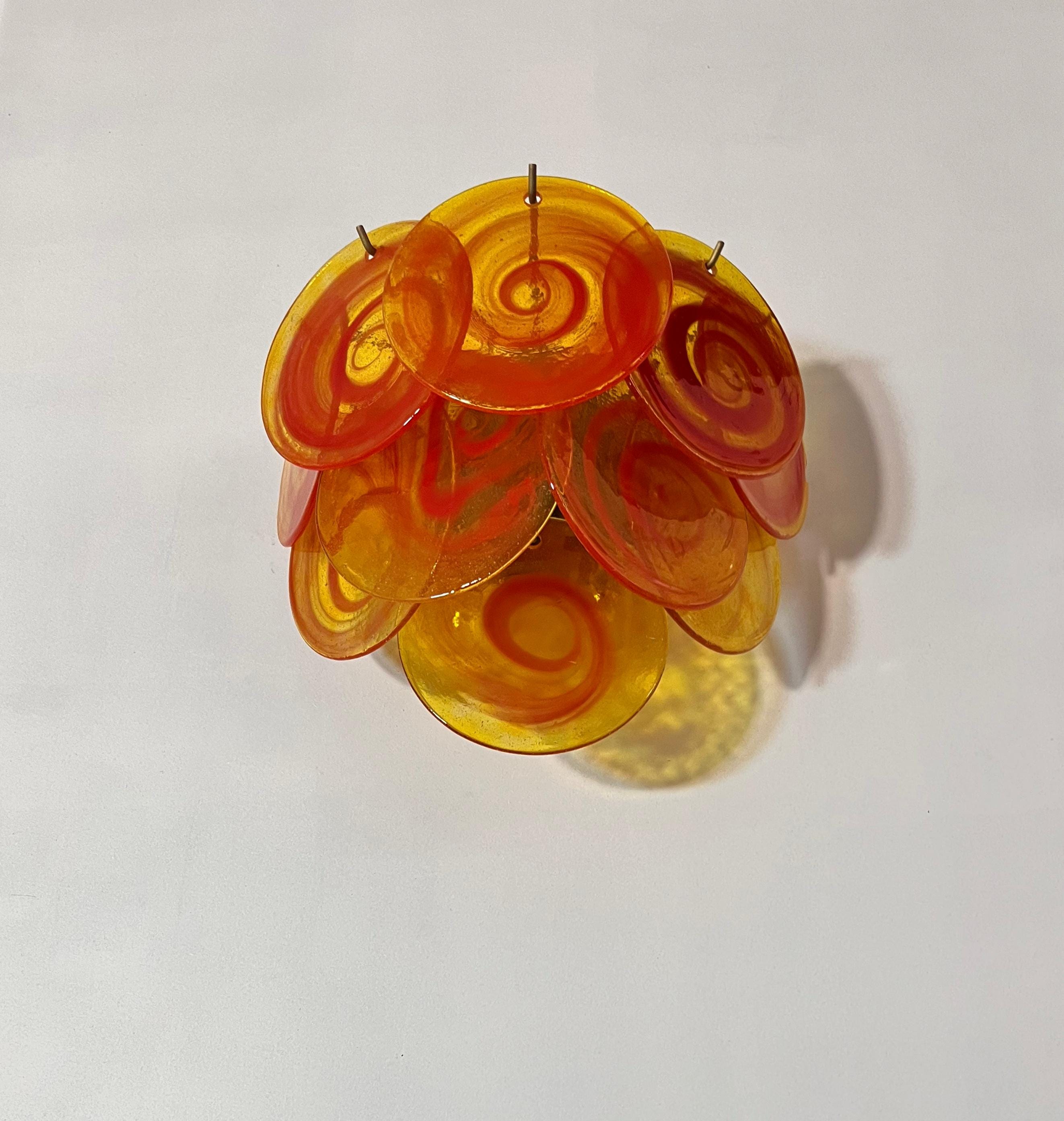 Pair of Vintage Italian Murano wall lights in Vistosi style. Wall lights have 10 yellow glass discs with orange spiral. Typical 70s coloring. Nickel metal frames.