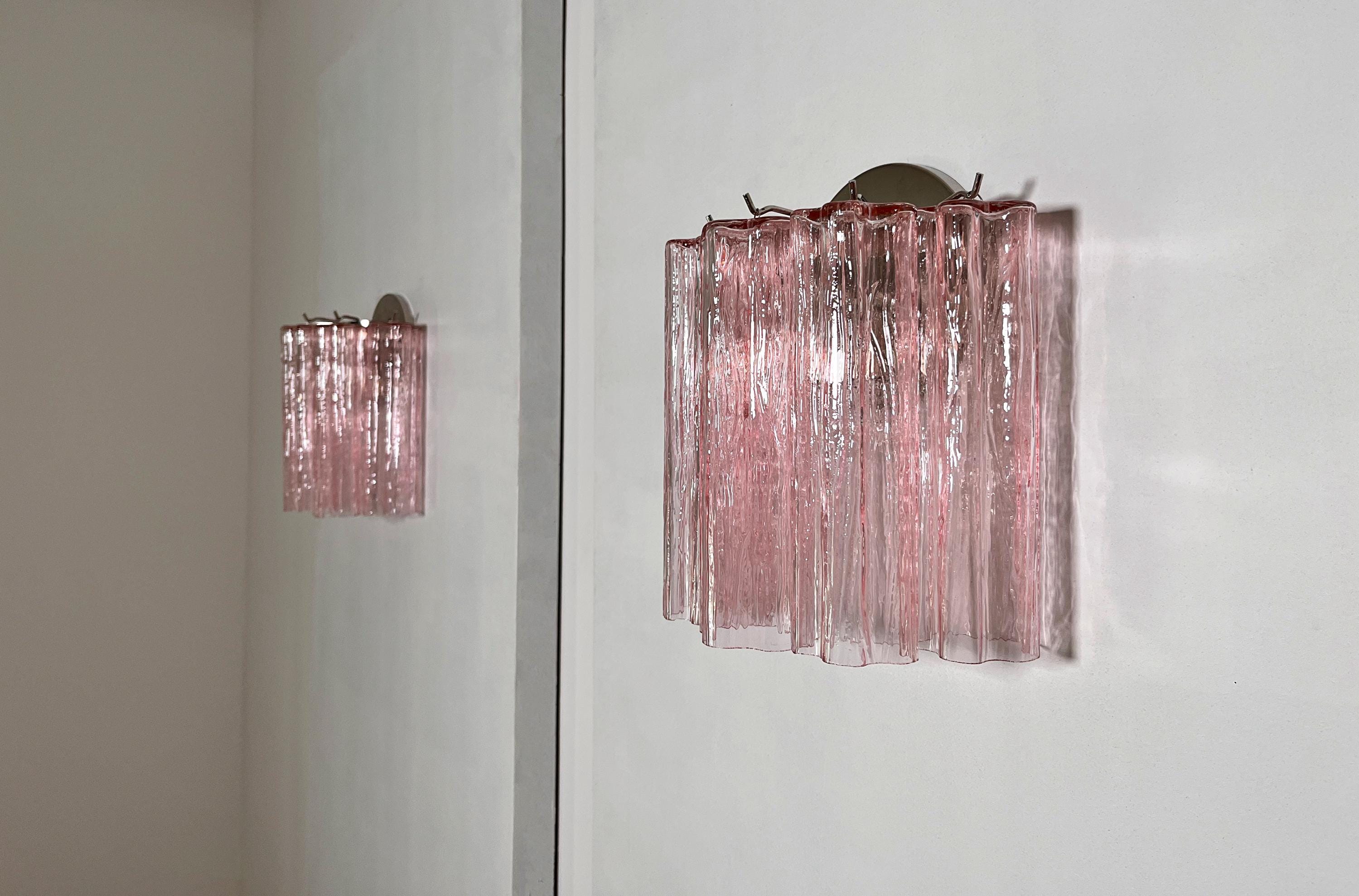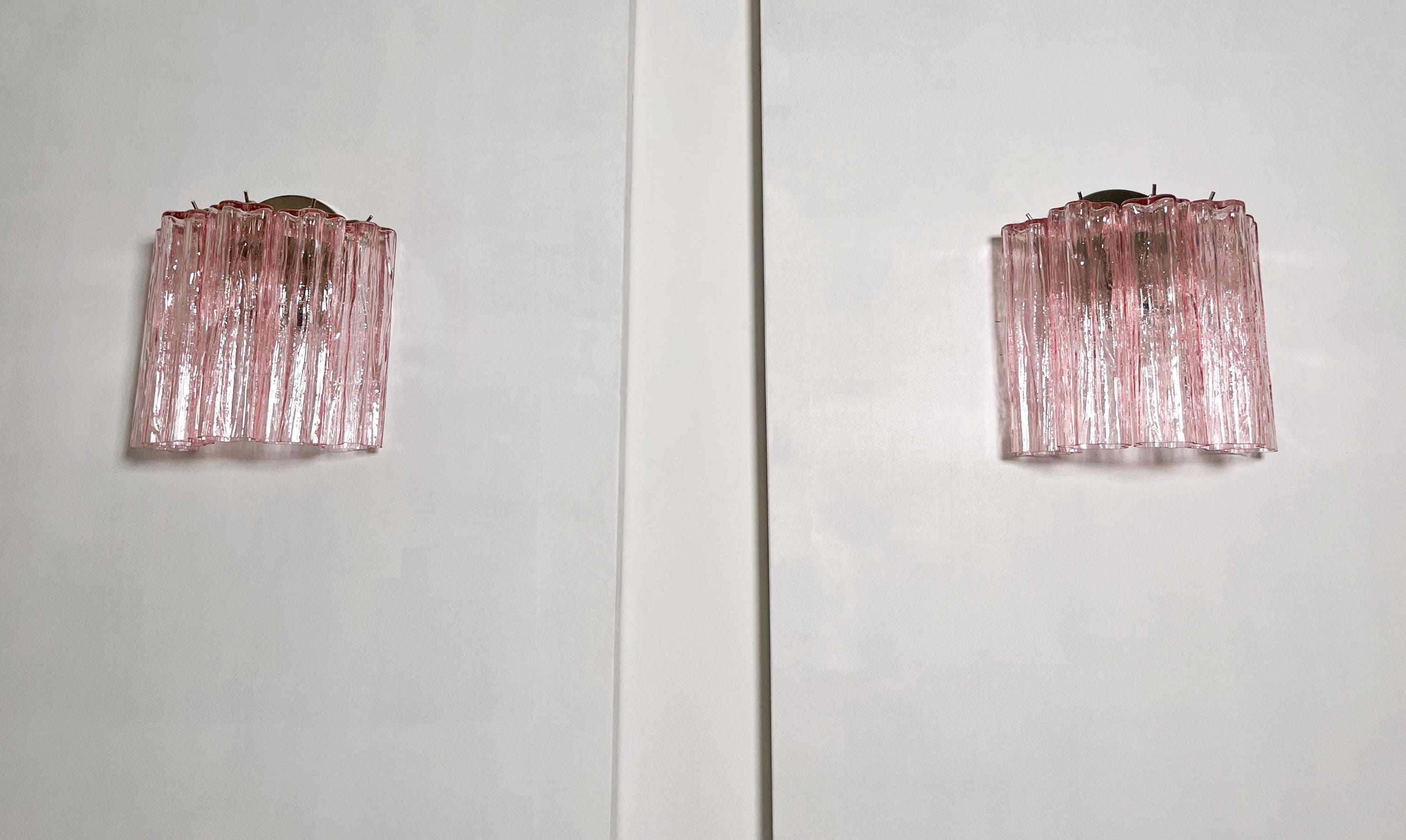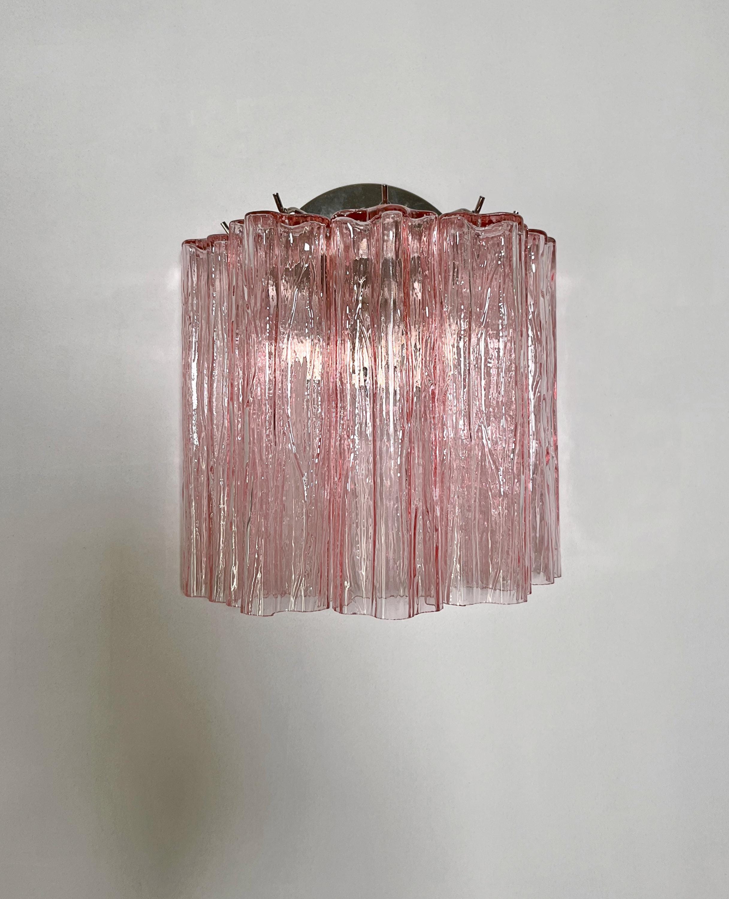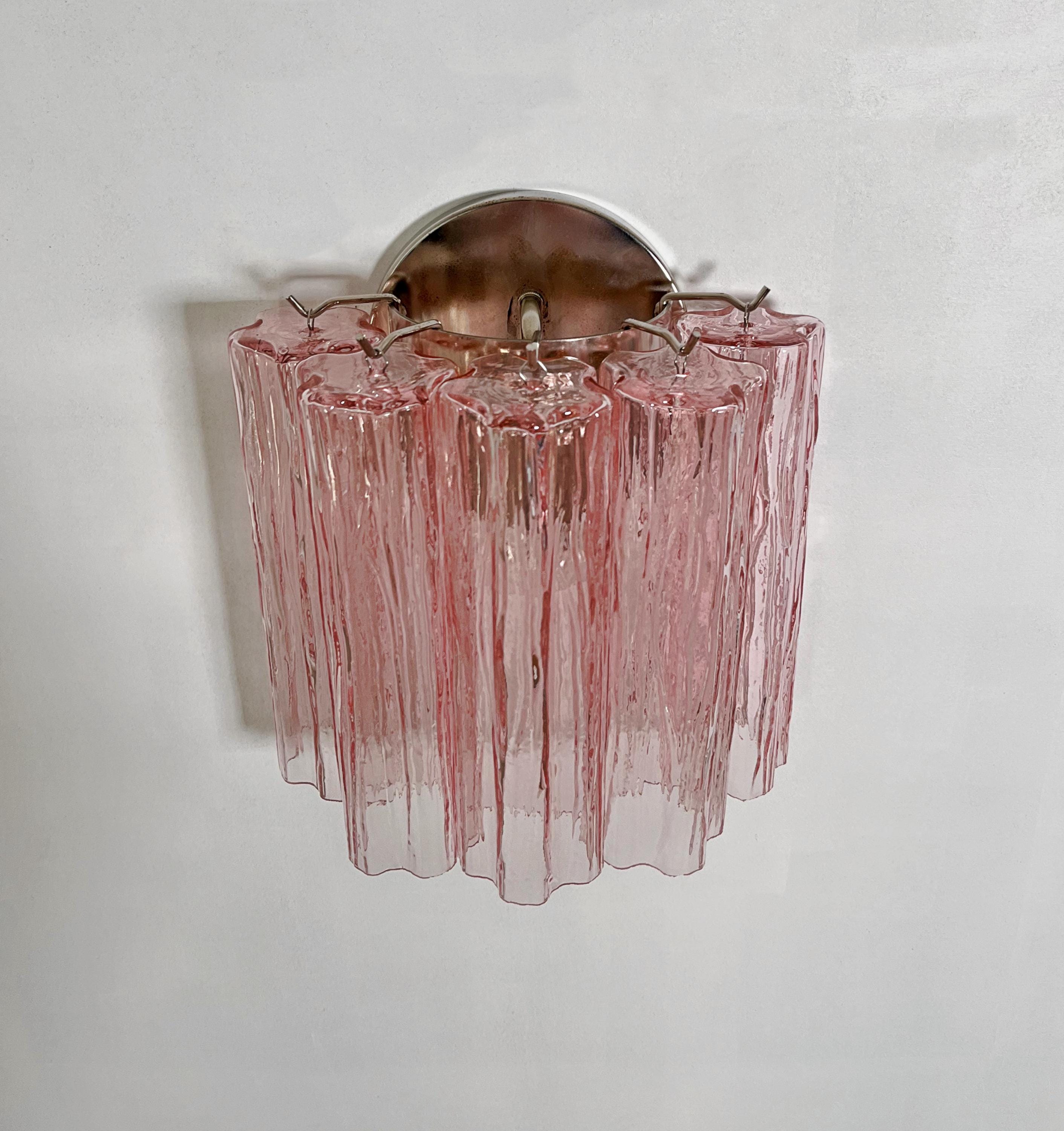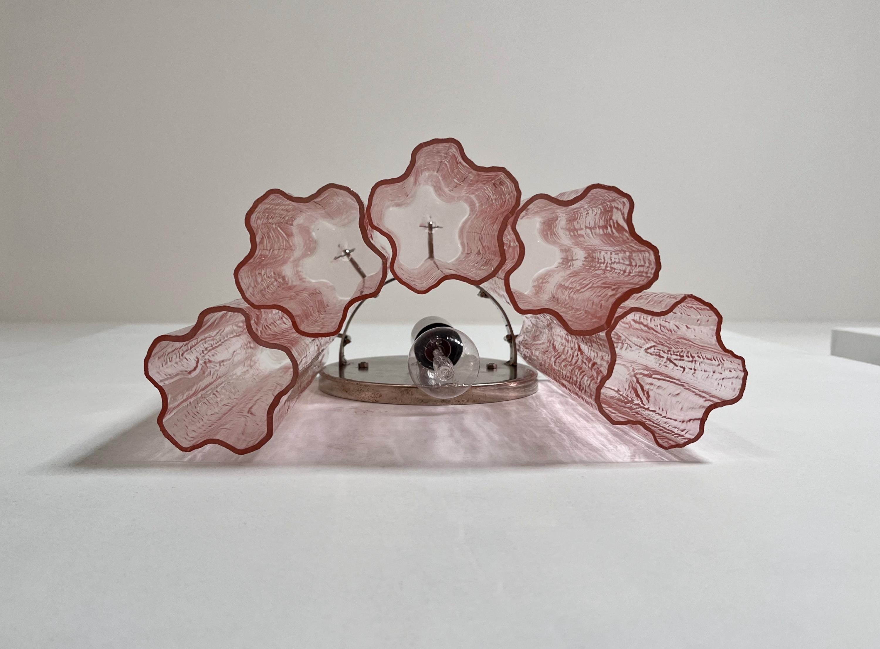 Italian vintage pair of wall sconces in Murano glass and nickel-plated metal structure. The armor polished nickel supports 5 large pink glass tubes in a star shape for each lamp.