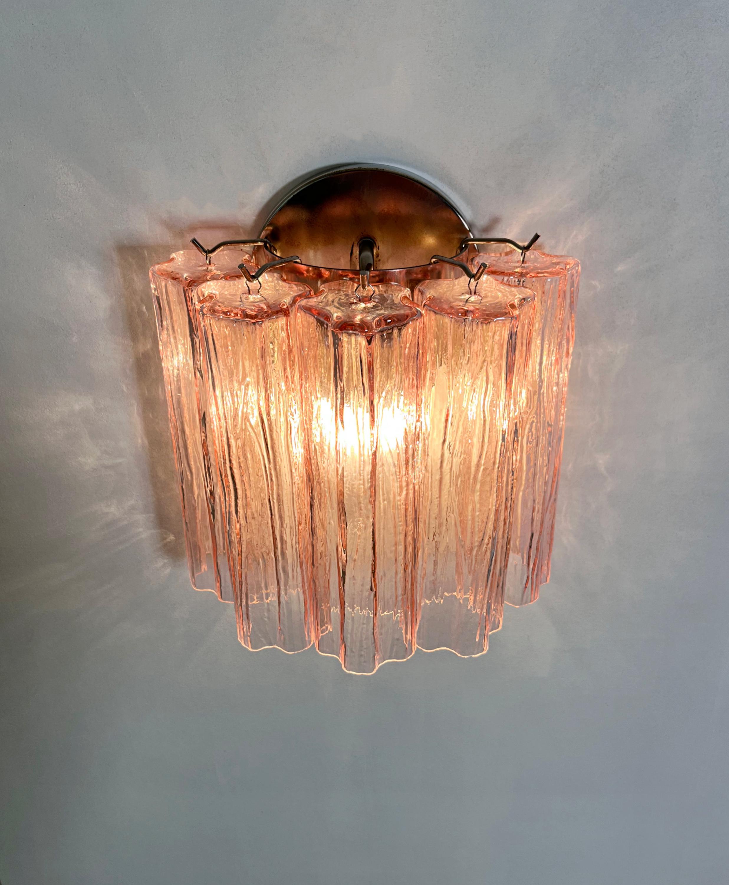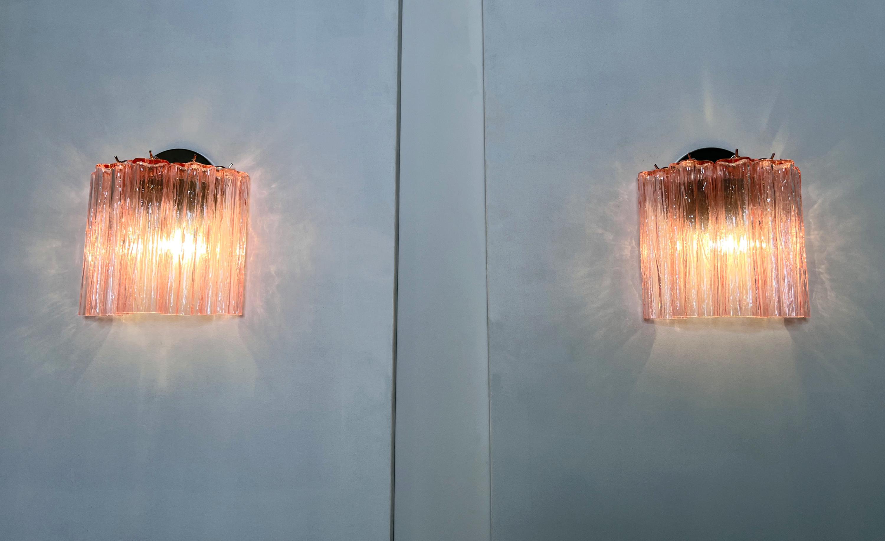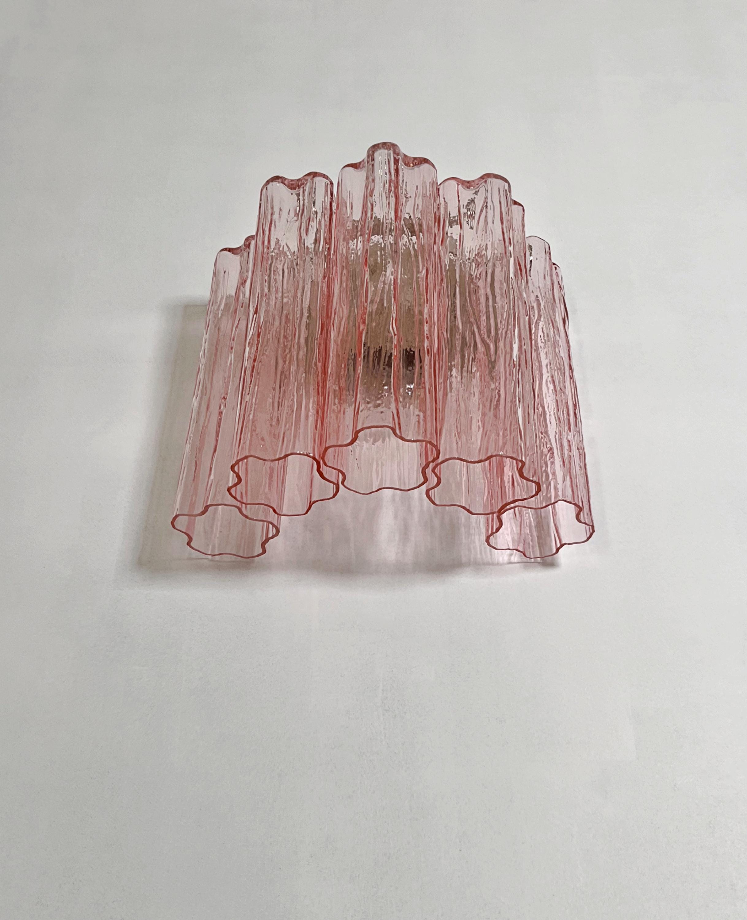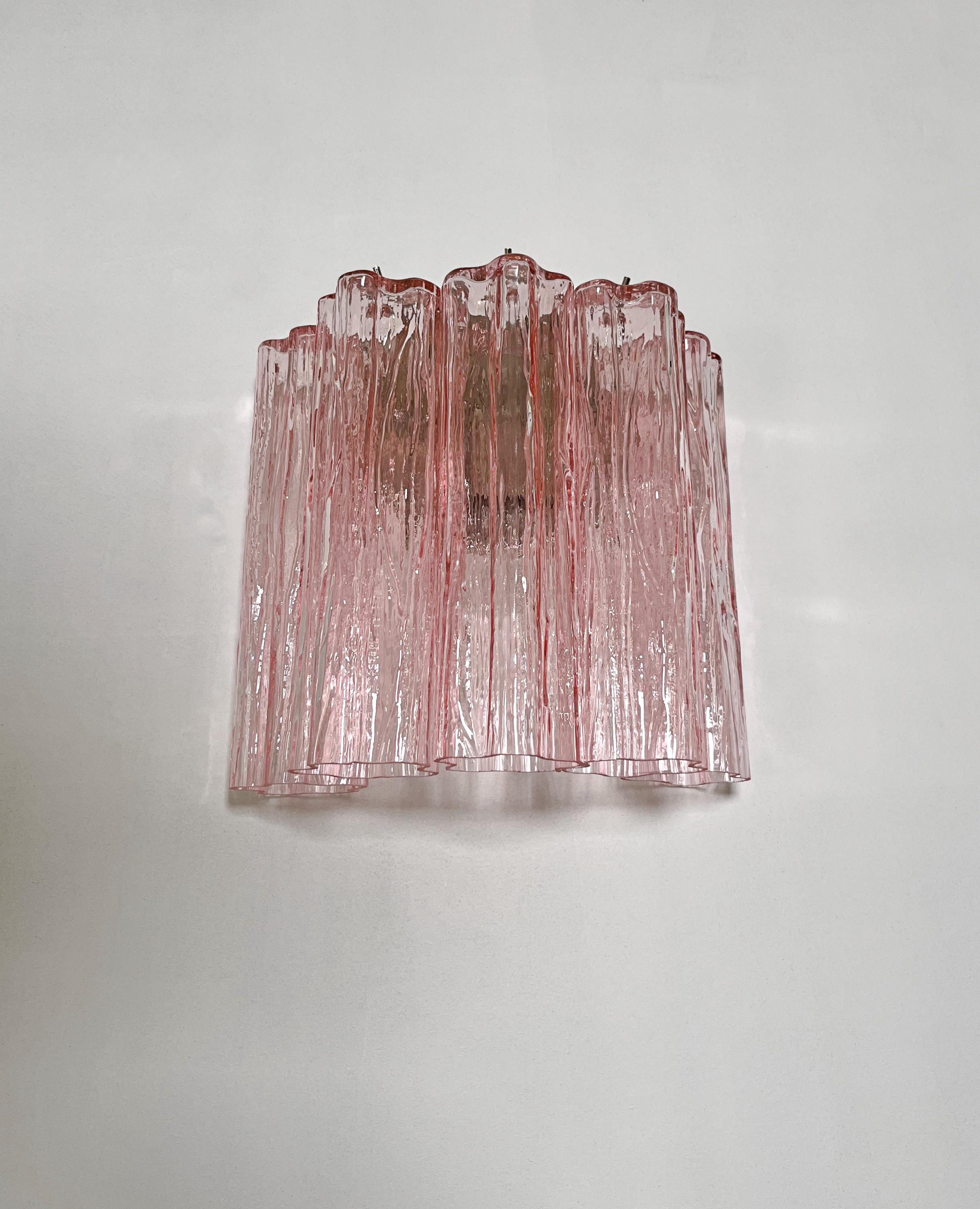 Italian vintage pair of wall sconces in Murano glass and nickel-plated metal structure. The armor polished nickel supports 5 large pink glass tubes in a star shape for each lamp.