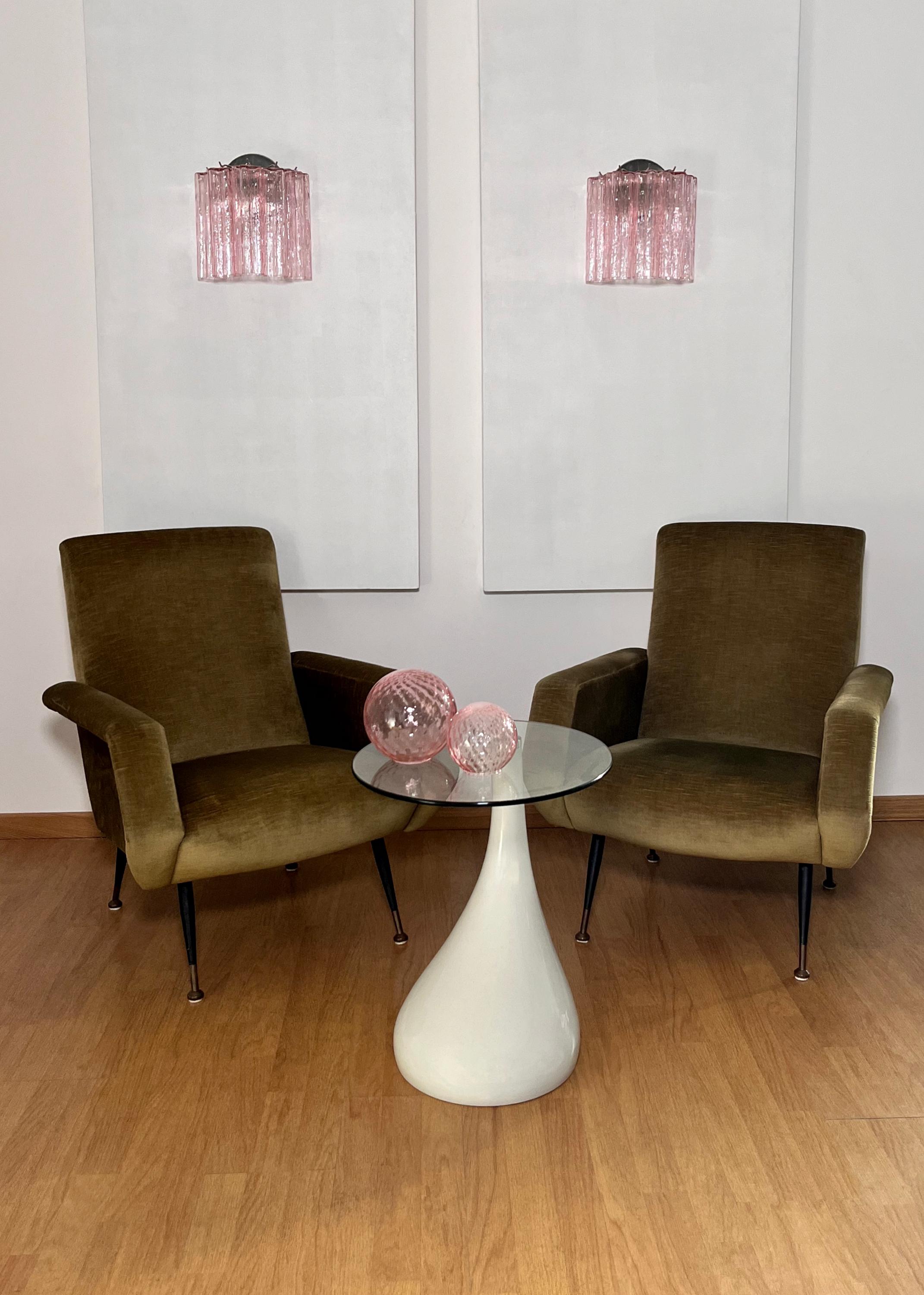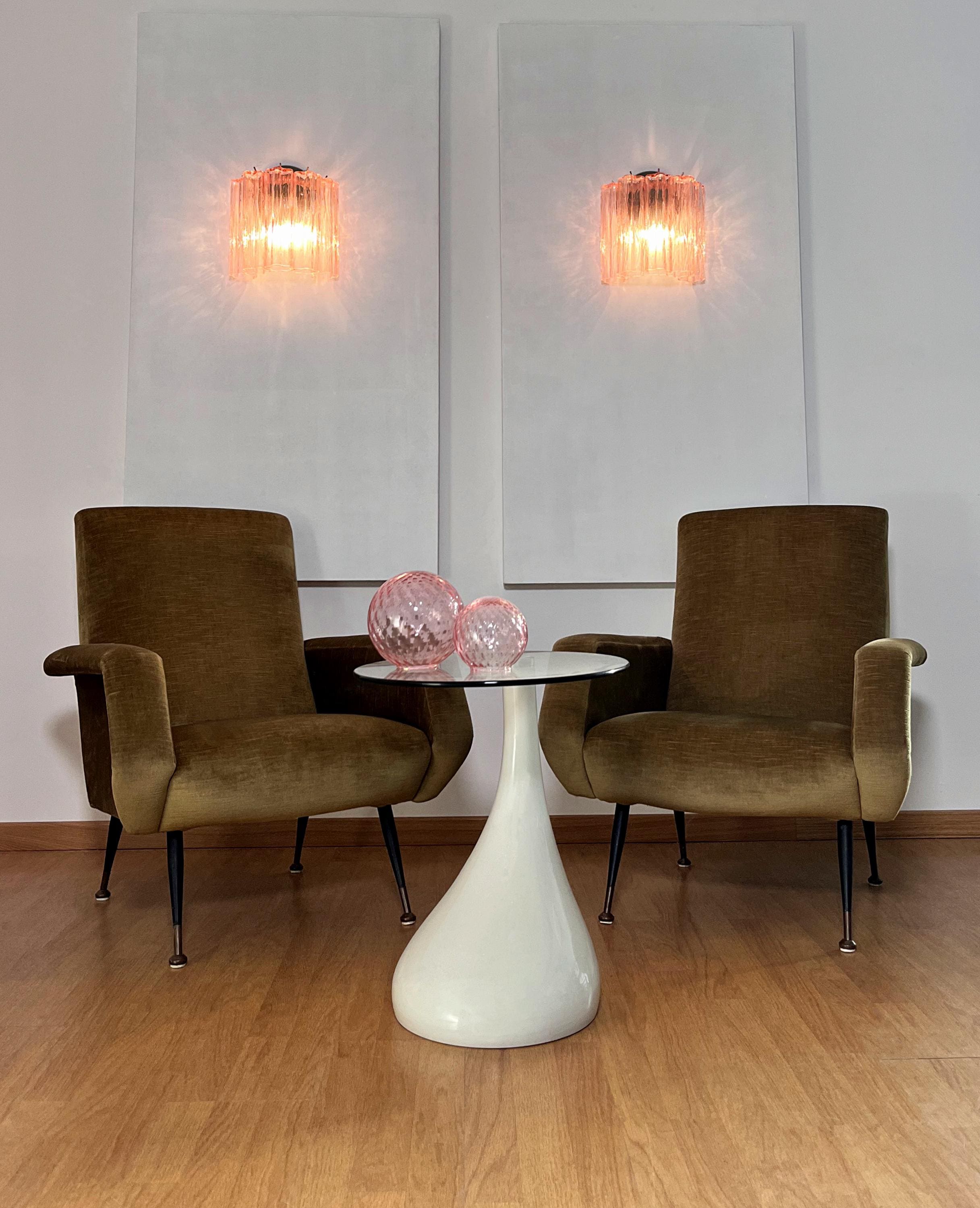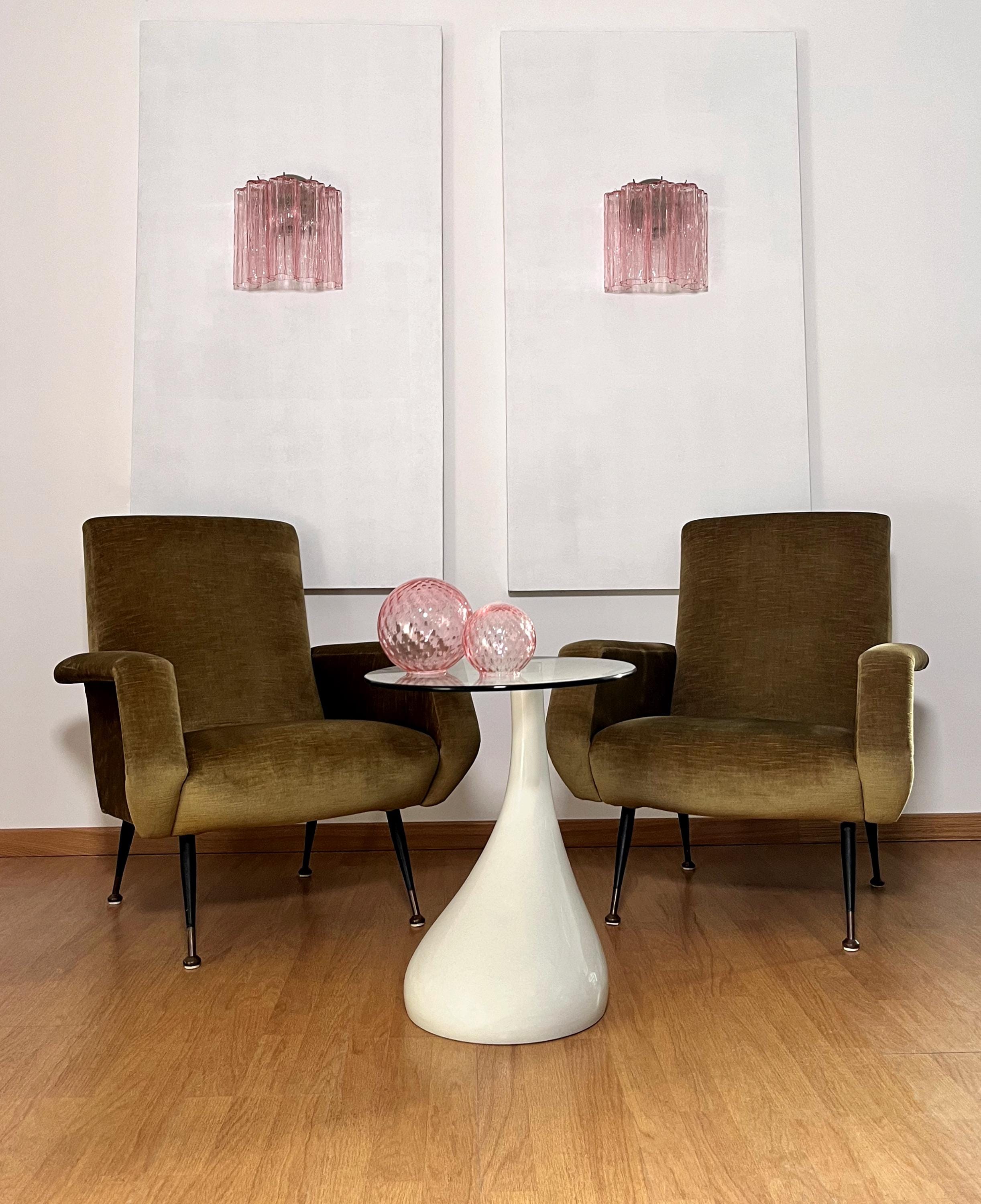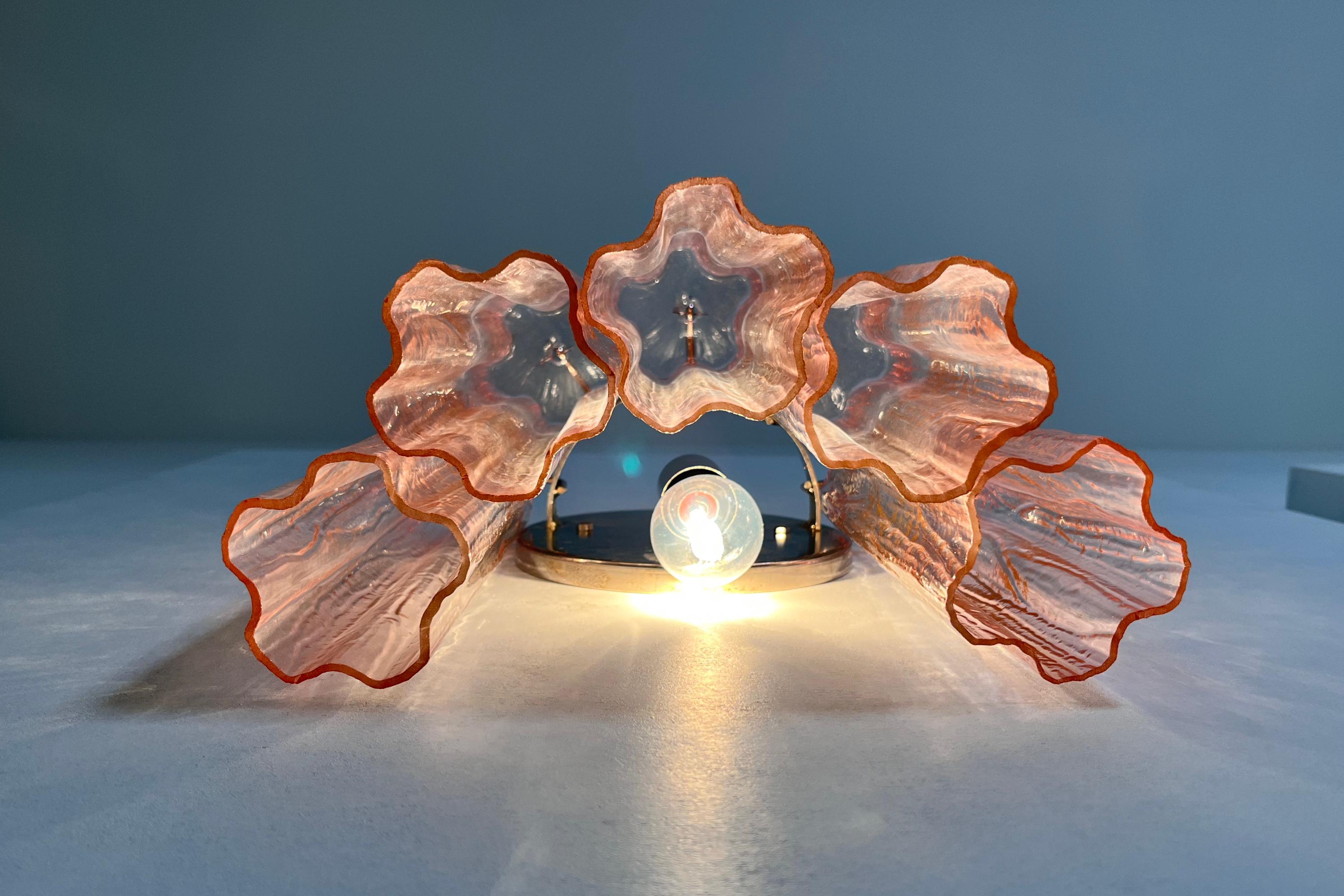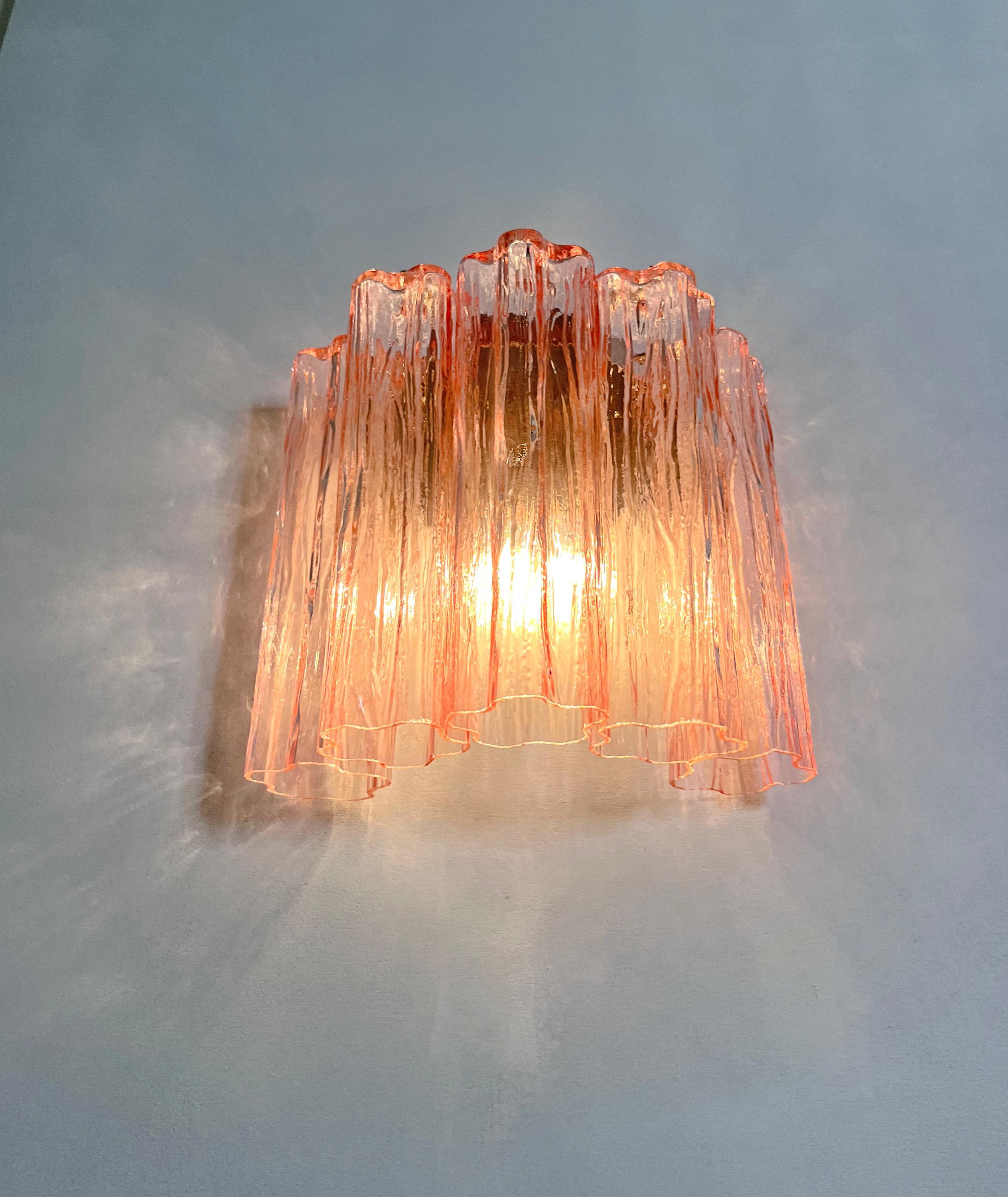 Italian vintage pair of wall sconces in Murano glass and nickel-plated metal structure. The armor polished nickel supports 5 large pink glass tubes in a star shape for each lamp.