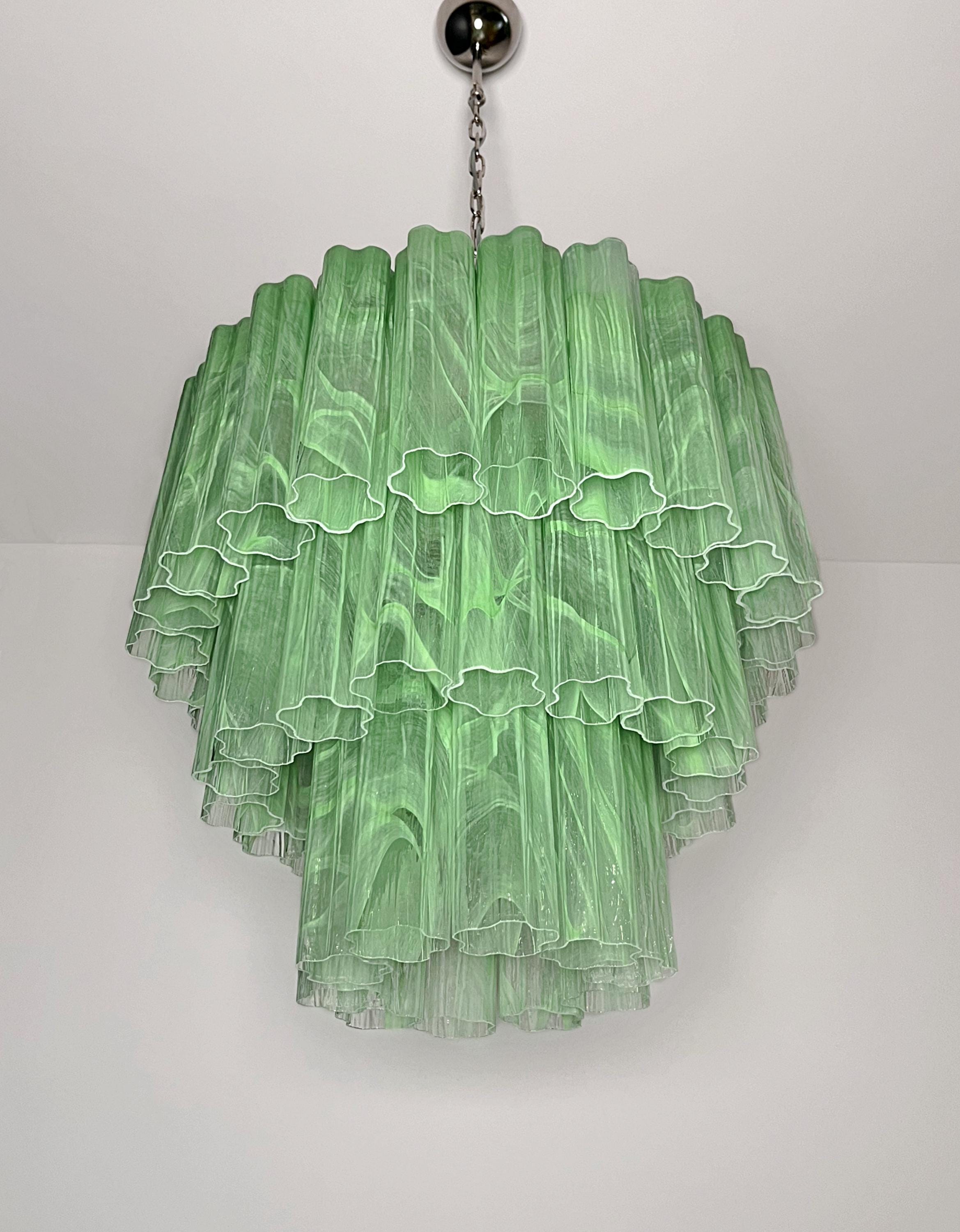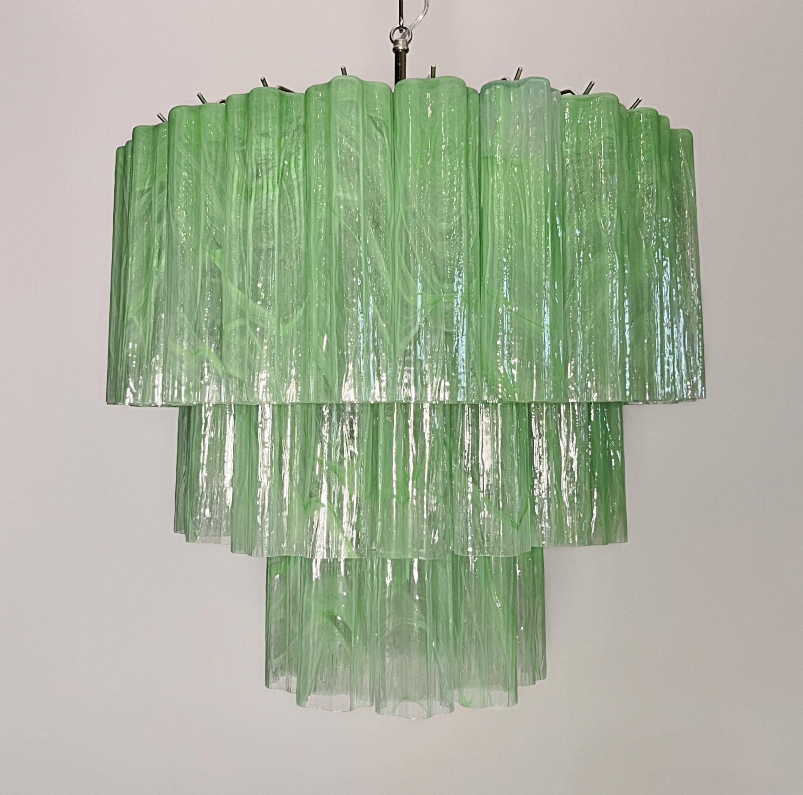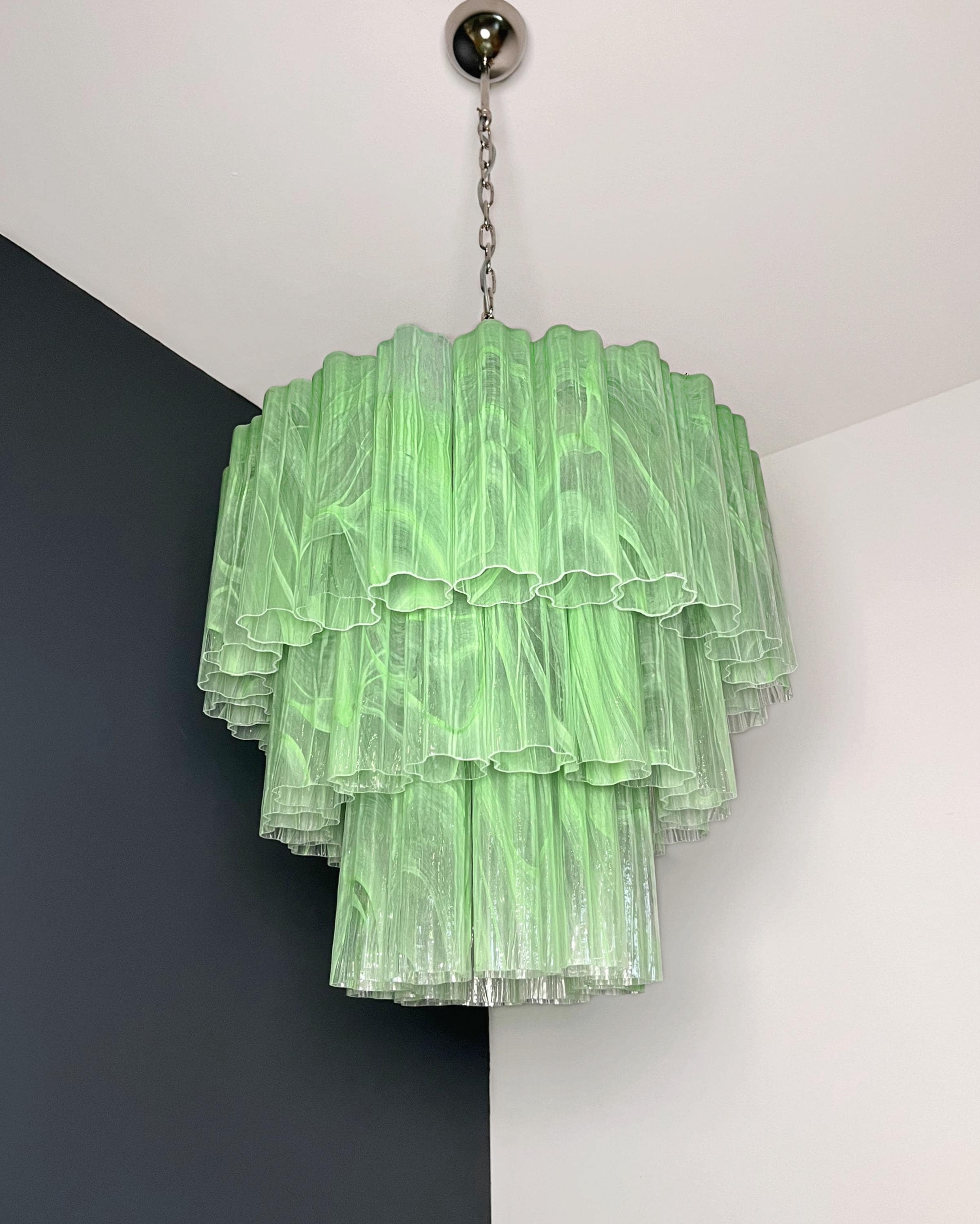 Italian vintage chandelier in Murano glass and nickel-plated metal structure.The armor polished nickel supports 101 large green alabaster glass tubes in a star shape. The alabaster technique created in Venetian glassworks gives the glass an elegant grain.