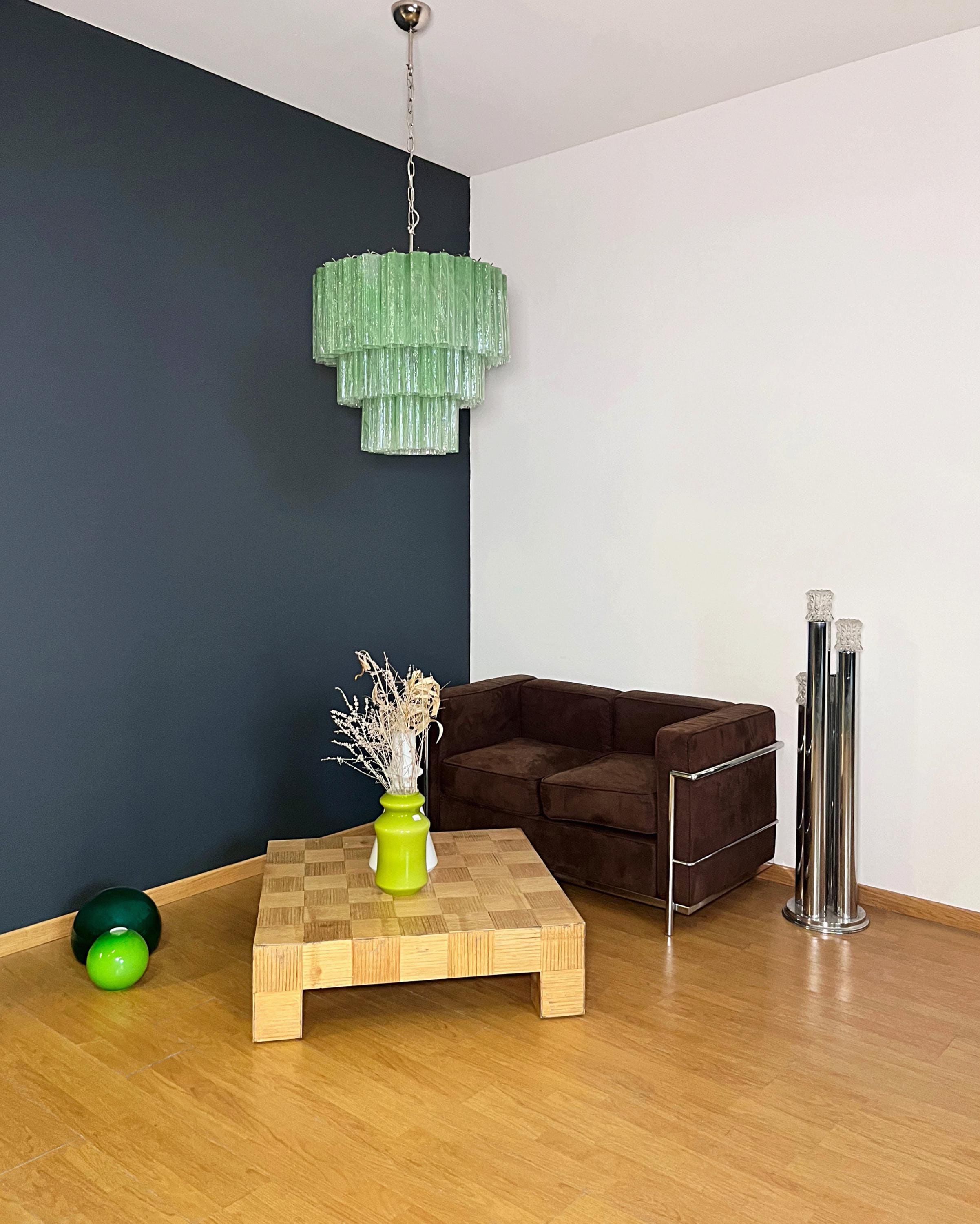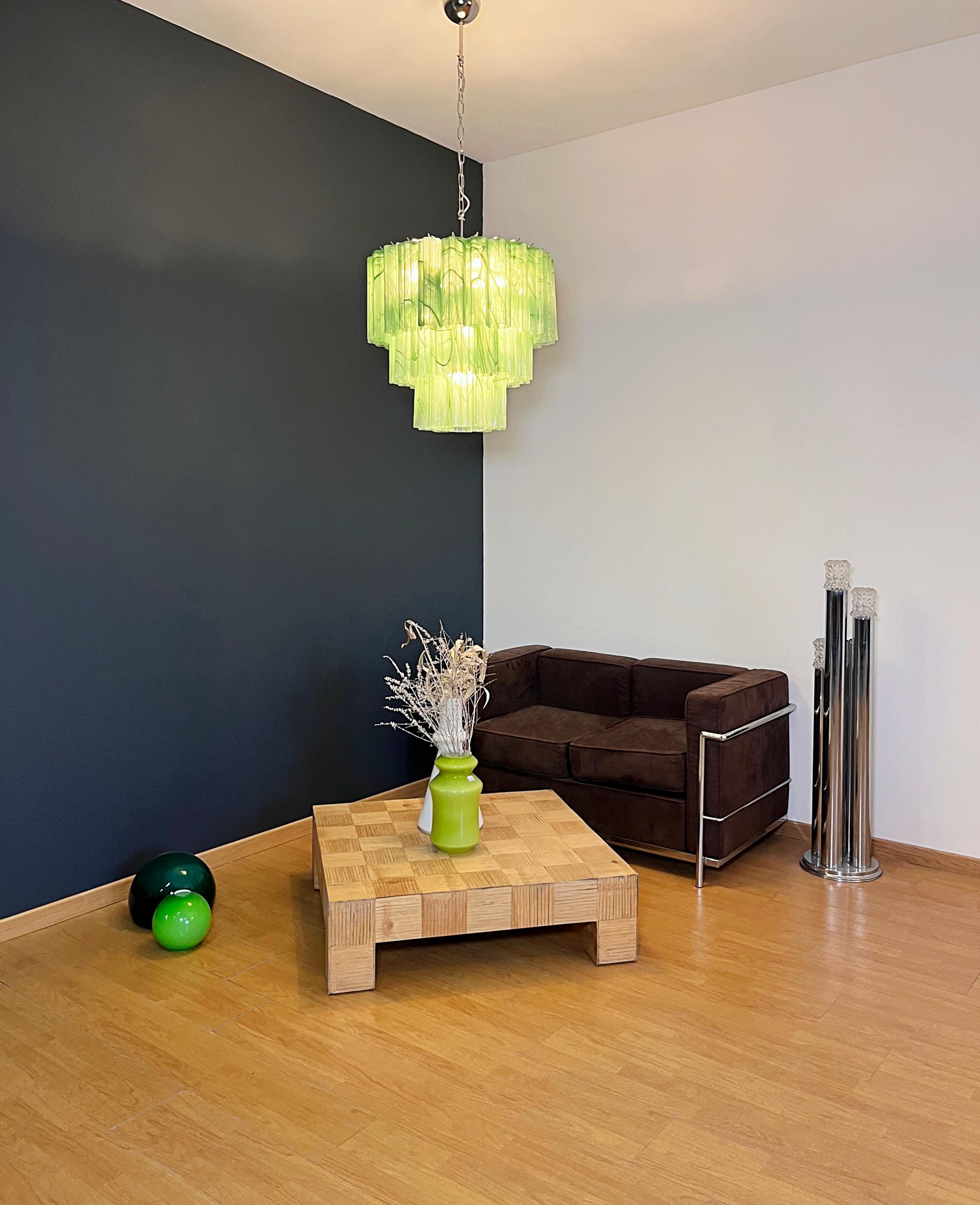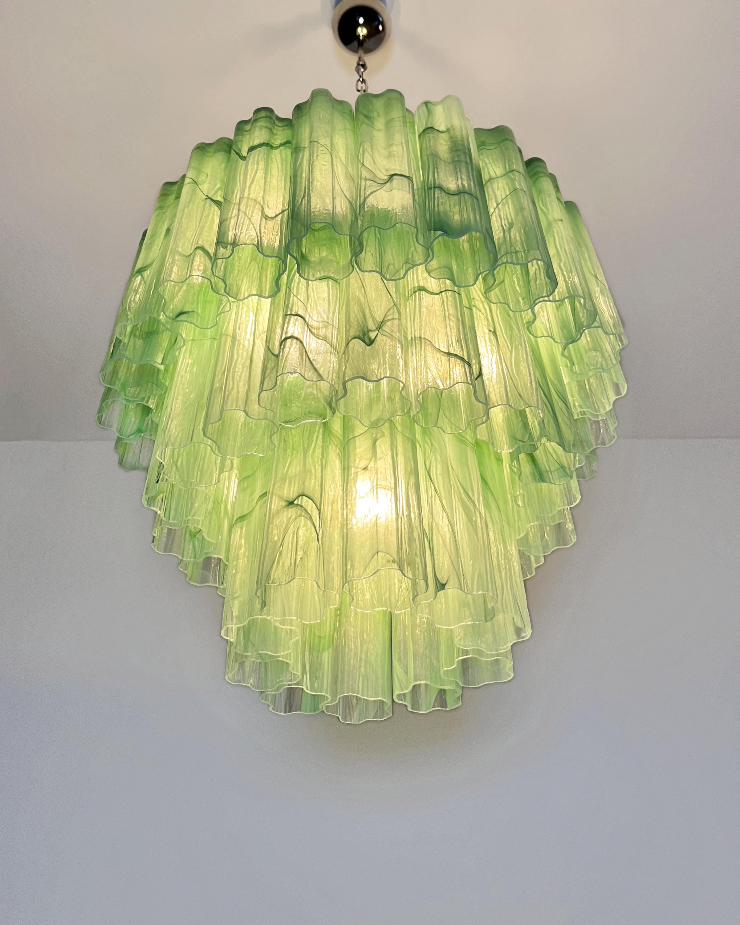 Italian vintage chandelier in Murano glass and nickel-plated metal structure.The armor polished nickel supports 101 large green alabaster glass tubes in a star shape. The alabaster technique created in Venetian glassworks gives the glass an elegant grain.