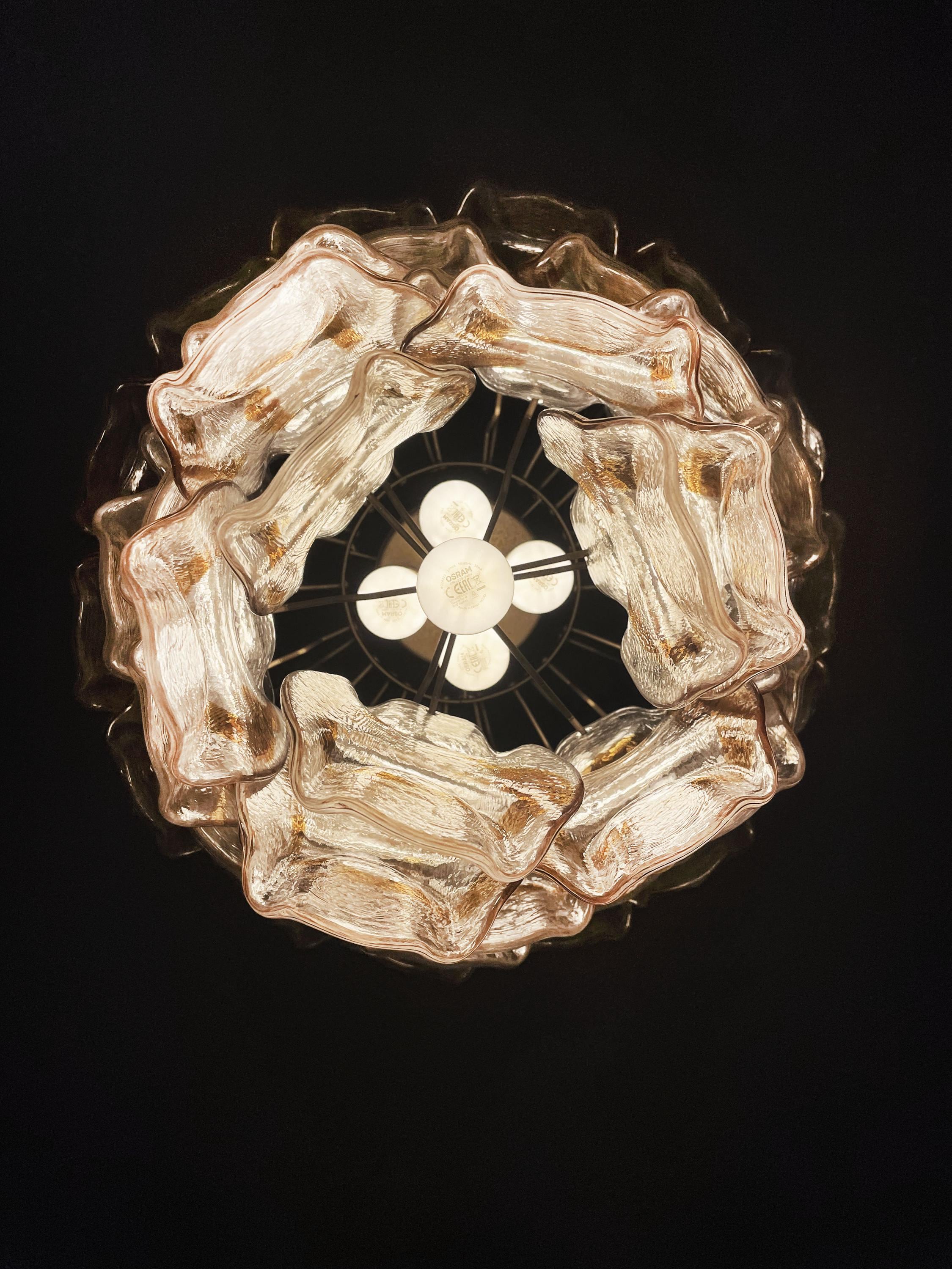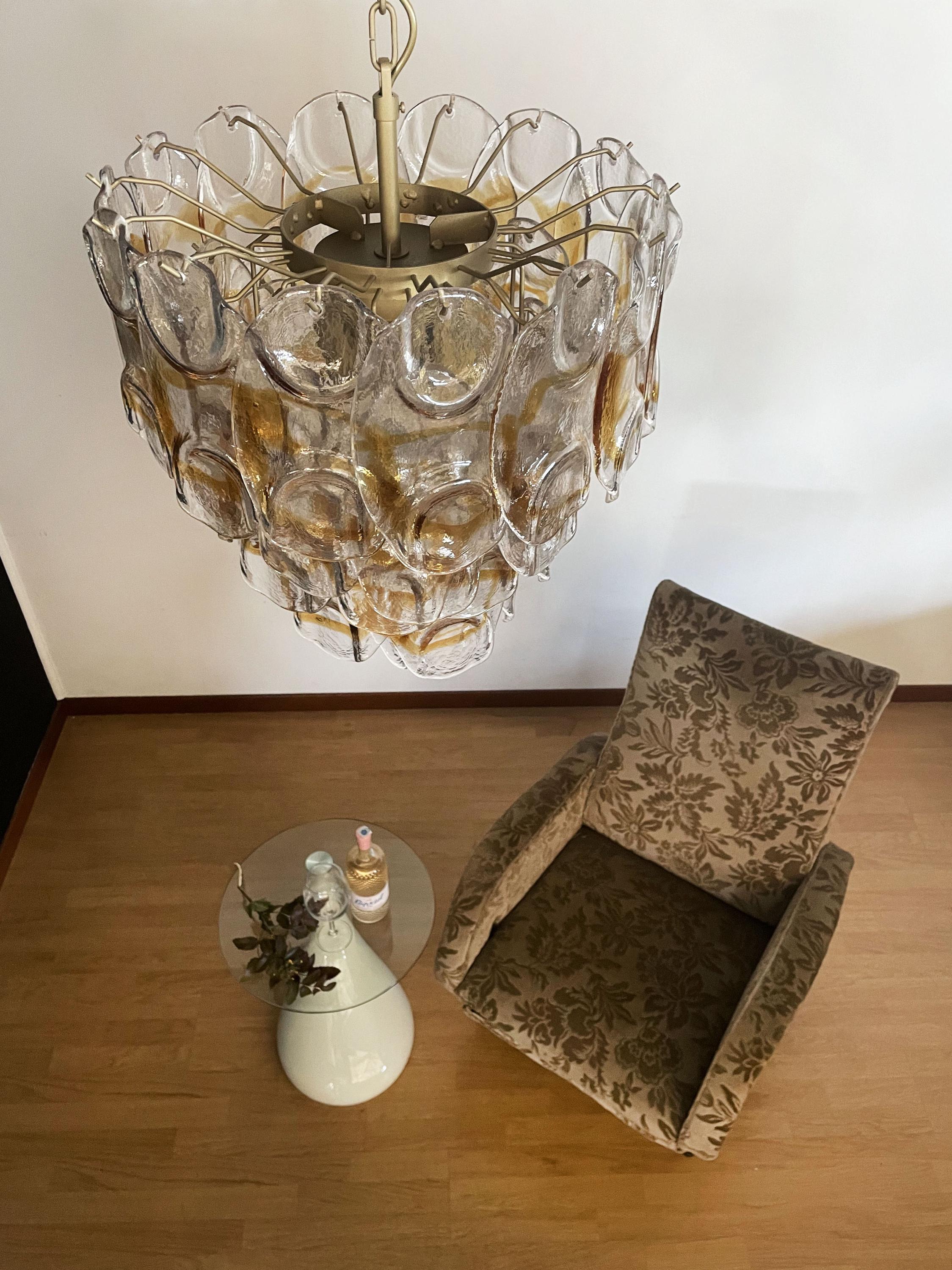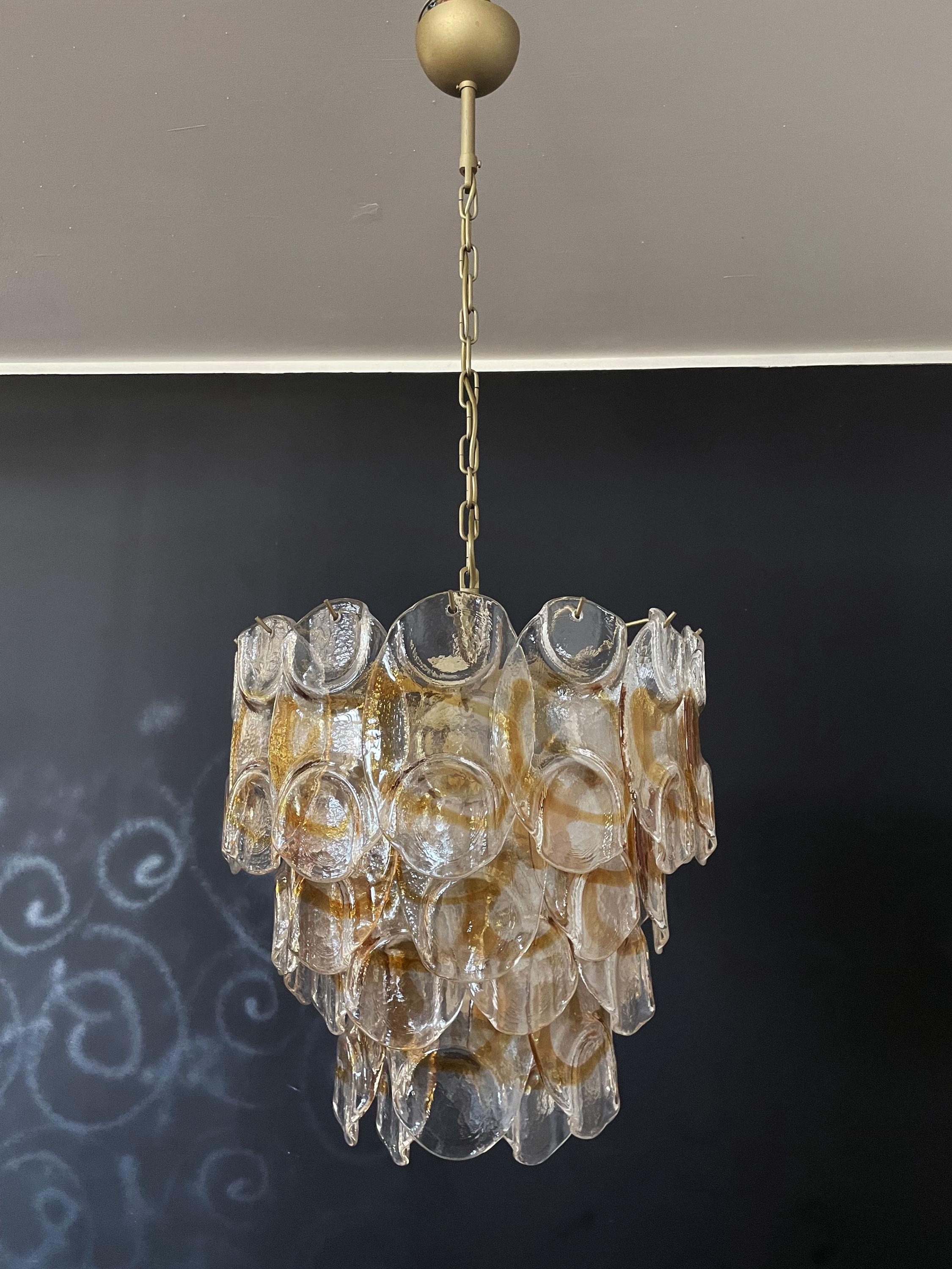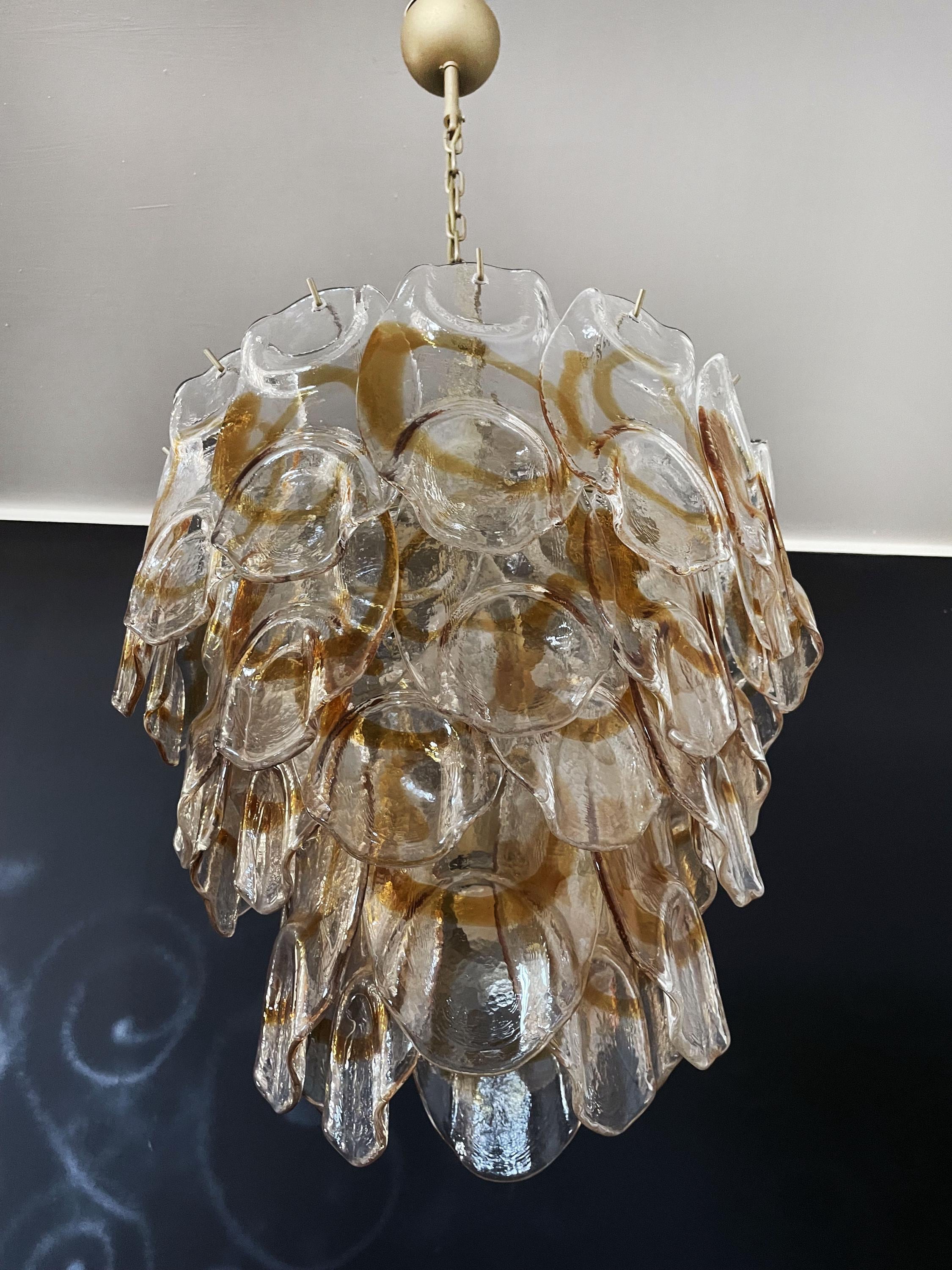 Rare Italian vintage Murano chandelier. The fixture is made up of 41 individual handblown glass elements hanging (transparent and amber) from a gold painted metal frame. Each piece clear with amber center.