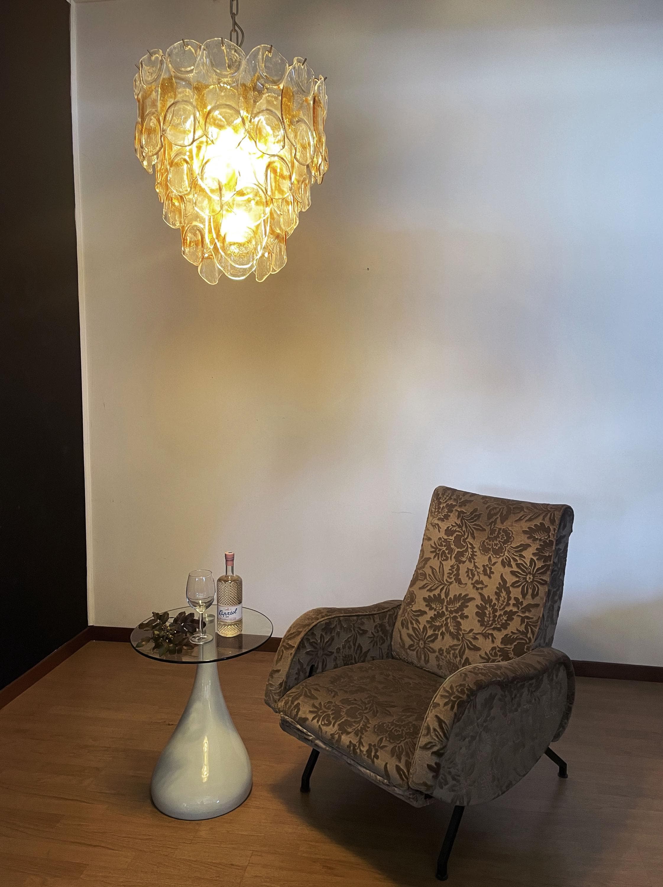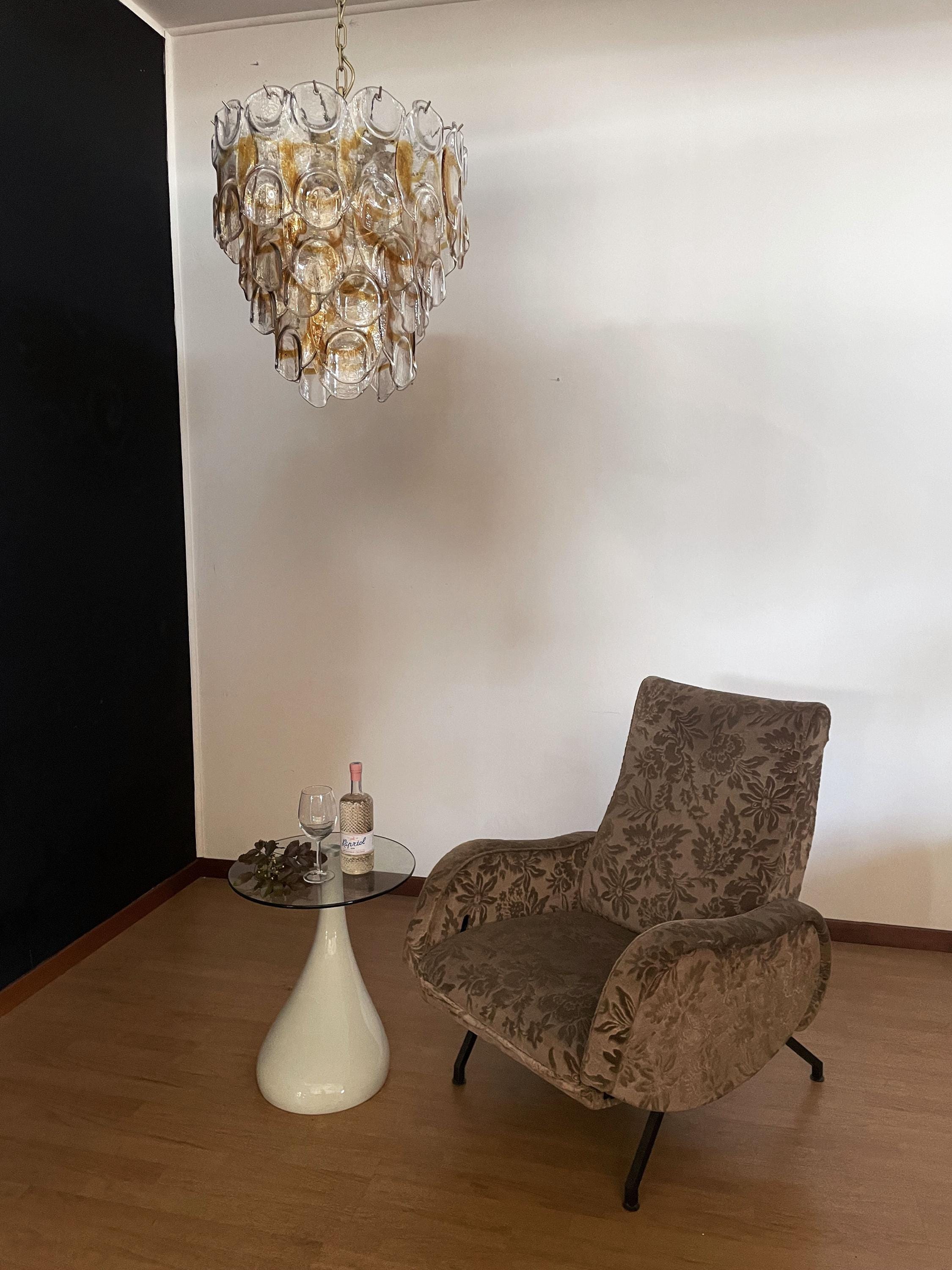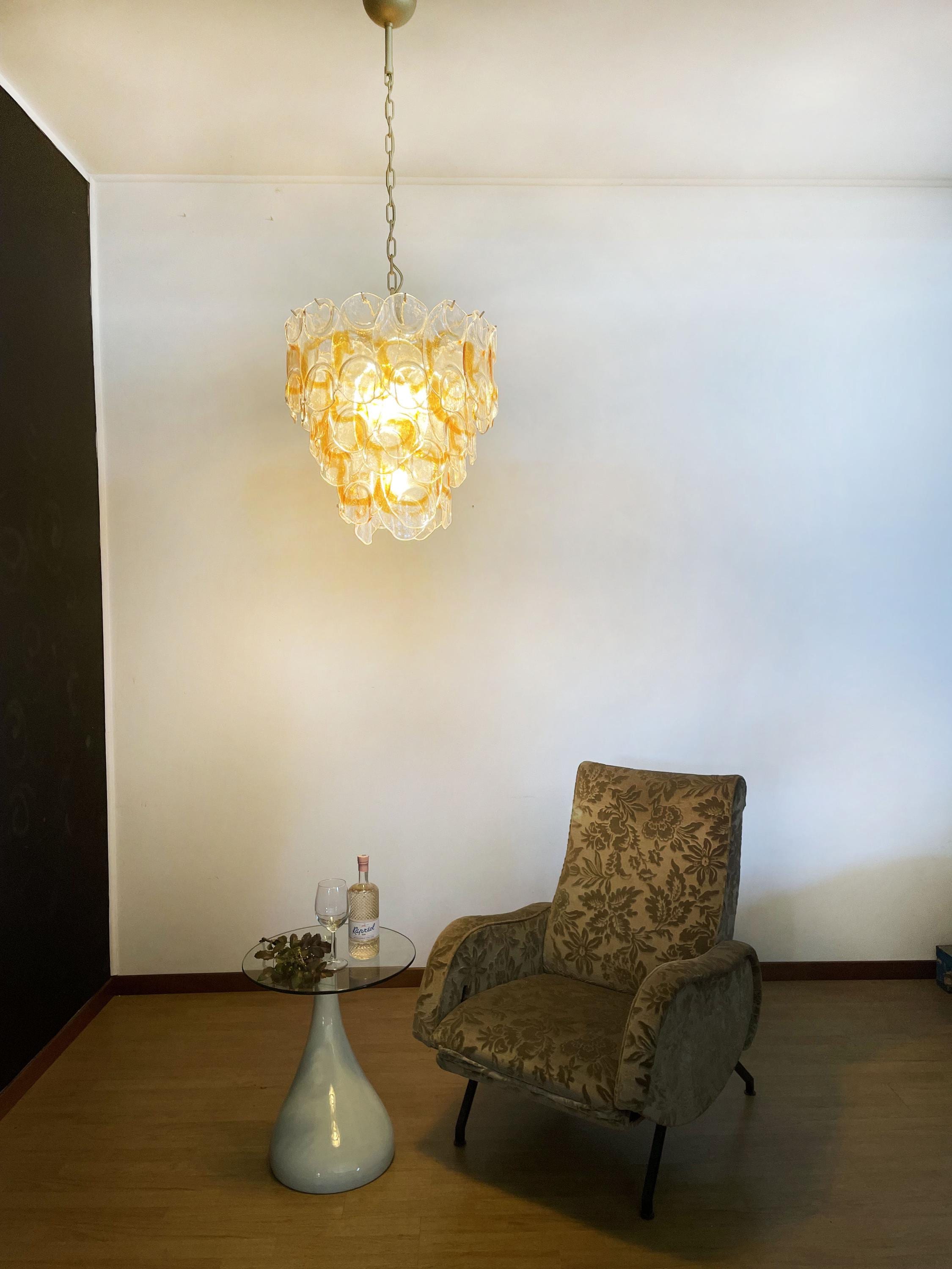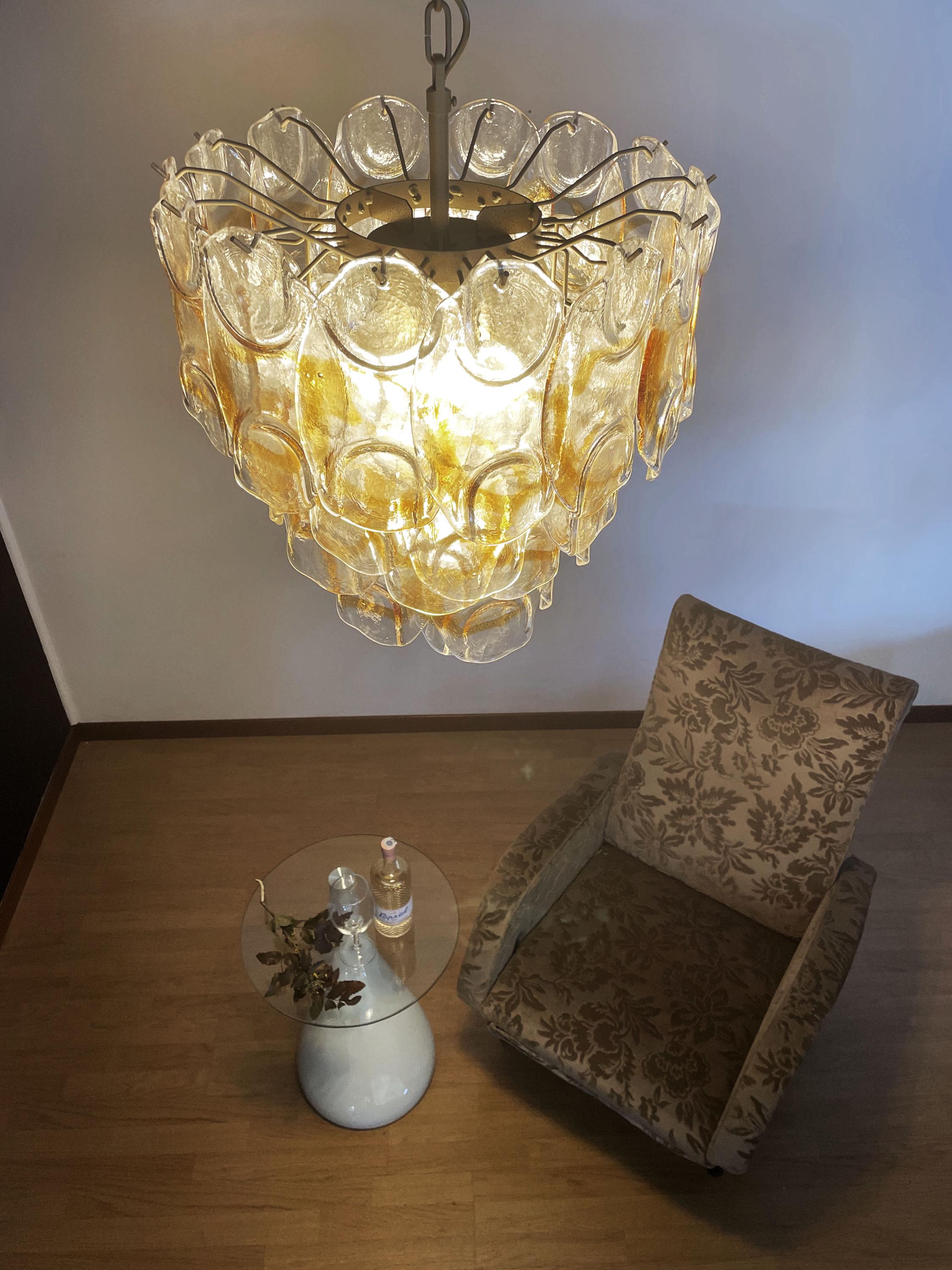 Rare Italian vintage Murano chandelier. The fixture is made up of 41 individual handblown glass elements hanging (transparent and amber) from a gold painted metal frame. Each piece clear with amber center.