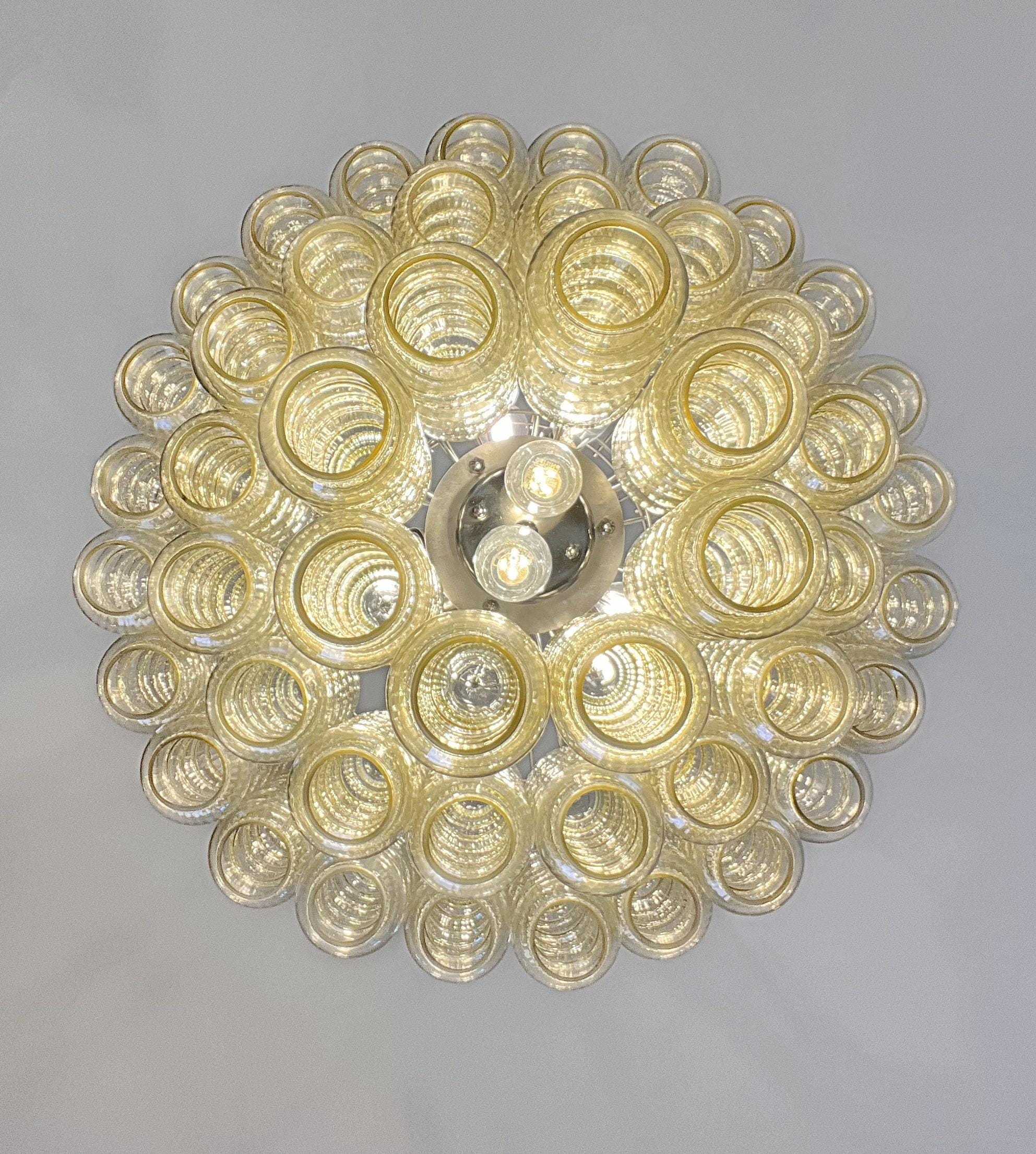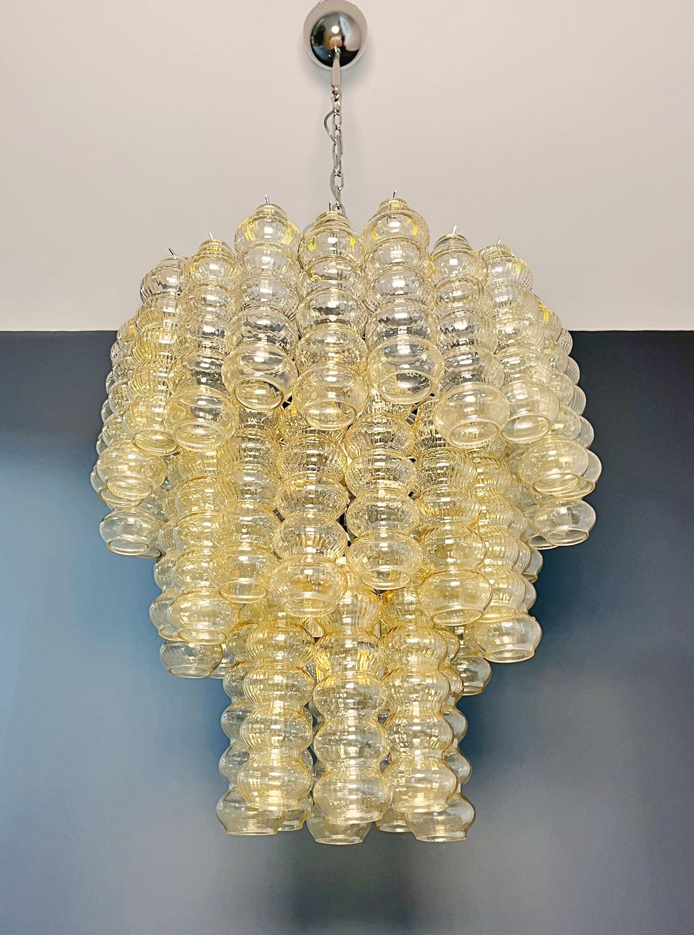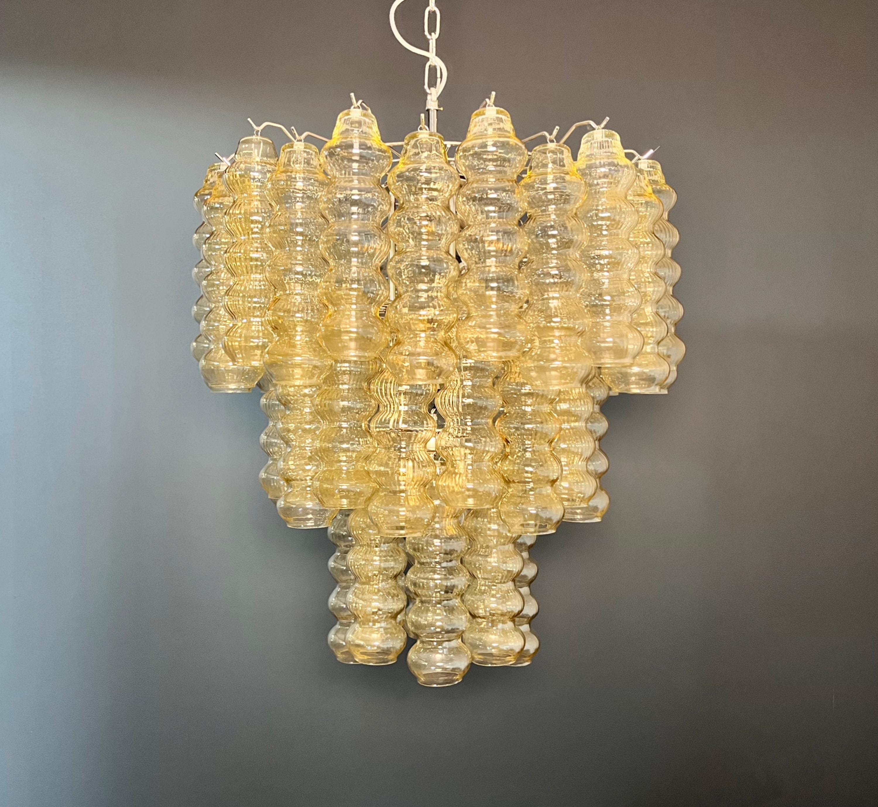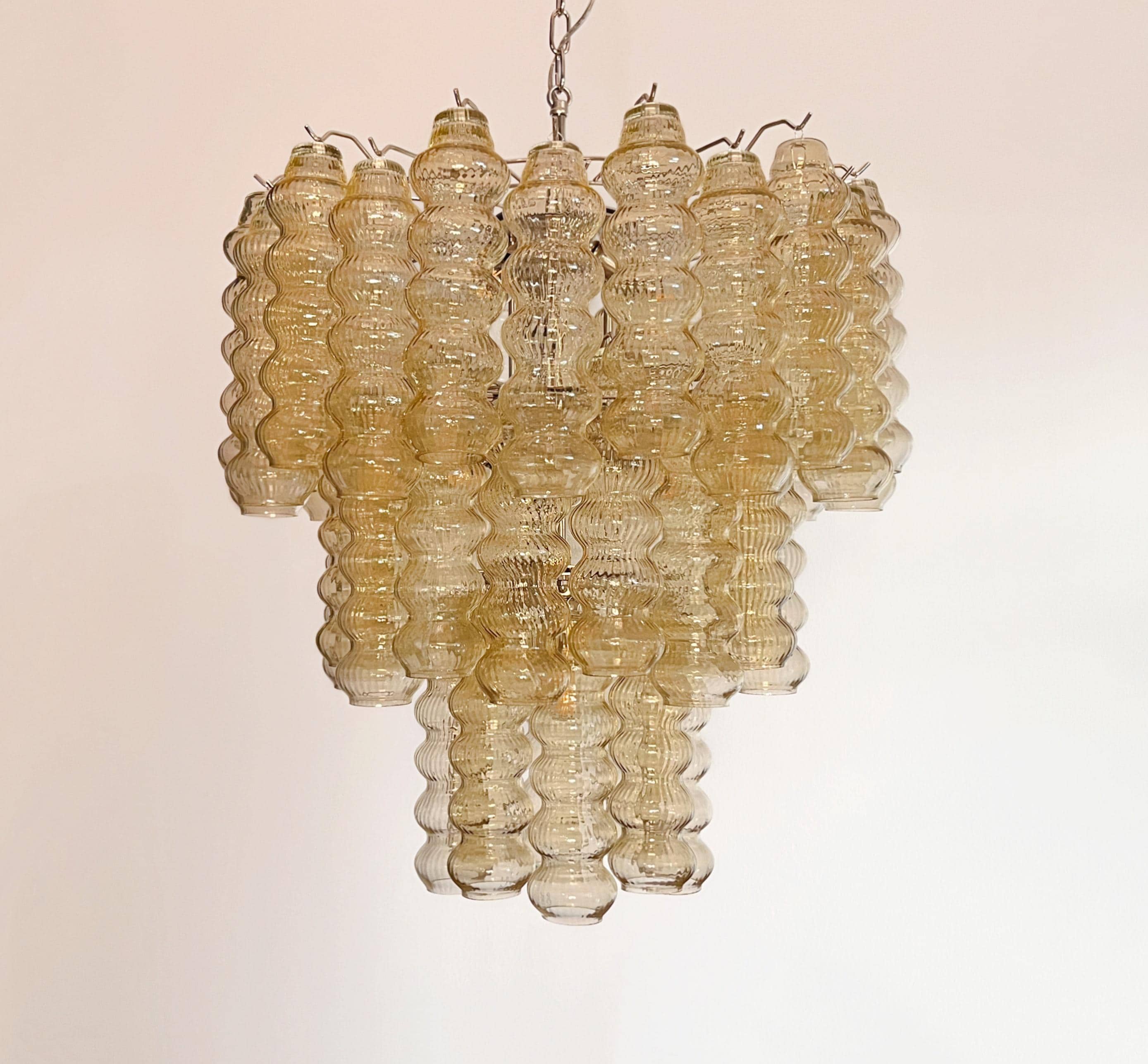 Italian vintage chandelier in Murano glass and nickel-plated metal structure. The armor polished nickel supports 48 large clear amber glass tubes. The glasses have a beautiful color, object of rare beauty.