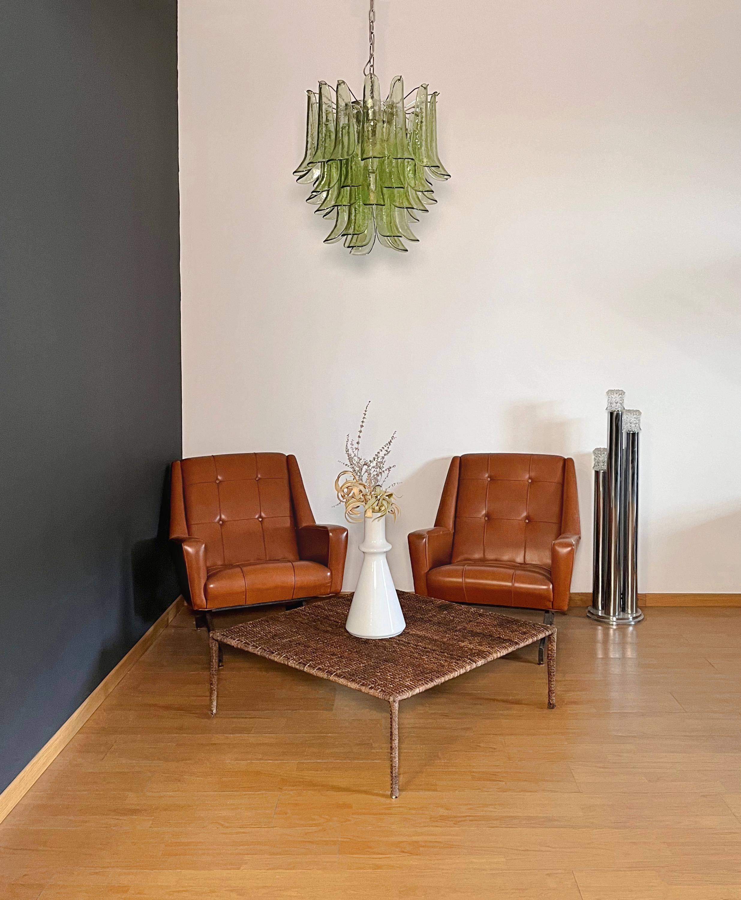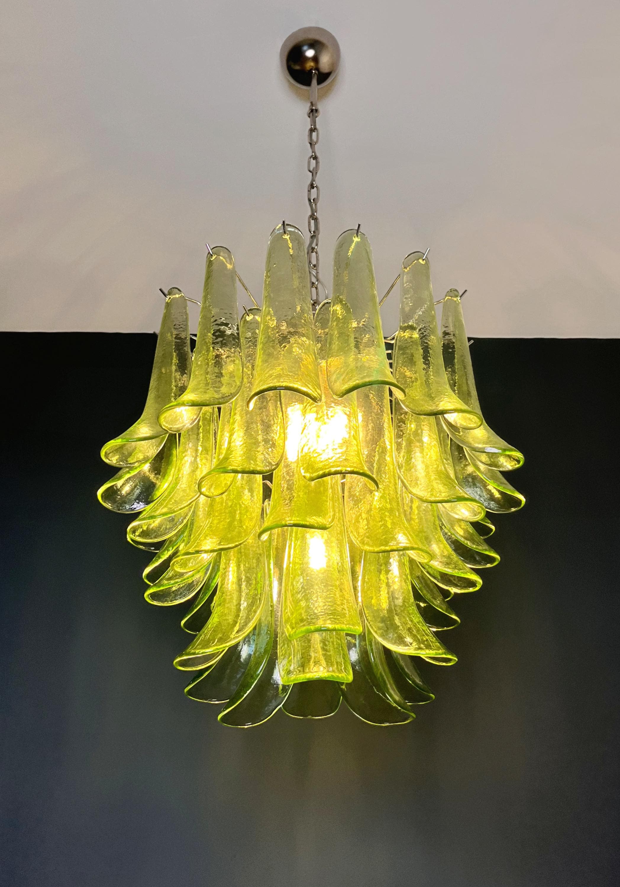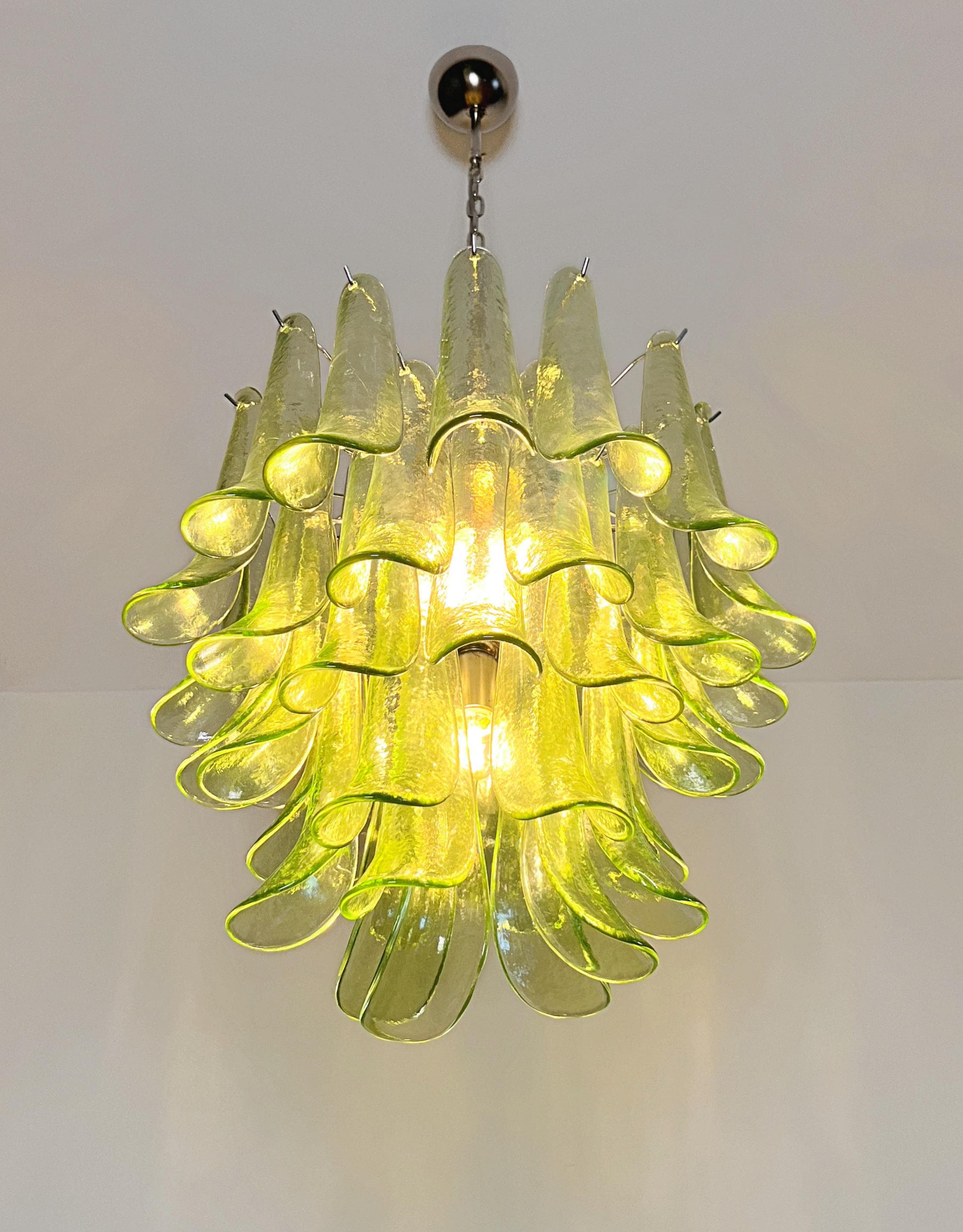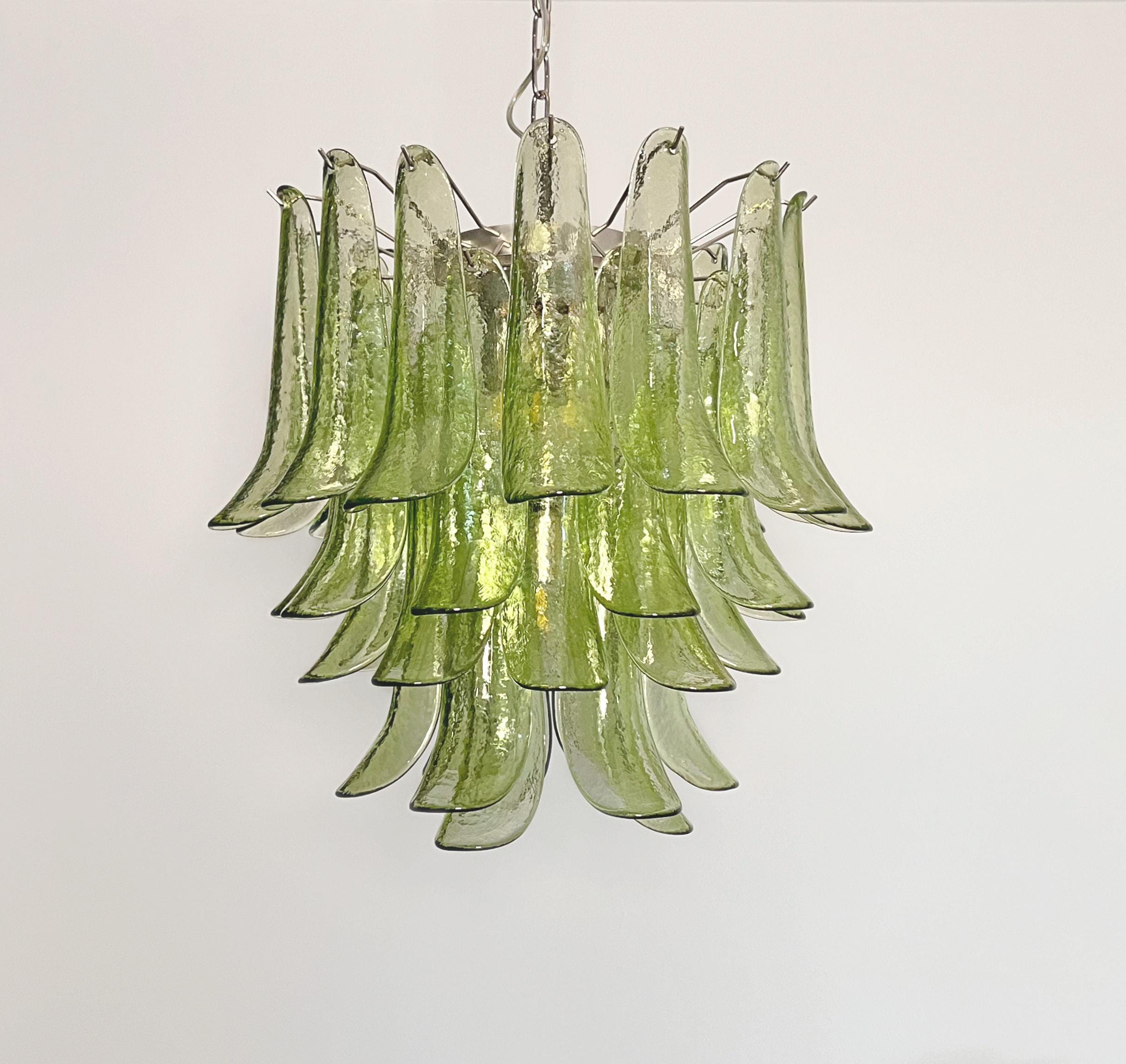 Murano Italian glass chandelier. Fantastic chandelier with green glasses, nickel-plated metal frame. It has 41 big monumental glass petals. The glasses are very high quality, the photos do not do the beauty, luster of these glasses.