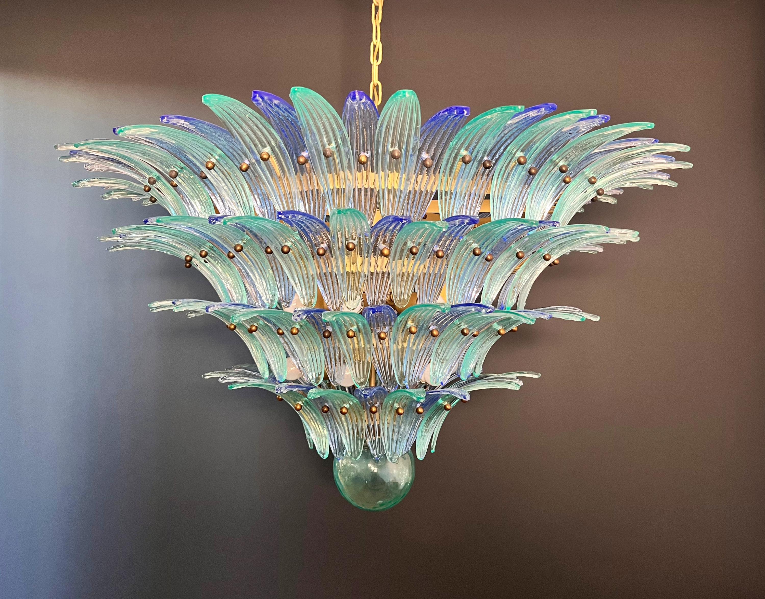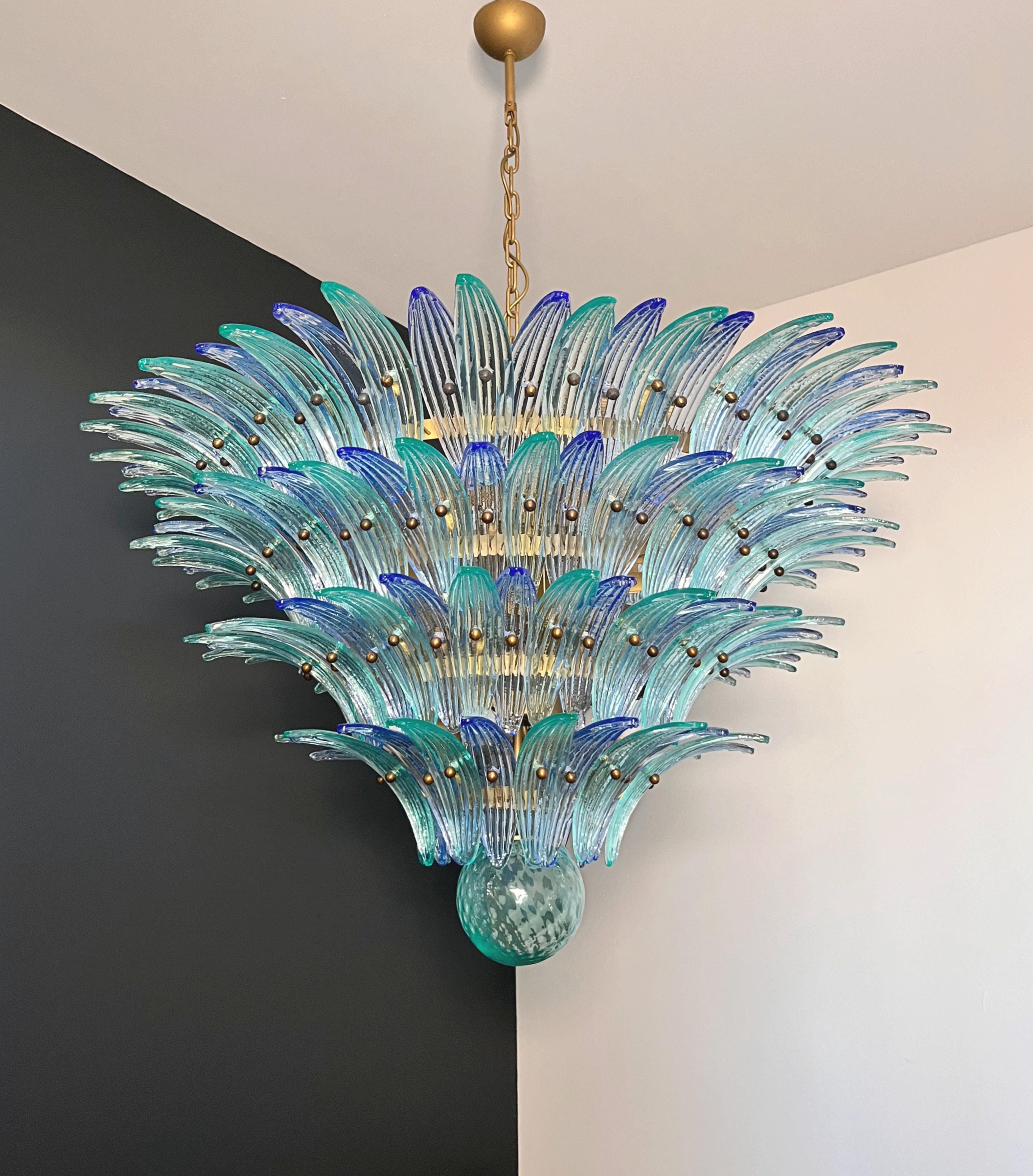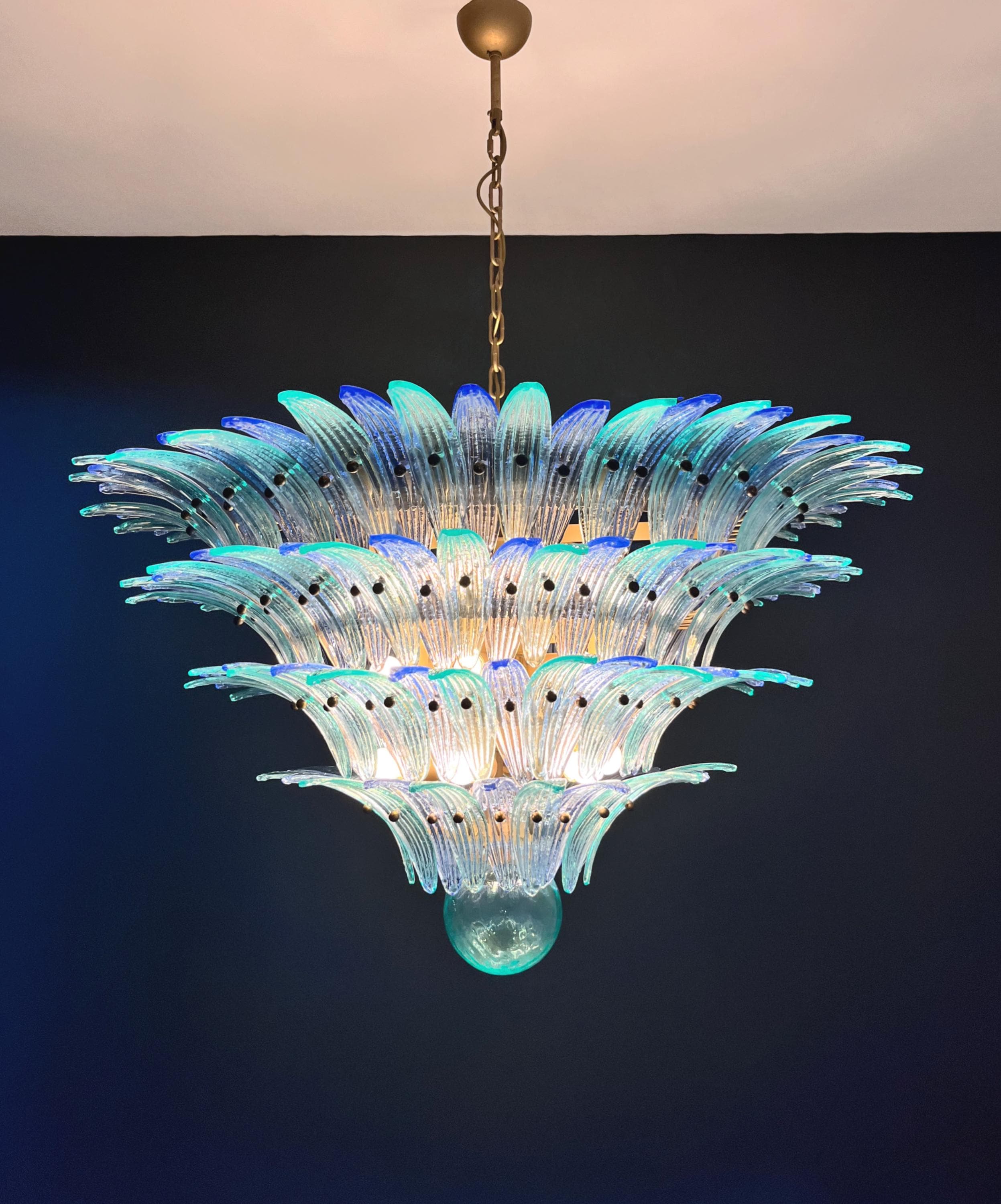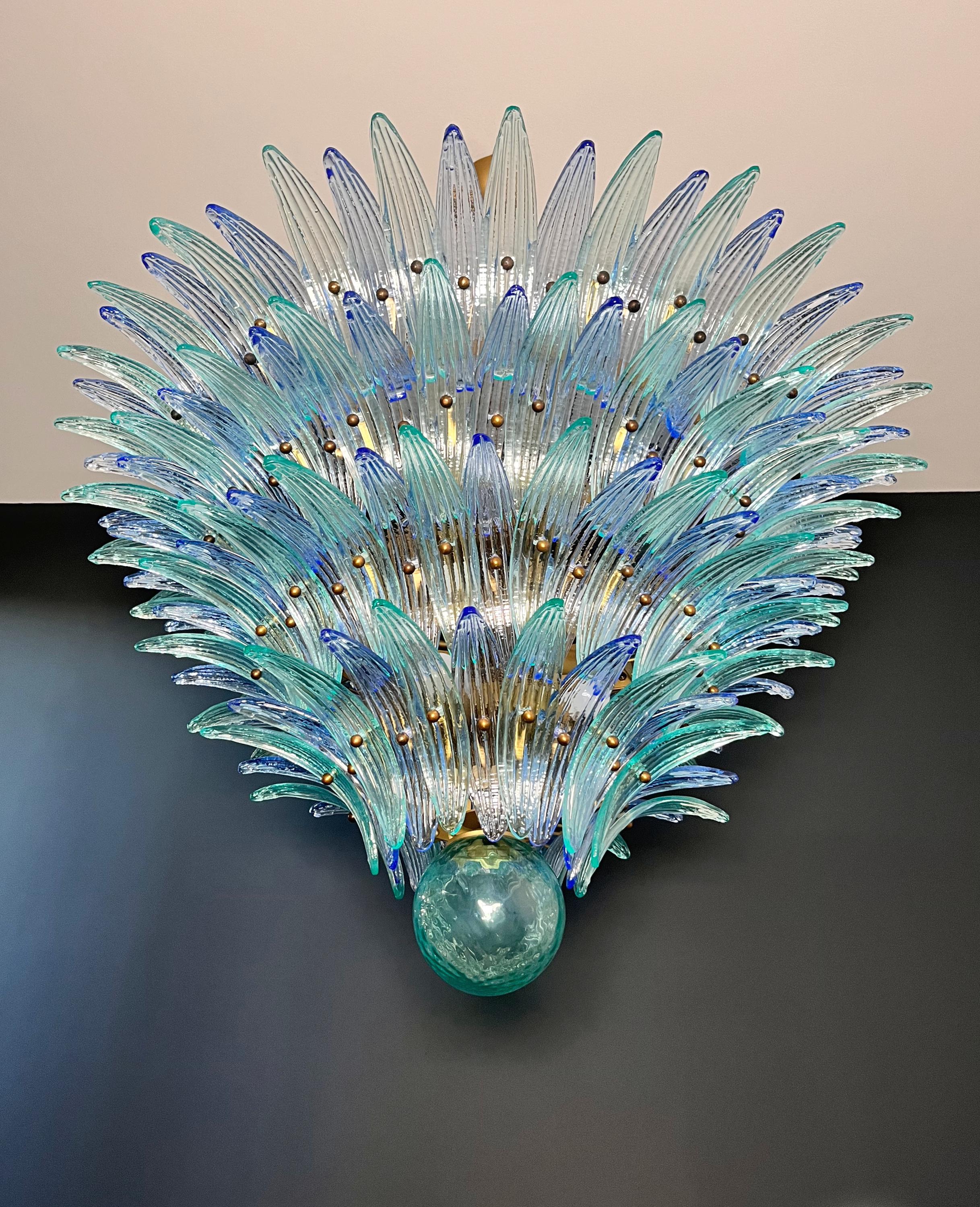 Palmette ceiling light made by 160 Murano blue and turquoise glasses in a gold metal frame. Murano blown glass in a traditional way. Structure in gold colored metal.