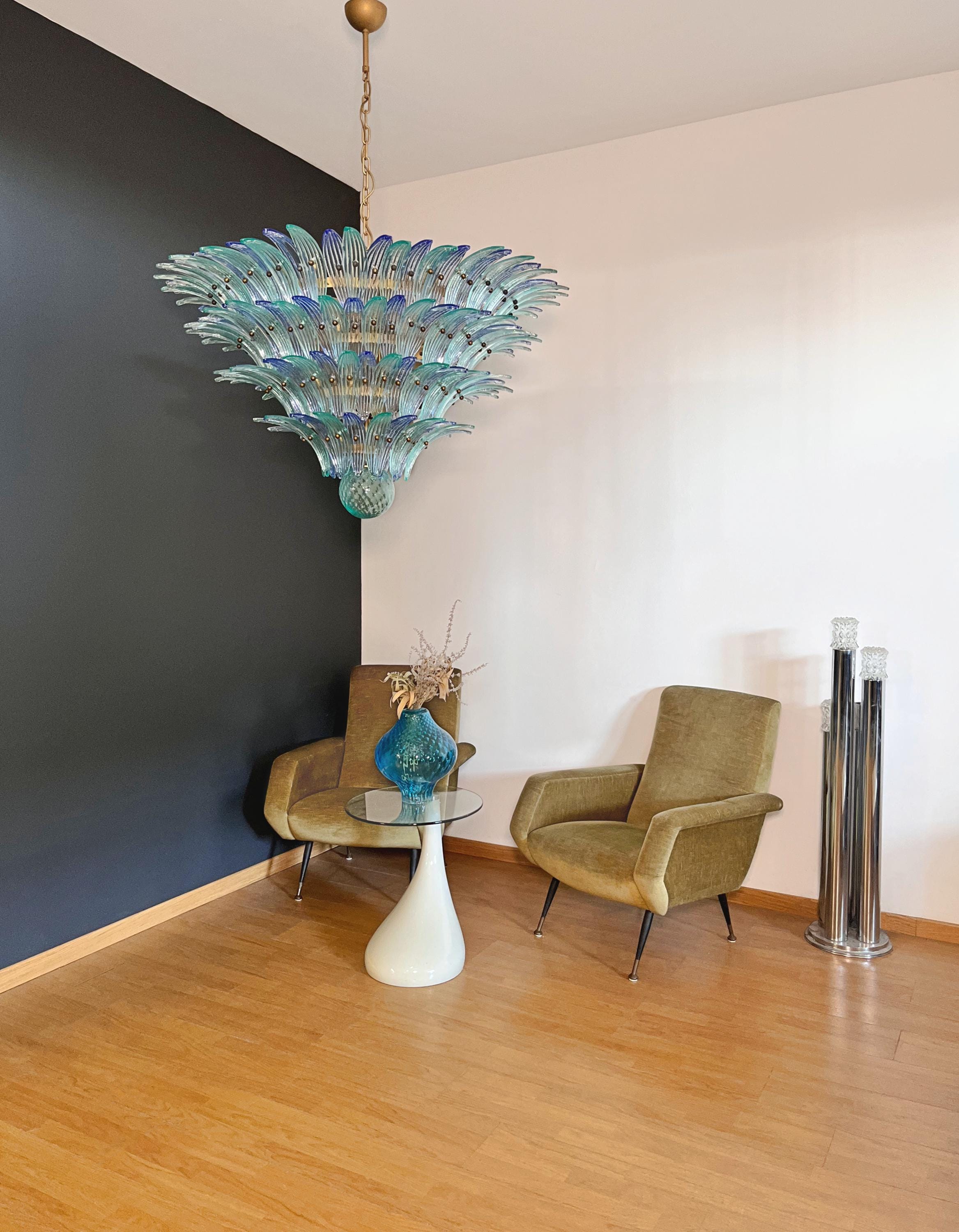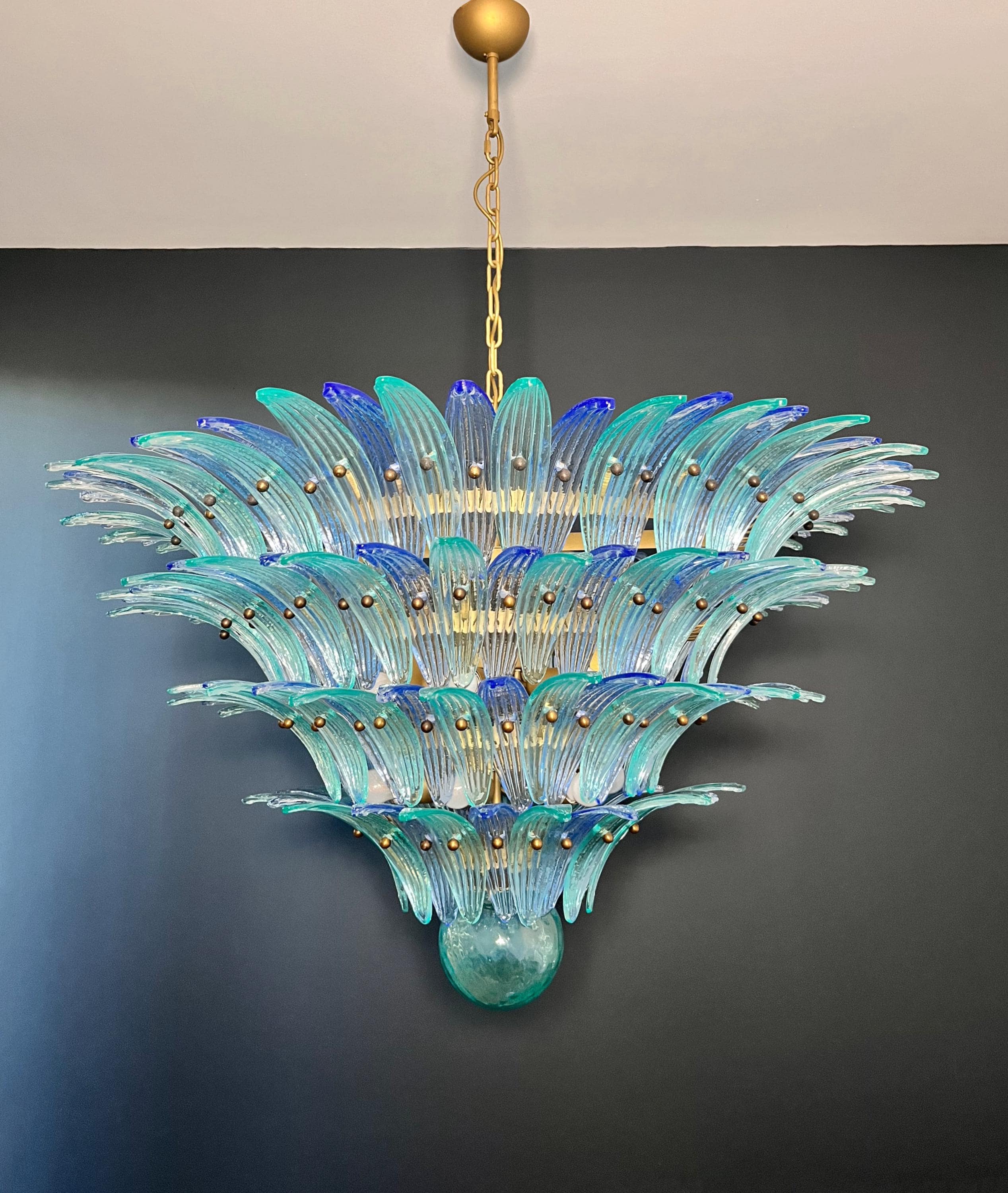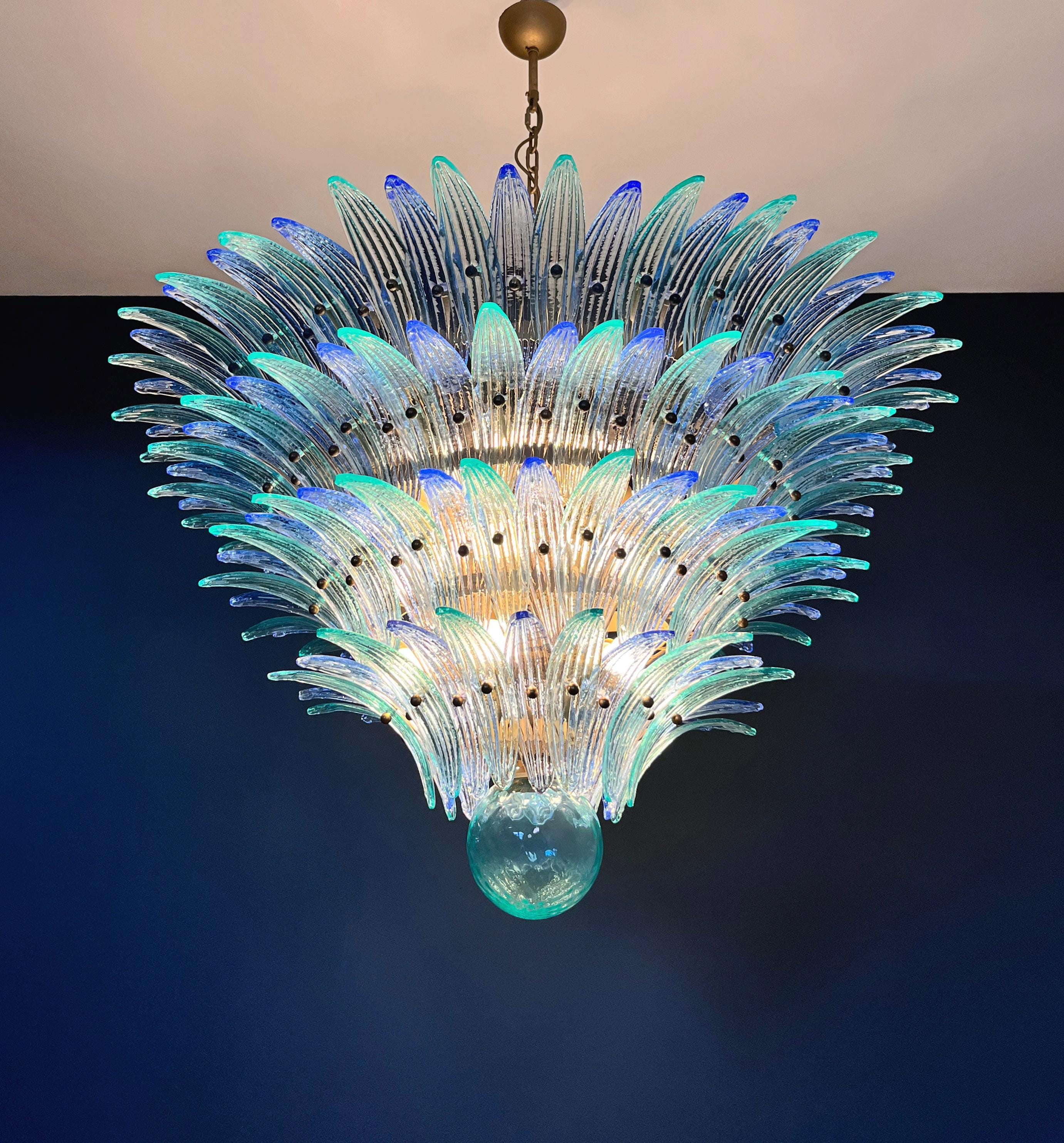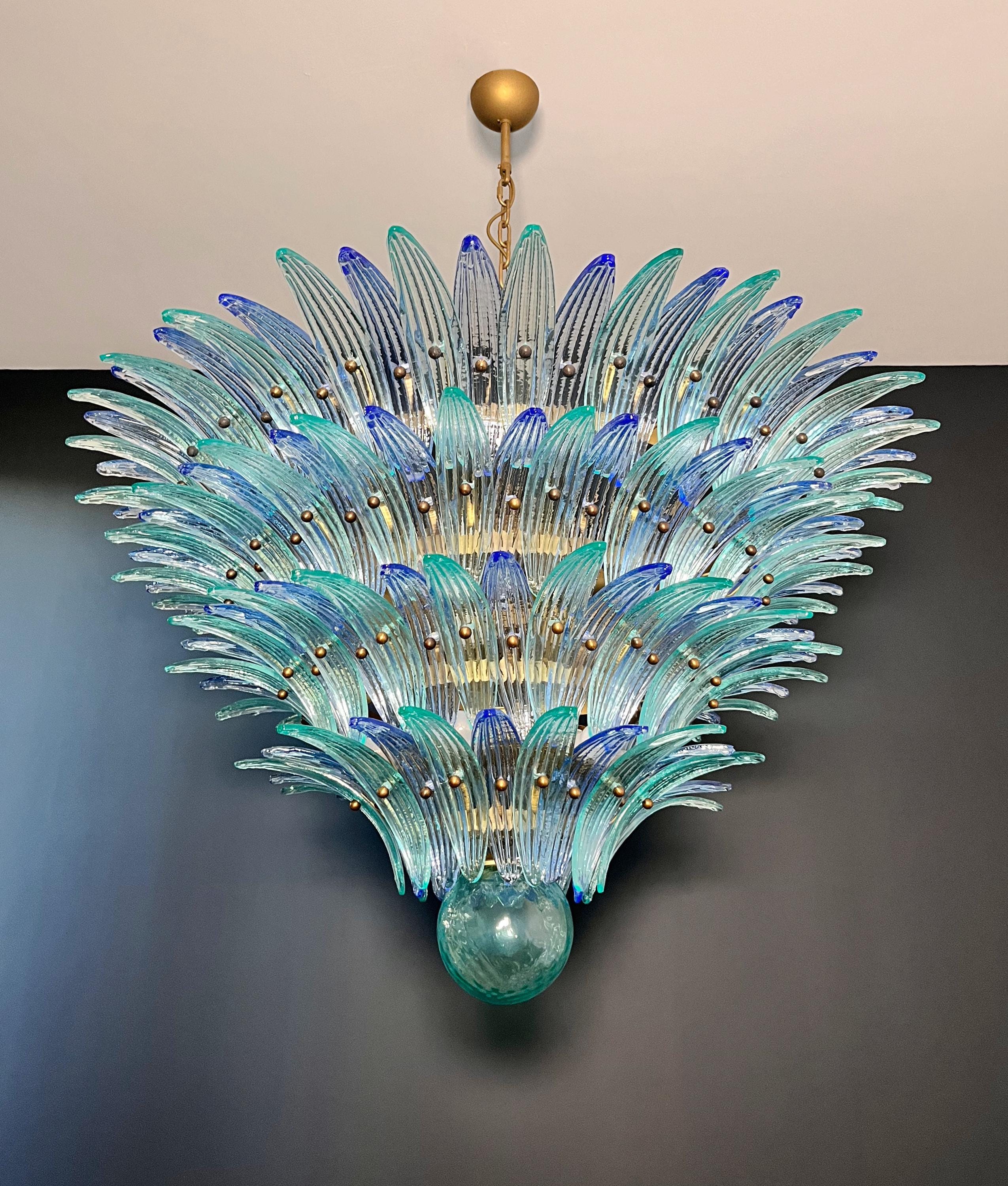 Palmette ceiling light made by 160 Murano blue and turquoise glasses in a gold metal frame. Murano blown glass in a traditional way. Structure in gold colored metal.