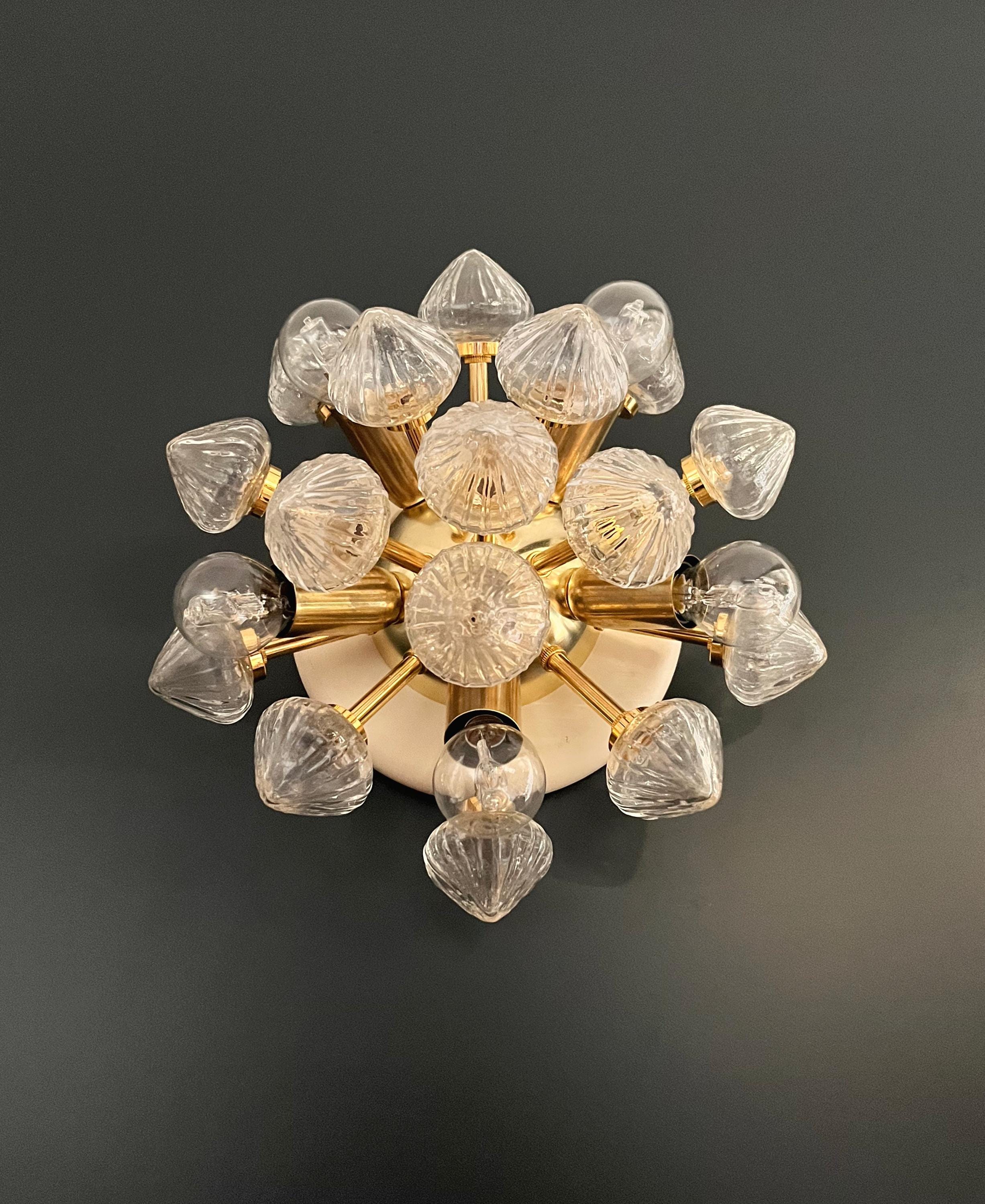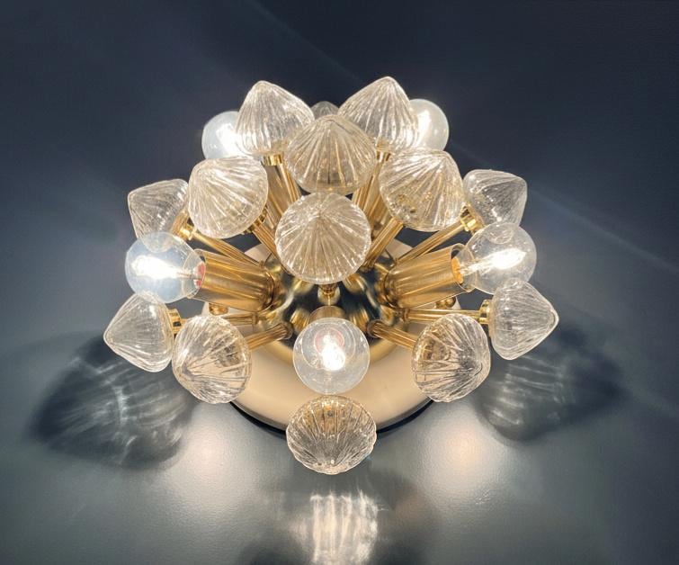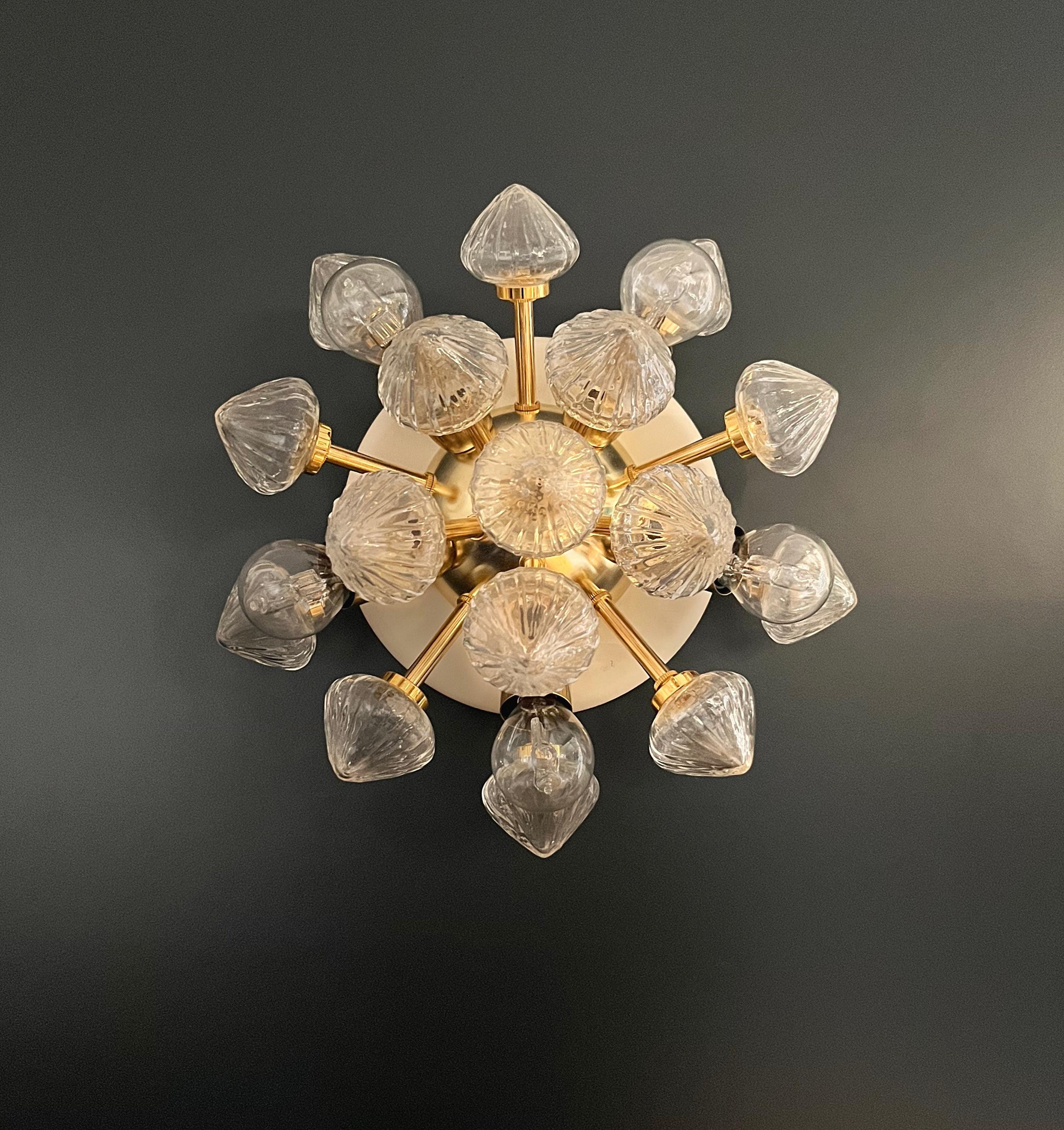 Comprising a central circular structure in white or ivory, from which slender, polished brass arms radiate symmetrically, each arm culminating in a solid, transparent glass onions, made of exceptionally high-quality glass.