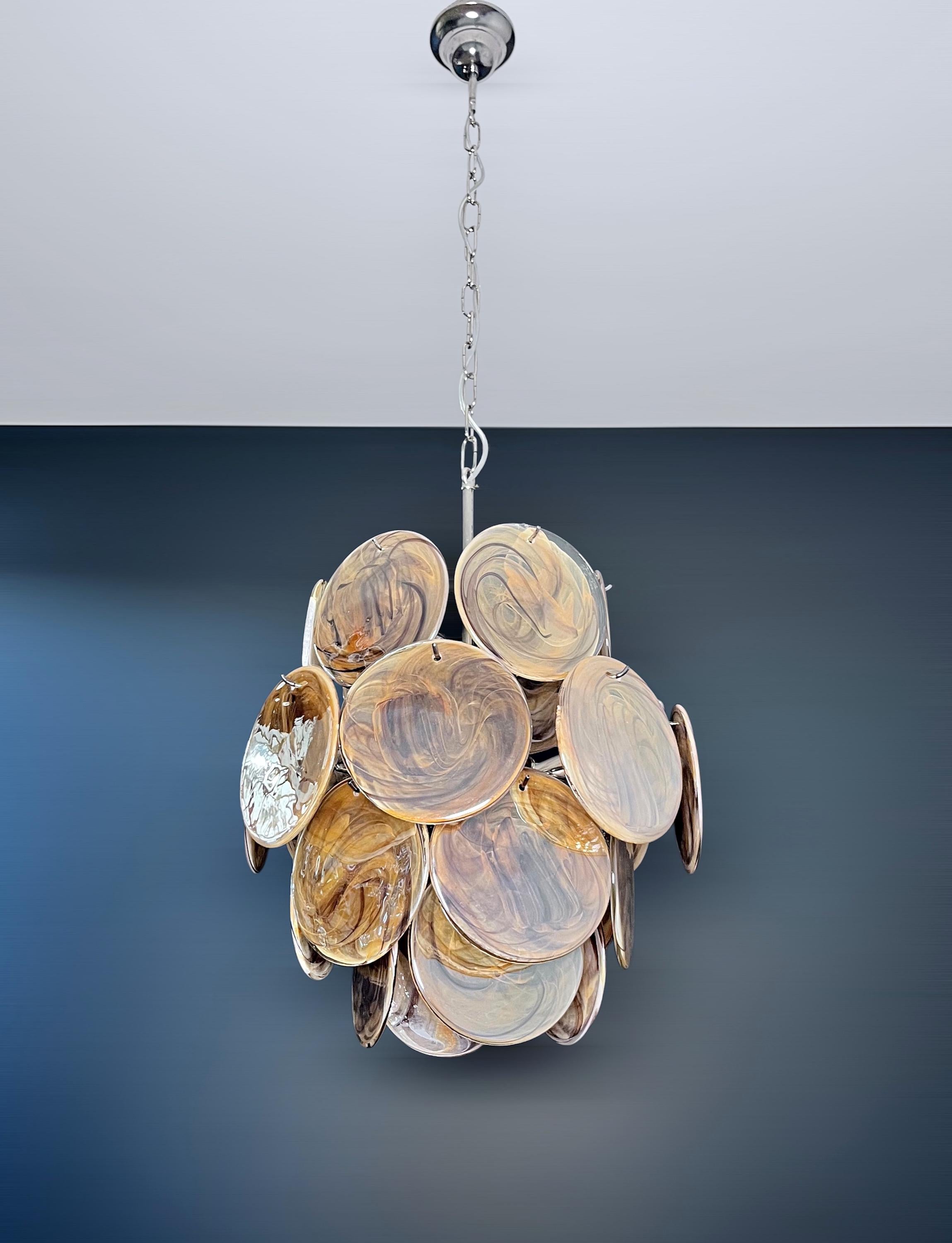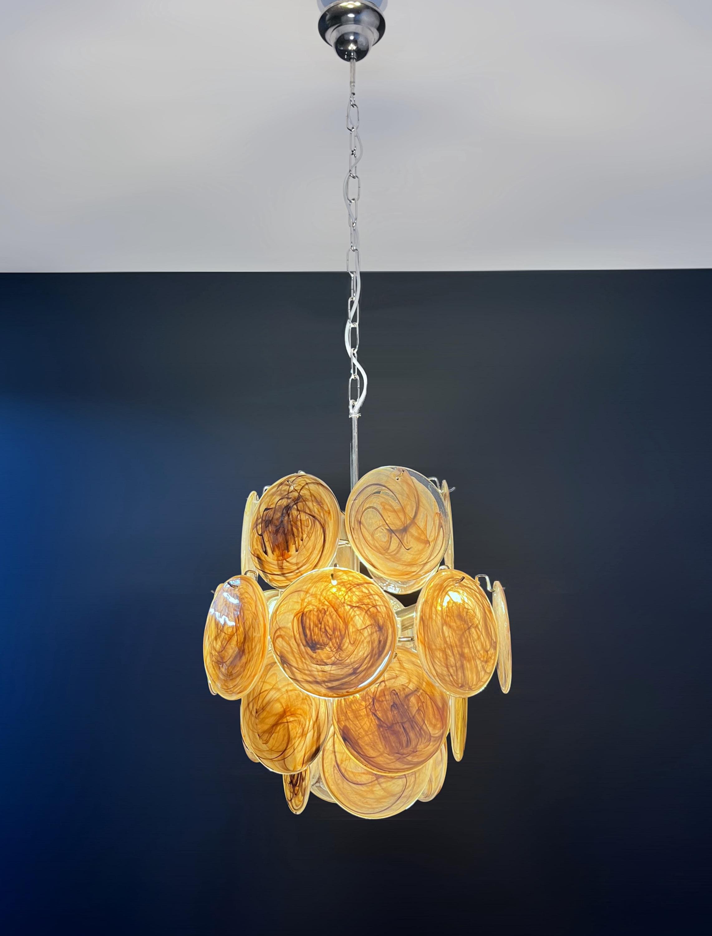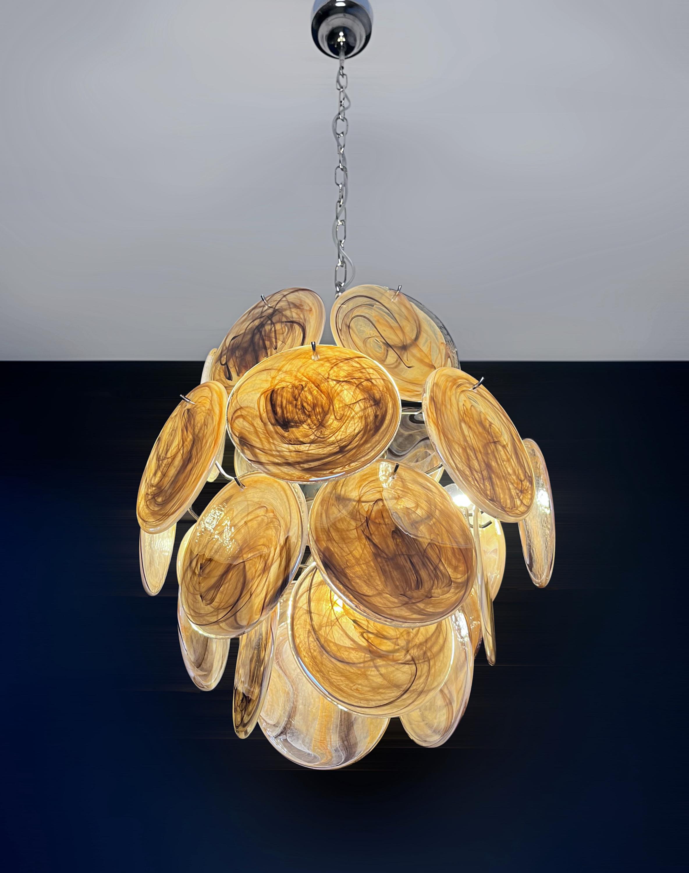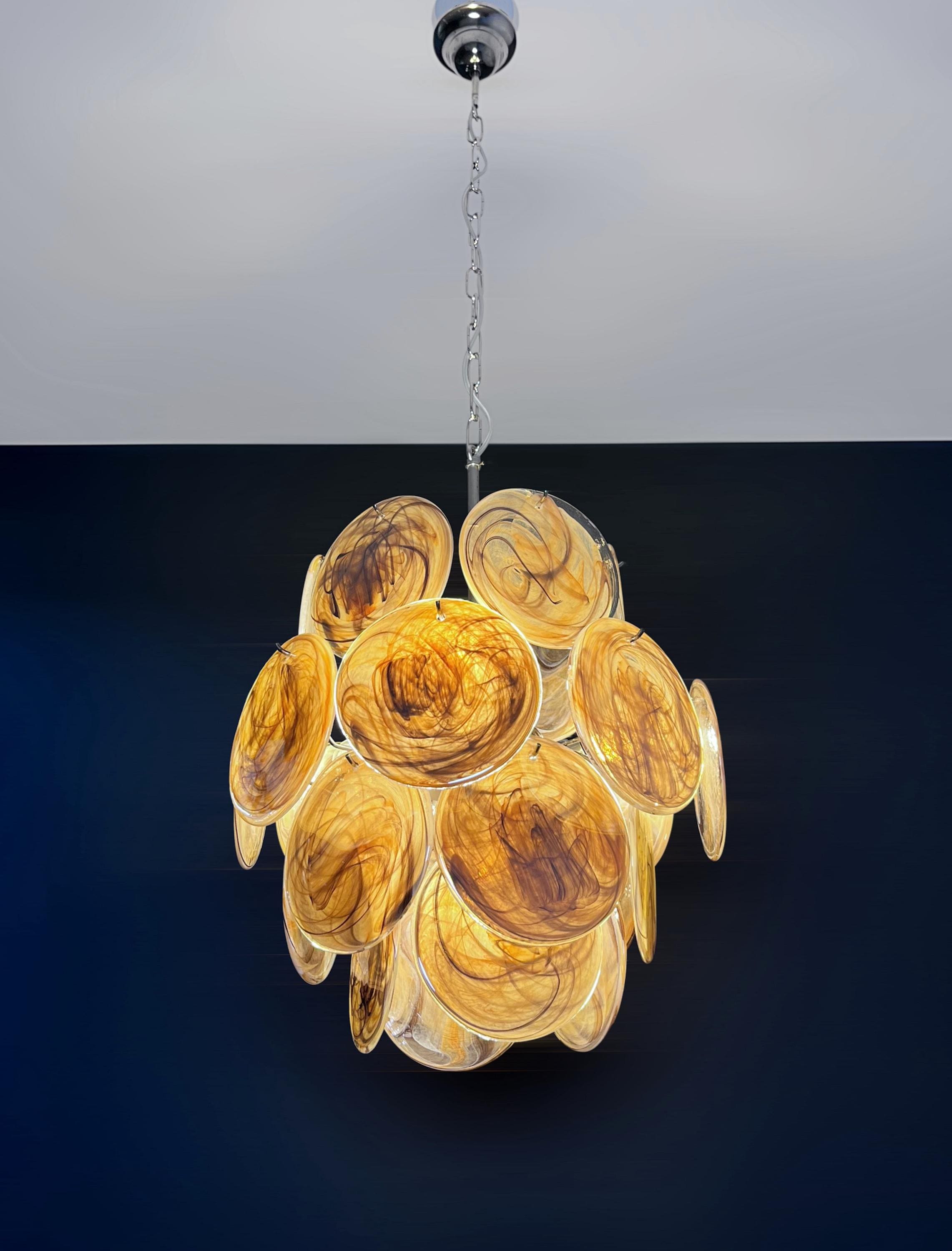 Vintage Italian Murano chandelier in Vistosi style. The chandelier has 24 fantastic amber black albaster glasses in a nickel metal frame.