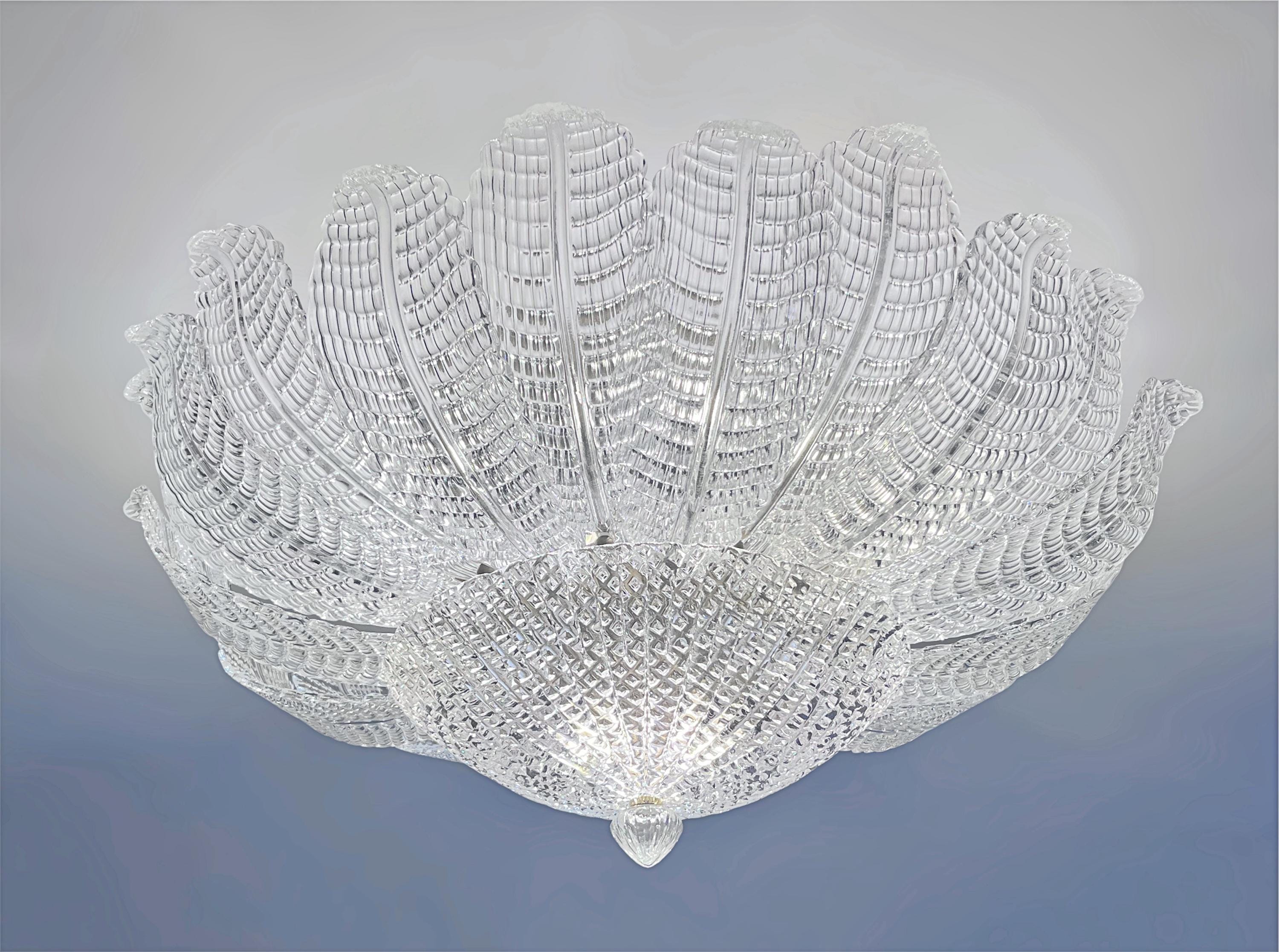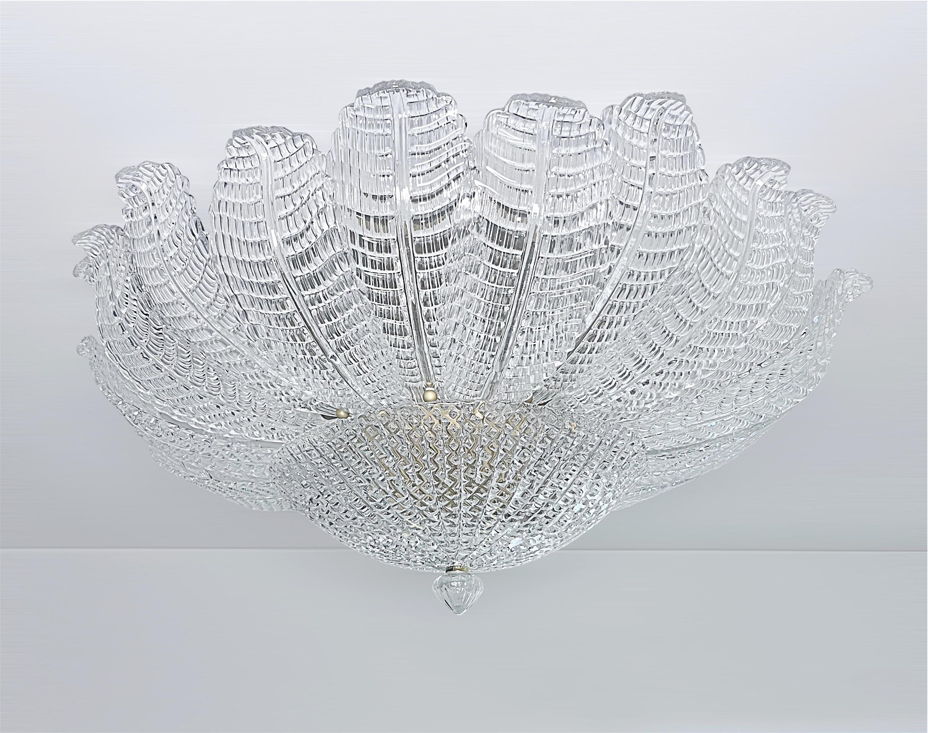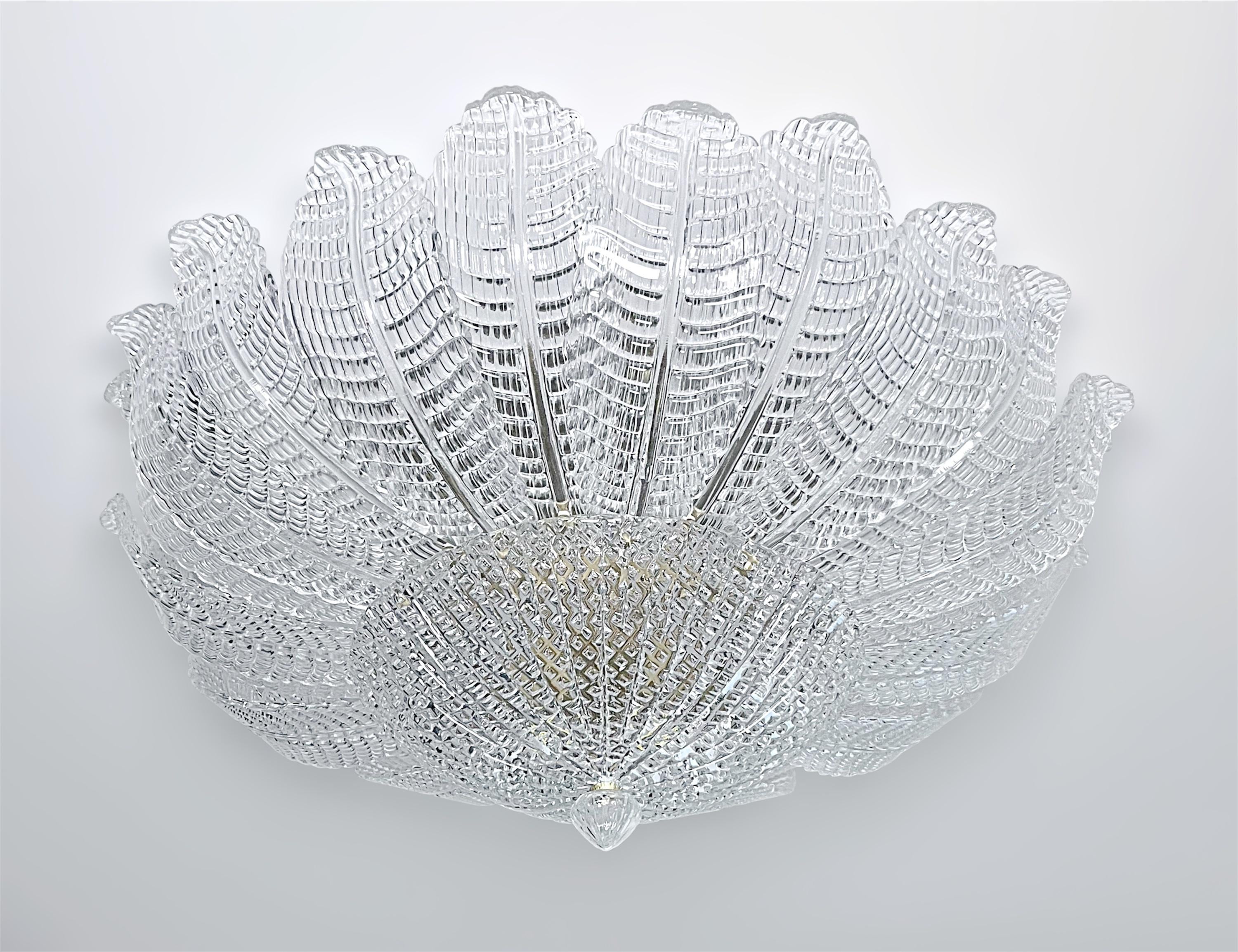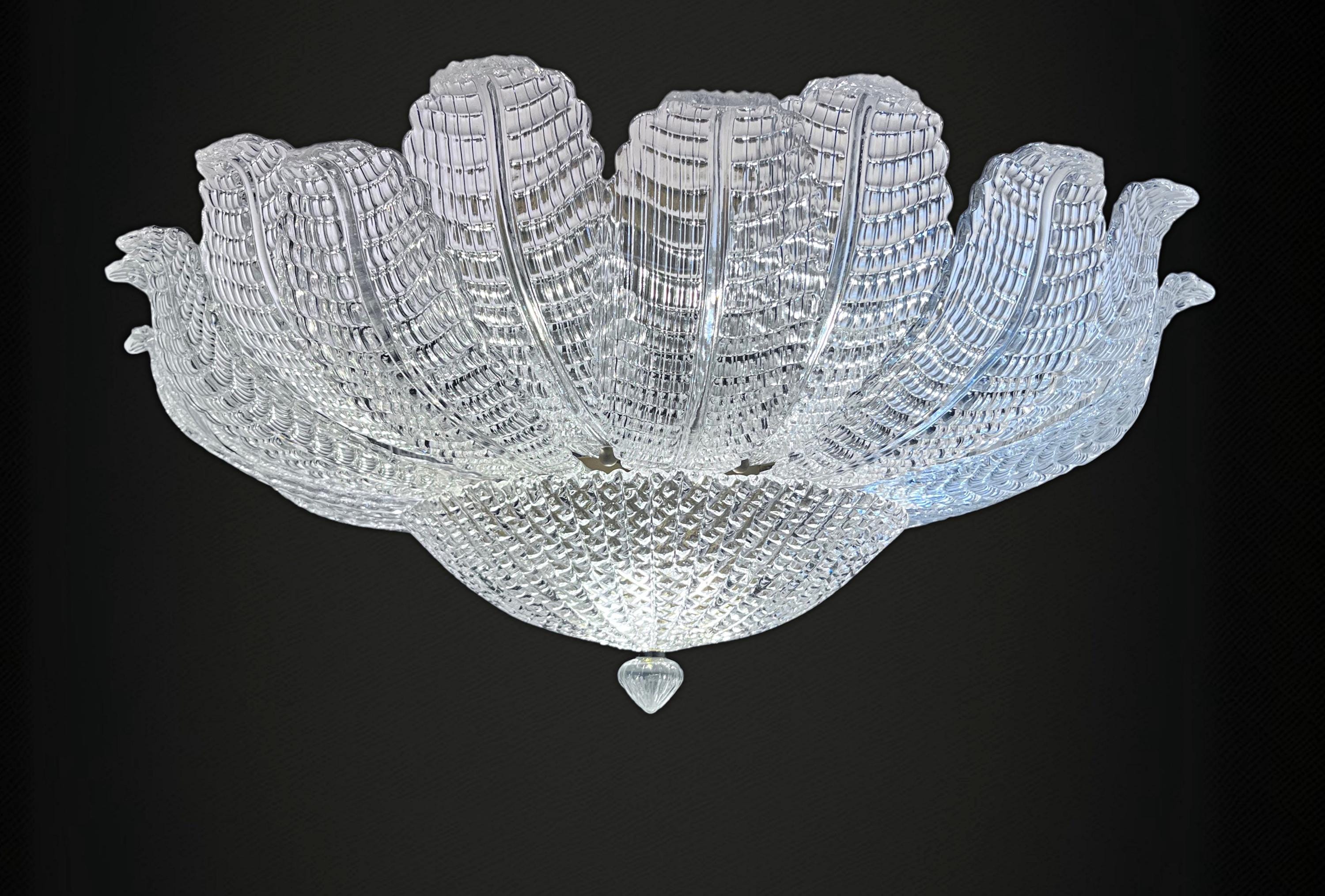 Fantastic and fabulous of vintage Murano Italy art glass ceiling light. The rare lamp is made of 24 mouth-blown hand-formed leaf-form clear glass panels plus a huge glass as a bottom.This beauty has the look of a precious big flower. Especially when lit it gives a warm glow. The wiring is perfect, which has been replaced in recent time, so the lamp is in fine working order. All glass parts are in excellent original condition with no cracks or repairs. This awesome and valuable ceiling lamp is an eyecatcher, an upgrade and a perfect addition for any chic and noble interior. It will be shipped appropriately.