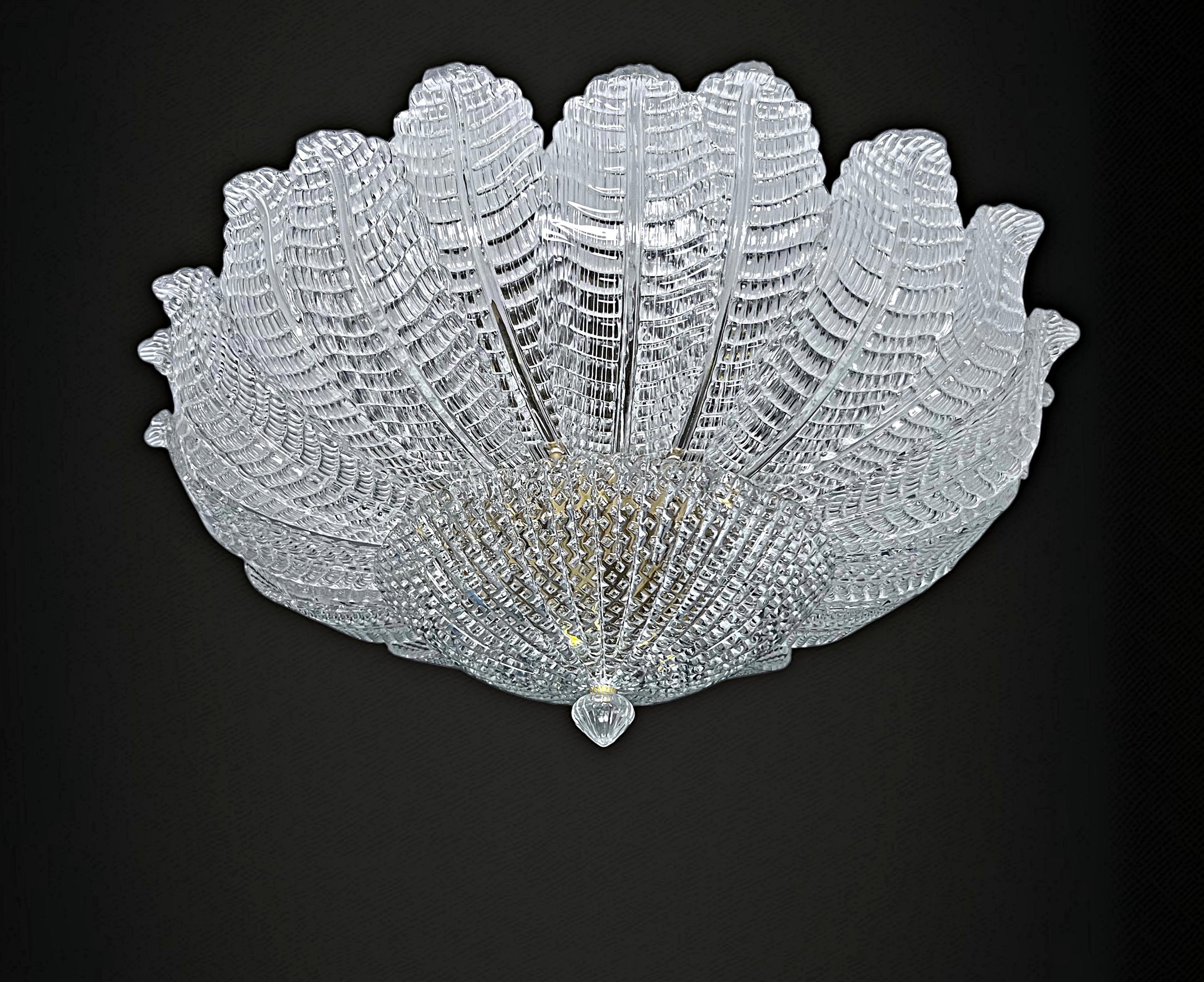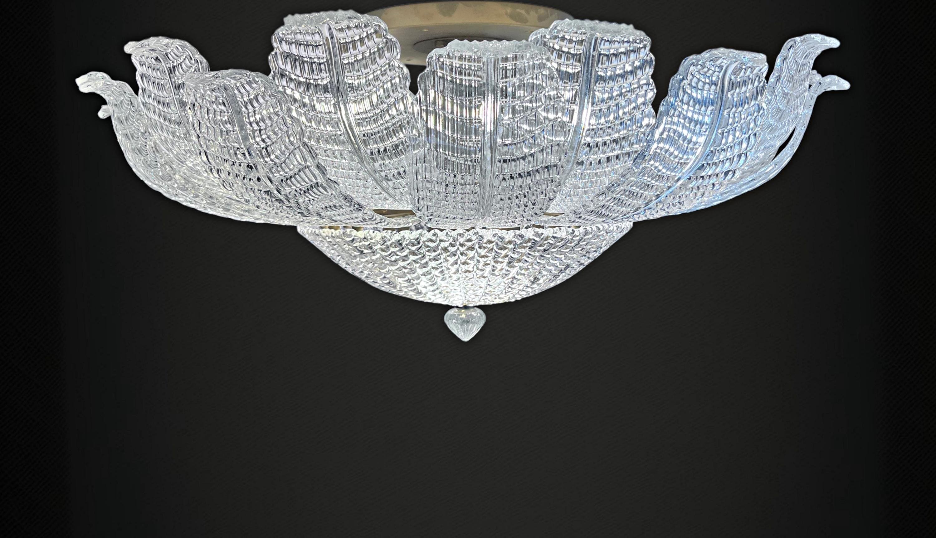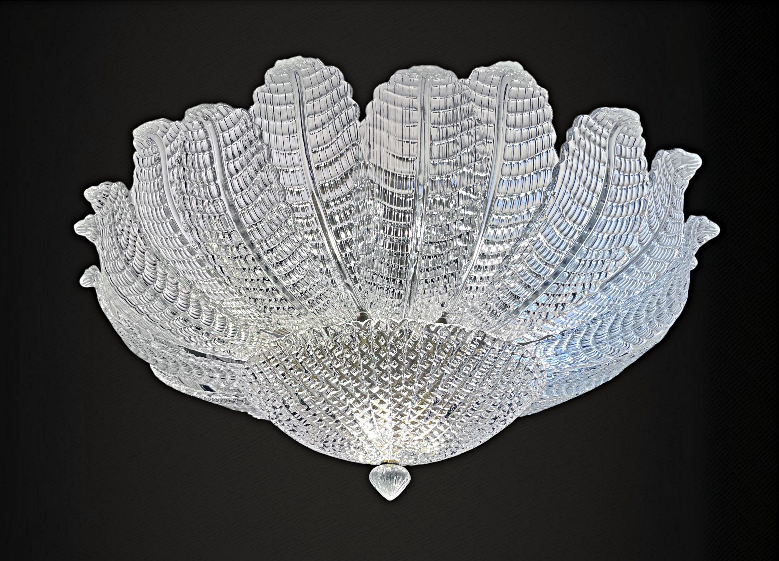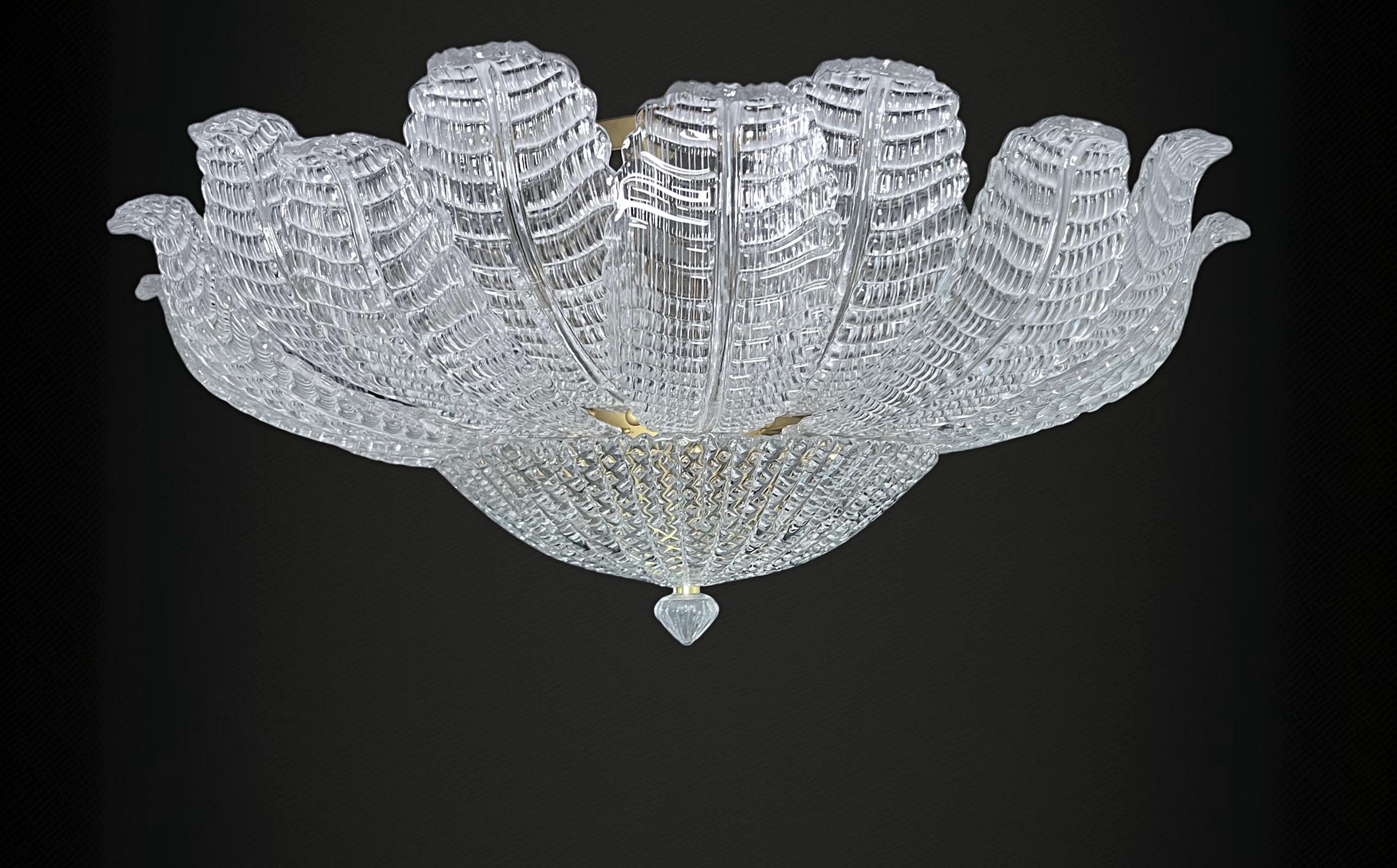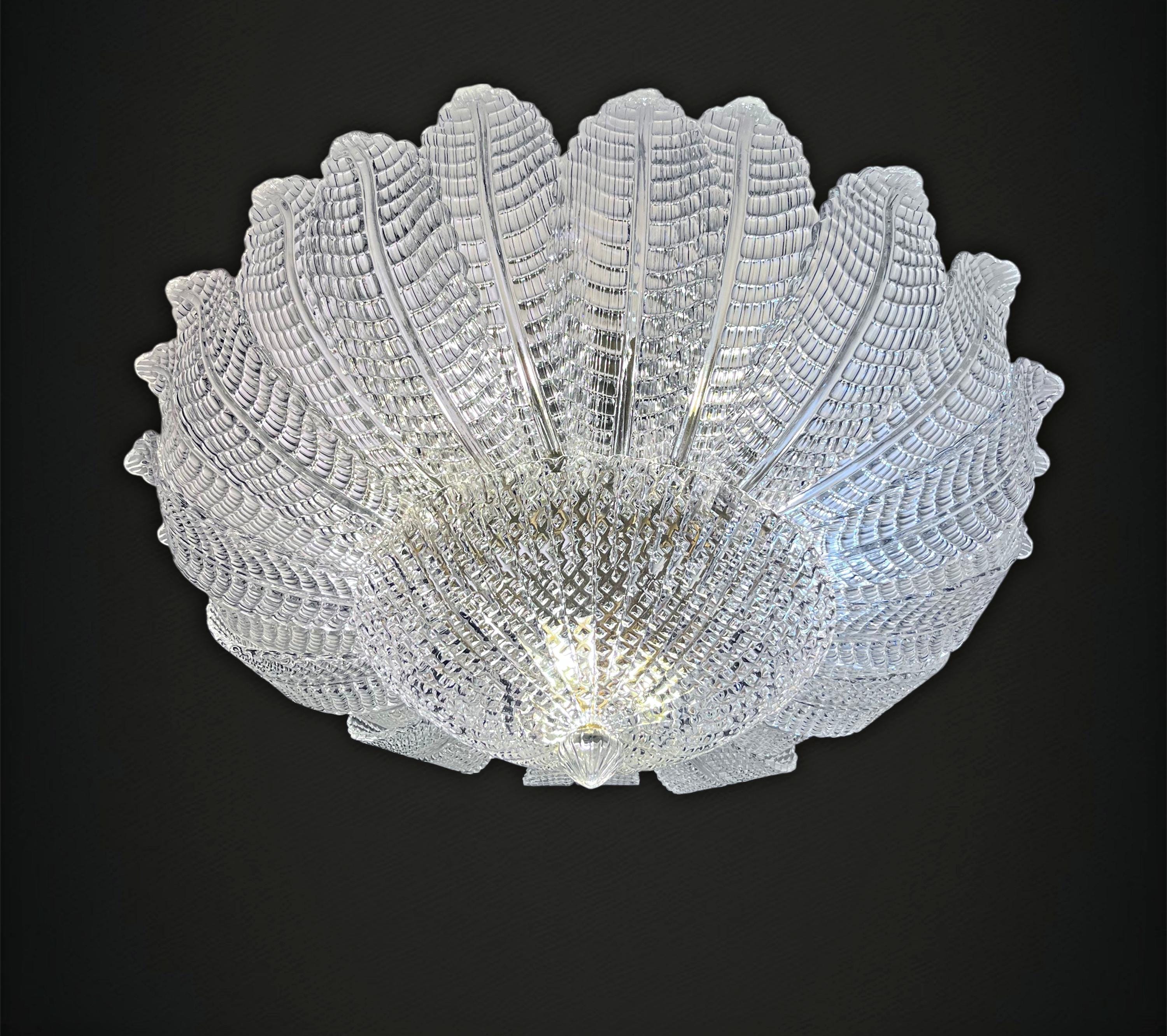 Fantastic and fabulous of vintage Murano Italy art glass ceiling light. The rare lamp is made of 24 mouth-blown hand-formed leaf-form clear glass panels plus a huge glass as a bottom.This beauty has the look of a precious big flower. Especially when lit it gives a warm glow. The wiring is perfect, which has been replaced in recent time, so the lamp is in fine working order. All glass parts are in excellent original condition with no cracks or repairs. This awesome and valuable ceiling lamp is an eyecatcher, an upgrade and a perfect addition for any chic and noble interior. It will be shipped appropriately.