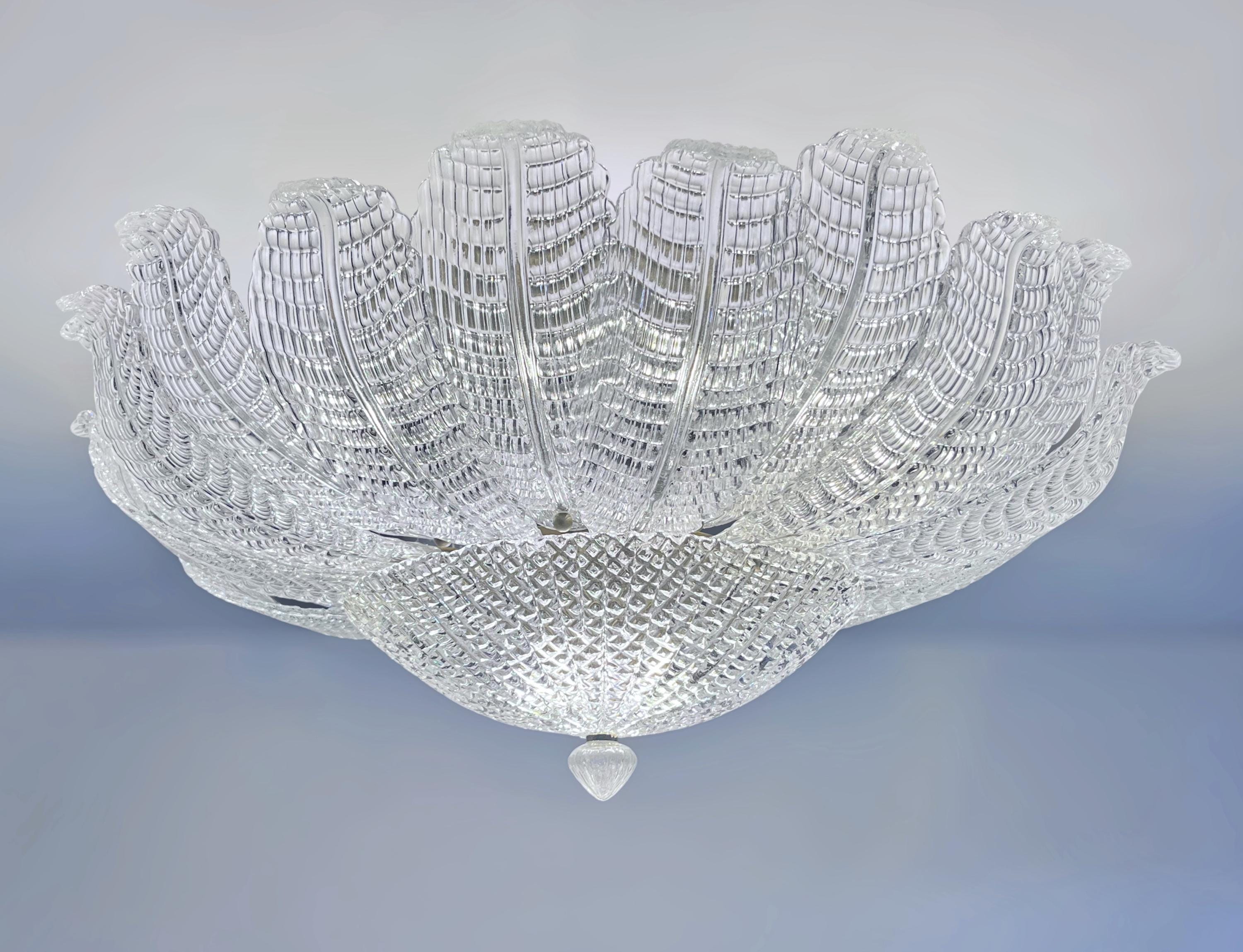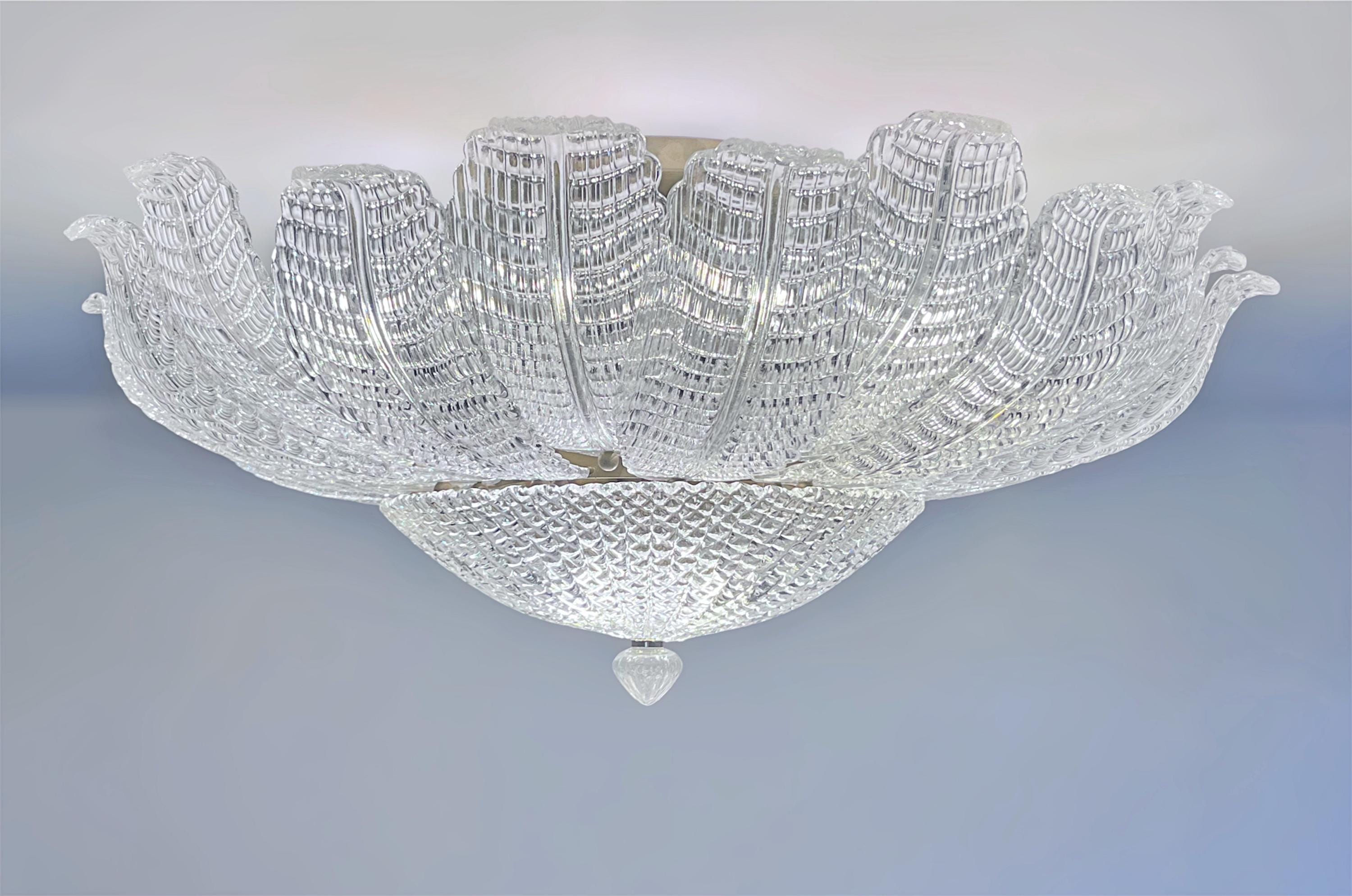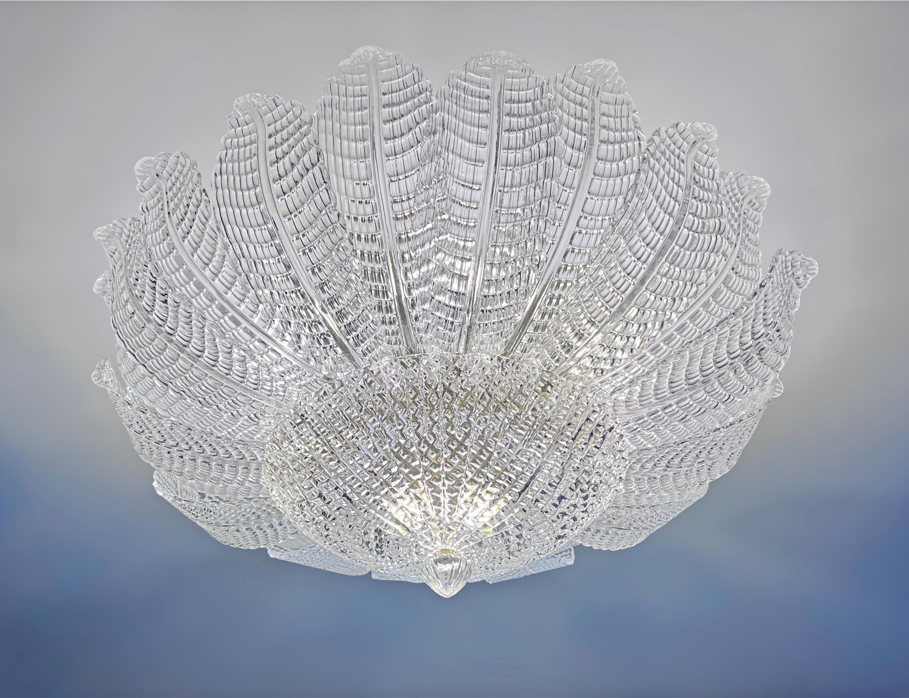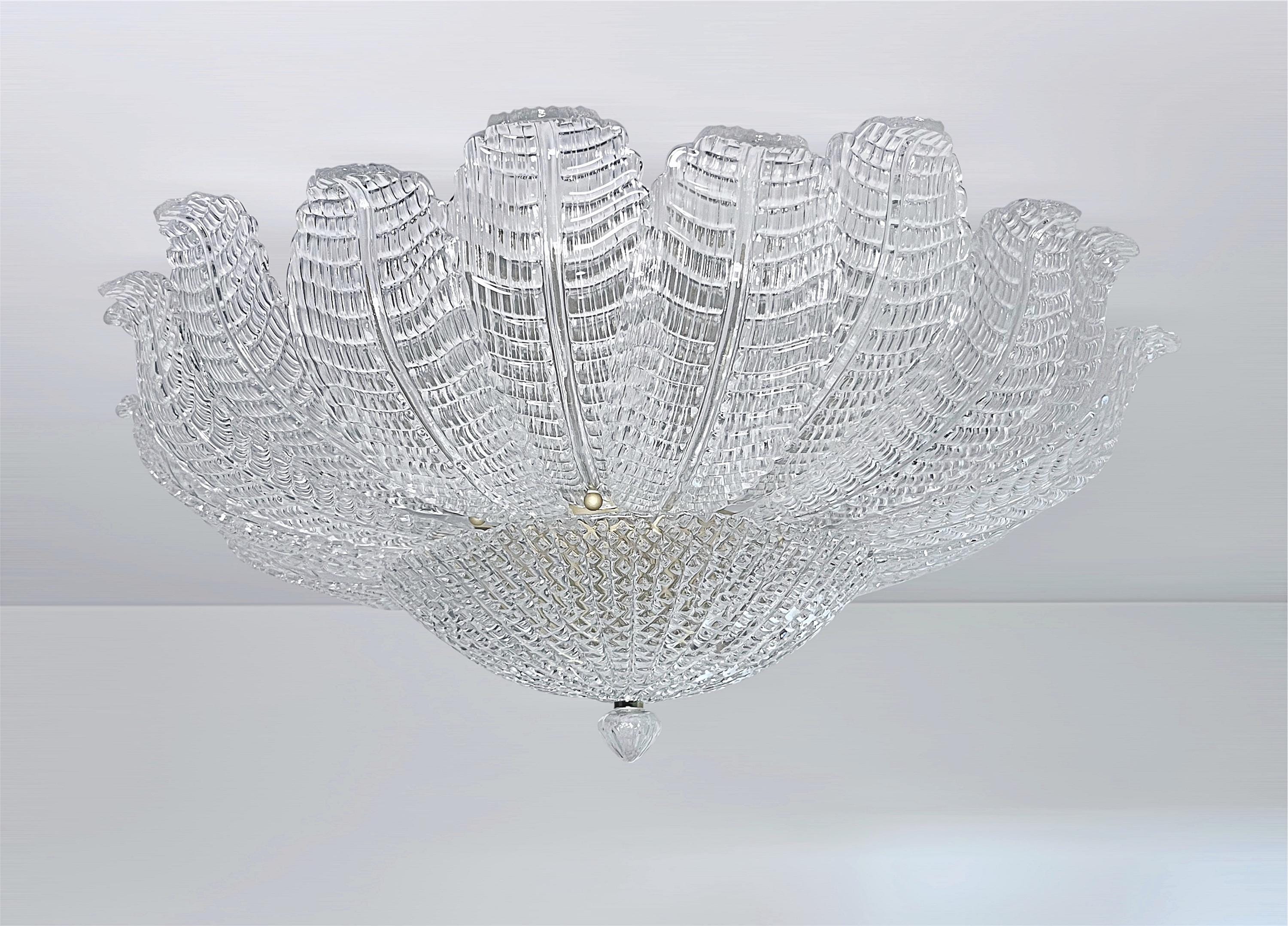 Fantastic and fabulous of vintage Murano Italy art glass ceiling light. The rare lamp is made of 24 mouth-blown hand-formed leaf-form clear glass panels plus a huge glass as a bottom.This beauty has the look of a precious big flower. Especially when lit it gives a warm glow. The wiring is perfect, which has been replaced in recent time, so the lamp is in fine working order. All glass parts are in excellent original condition with no cracks or repairs. This awesome and valuable ceiling lamp is an eyecatcher, an upgrade and a perfect addition for any chic and noble interior. It will be shipped appropriately.