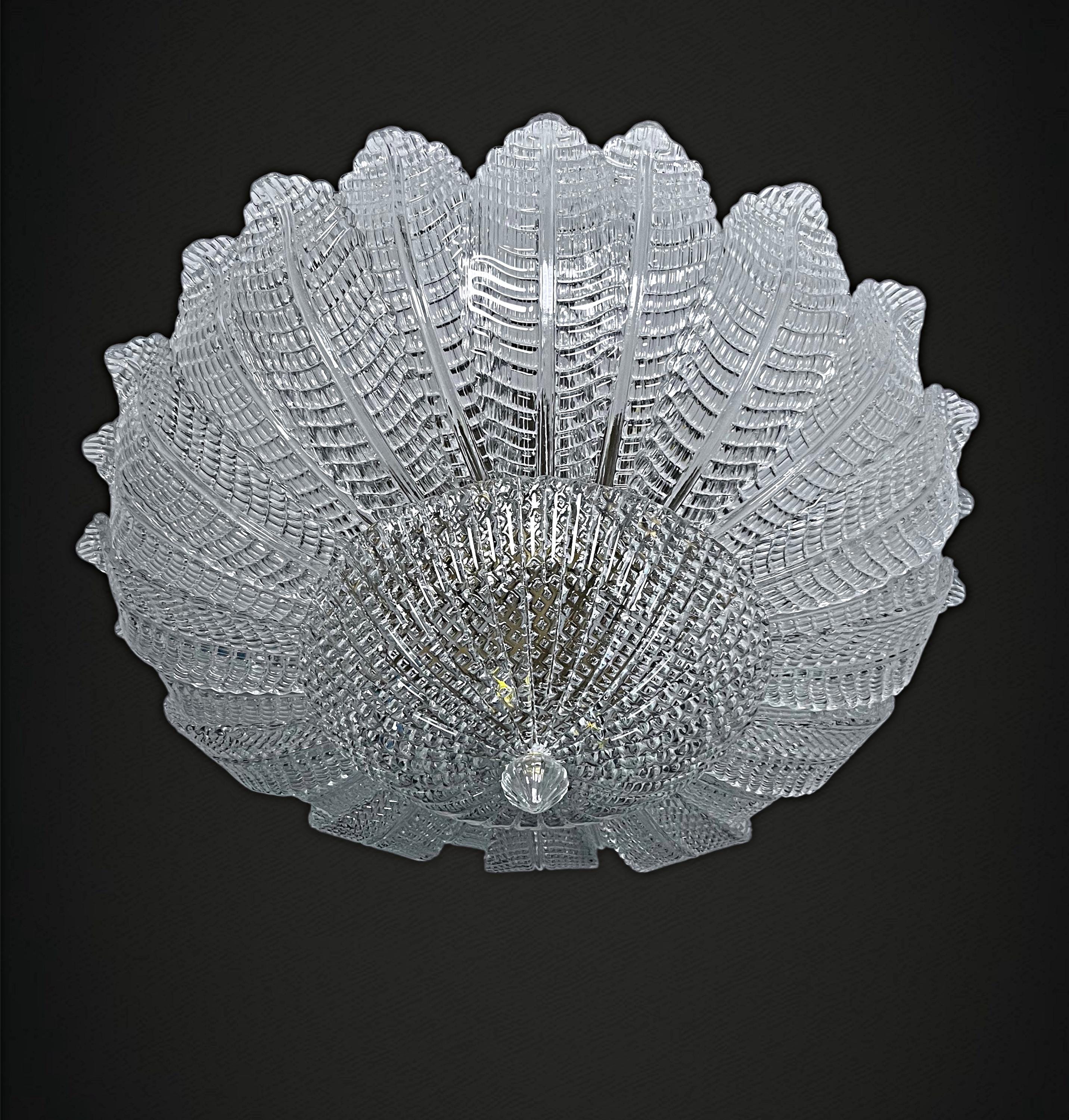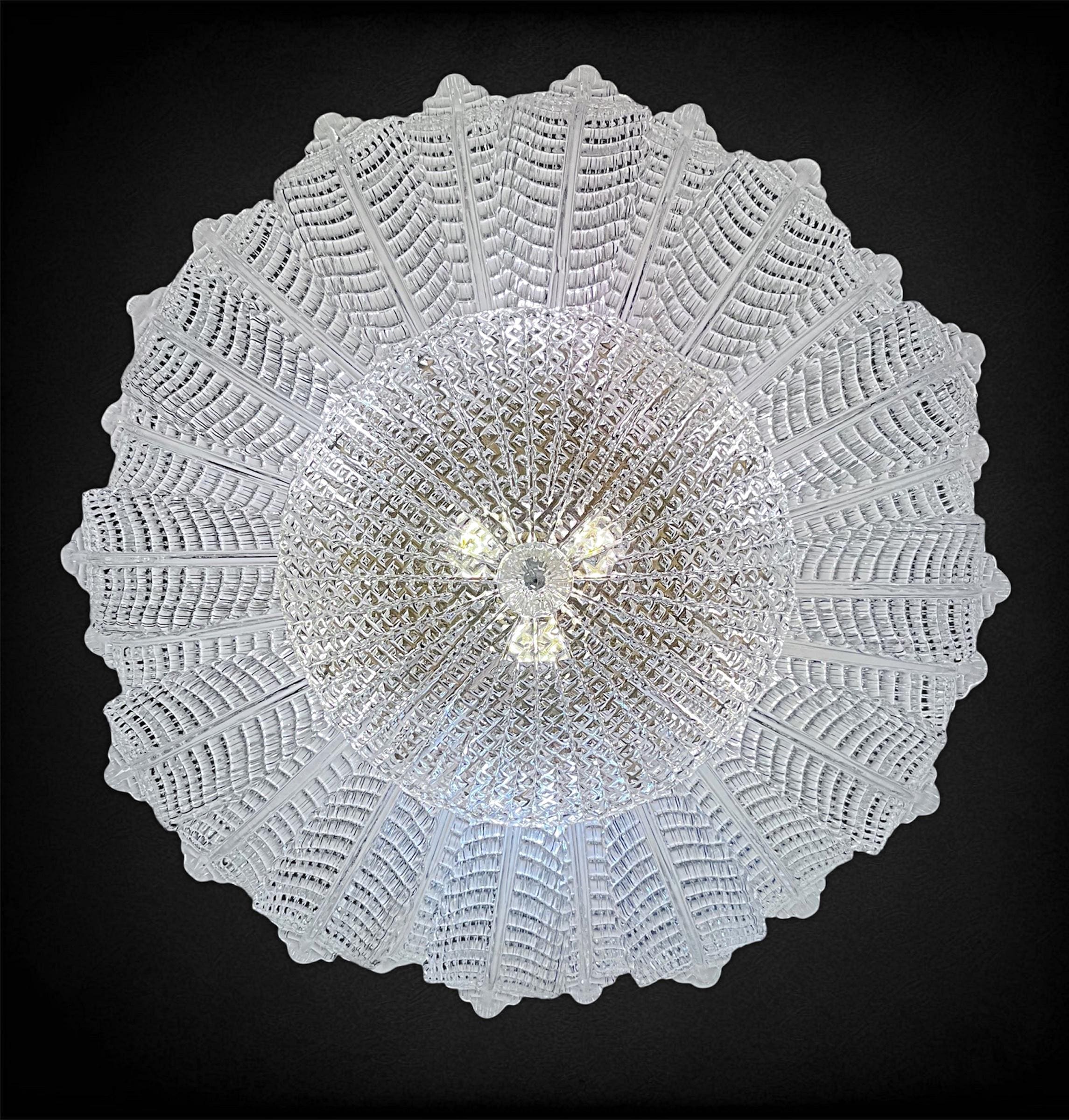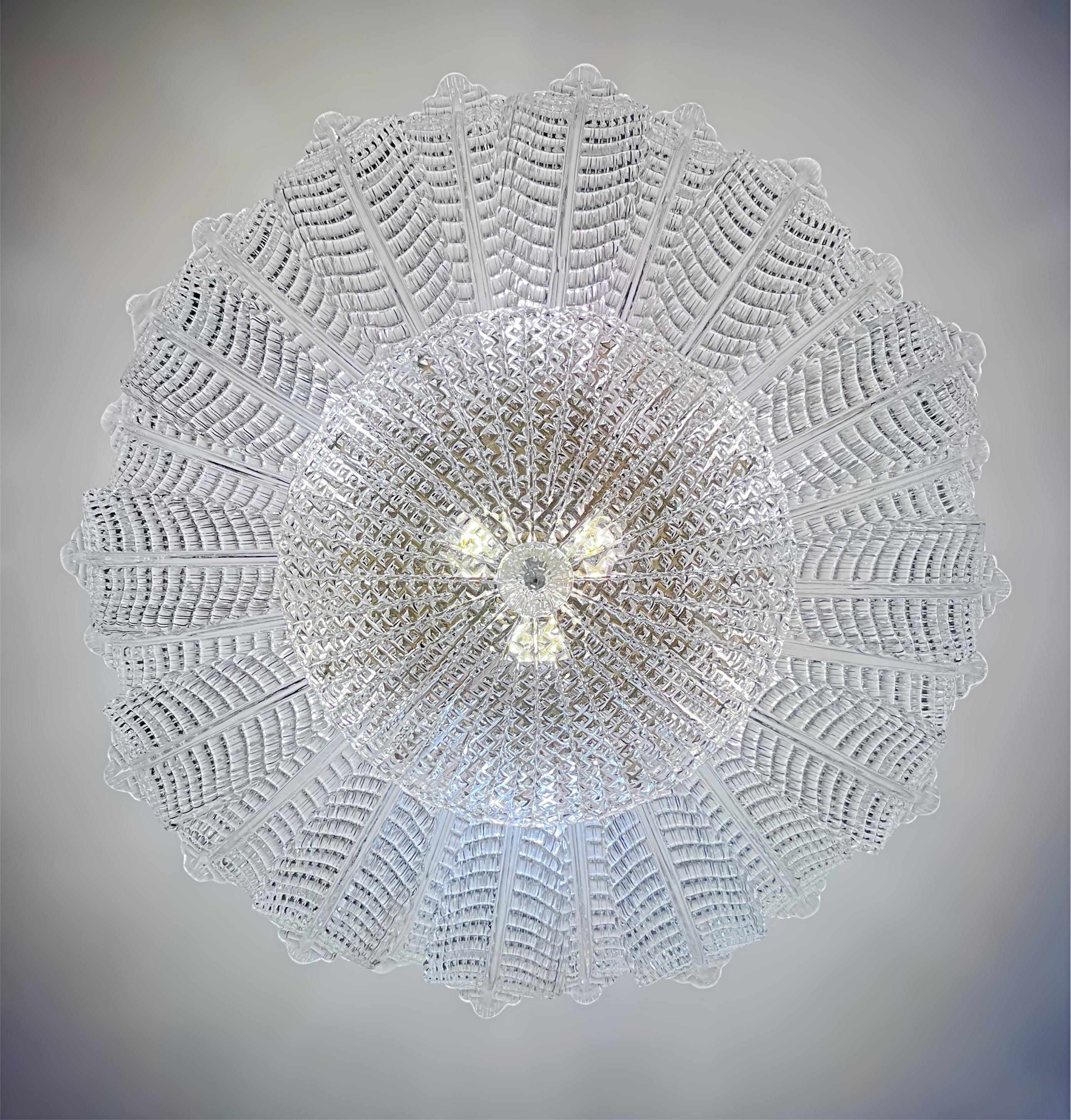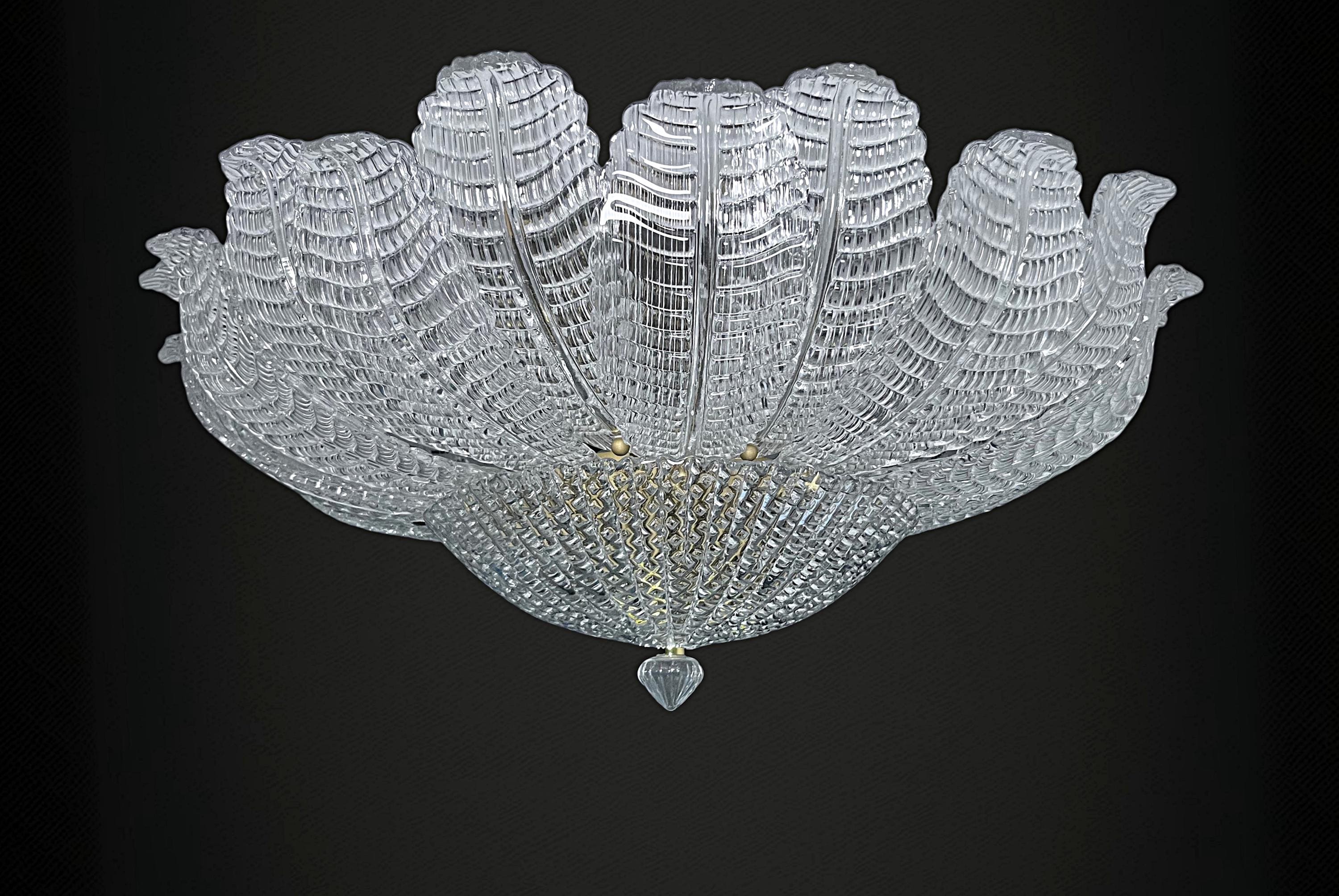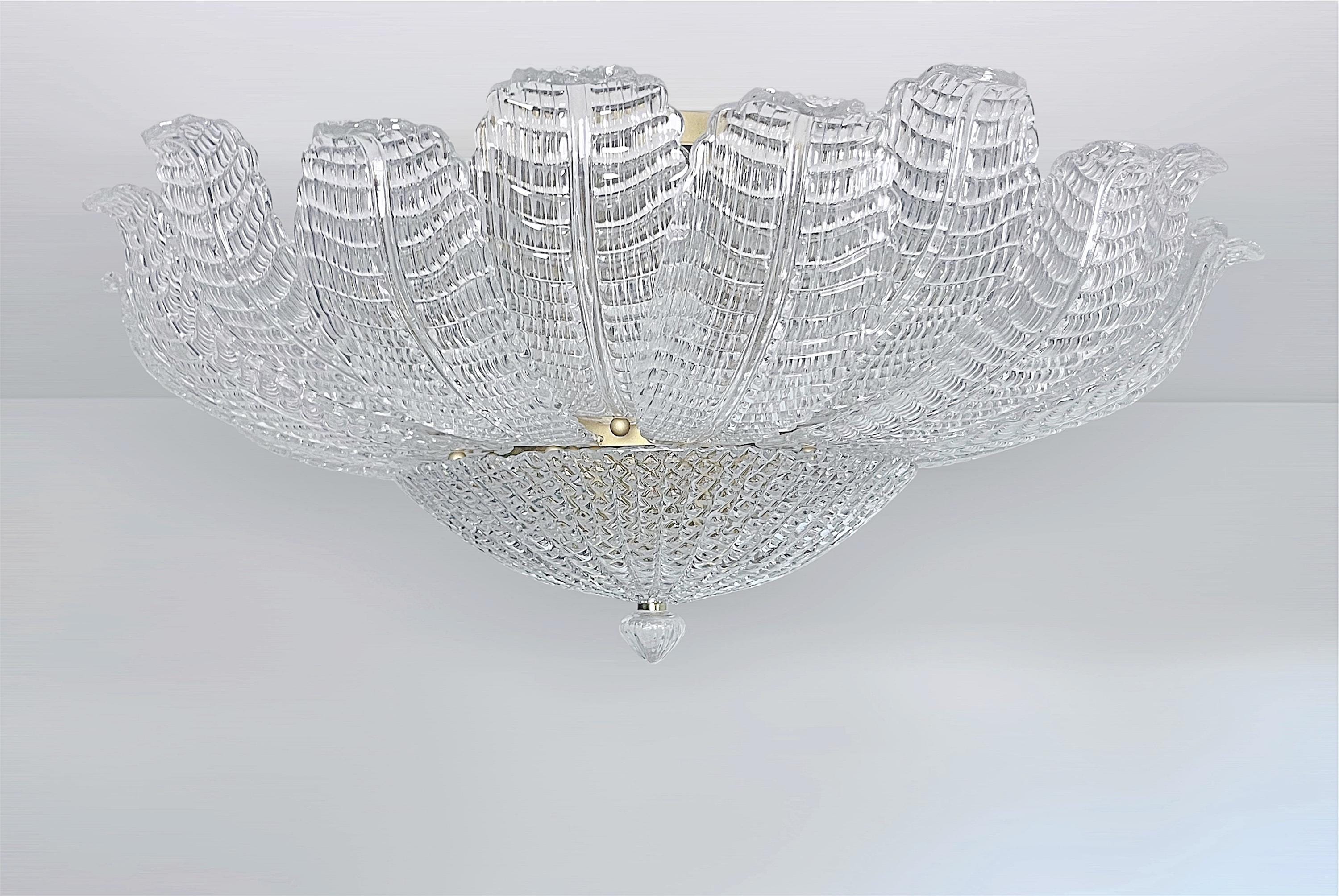 Fantastic and fabulous of vintage Murano Italy art glass ceiling light. The rare lamp is made of 24 mouth-blown hand-formed leaf-form clear glass panels plus a huge glass as a bottom.This beauty has the look of a precious big flower. Especially when lit it gives a warm glow. The wiring is perfect, which has been replaced in recent time, so the lamp is in fine working order. All glass parts are in excellent original condition with no cracks or repairs. This awesome and valuable ceiling lamp is an eyecatcher, an upgrade and a perfect addition for any chic and noble interior. It will be shipped appropriately.