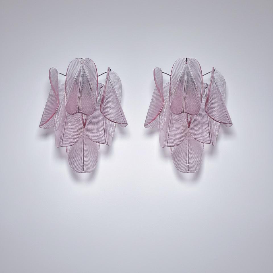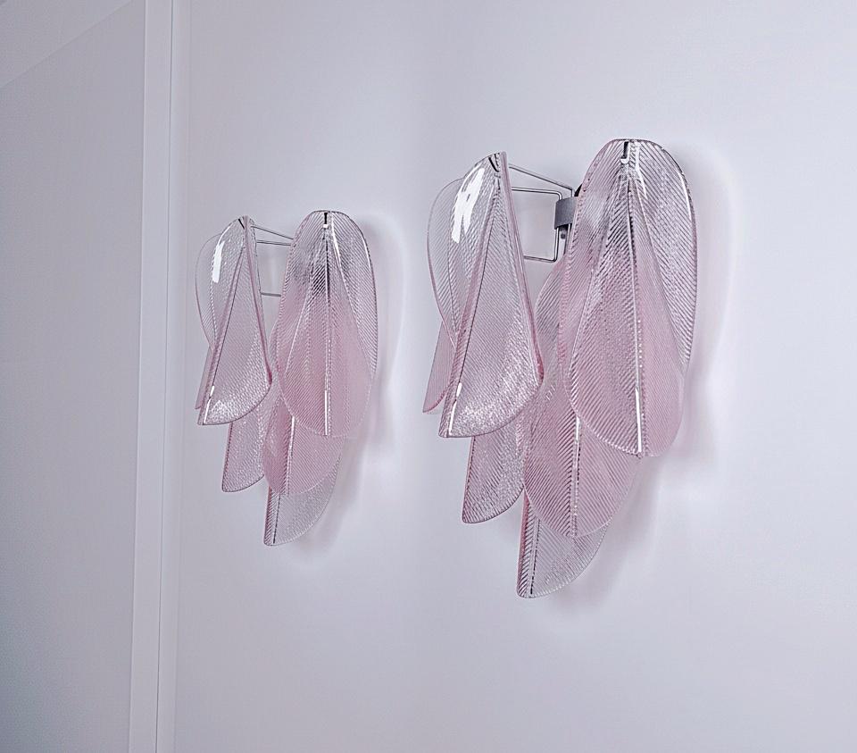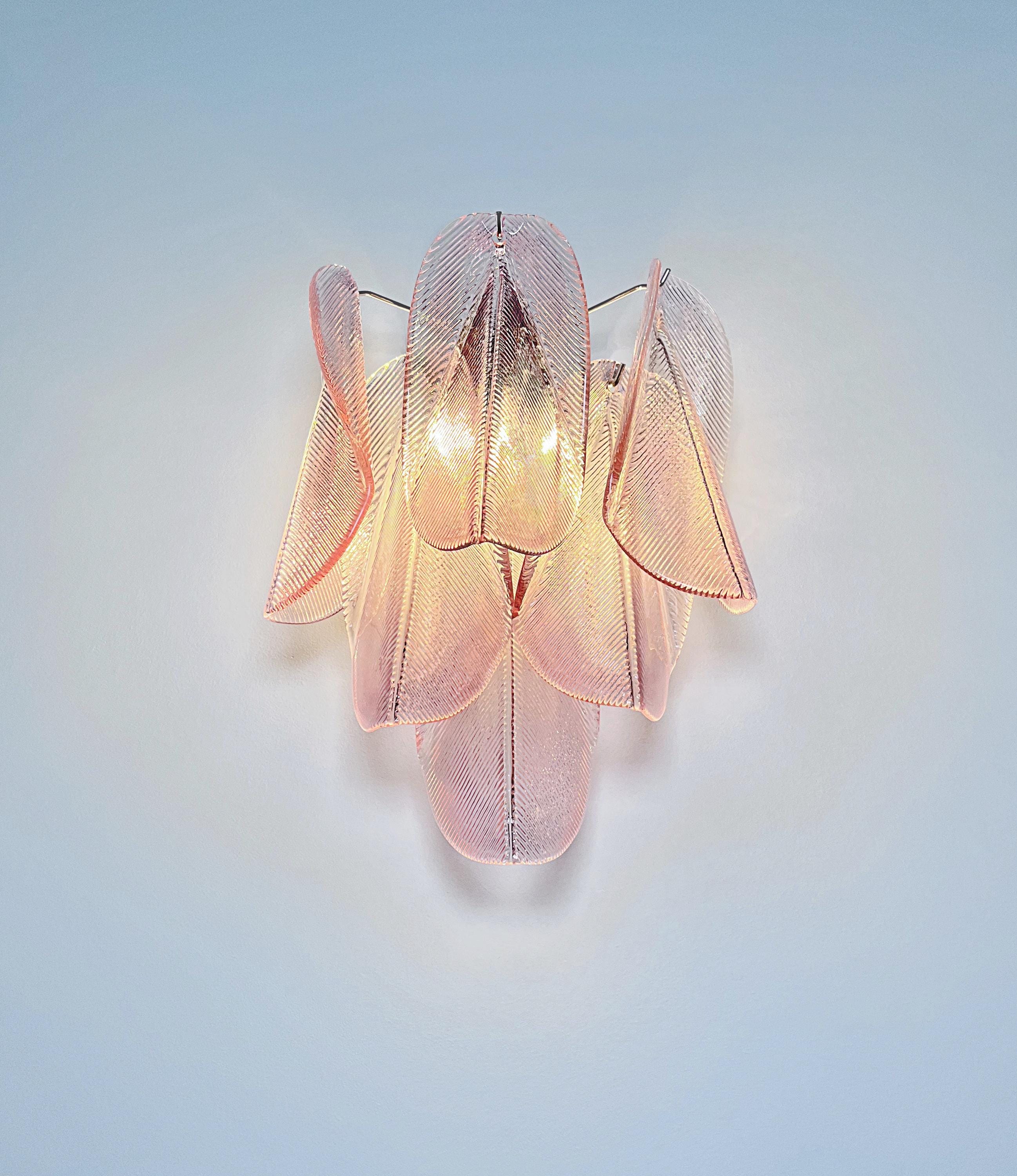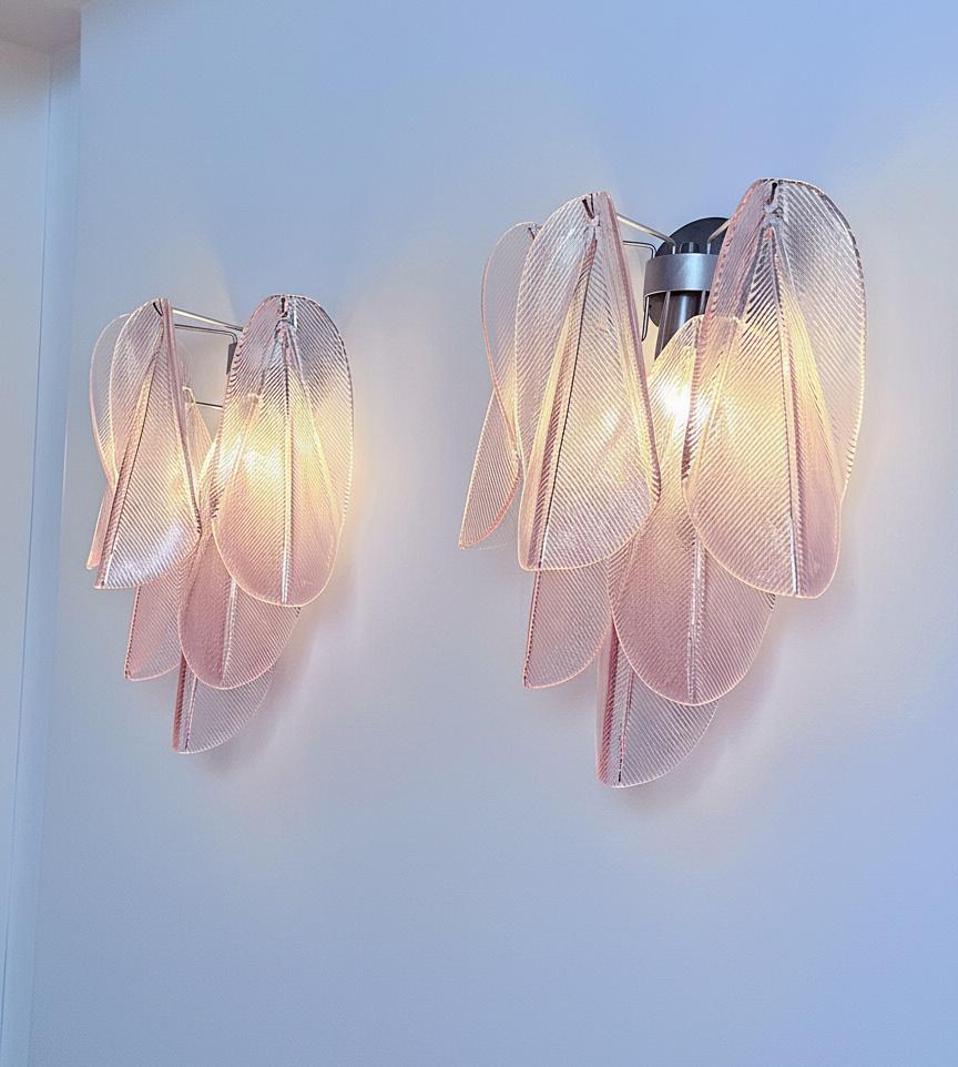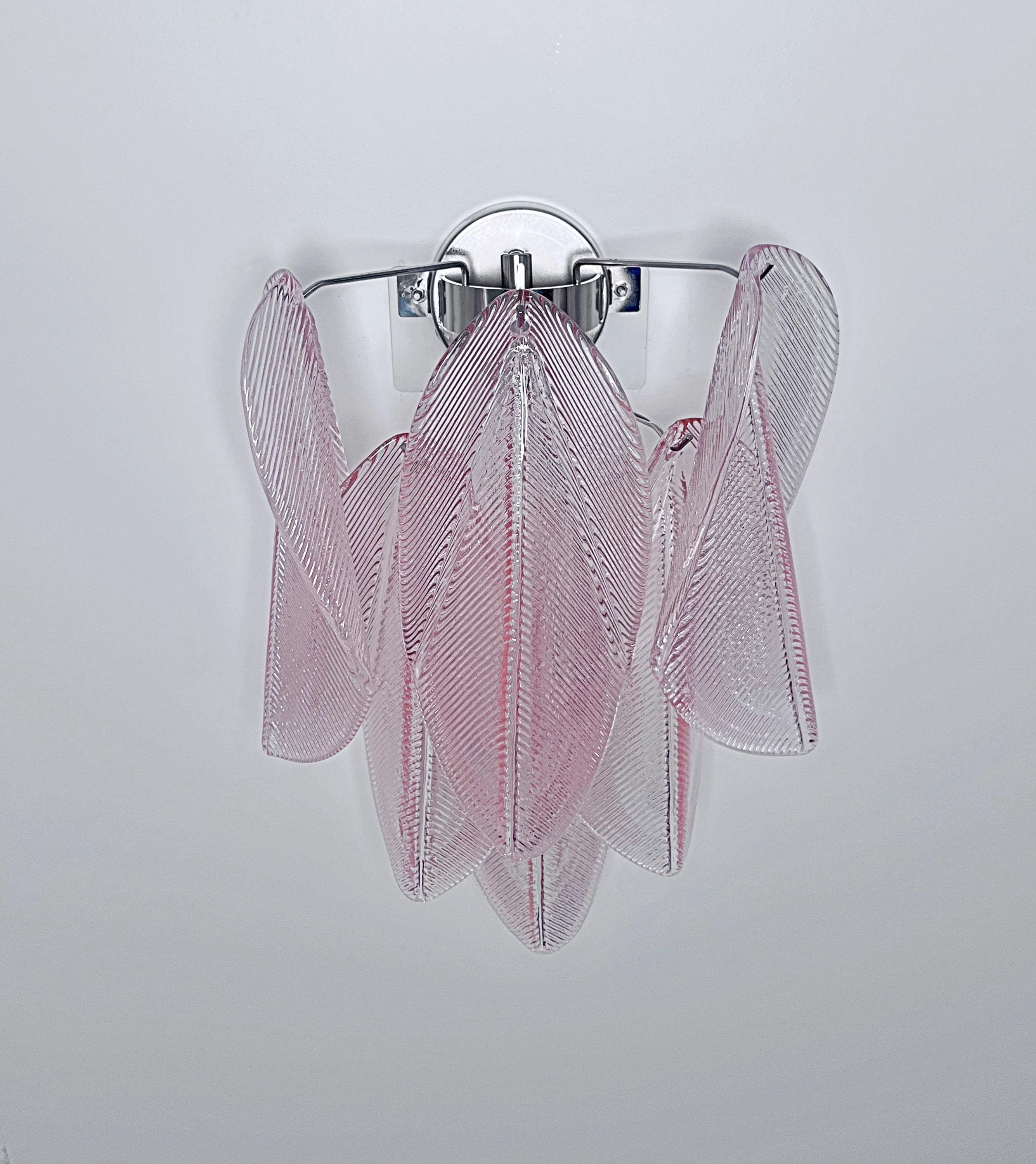 Pair of Vintage Italian Murano appliques in the manner of Mazzega. Wall lights have 6 glass petals "swallows" (pink) in a chrome frame.