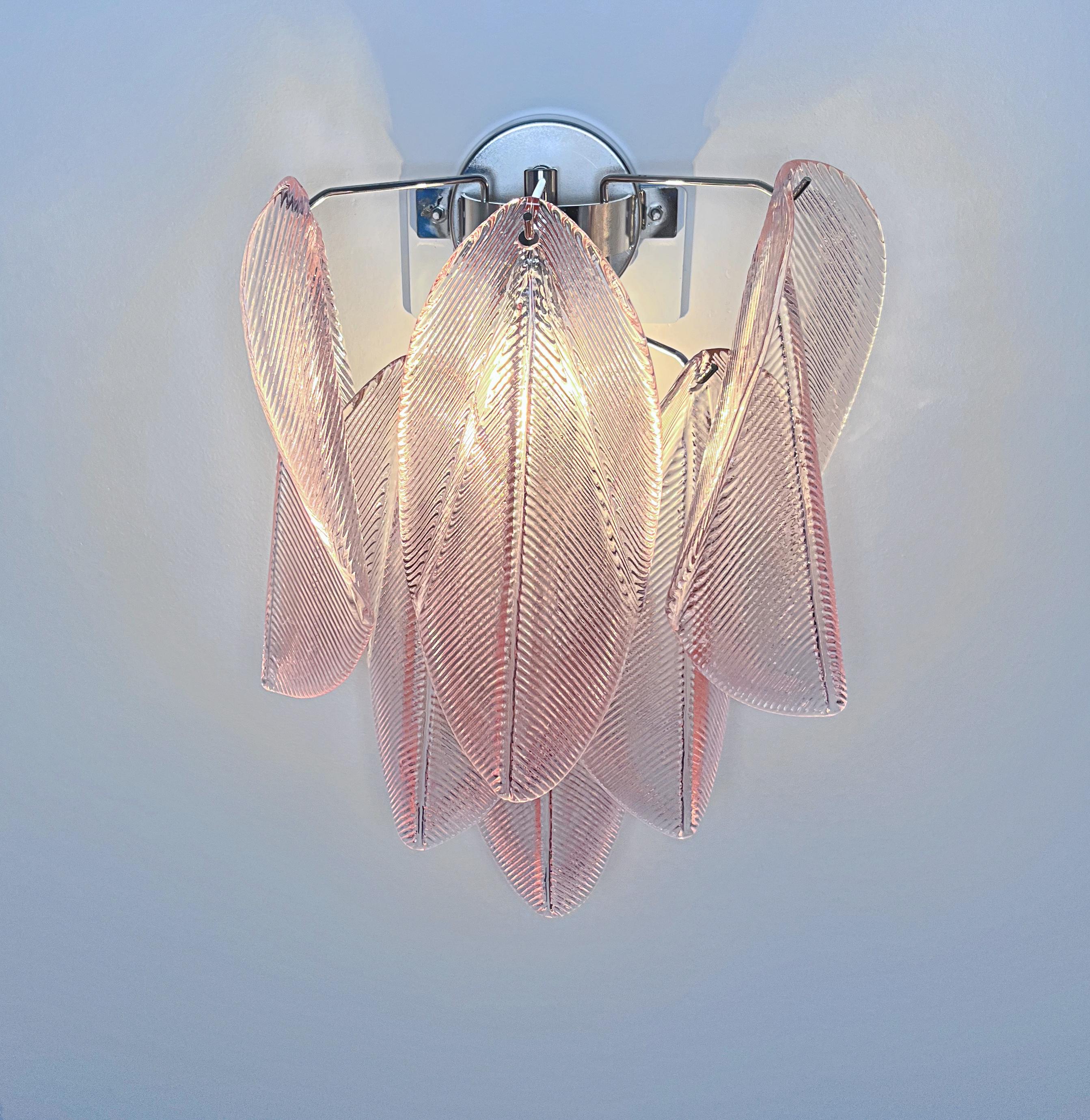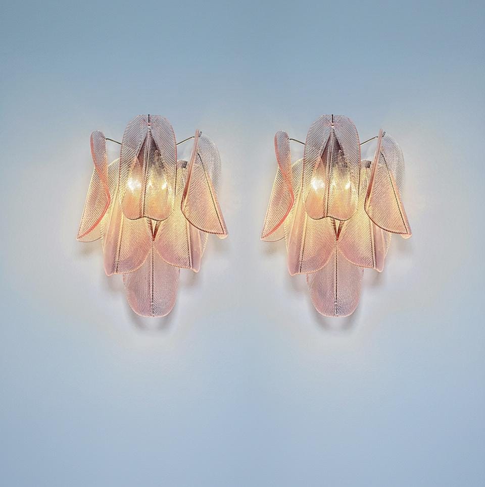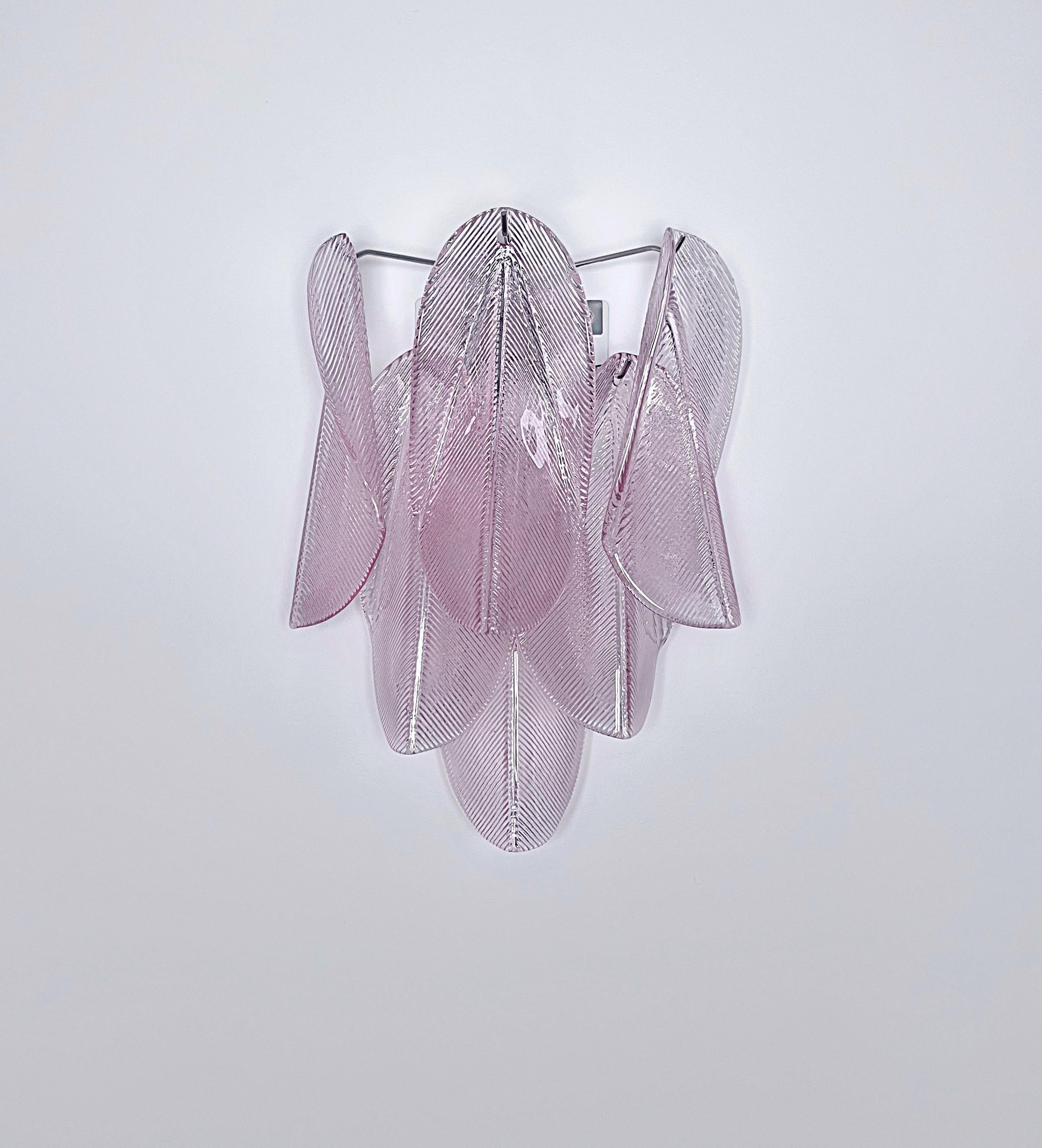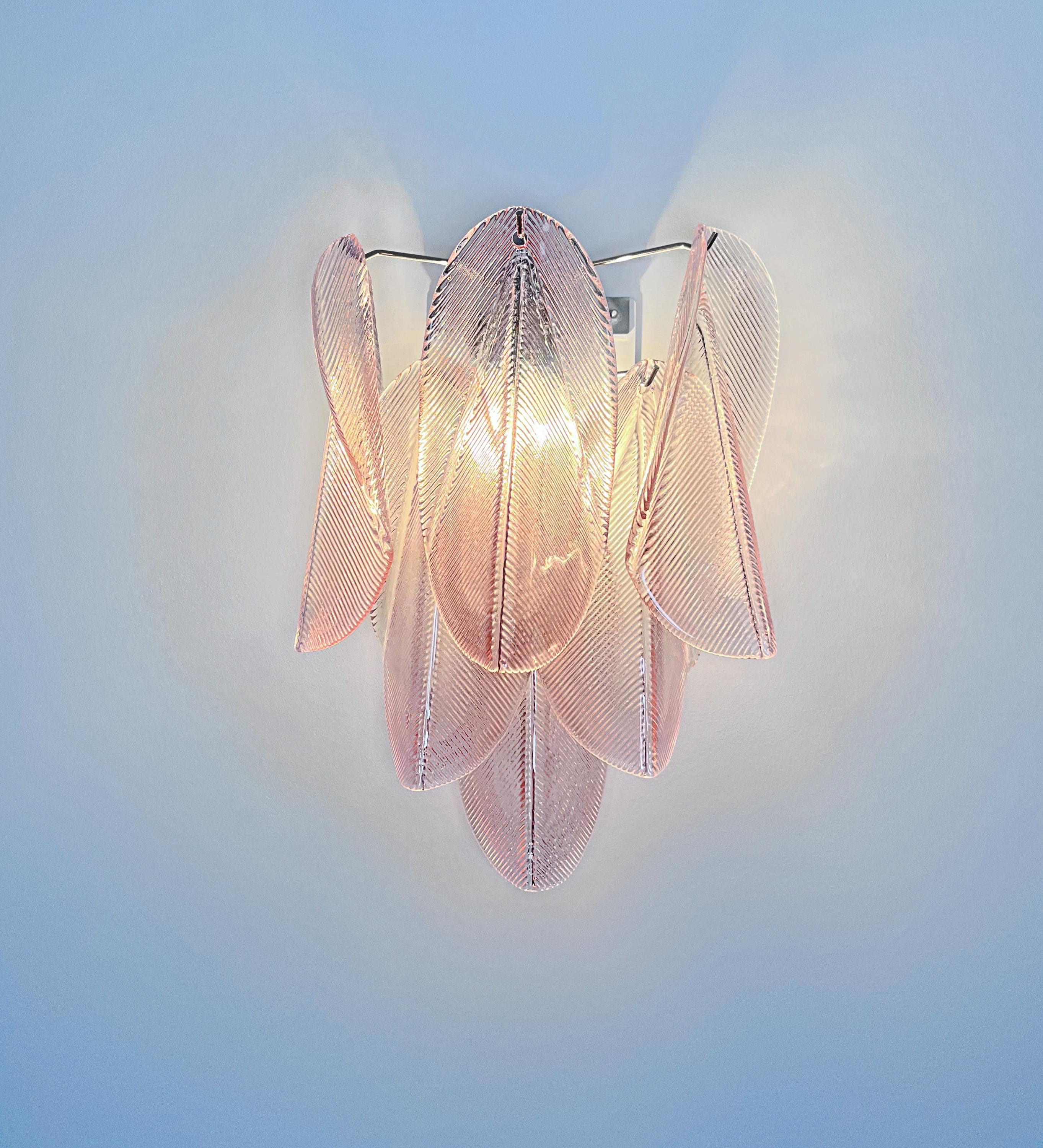 Pair of Vintage Italian Murano appliques in the manner of Mazzega. Wall lights have 6 glass petals "swallows" (pink) in a chrome frame.