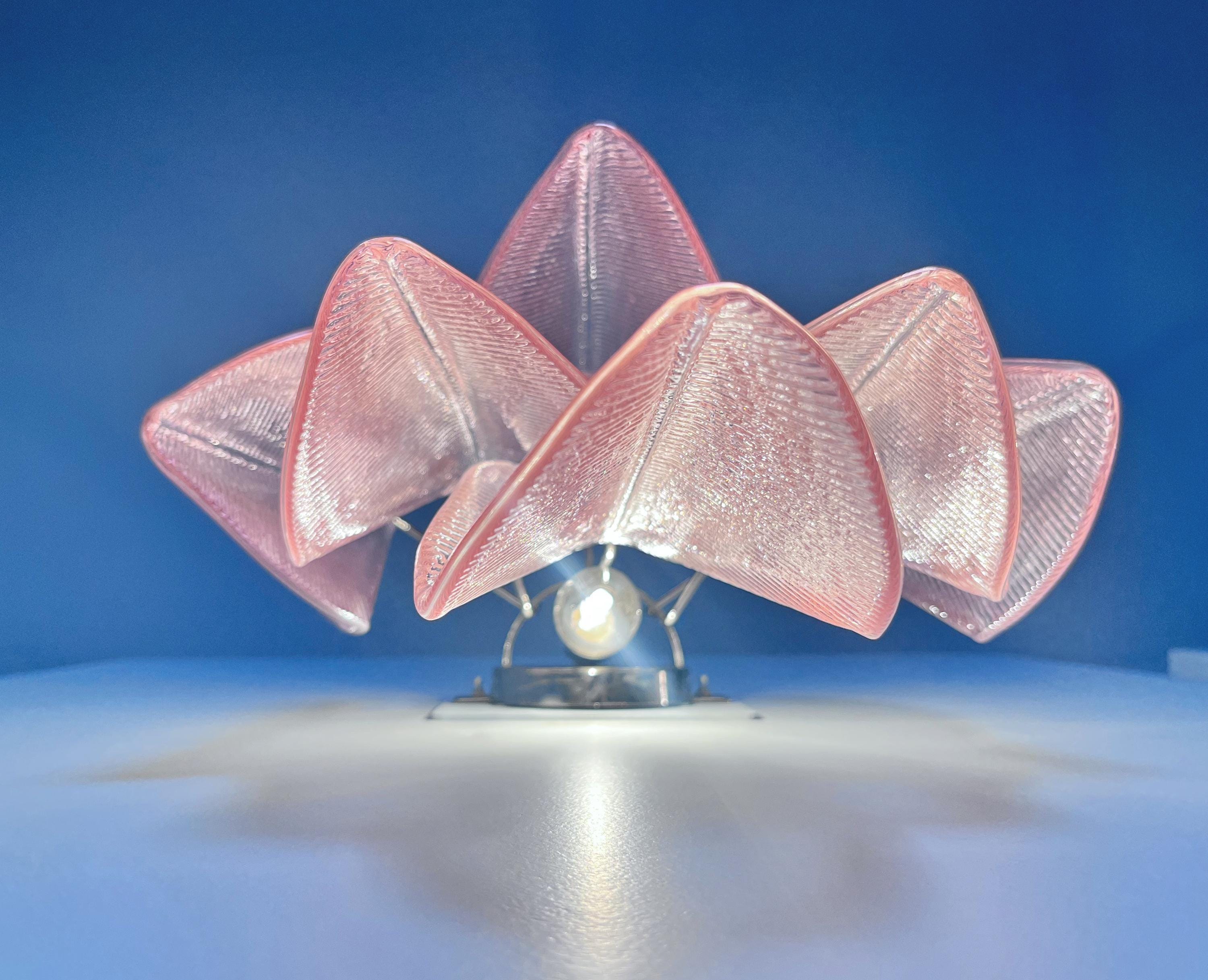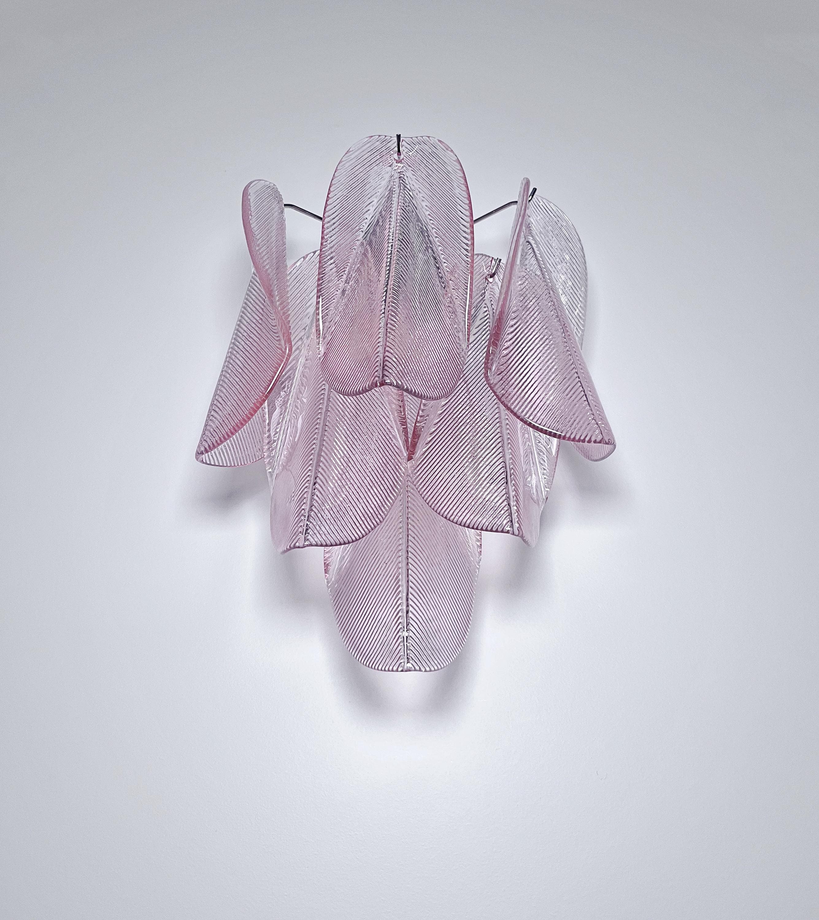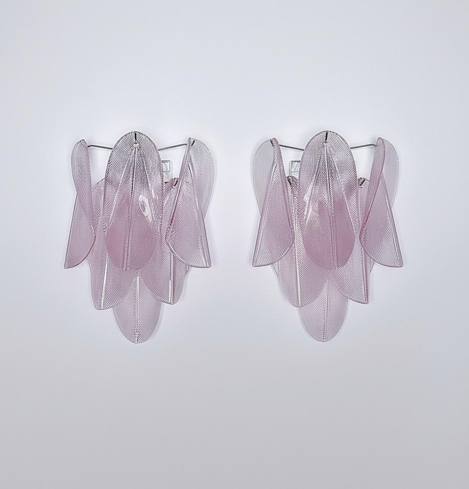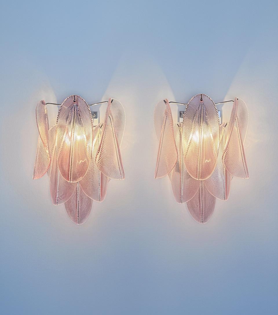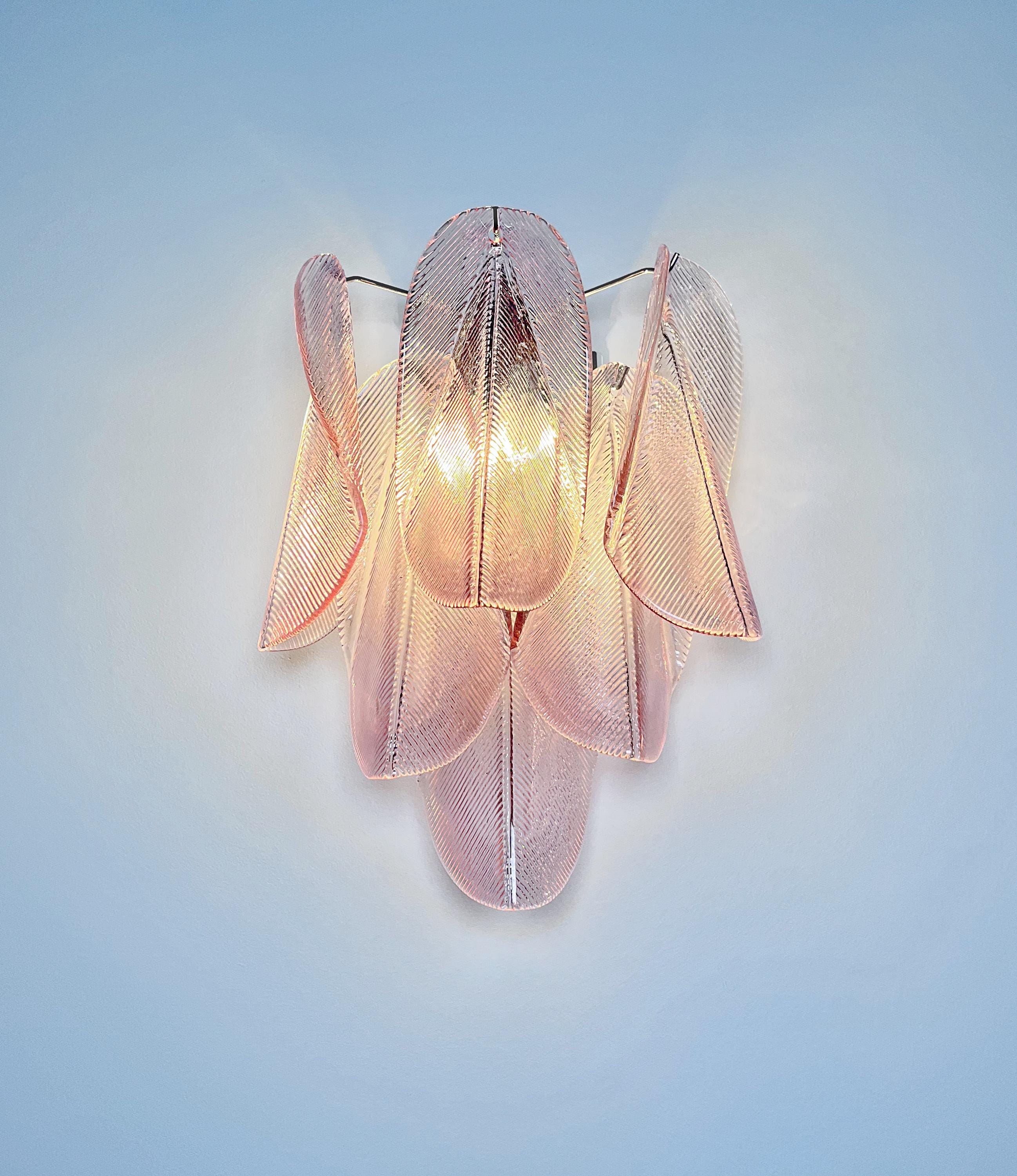 Pair of Vintage Italian Murano appliques in the manner of Mazzega. Wall lights have 6 glass petals "swallows" (pink) in a chrome frame.