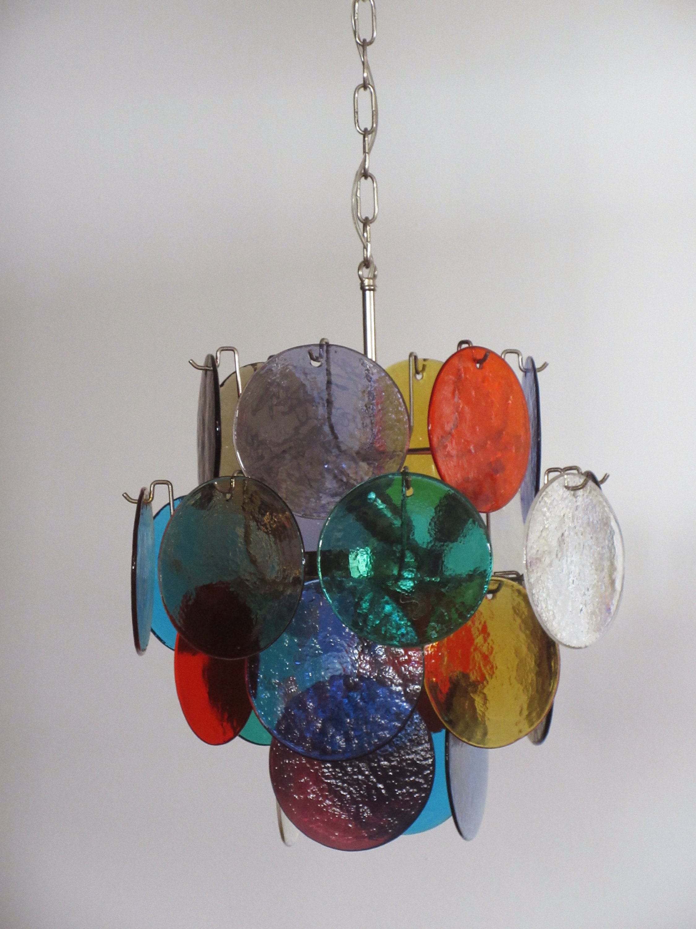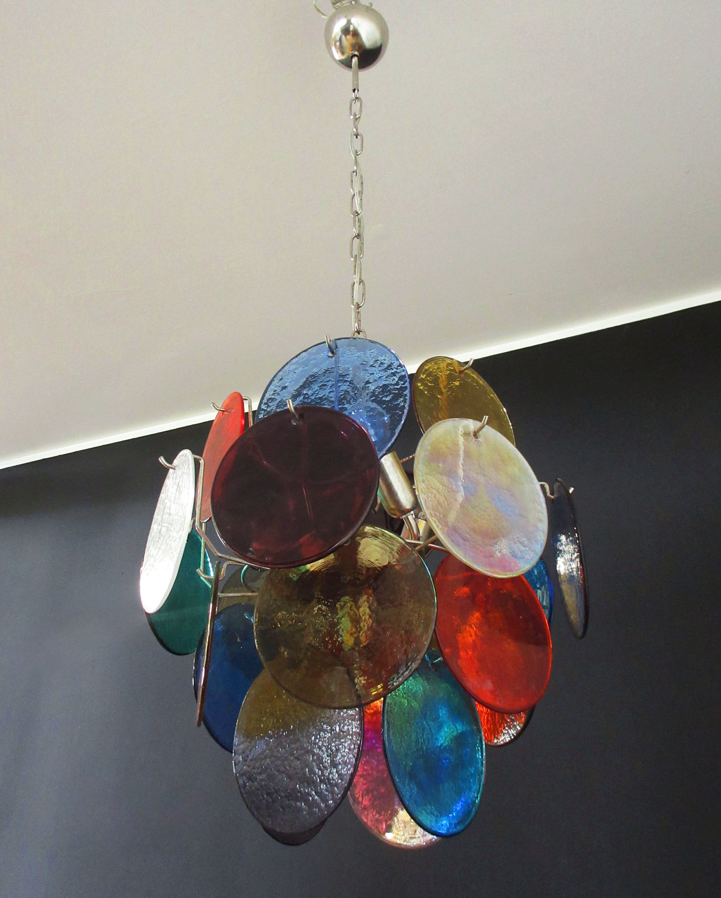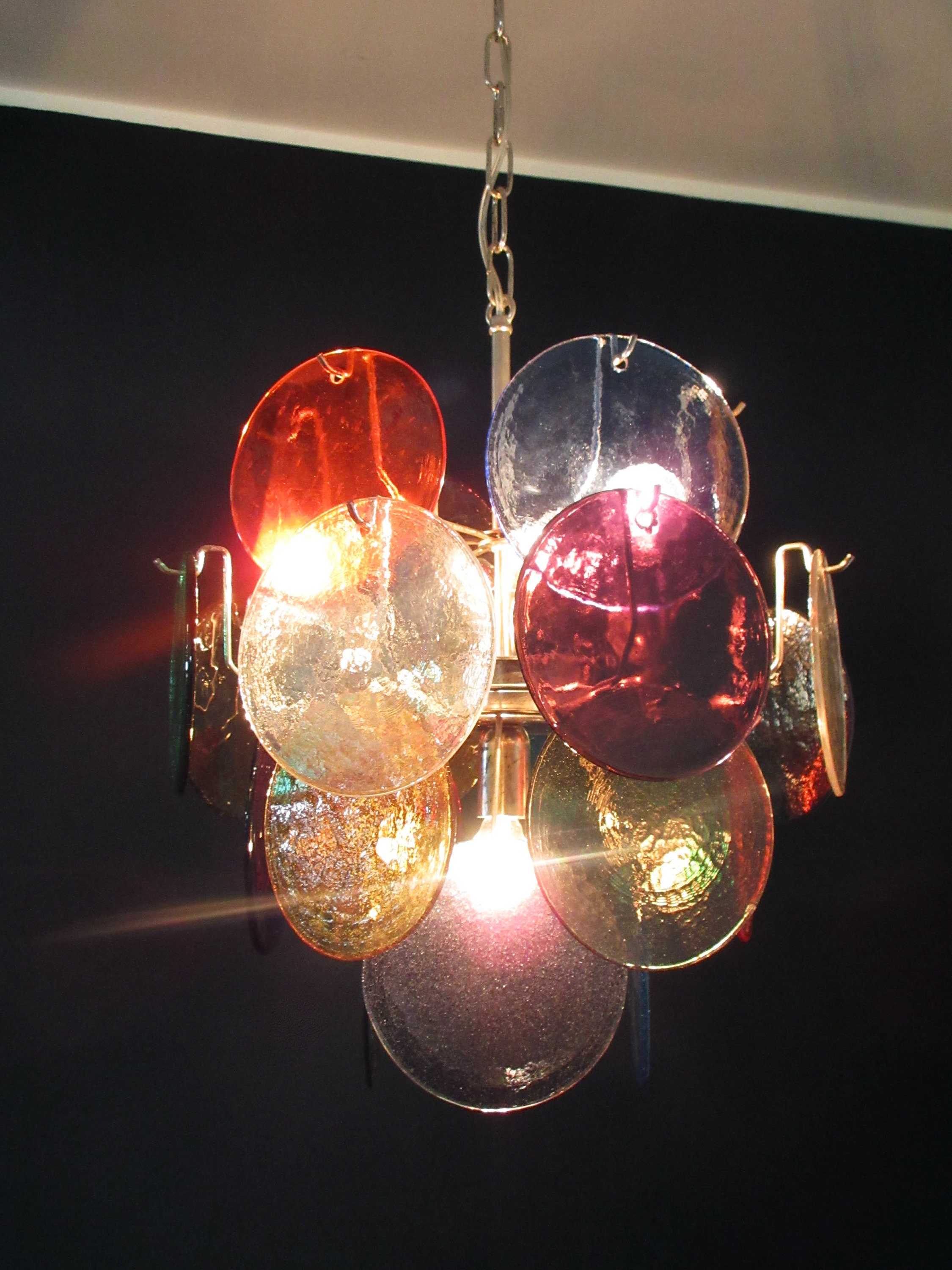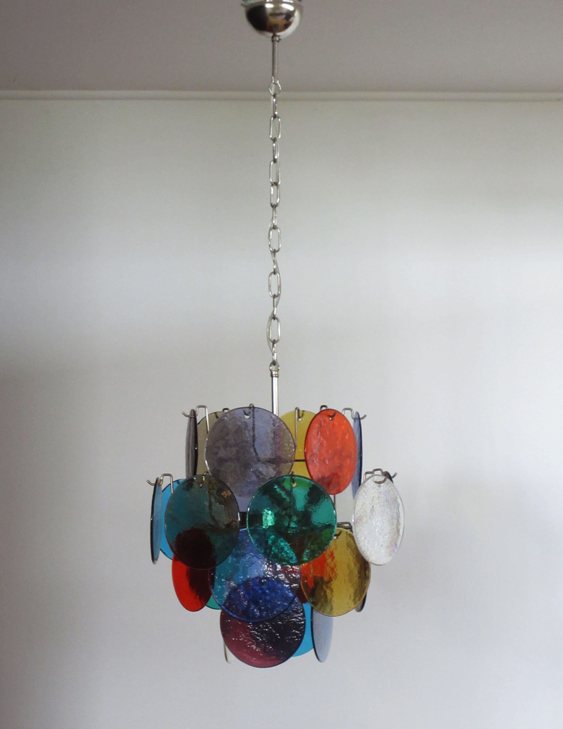 Vintage Italian Murano chandelier in Vistosi style. The chandelier has 24 fantastic Murano multicolored disks in a metal frame.