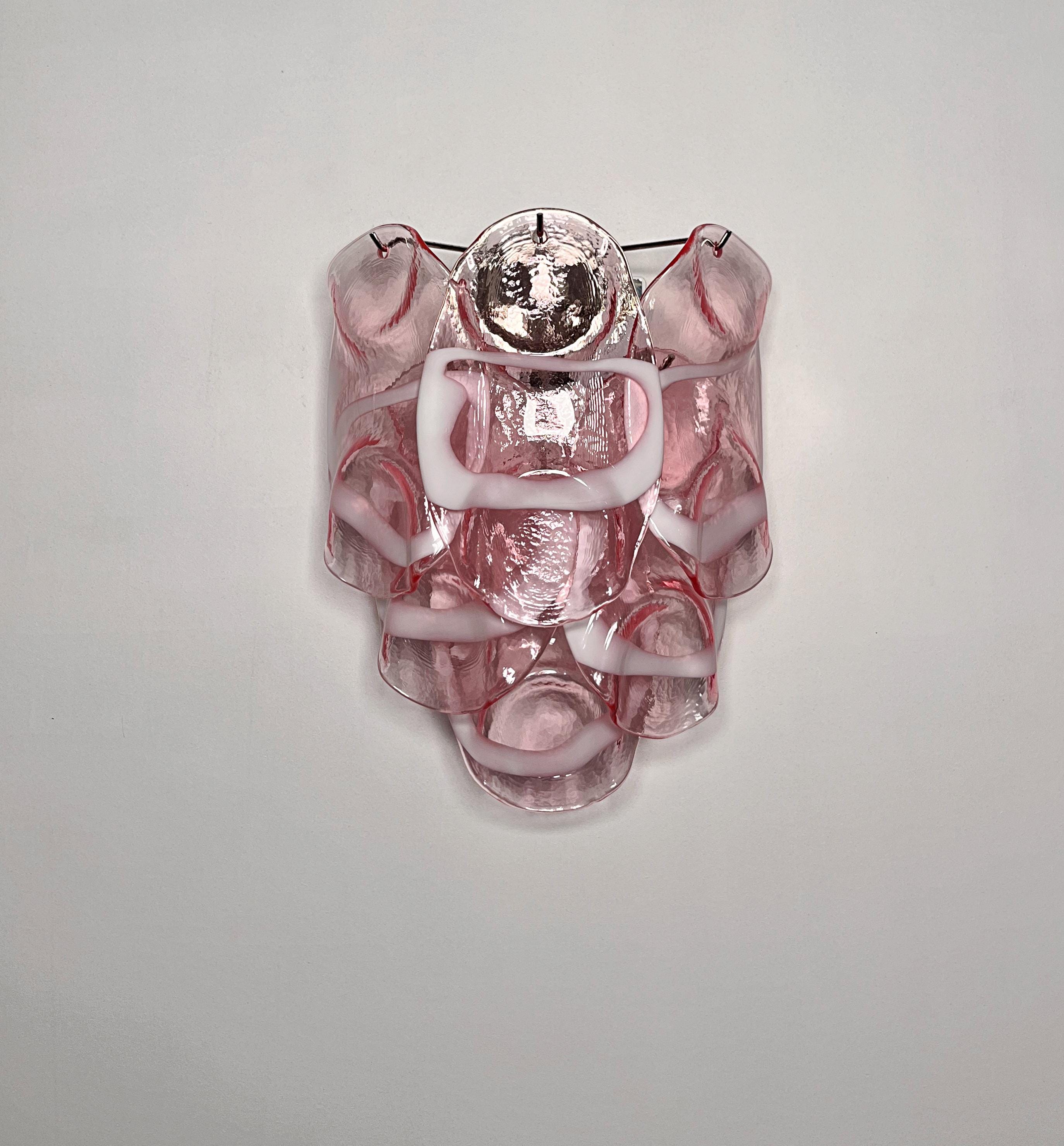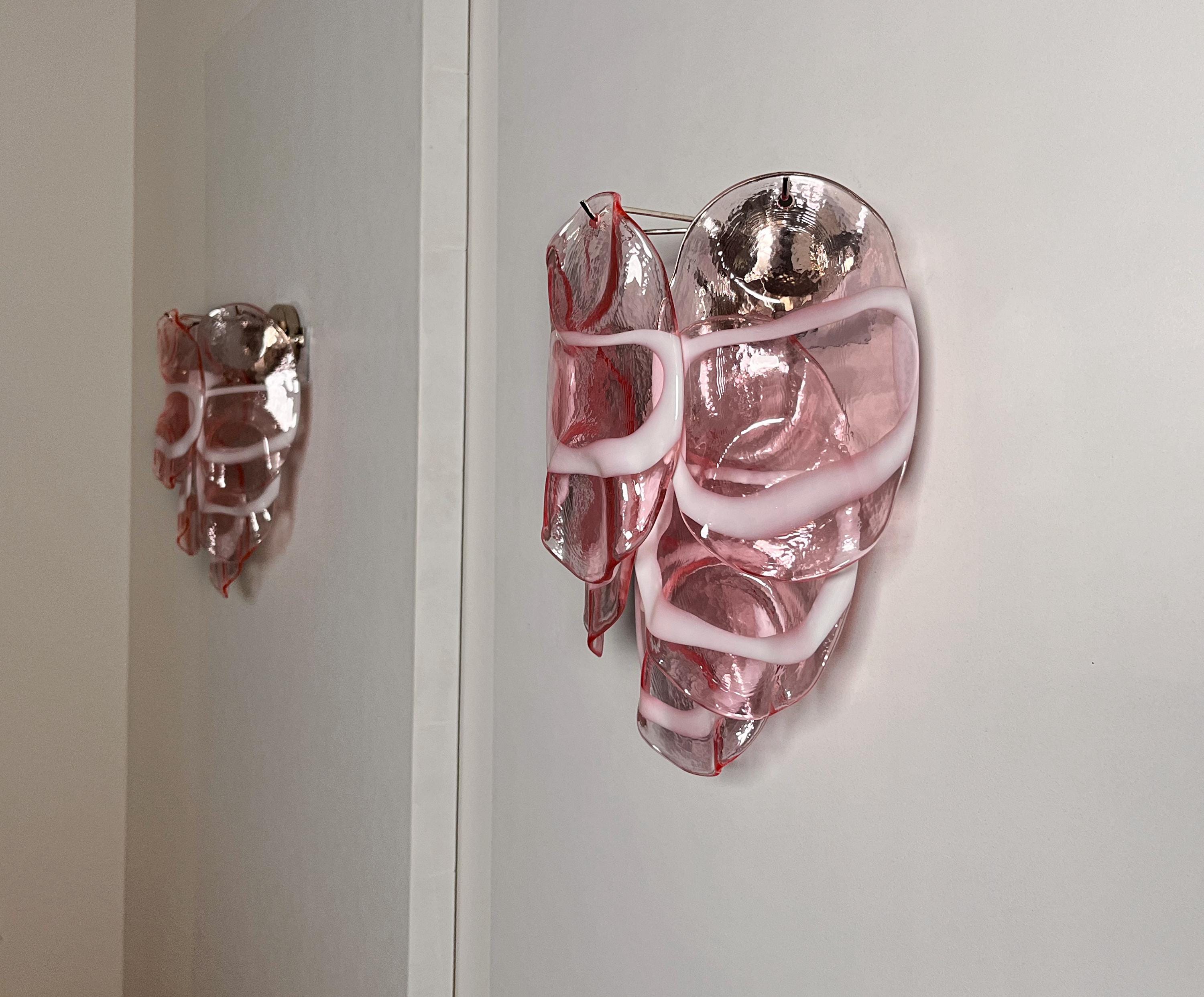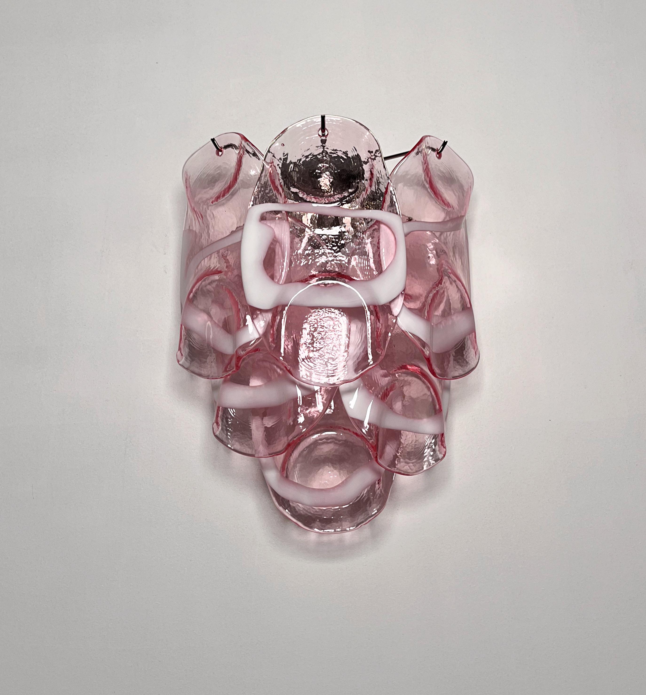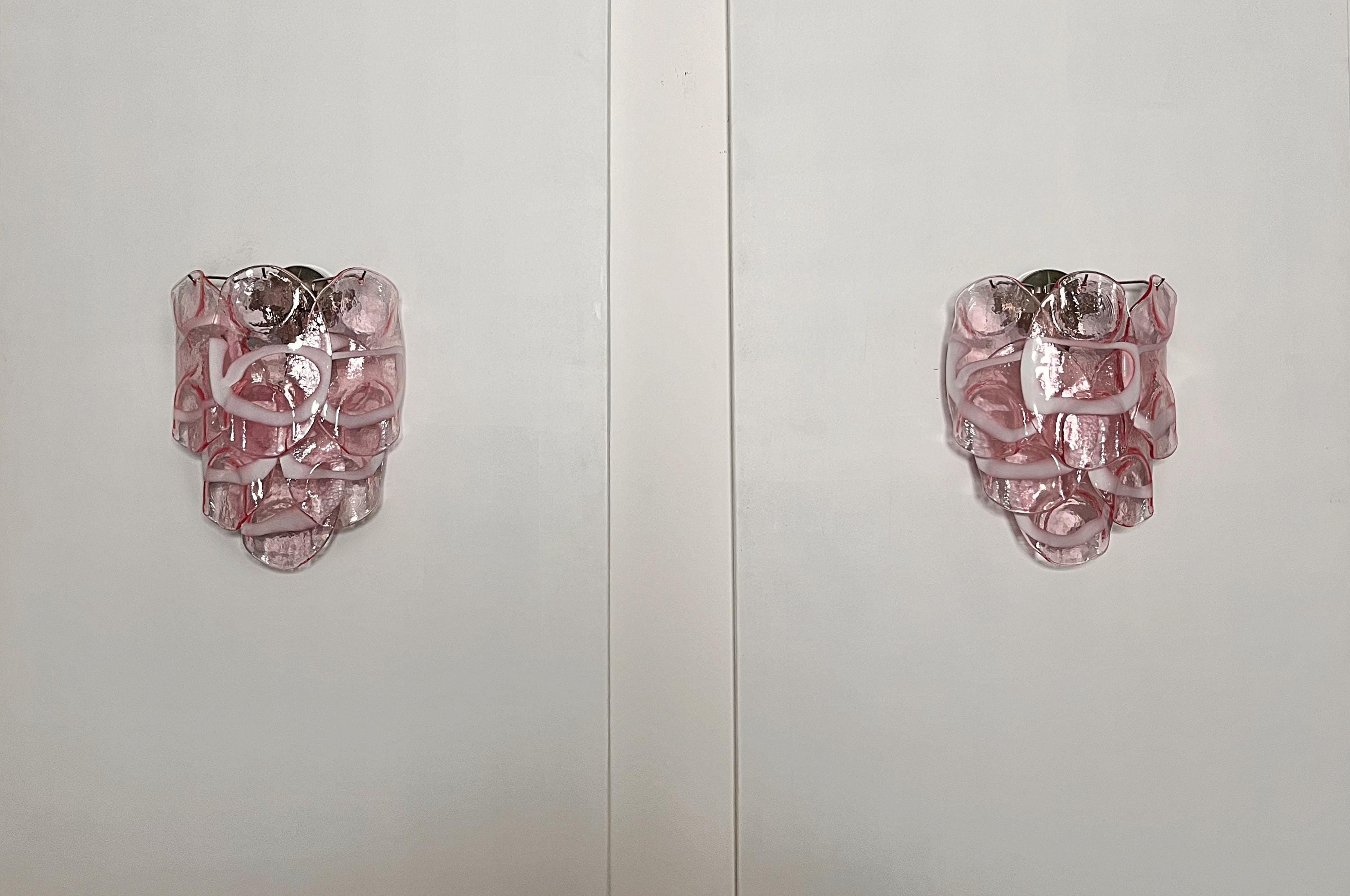 Pair of Vintage Italian Murano appliques in Vistosi style. Wall lights have 6 fantastic Murano pinnk and white lattimo glasses ("crostoli") in a metal frame.