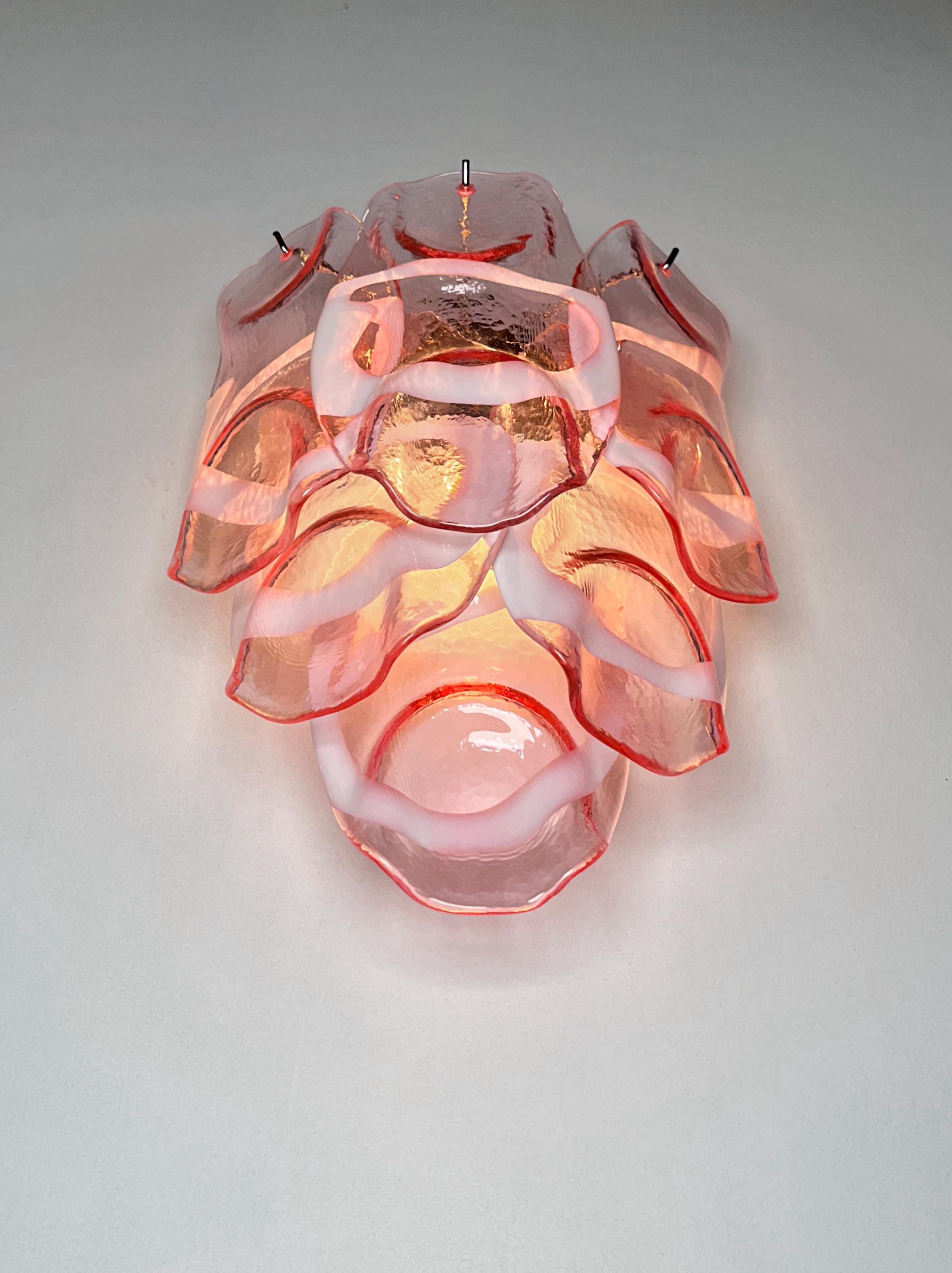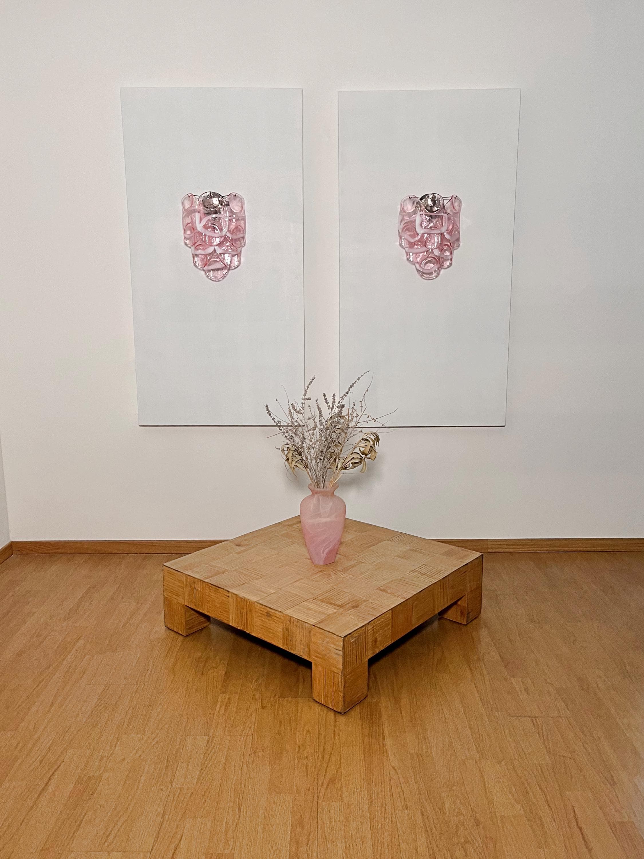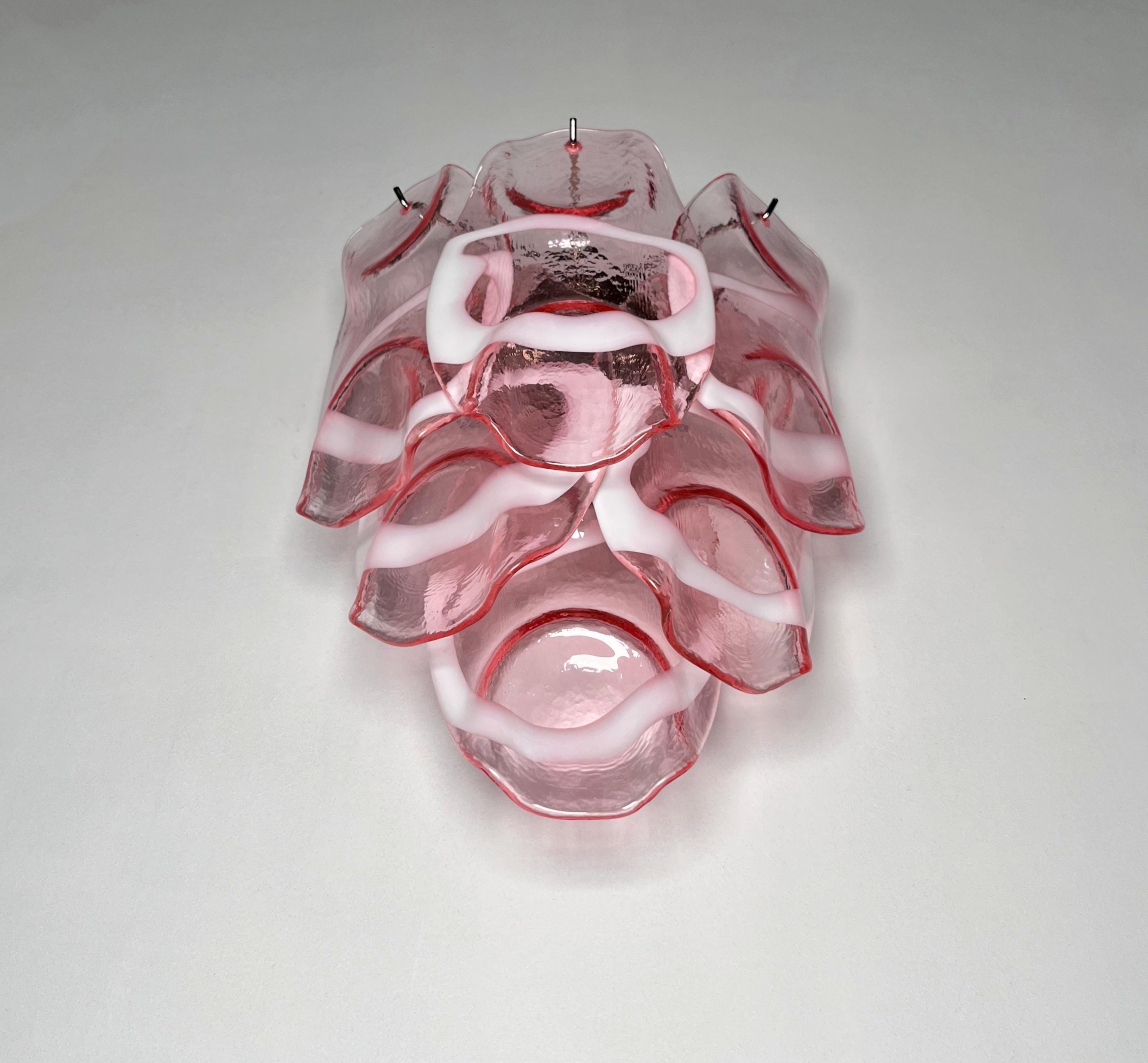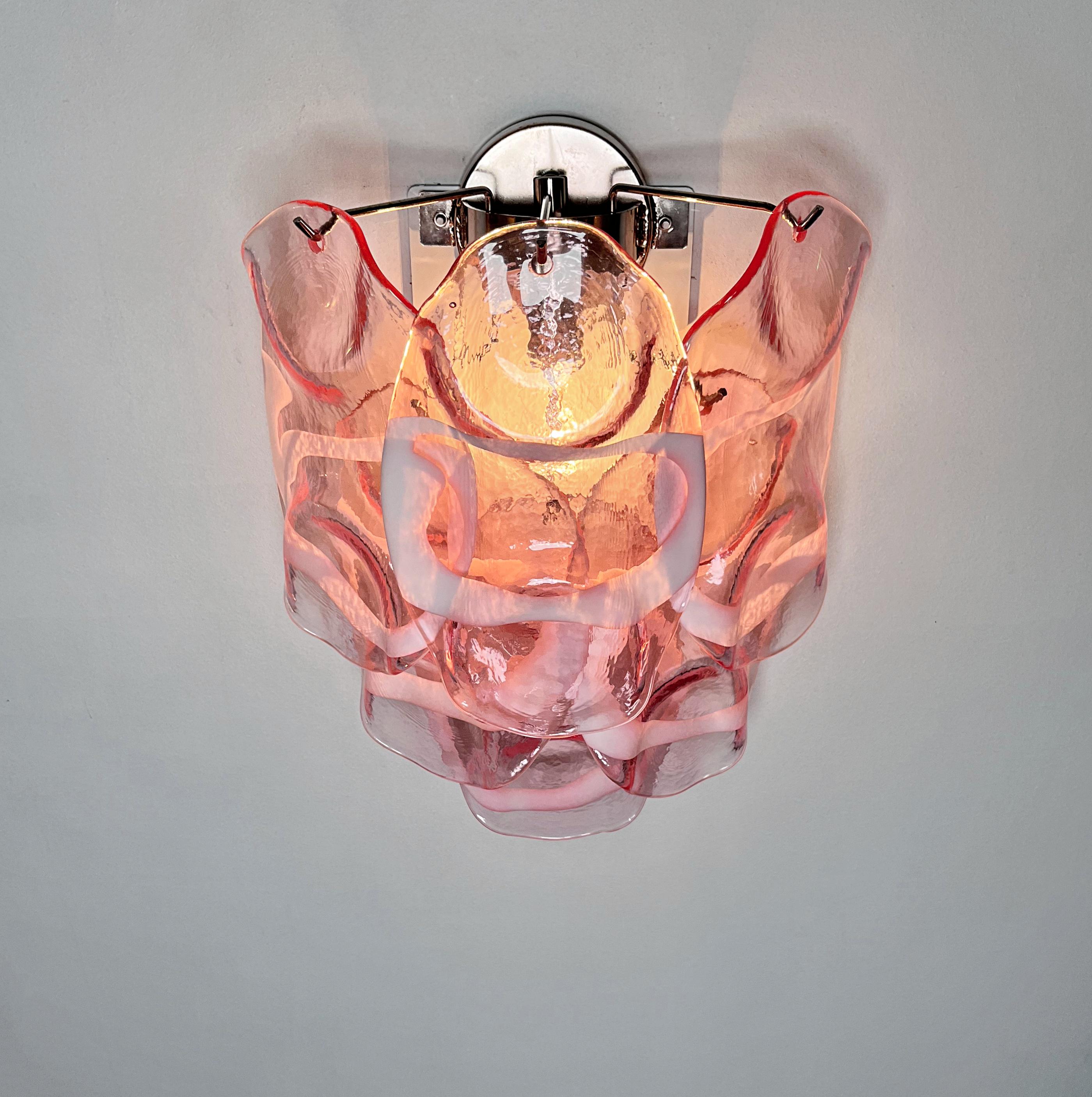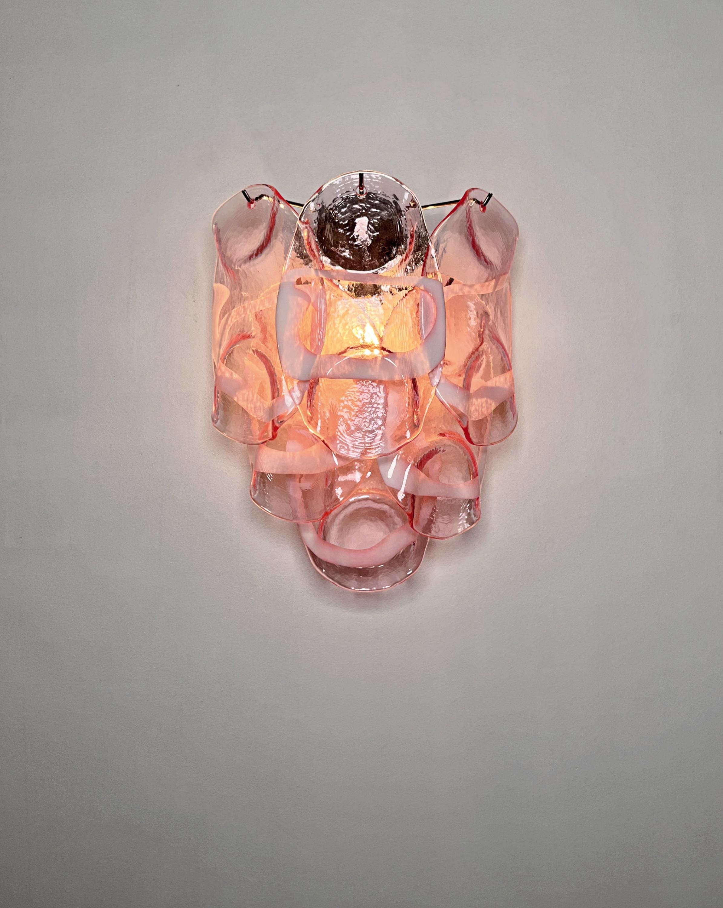 Pair of Vintage Italian Murano appliques in Vistosi style. Wall lights have 6 fantastic Murano pinnk and white lattimo glasses ("crostoli") in a metal frame.