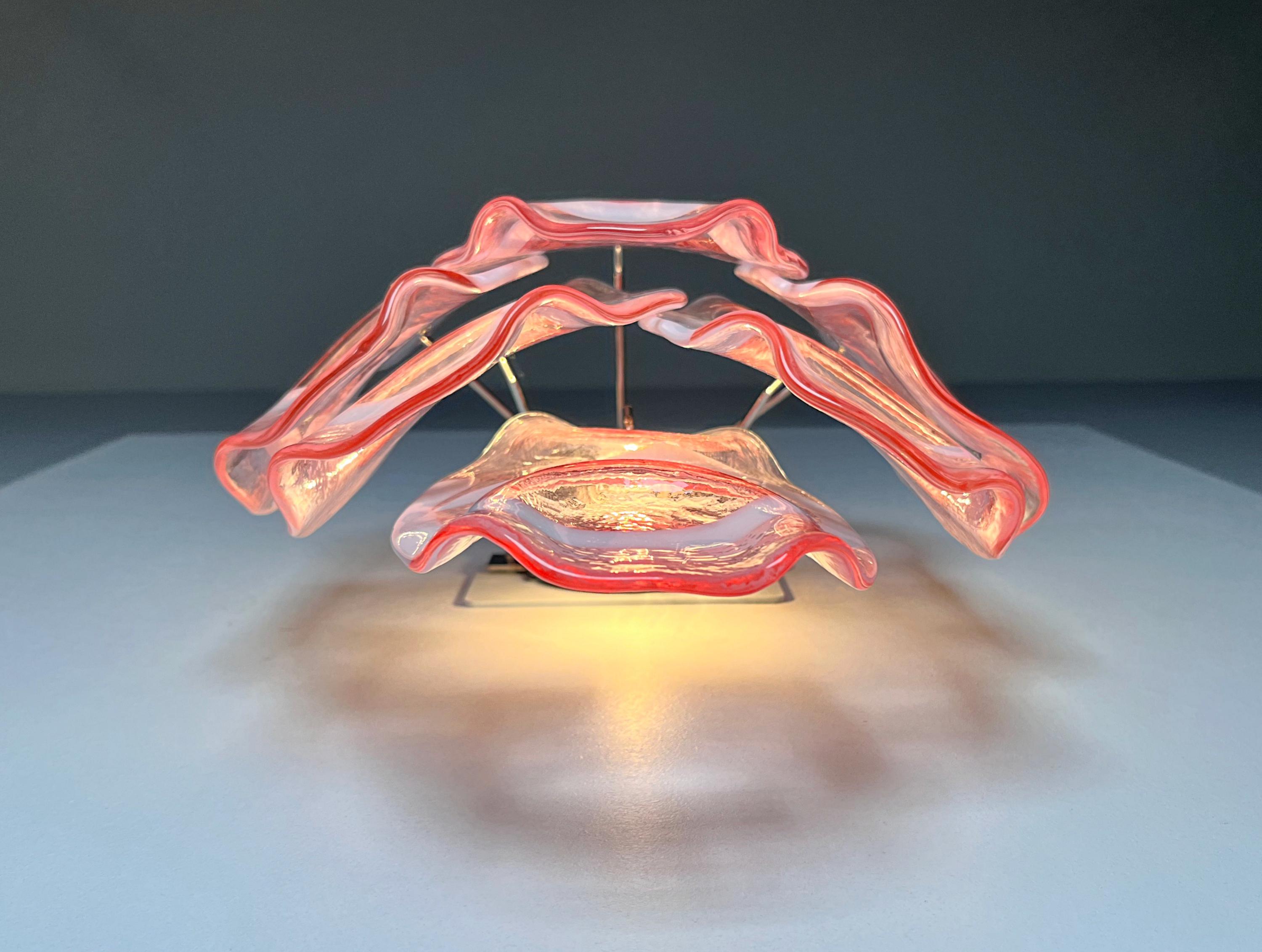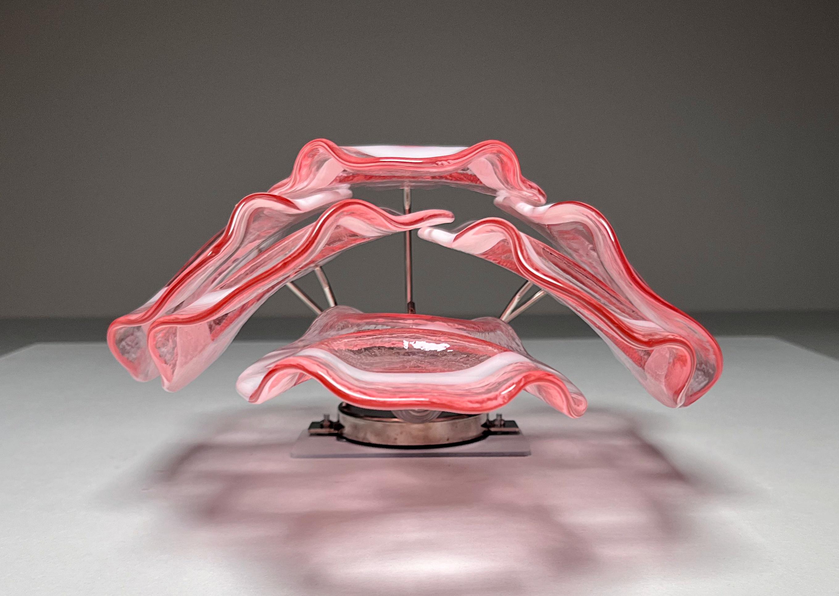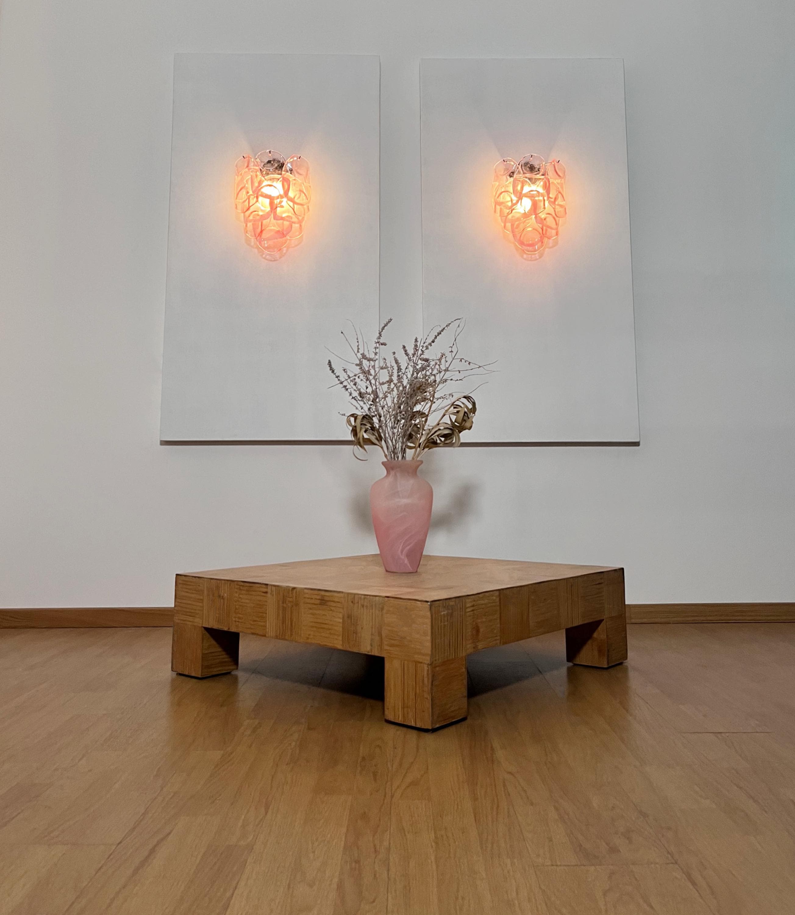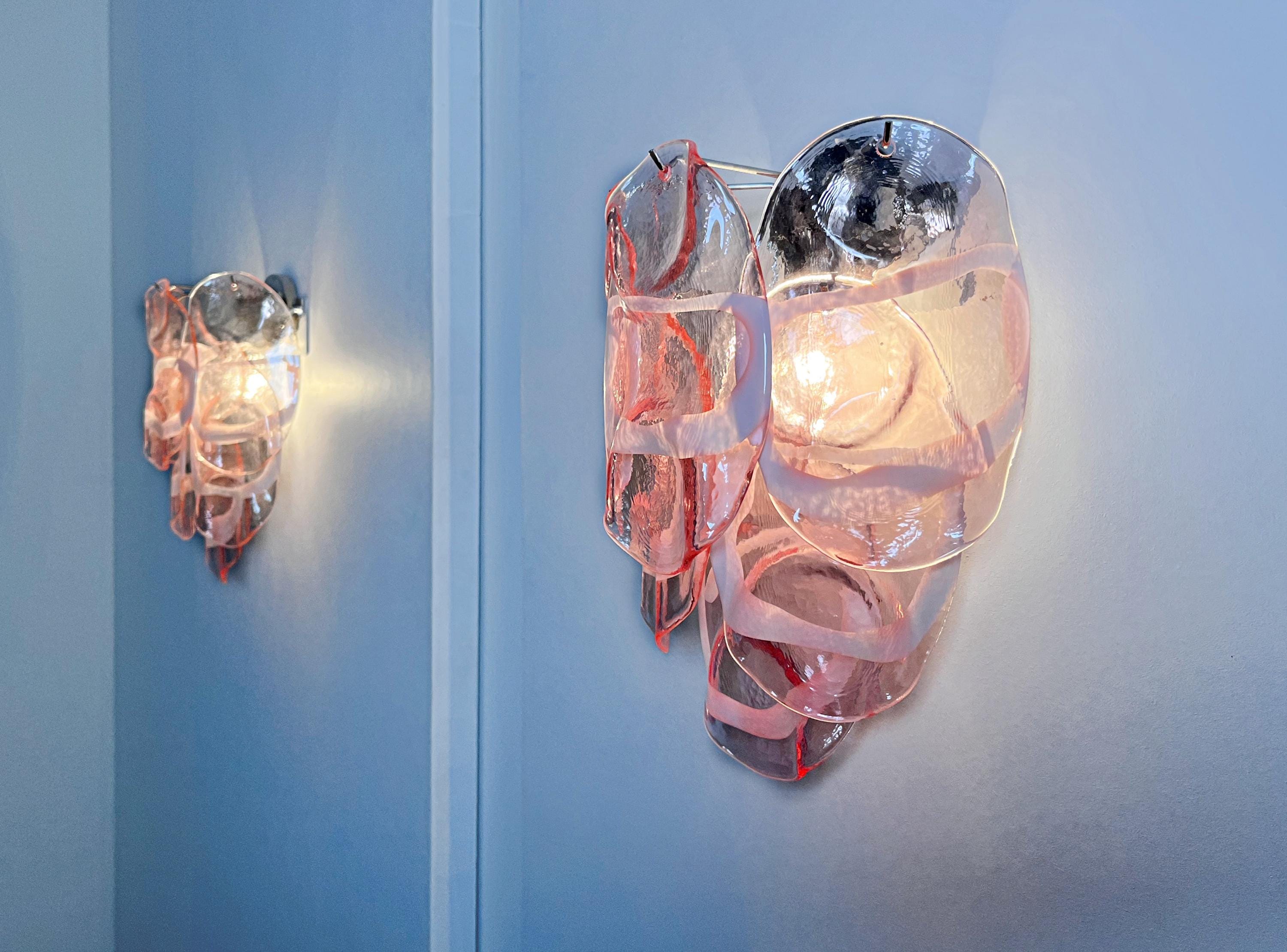 Pair of Vintage Italian Murano appliques in Vistosi style. Wall lights have 6 fantastic Murano pinnk and white lattimo glasses ("crostoli") in a metal frame.